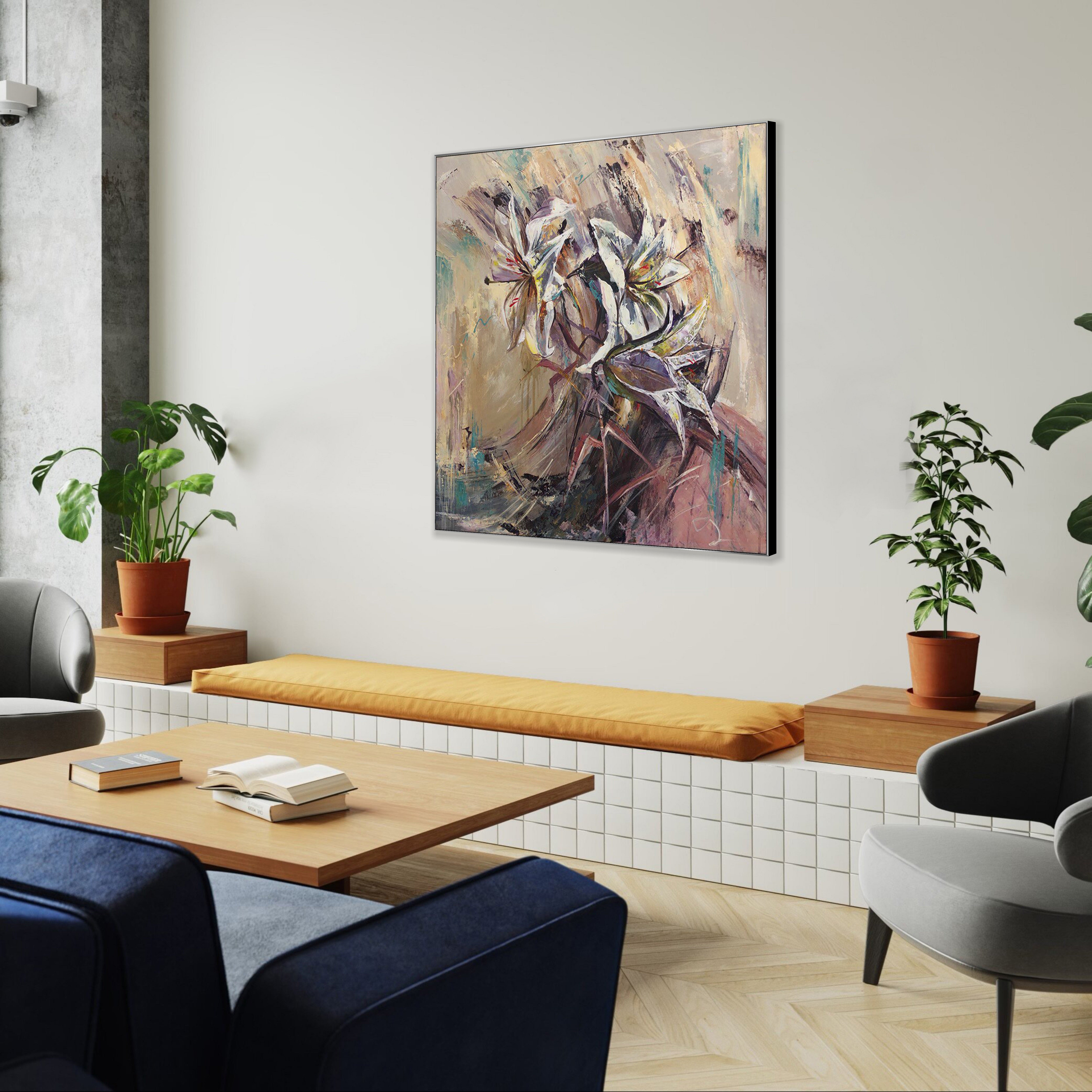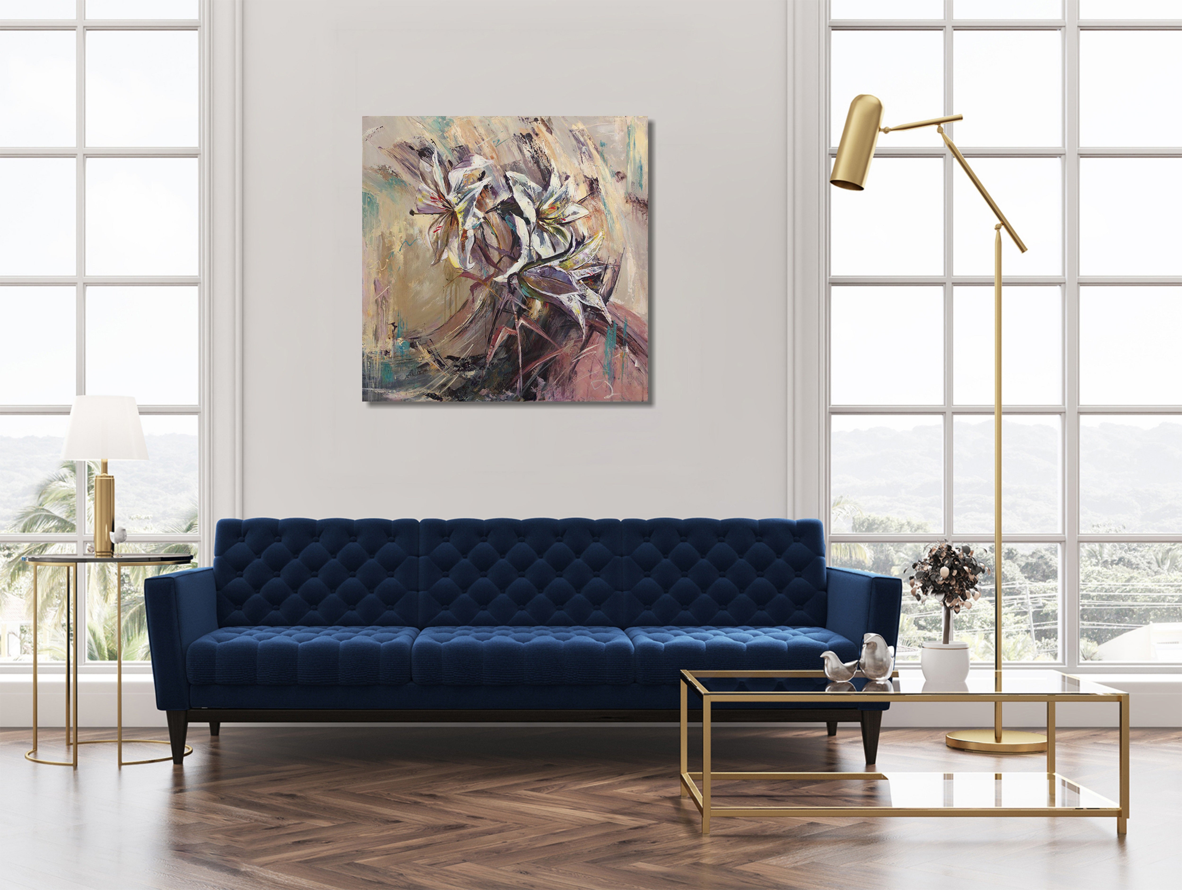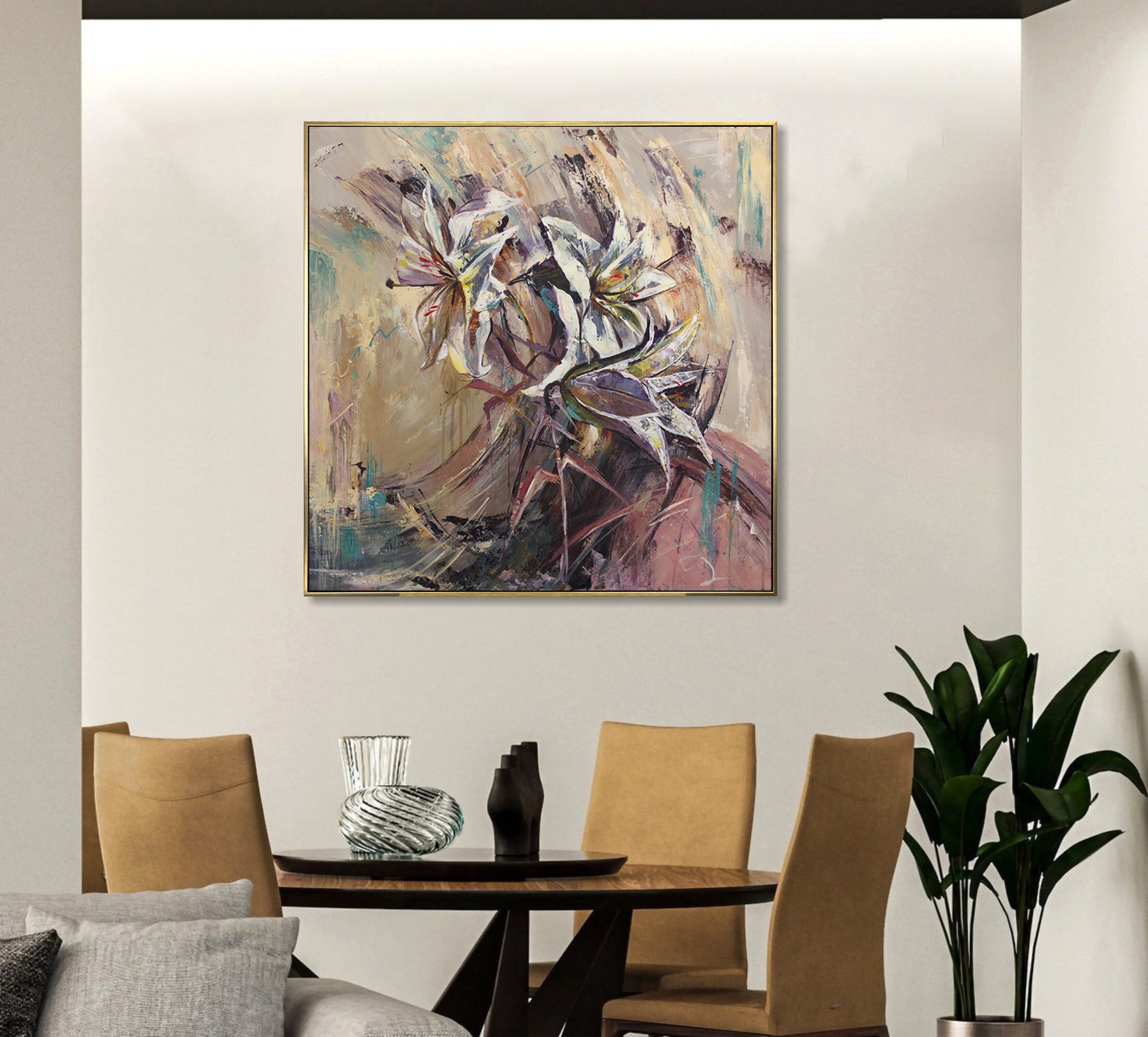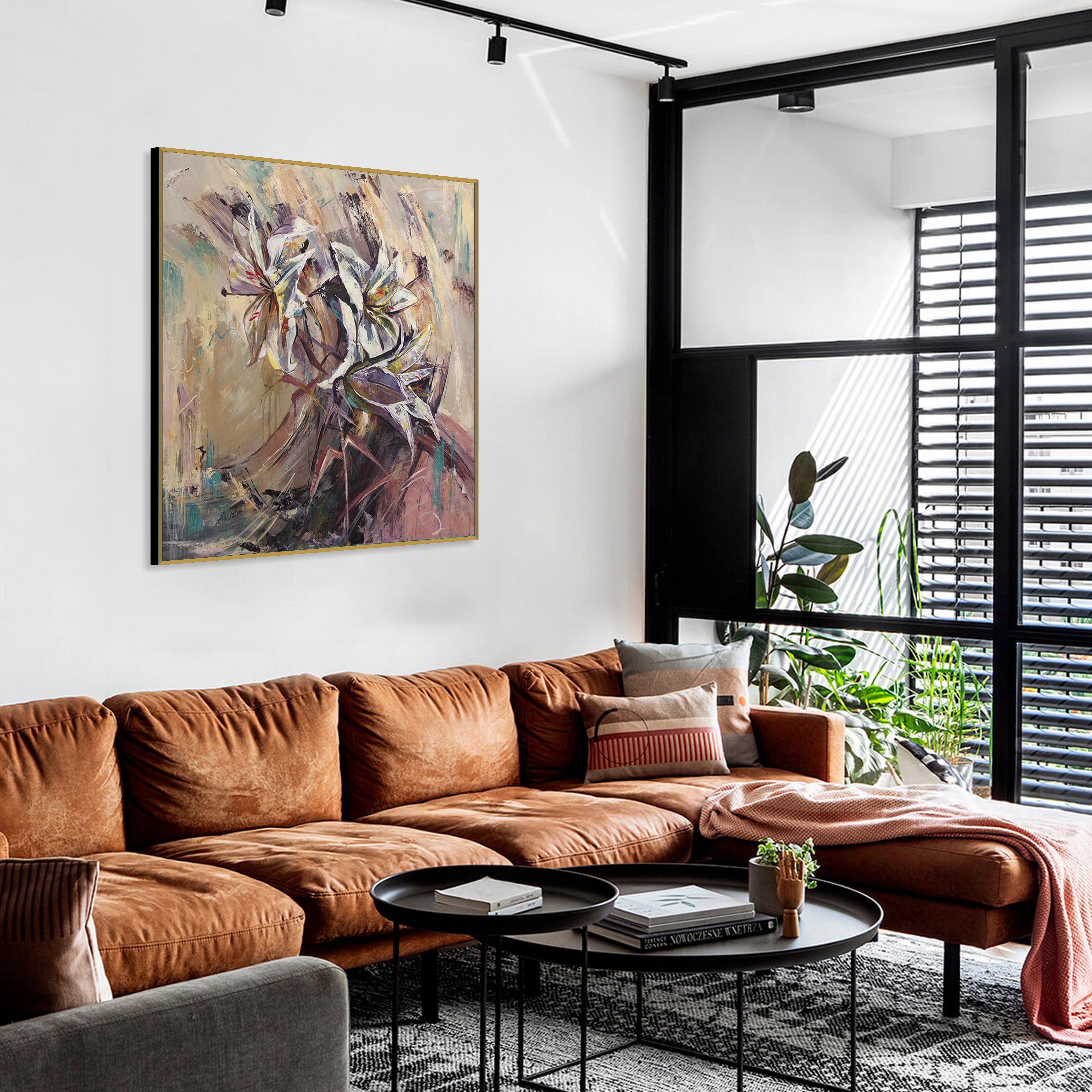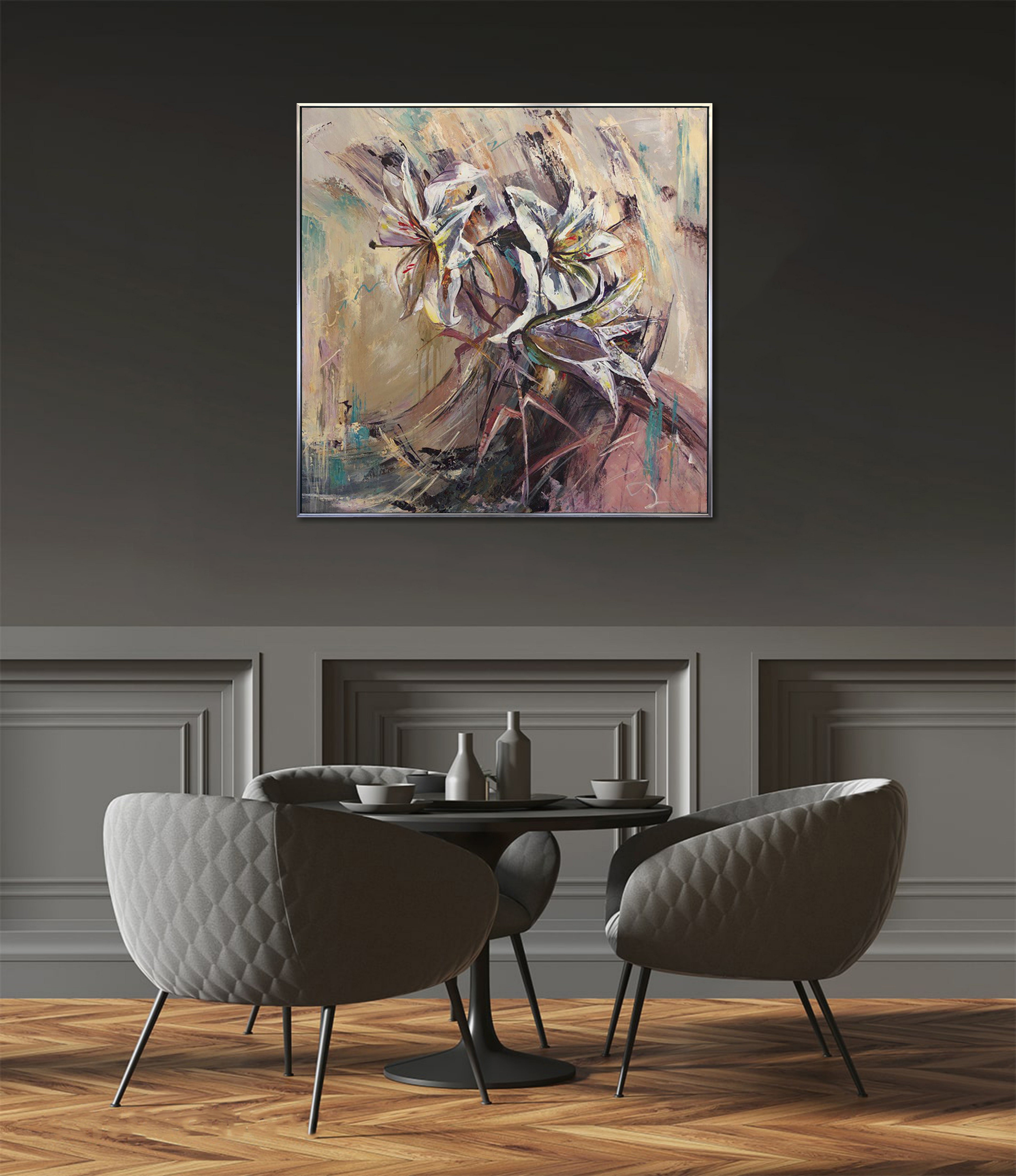 Anmutig und ausdrucksstark fängt „Bouquet of Lilies“ die natürliche Eleganz weißer Calla-Lilien durch schwungvolle Pinselstriche und geschichtete neutrale Farbtöne ein. Sanfte Beige-, Flieder- und Türkistöne schaffen eine beruhigende und zugleich dynamische Komposition, die Raffinesse ausstrahlt.