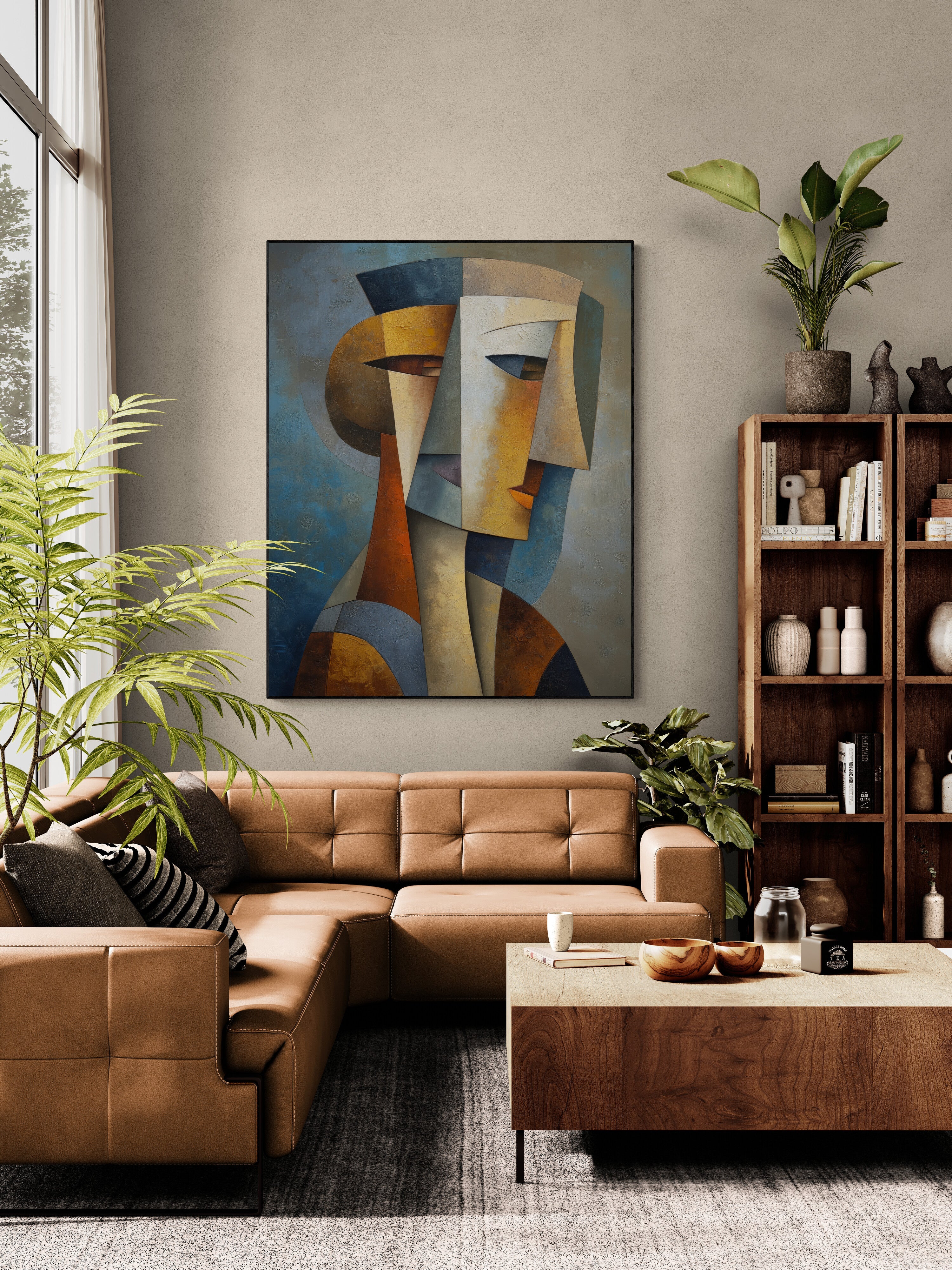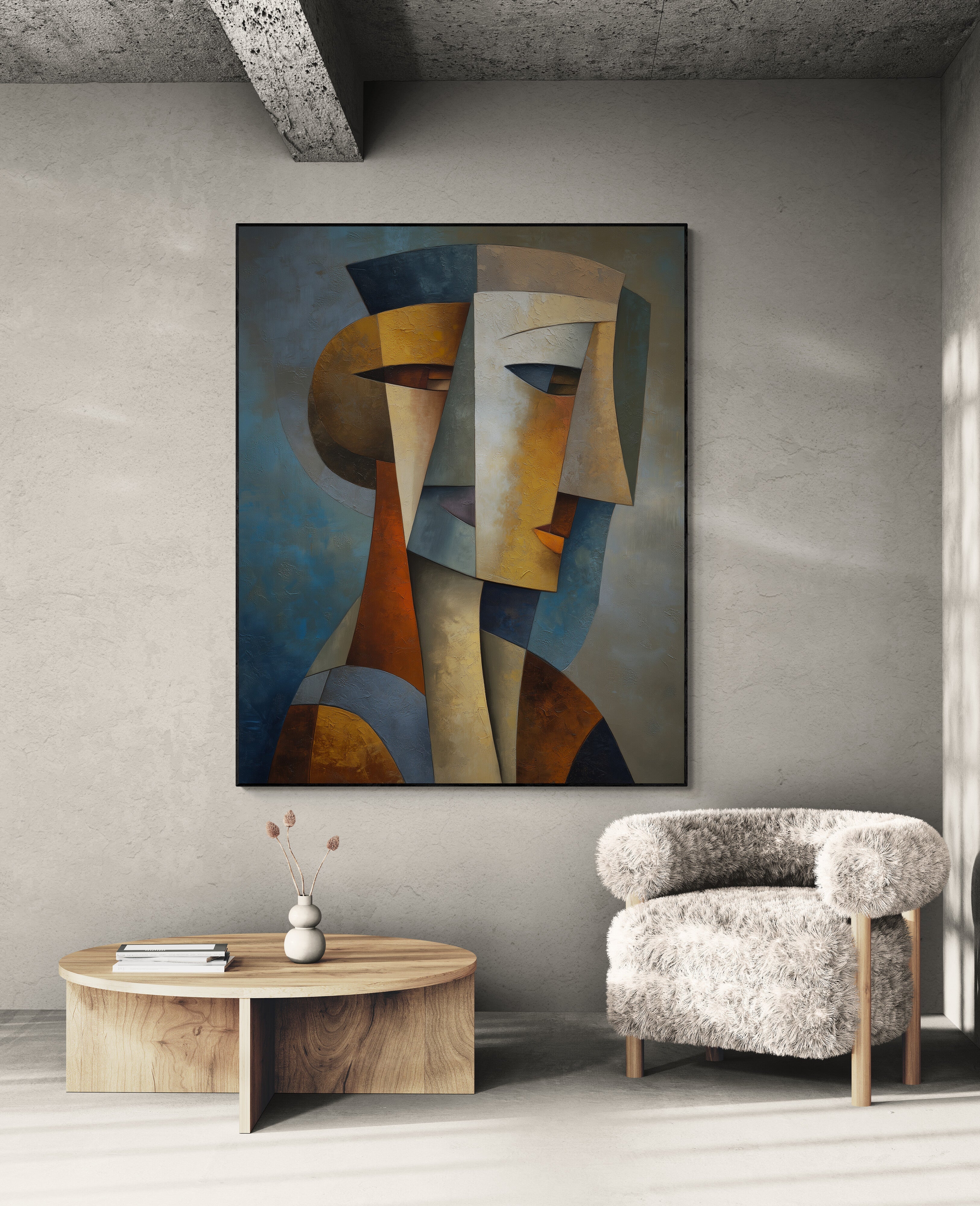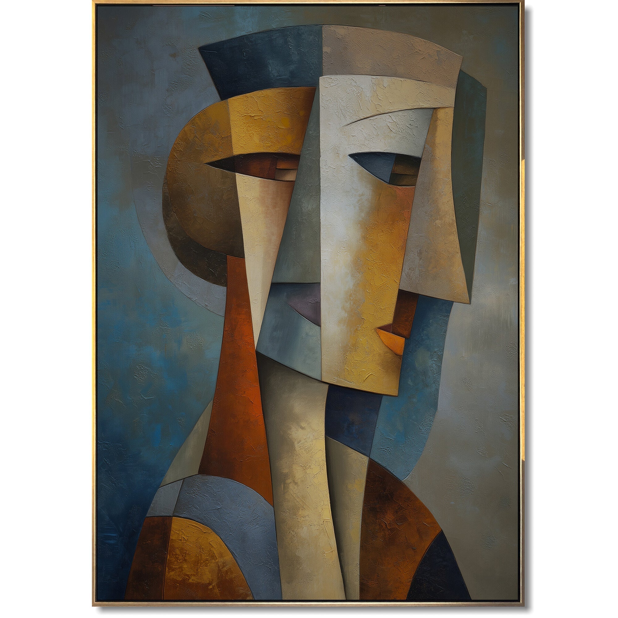 Ein ausdrucksstarkes, geometrisches Porträt im kubistischen Stil, handgemalt in satten Erdtönen – perfekt für Eingangsbereiche, Büros und moderne Wohnungen. Verleihen Sie Ihren Räumen einen kühnen künstlerischen Akzent – jetzt bestellen und Ihre Einrichtung aufwerten!