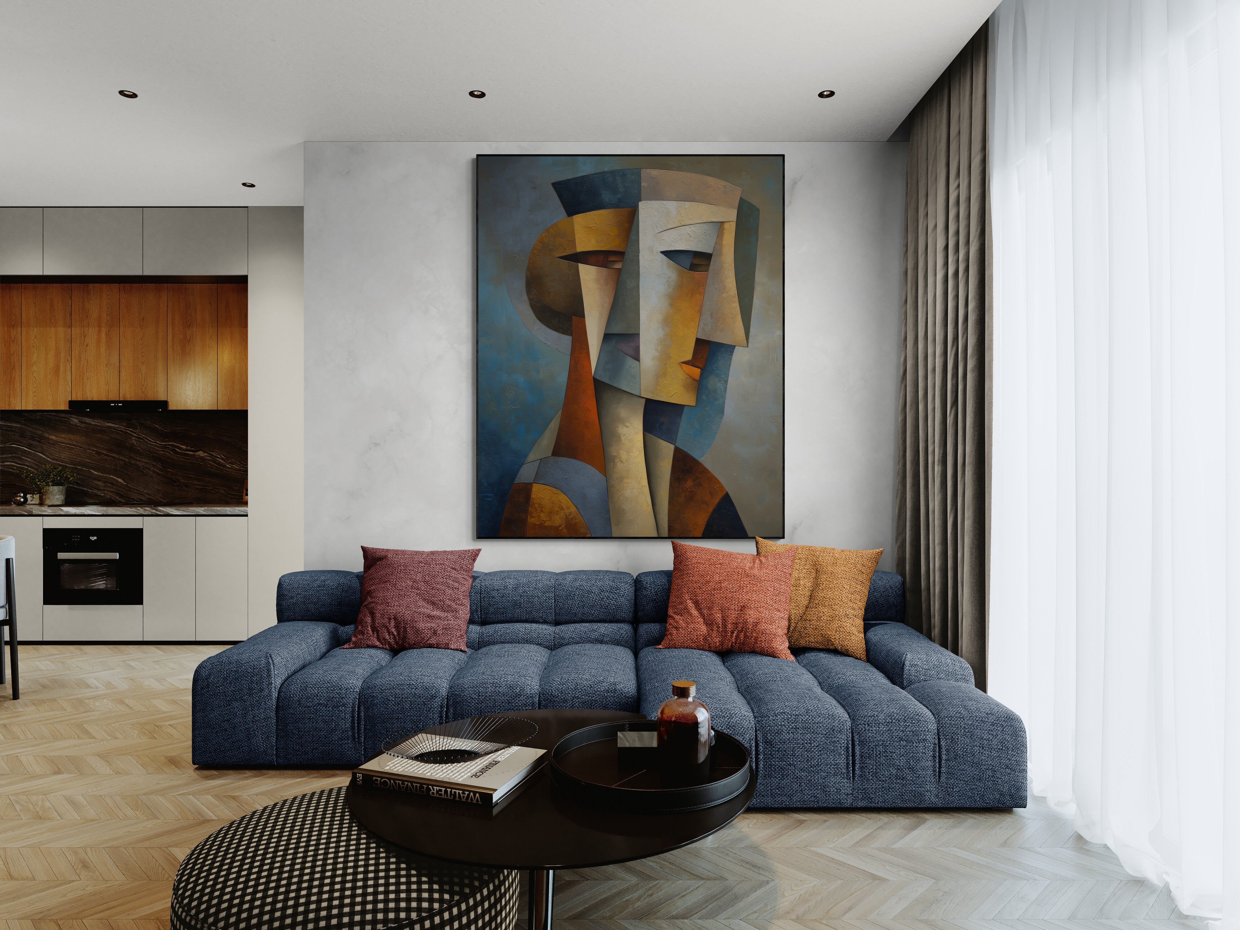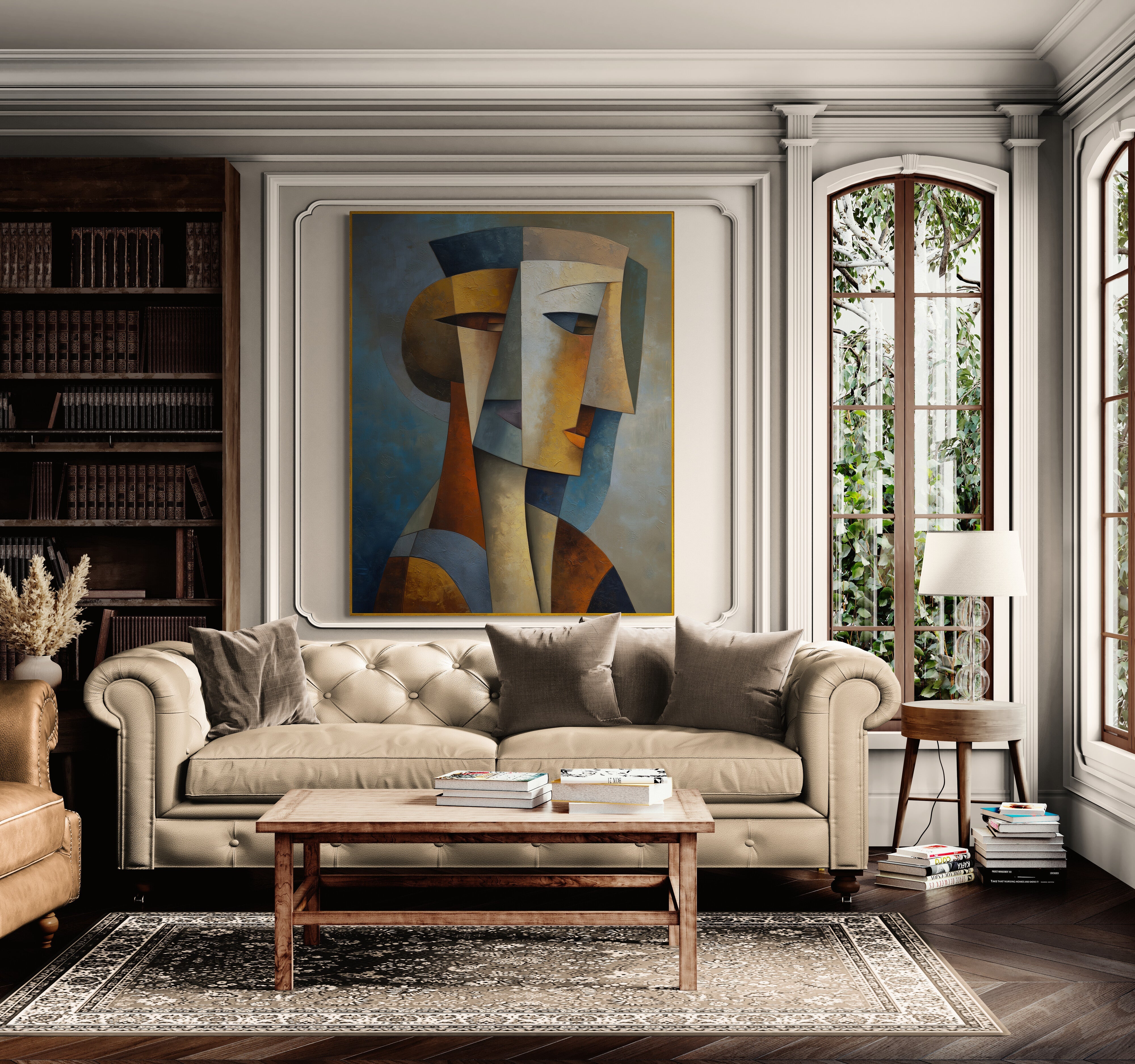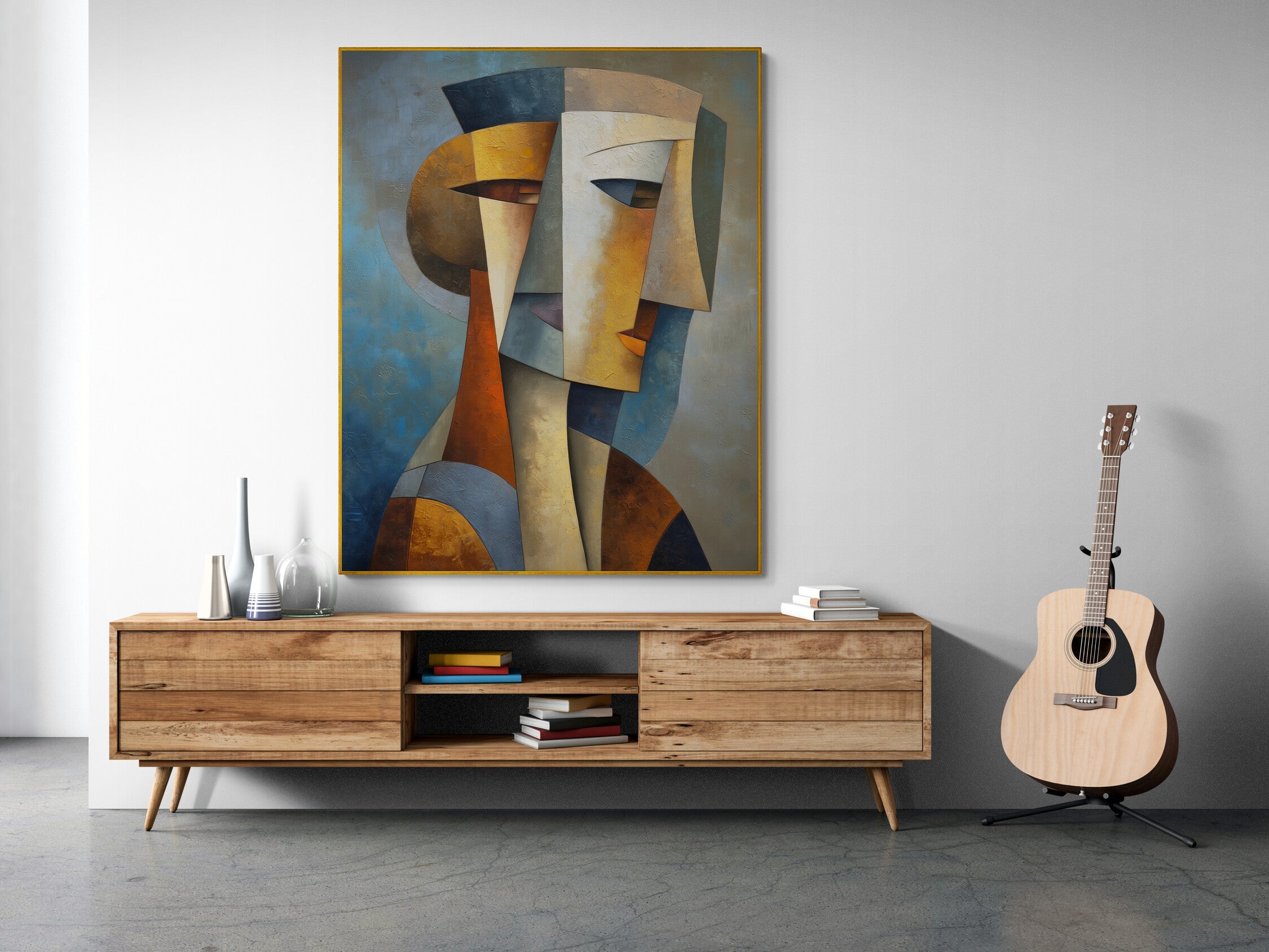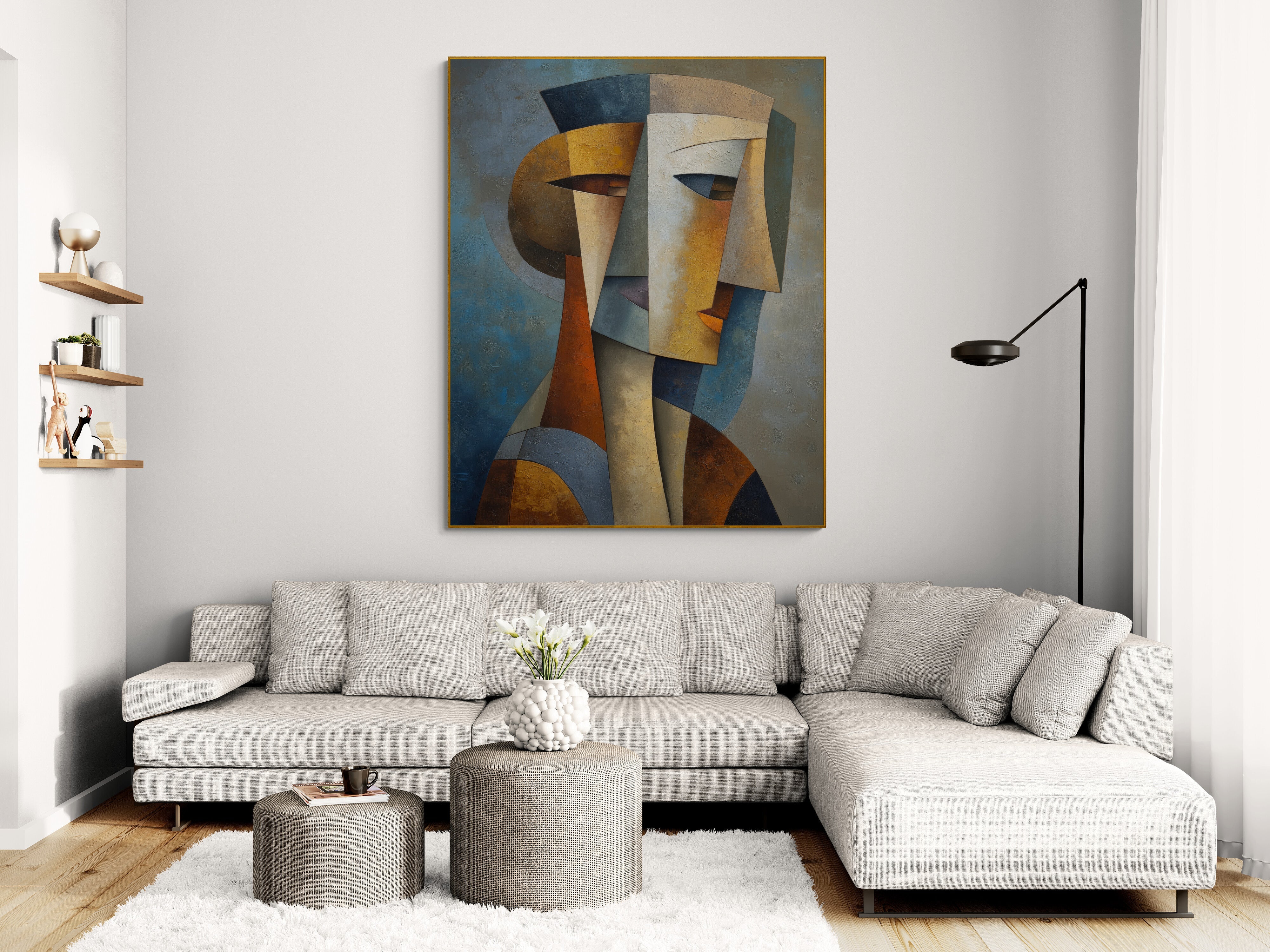 Ein ausdrucksstarkes, geometrisches Porträt im kubistischen Stil, handgemalt in satten Erdtönen – perfekt für Eingangsbereiche, Büros und moderne Wohnungen. Verleihen Sie Ihren Räumen einen kühnen künstlerischen Akzent – jetzt bestellen und Ihre Einrichtung aufwerten!