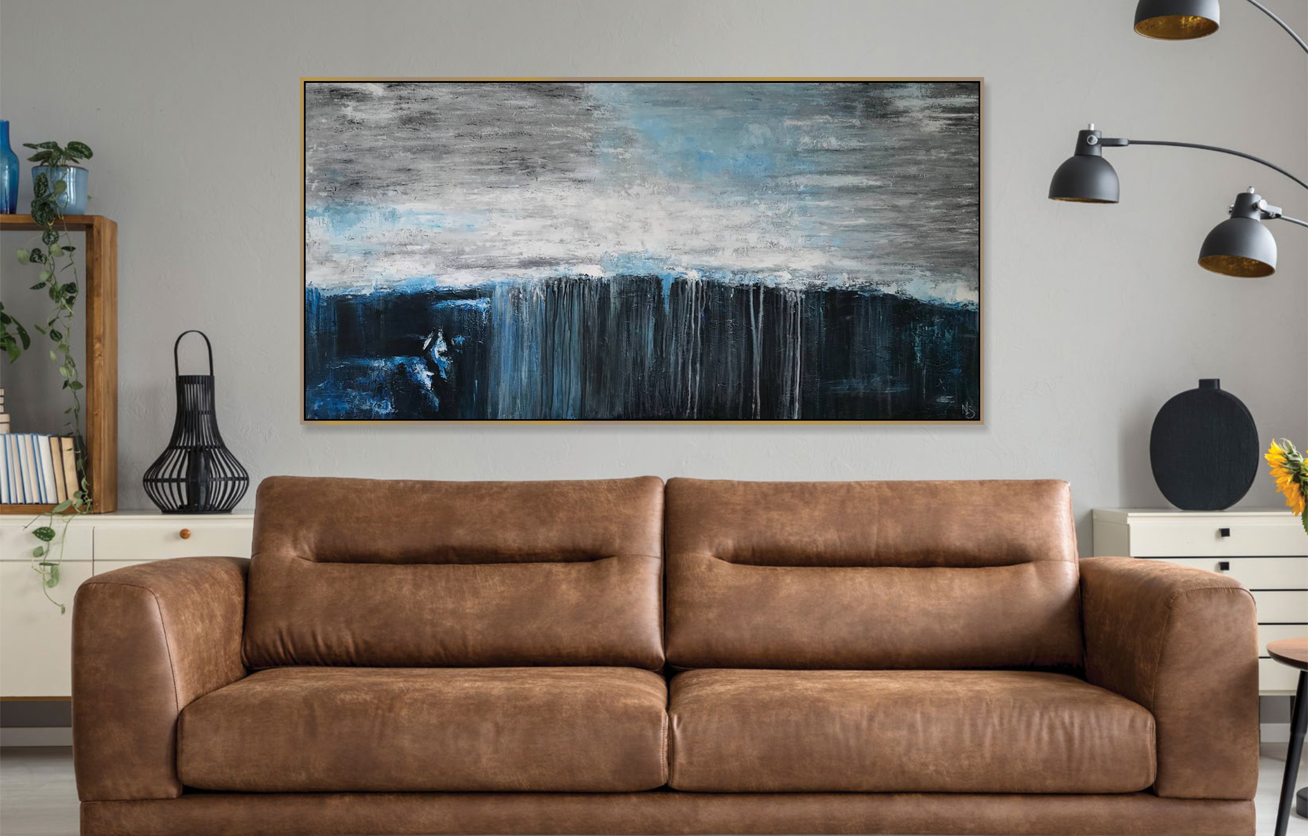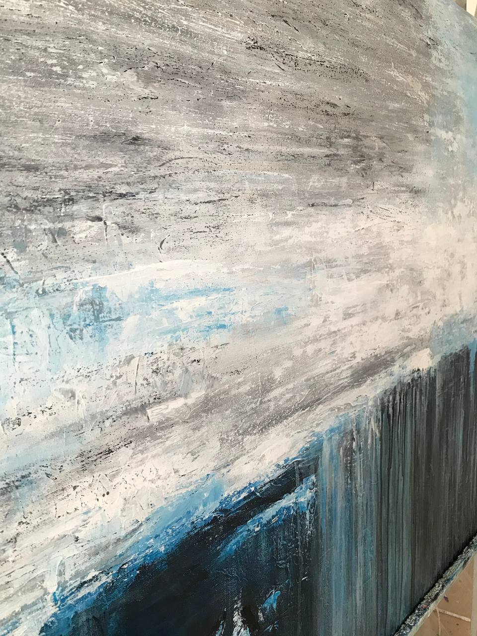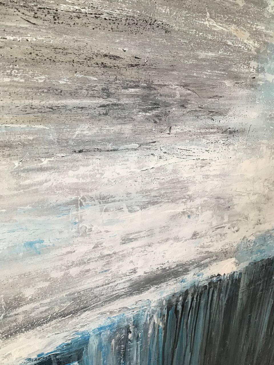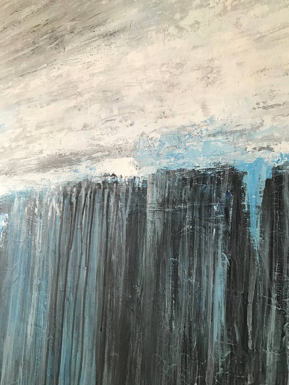 Dieses originelle abstrakte Kunstwerk erhellt Ihren Raum und hebt die Stimmung. Der Künstler ließ sich von der Schönheit der Wassersäule inspirieren, die von einer Klippe herabstürzt. Jeden Moment stürzt die Wassermasse herab und zerfällt immer wieder in tausend Partikel. Er verwendete Blau- und Grautöne, um die kühle Schönheit des Himmels über dem Wasserfall darzustellen. Dieses Wandbild verschönert die Wände Ihres Wohn-, Ess- oder Schlafzimmers.