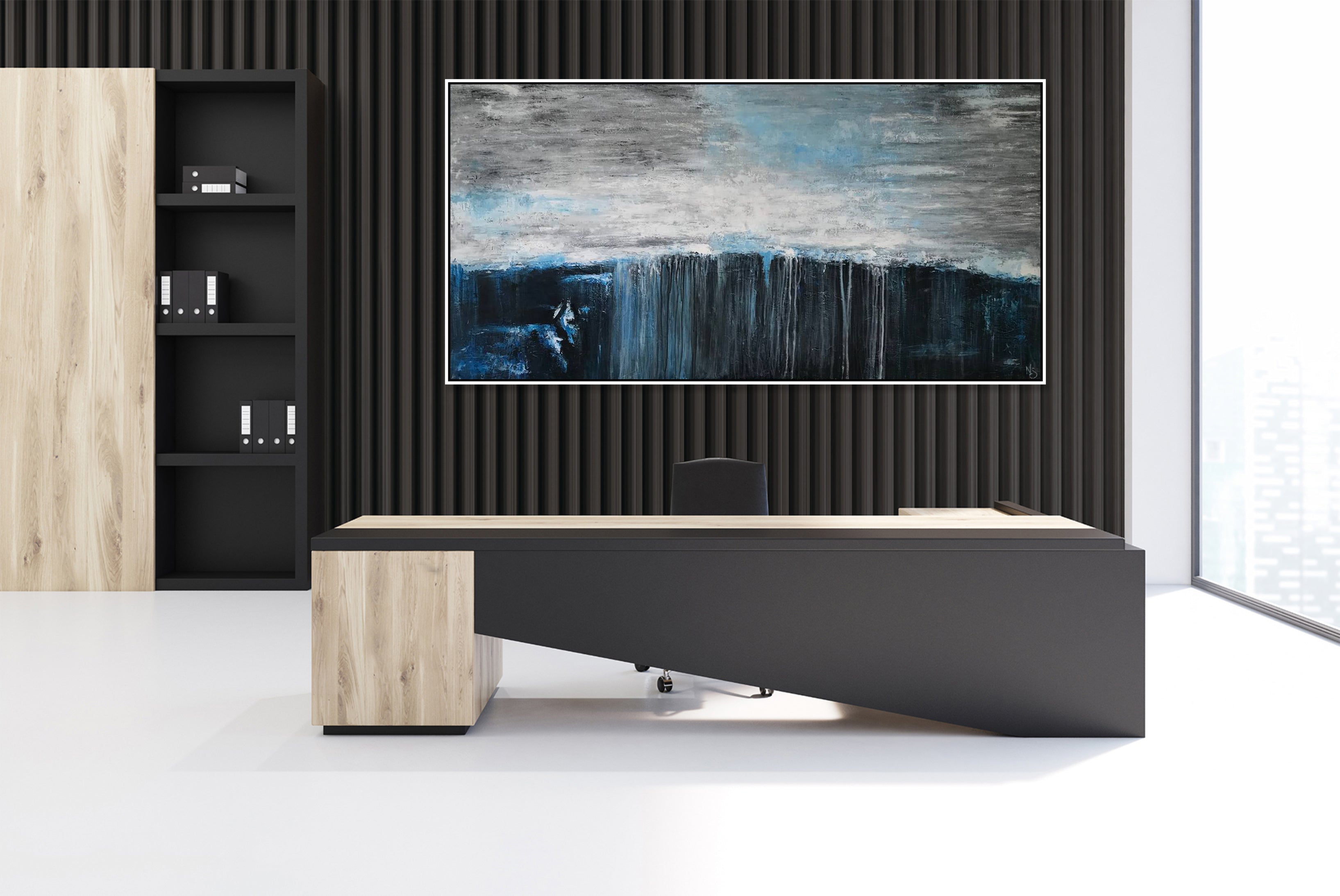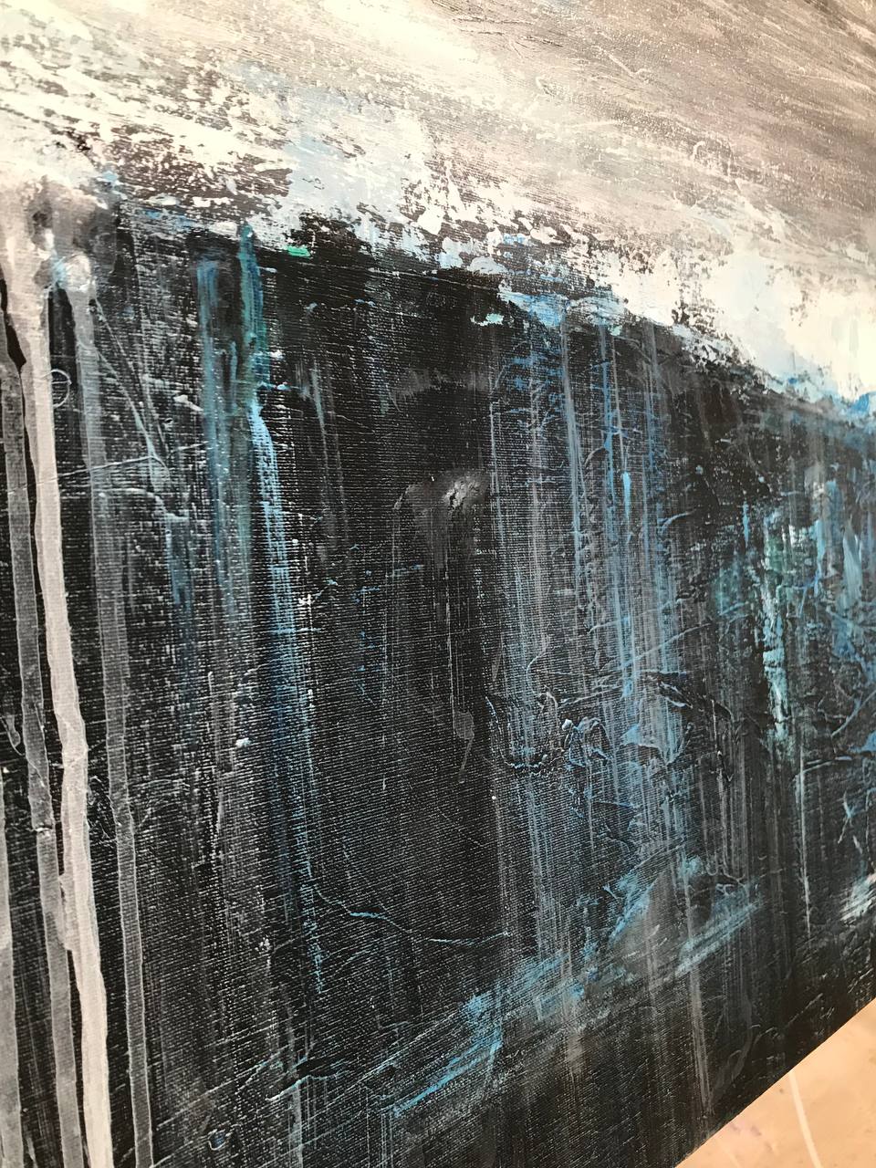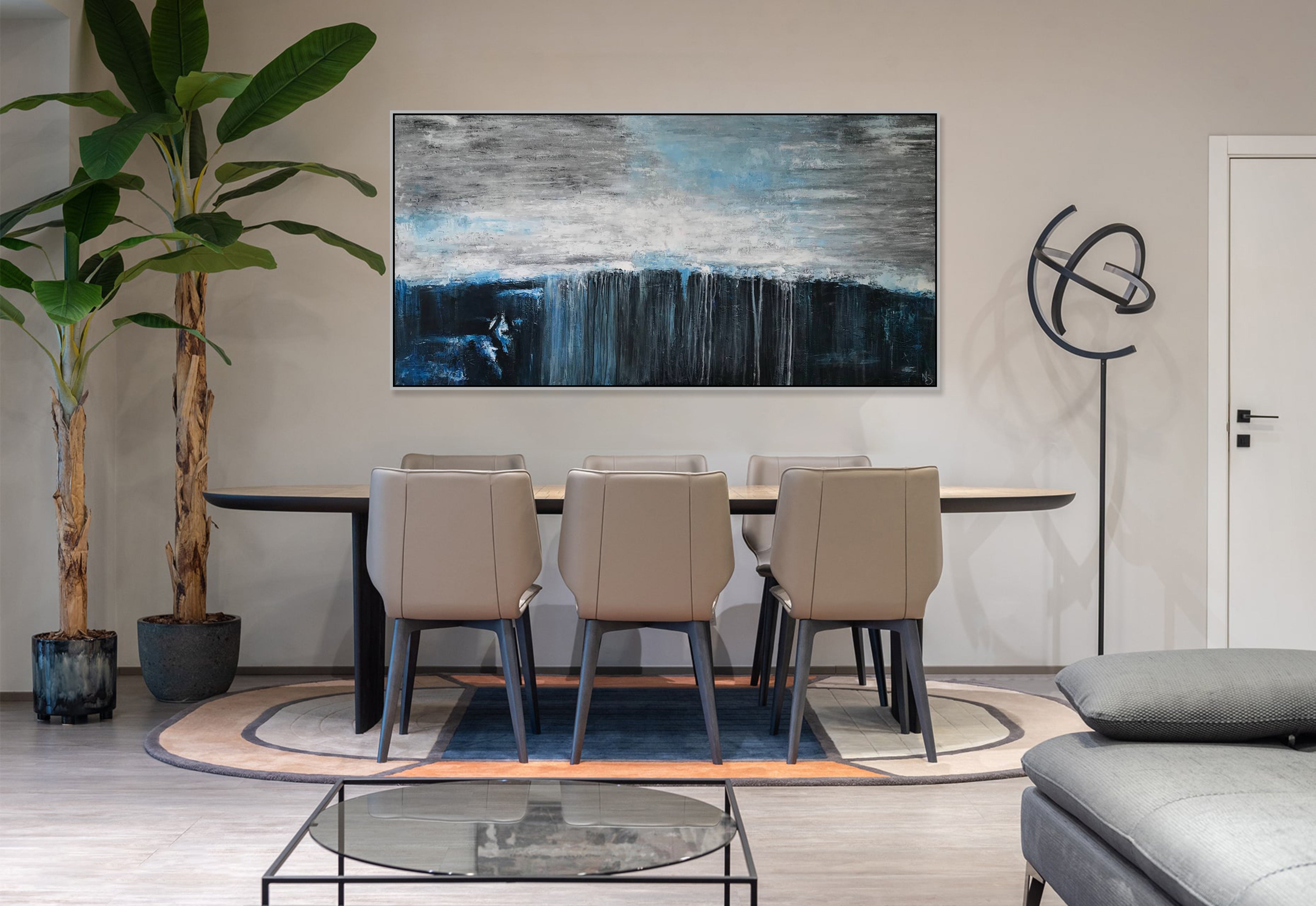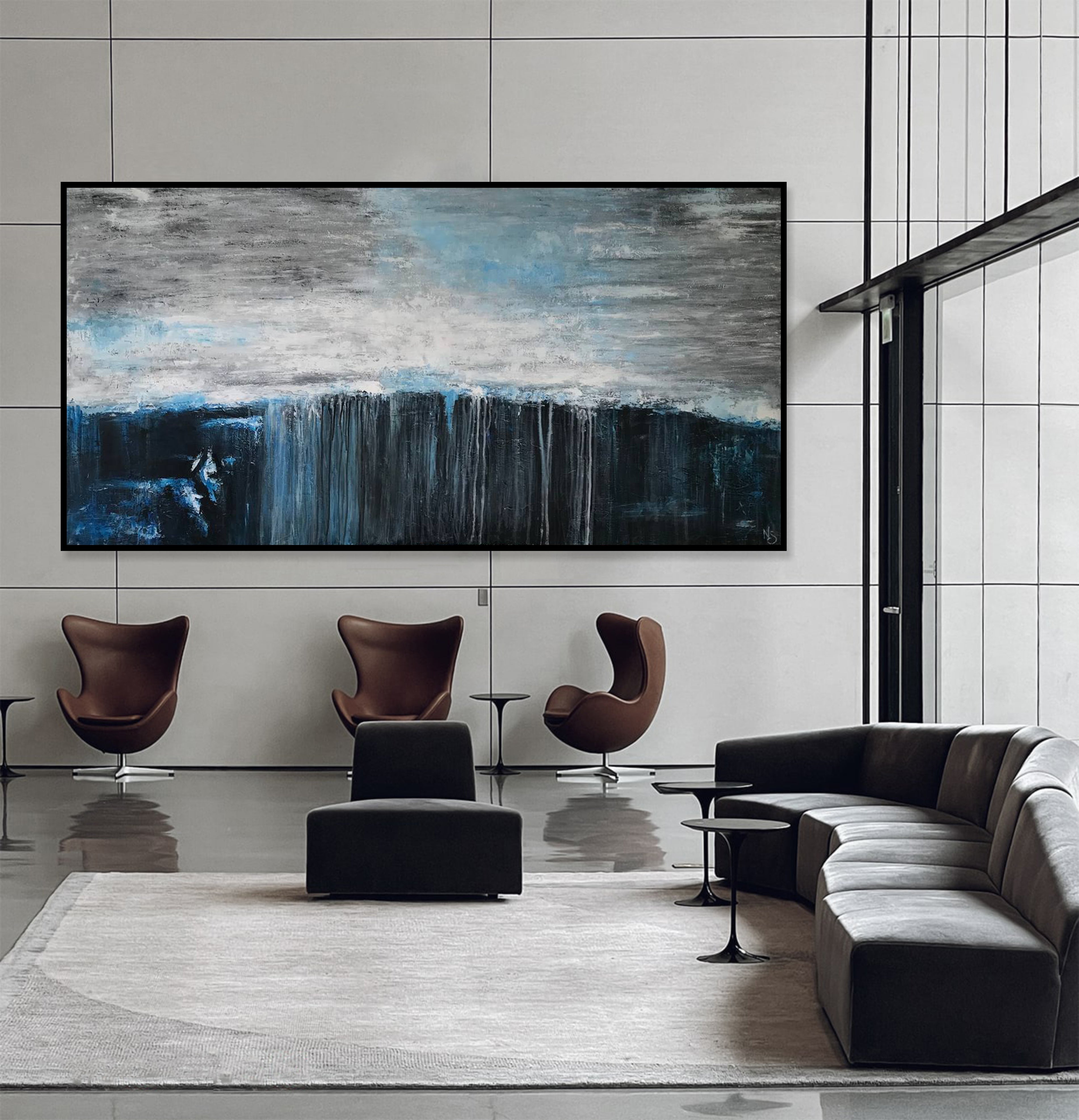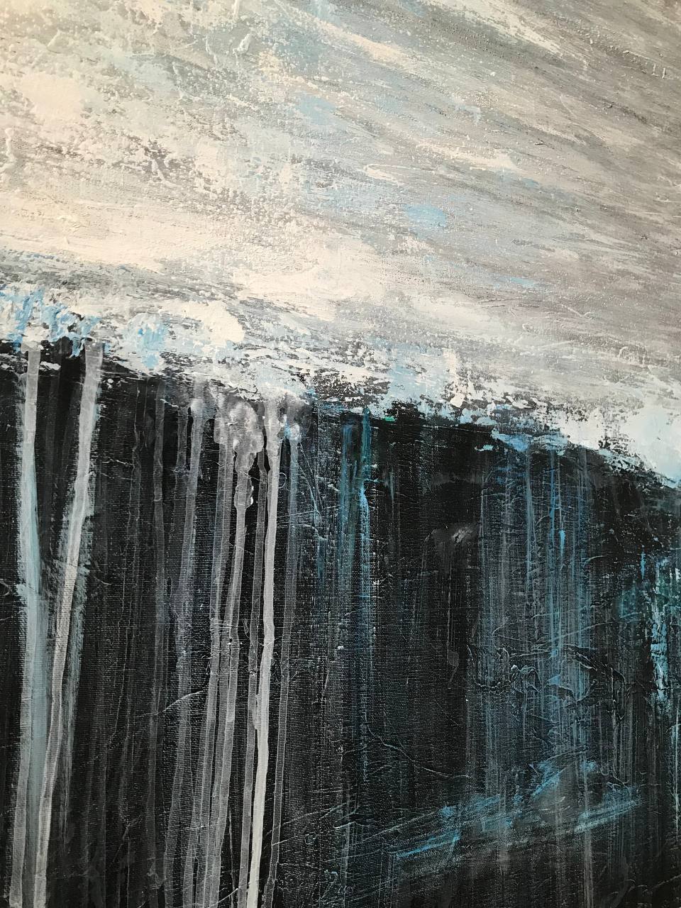 Dieses originelle abstrakte Kunstwerk erhellt Ihren Raum und hebt die Stimmung. Der Künstler ließ sich von der Schönheit der Wassersäule inspirieren, die von einer Klippe herabstürzt. Jeden Moment stürzt die Wassermasse herab und zerfällt immer wieder in tausend Partikel. Er verwendete Blau- und Grautöne, um die kühle Schönheit des Himmels über dem Wasserfall darzustellen. Dieses Wandbild verschönert die Wände Ihres Wohn-, Ess- oder Schlafzimmers.
