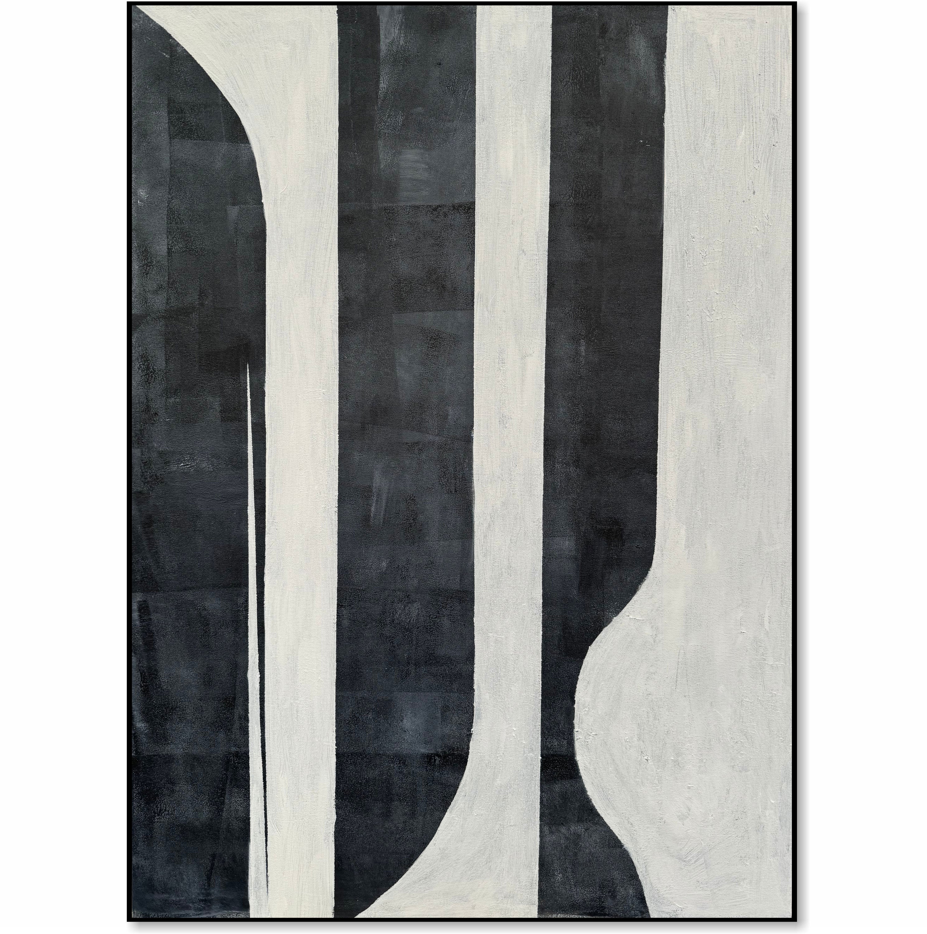 Dieses große, minimalistische, abstrakte Gemälde zeichnet sich durch kräftige schwarze und weiße Linien aus, die ein markantes geometrisches Design erzeugen. Die Einfachheit der Formen und die monochrome Palette machen dieses Kunstwerk zu einer perfekten Ergänzung für moderne oder zeitgenössische Innenräume. Diese elegante Leinwand ist ideal für Wohnzimmer, Büros oder Schlafzimmer und verleiht Ihren Wänden einen Hauch von Minimalismus und Raffinesse. Der subtile Kontrast und die anmutigen Linien vermitteln ein Gefühl der Ausgewogenheit und machen es zu einem kraftvollen und dennoch dezenten Statement-Stück für jeden Raum.