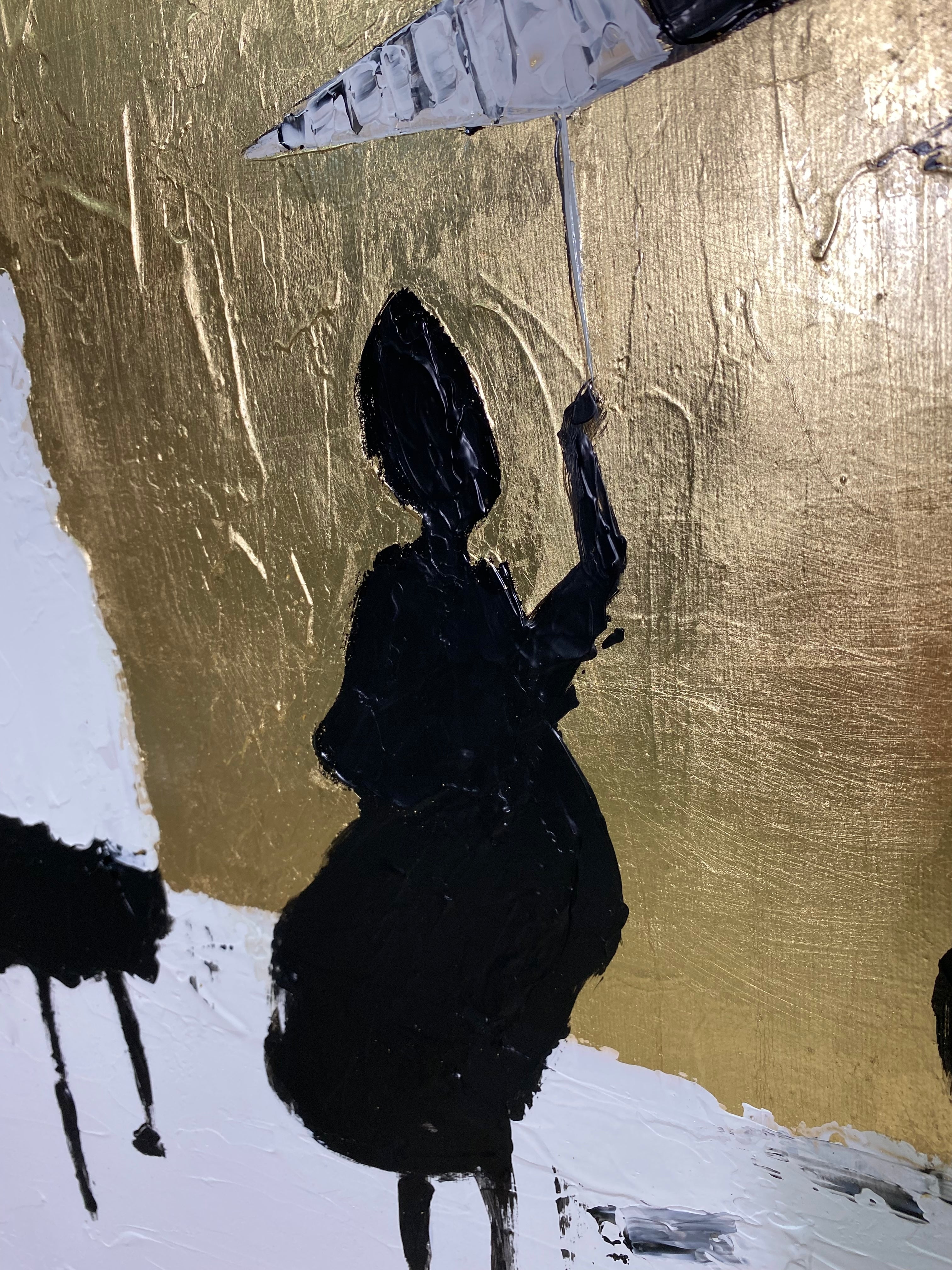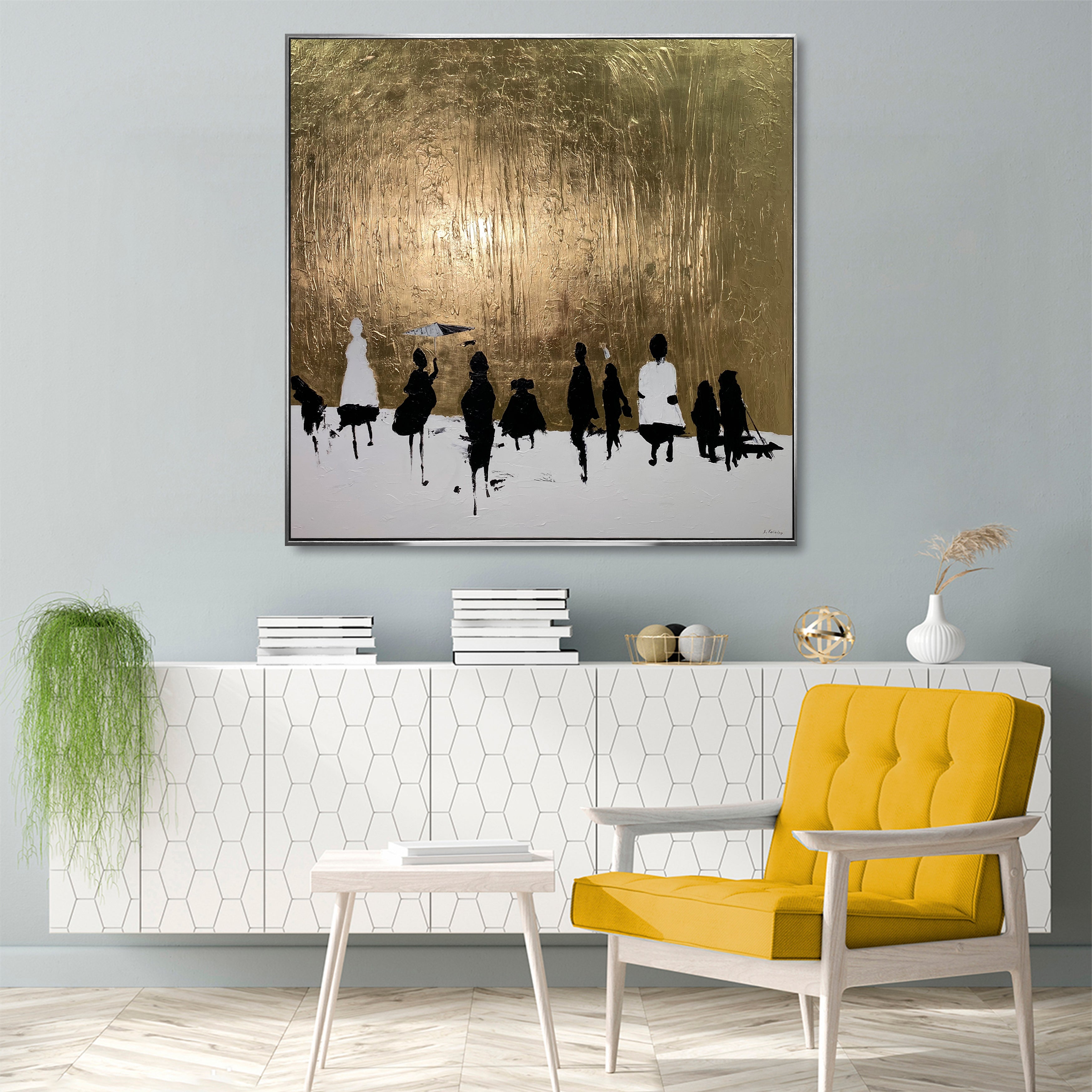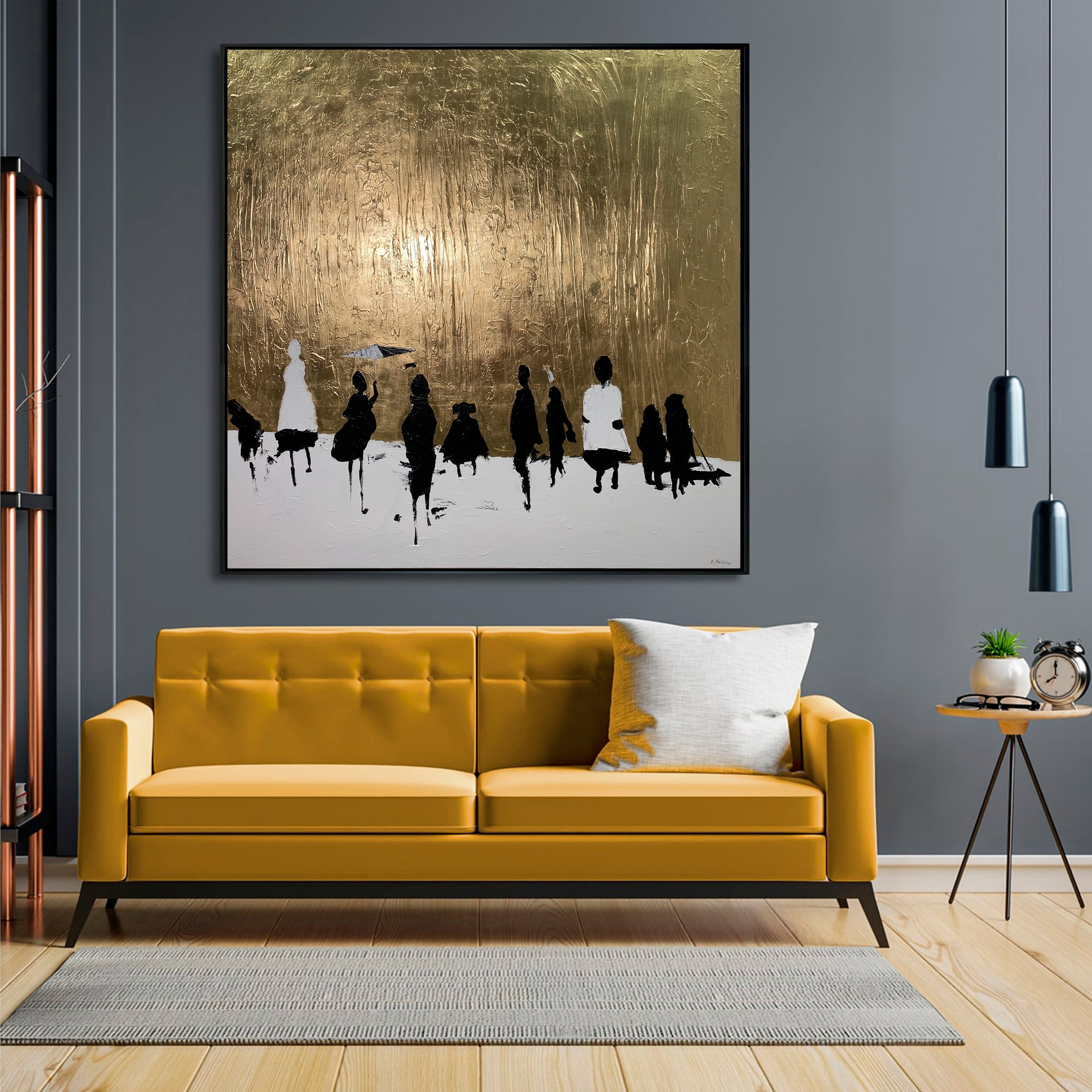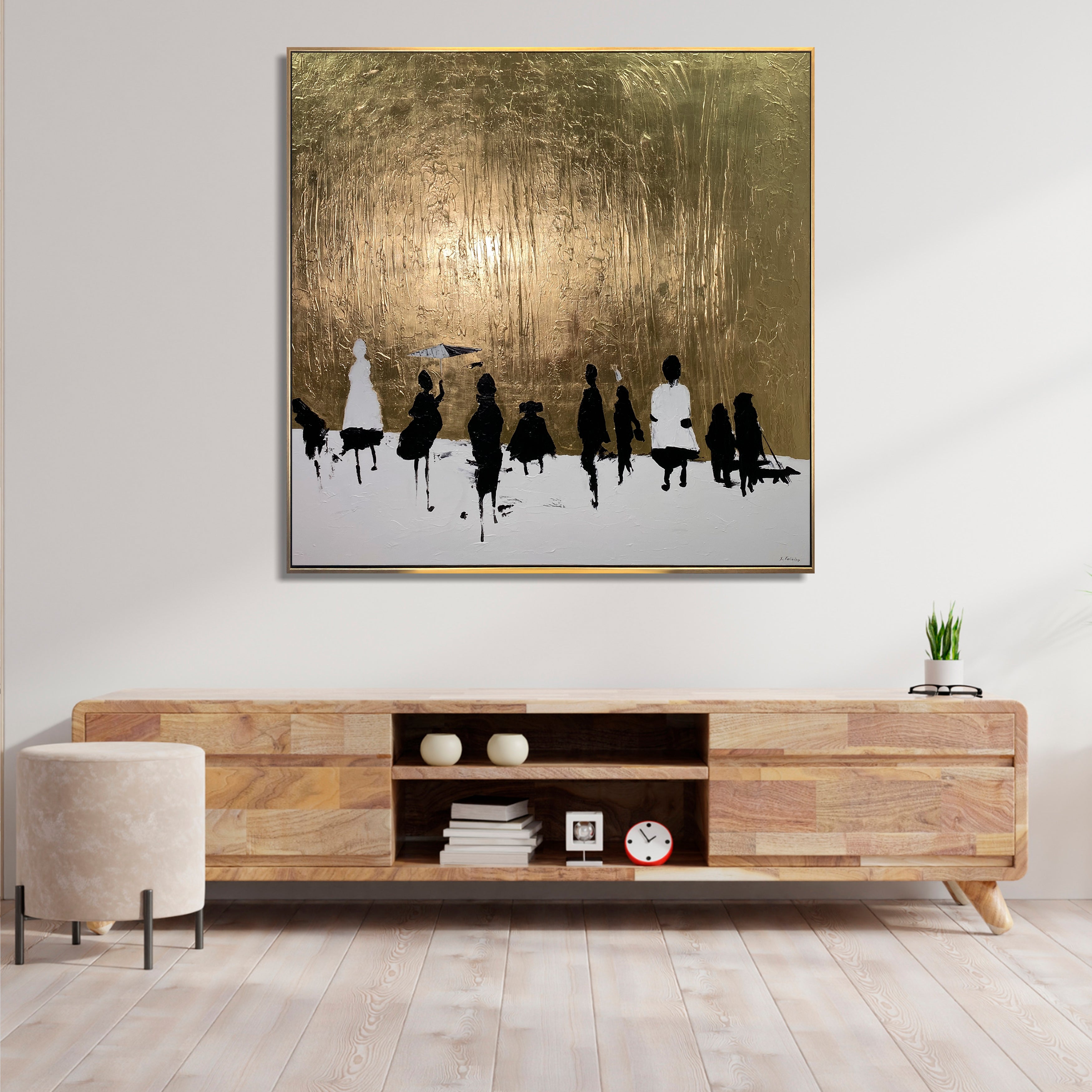 Dieses Gemälde ist eine Fantasie des Künstlers. Das Thema ist "Wie das Regenwetter aussehen würde, wenn der Regen goldene Farbe hätte". Was wäre, wenn die Menschen in goldenem Nebel gezeichnet wären, wäre das nicht faszinierend? Die Menschen auf der Leinwand sind auf dem Weg, um alltägliche Dinge zu erledigen, aber vor dem Hintergrund des goldenen Regens sieht alles noch atemberaubender aus.