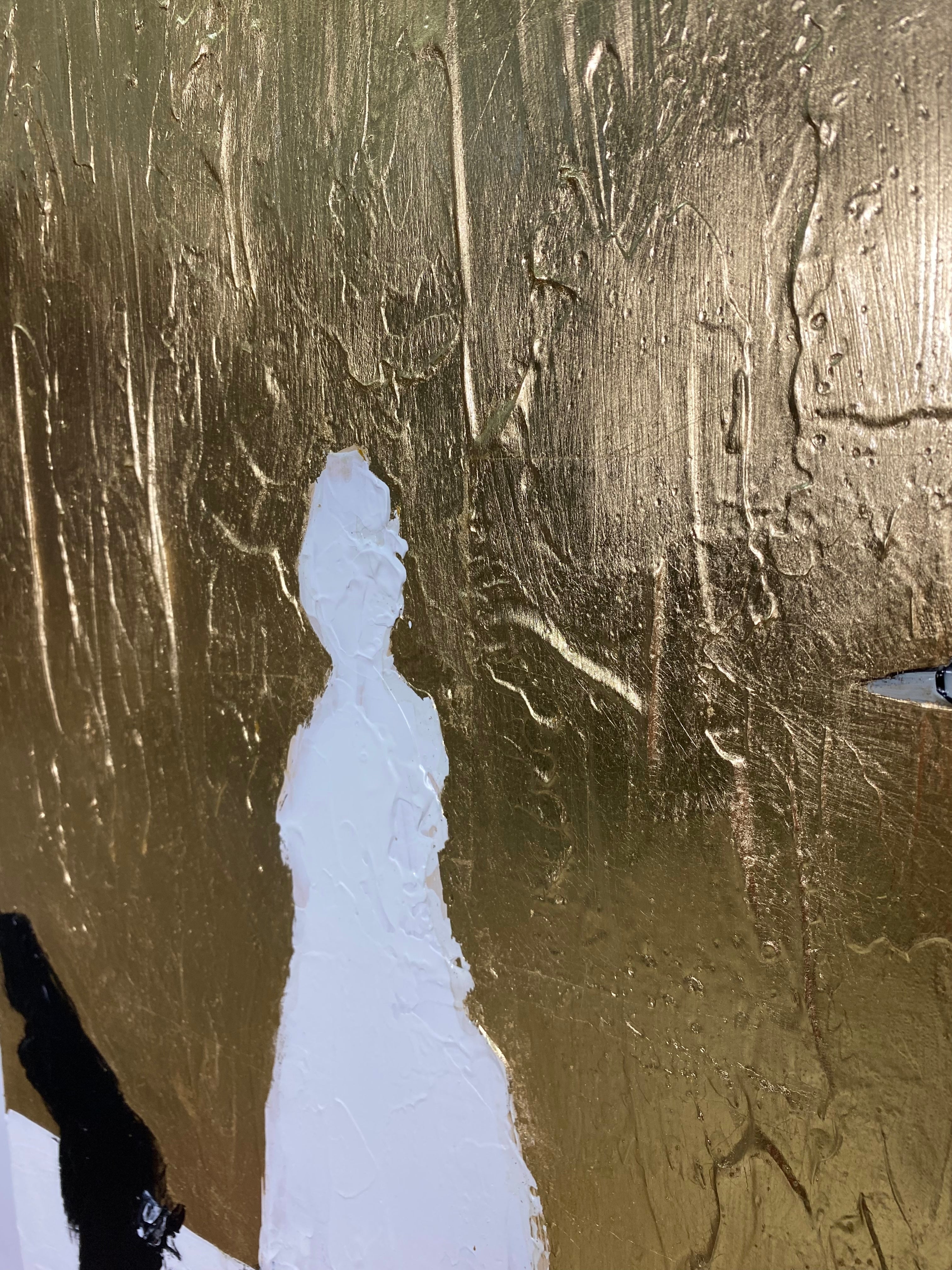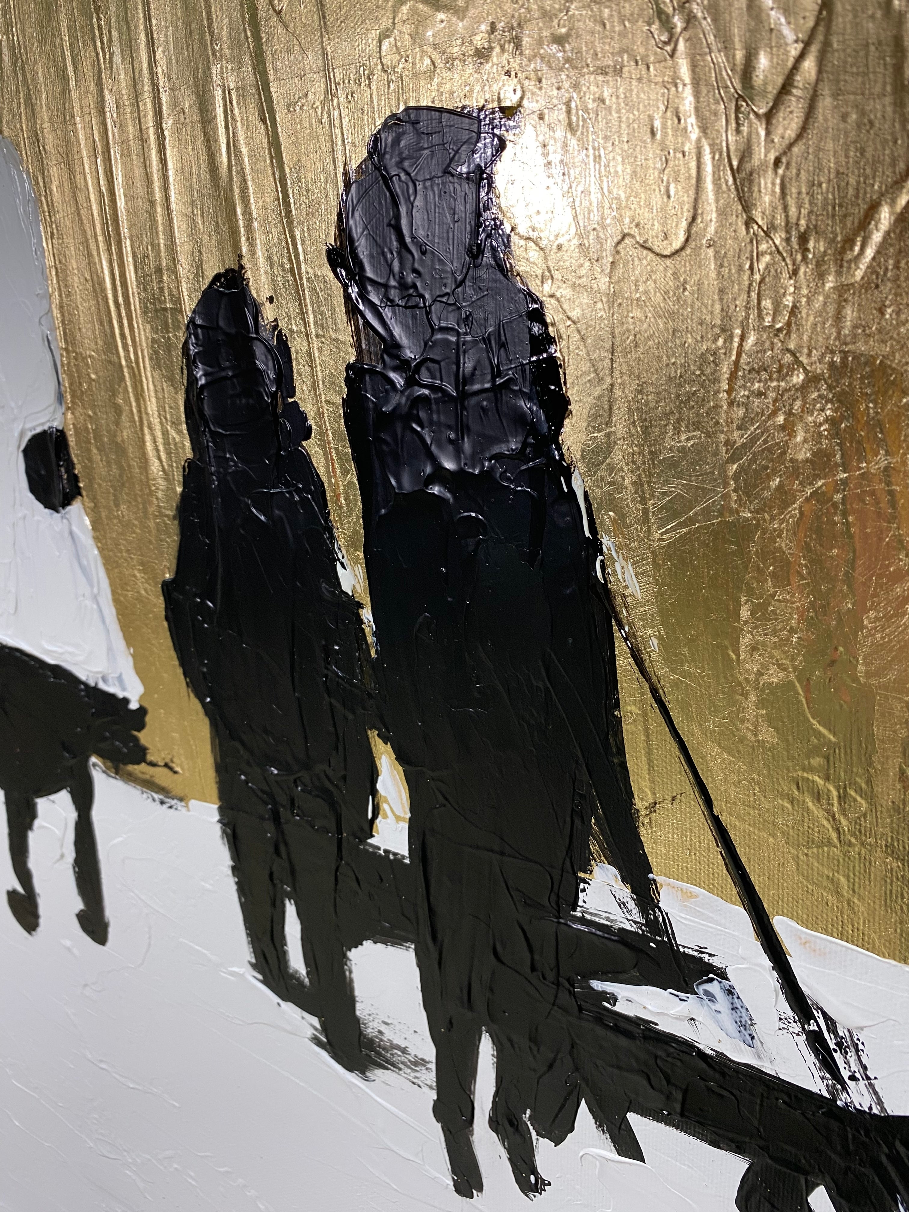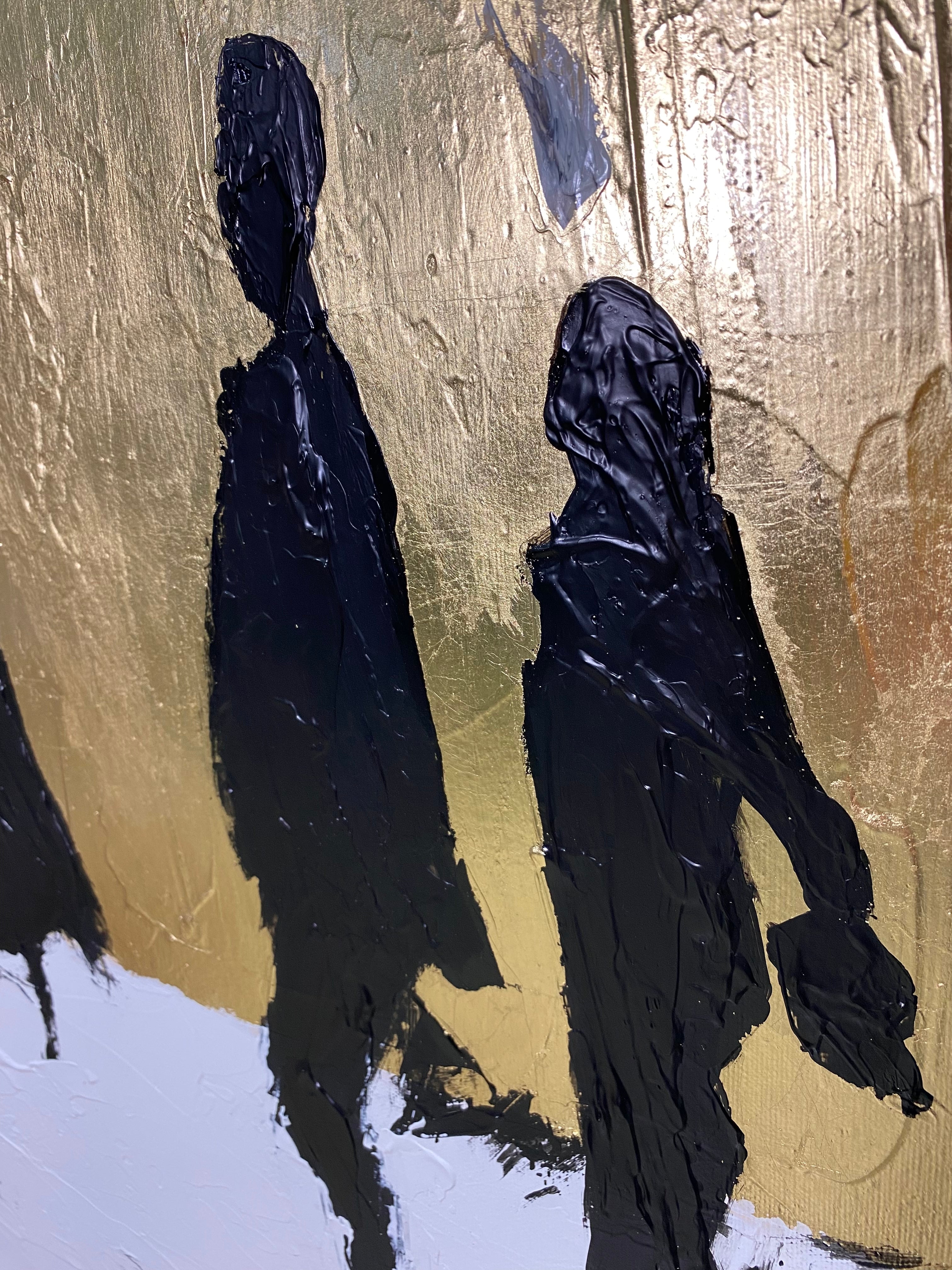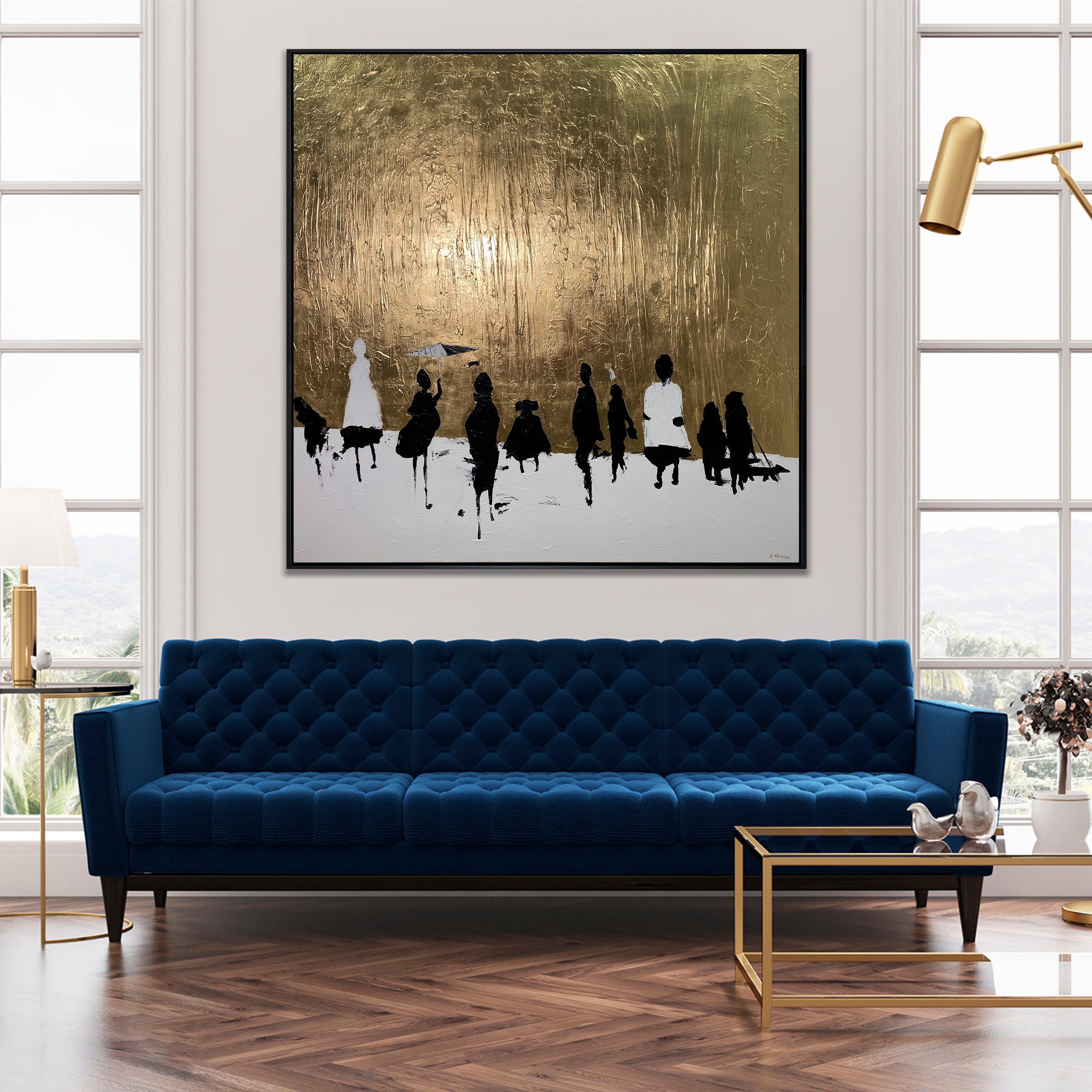 Dieses Gemälde ist eine Fantasie des Künstlers. Das Thema ist "Wie das Regenwetter aussehen würde, wenn der Regen goldene Farbe hätte". Was wäre, wenn die Menschen in goldenem Nebel gezeichnet wären, wäre das nicht faszinierend? Die Menschen auf der Leinwand sind auf dem Weg, um alltägliche Dinge zu erledigen, aber vor dem Hintergrund des goldenen Regens sieht alles noch atemberaubender aus.