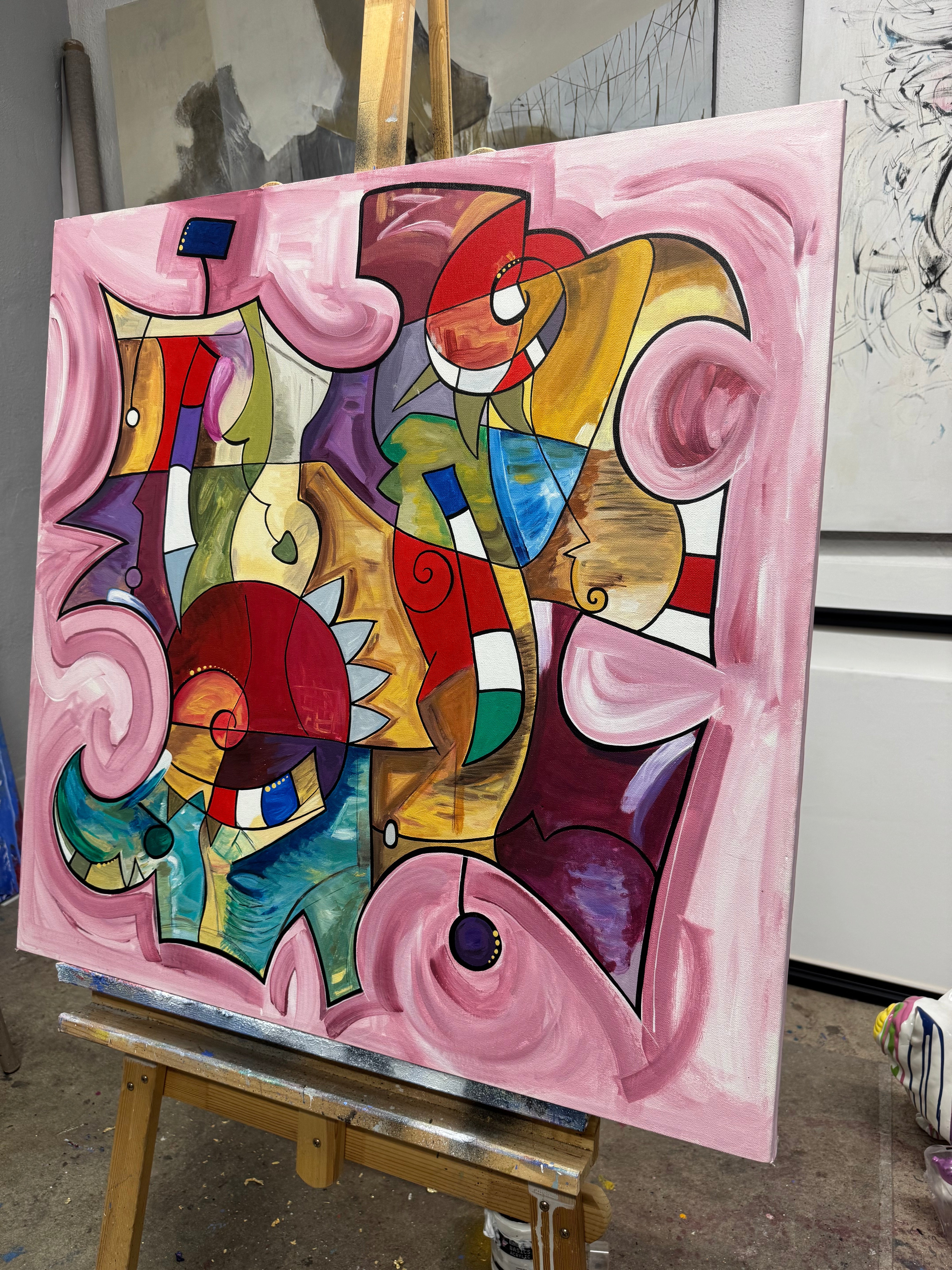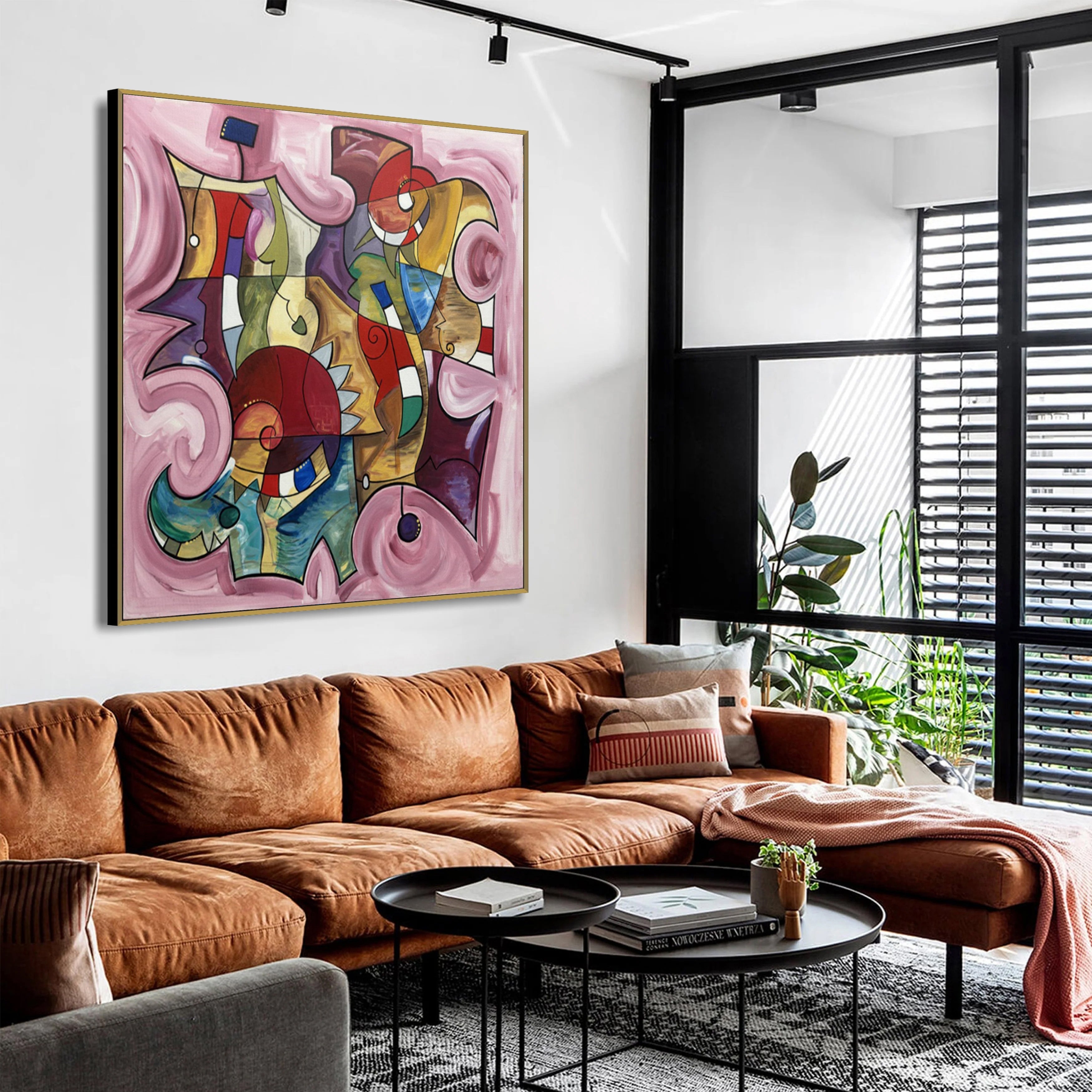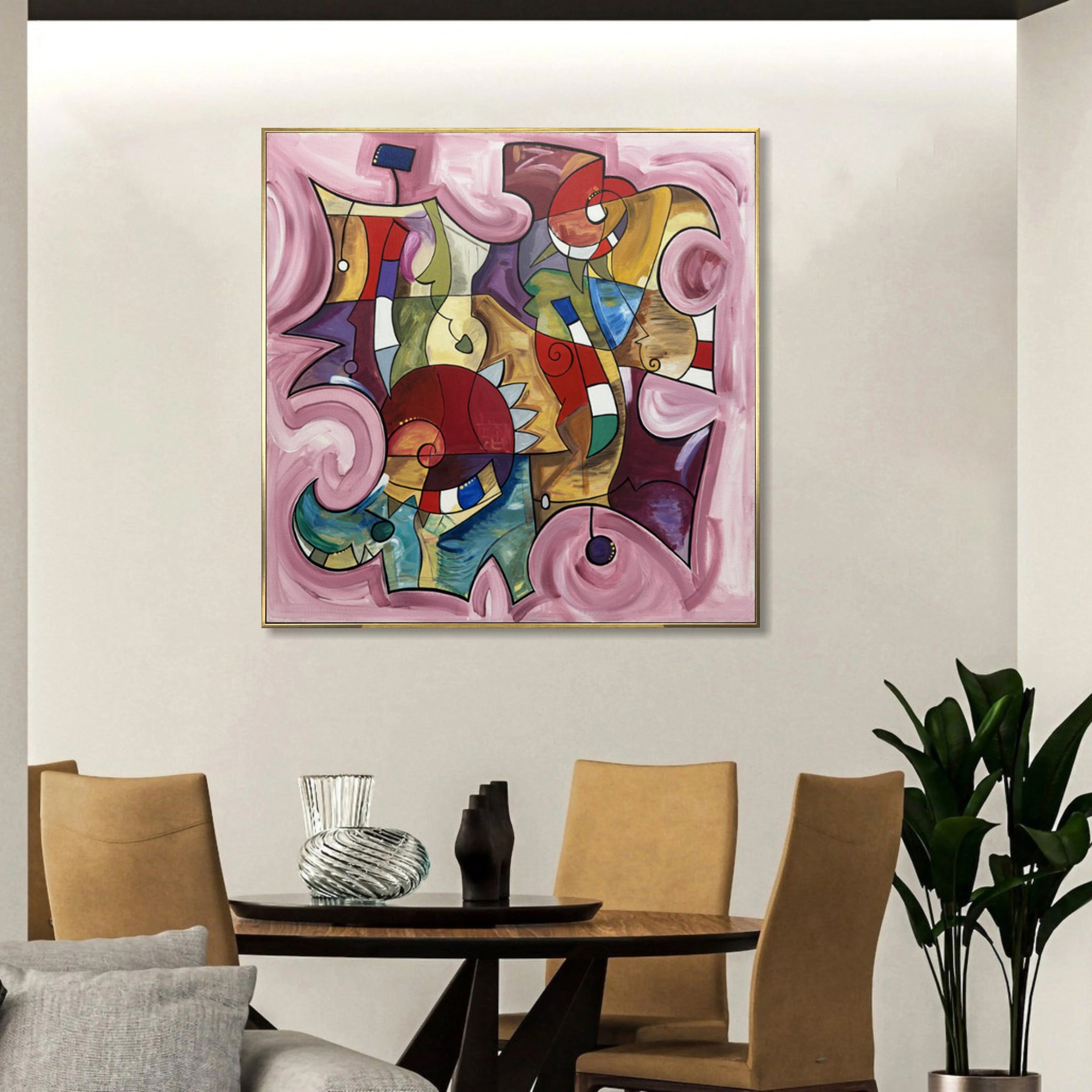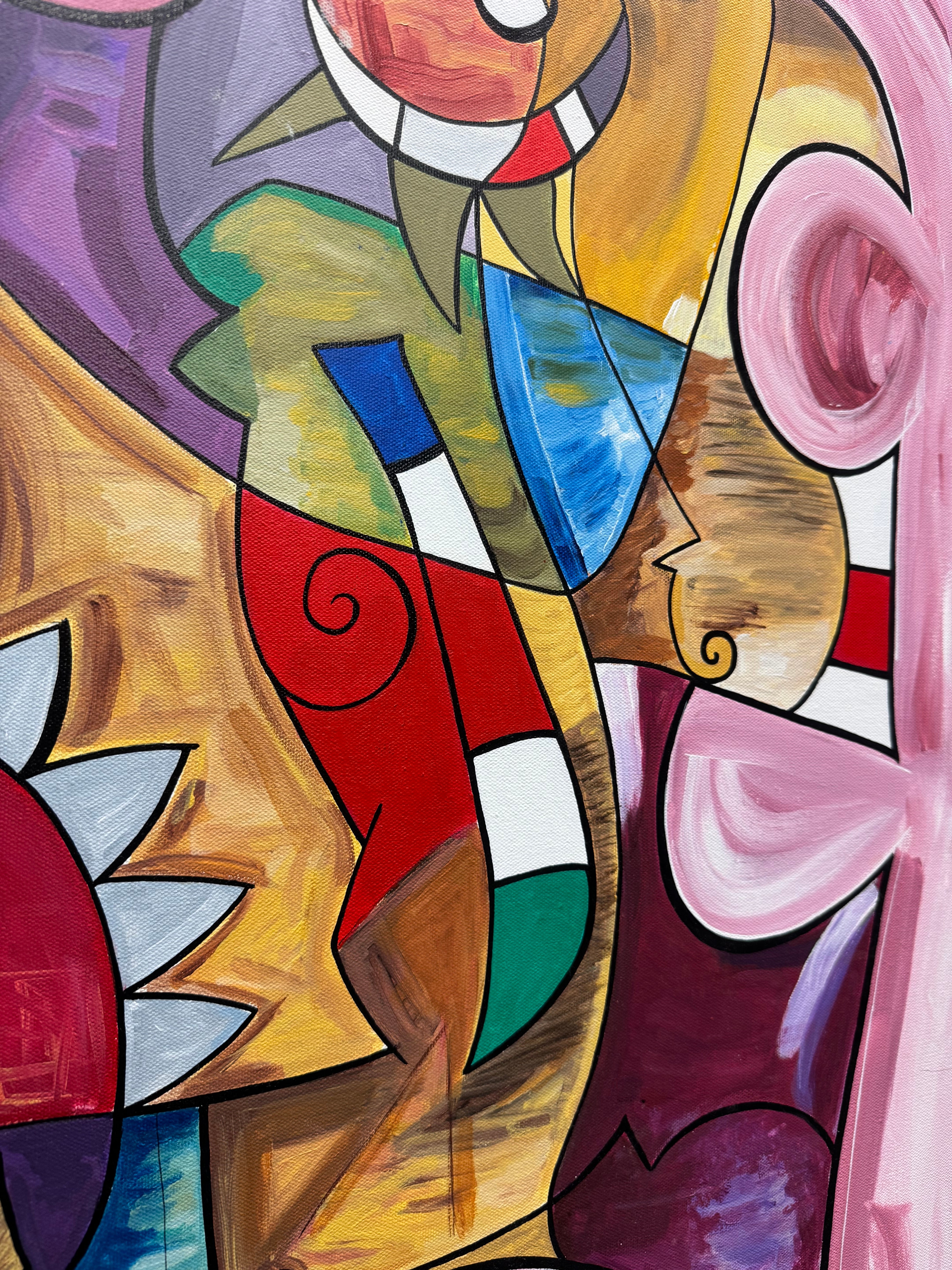 Ein lebendiges kubistisches abstraktes Gemälde mit kräftigen geometrischen Formen und satten Farben verleiht modernen Innenräumen künstlerische Energie. Ideal für Zuhause oder Büro. Entdecken Sie mehr!