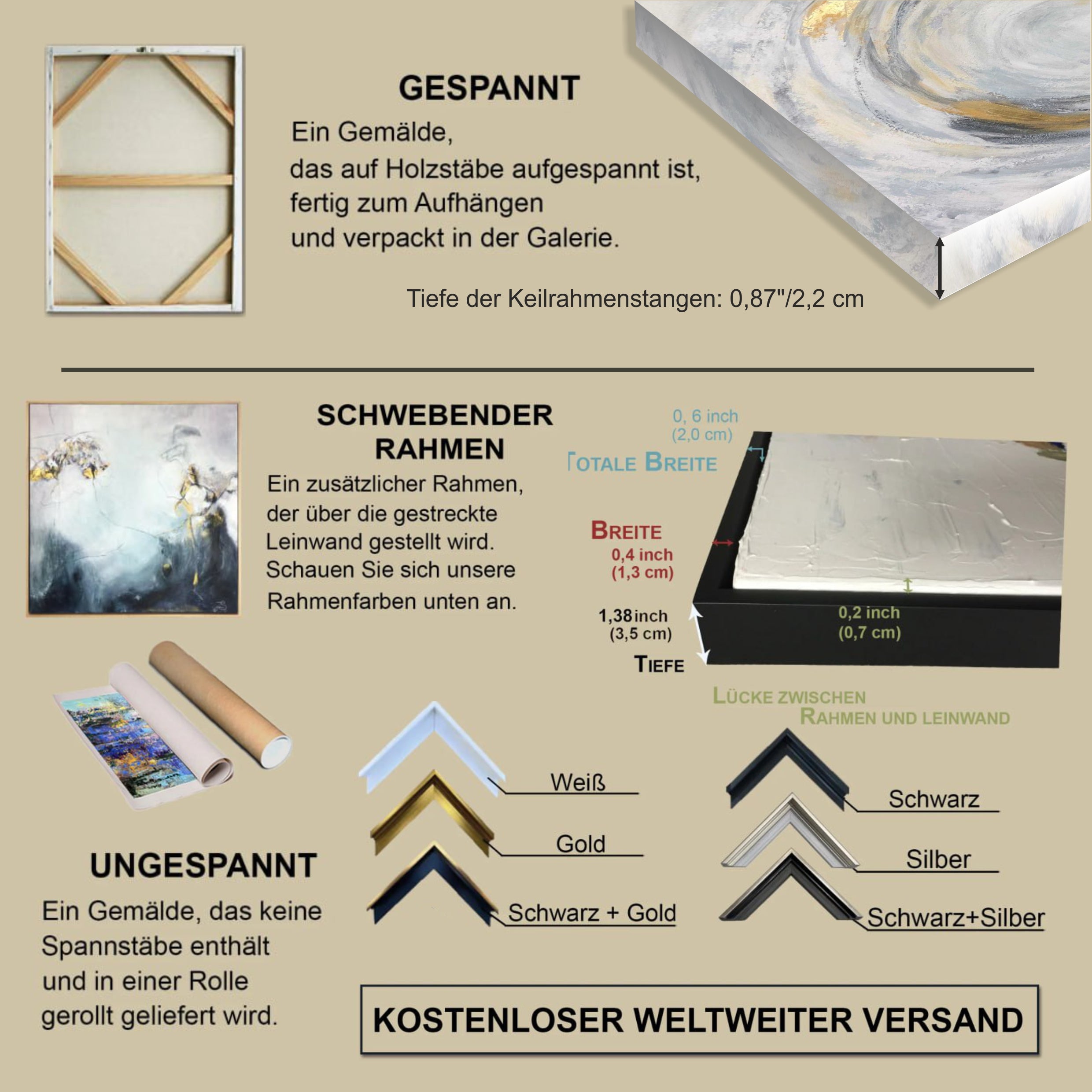"Gestreckt+eingerahmt" - es handelt sich um einen zusätzlichen schwimmenden Holzrahmen, der um die aufgespannte Leinwand montiert wird. Bitte beachten Sie, dass wir unsere Rahmen nur mit der Option "Gestreckt" anbieten.