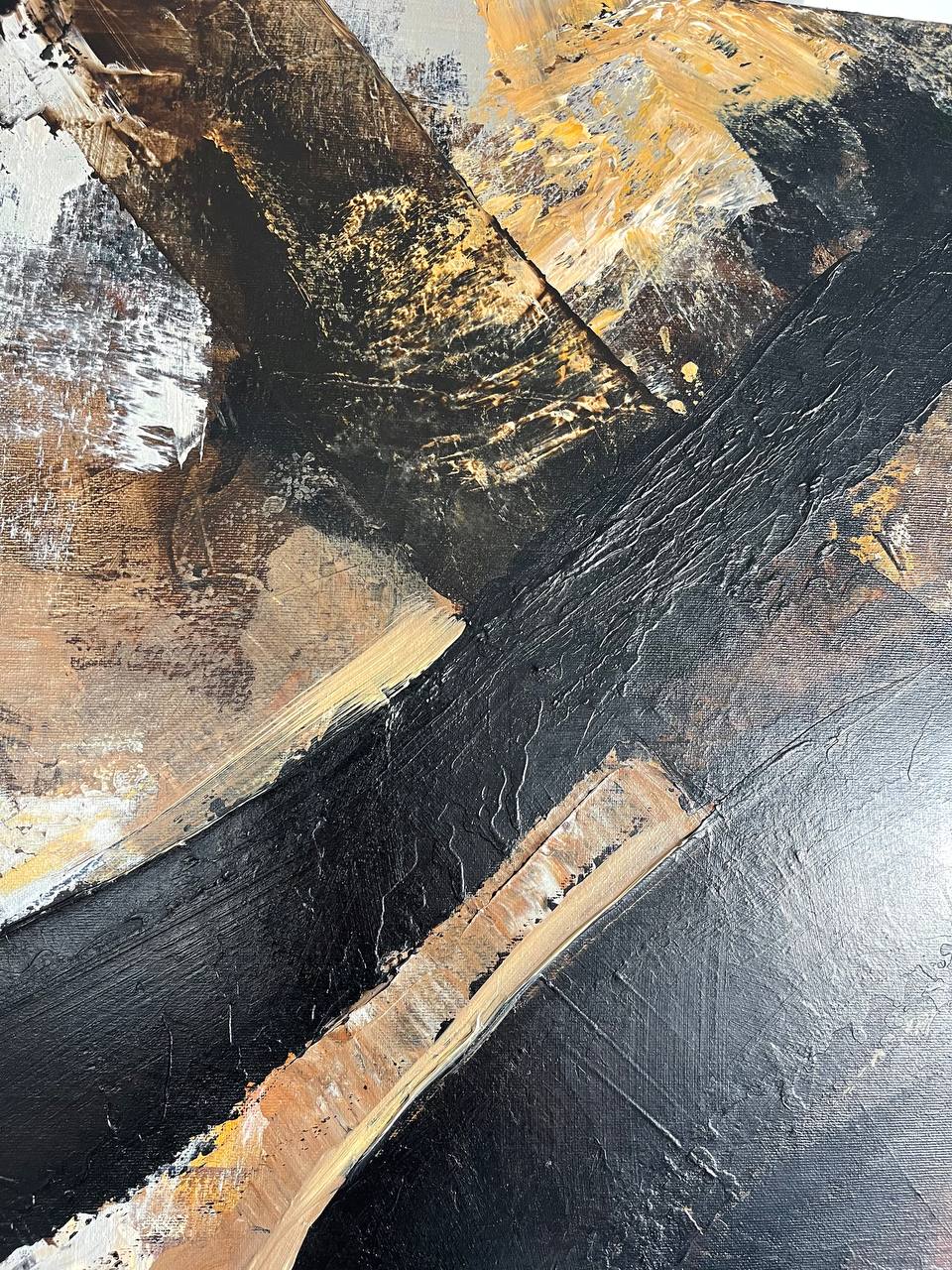 „BLACK EXPRESSION“ ist ein faszinierendes monochromatisches Meisterwerk, überwiegend in tiefen Schwarz- und klaren Weißtönen komponiert, mit subtilen, aber wirkungsvollen Akzenten in warmen Brauntönen. Dieses eindrucksvolle Gemälde fängt die Essenz von Kontrast und Emotion ein, indem es das Zusammenspiel von Licht und Schatten erforscht und den Betrachter einlädt, in eine Welt tiefgreifenden Ausdrucks und Selbstbeobachtung einzutauchen.