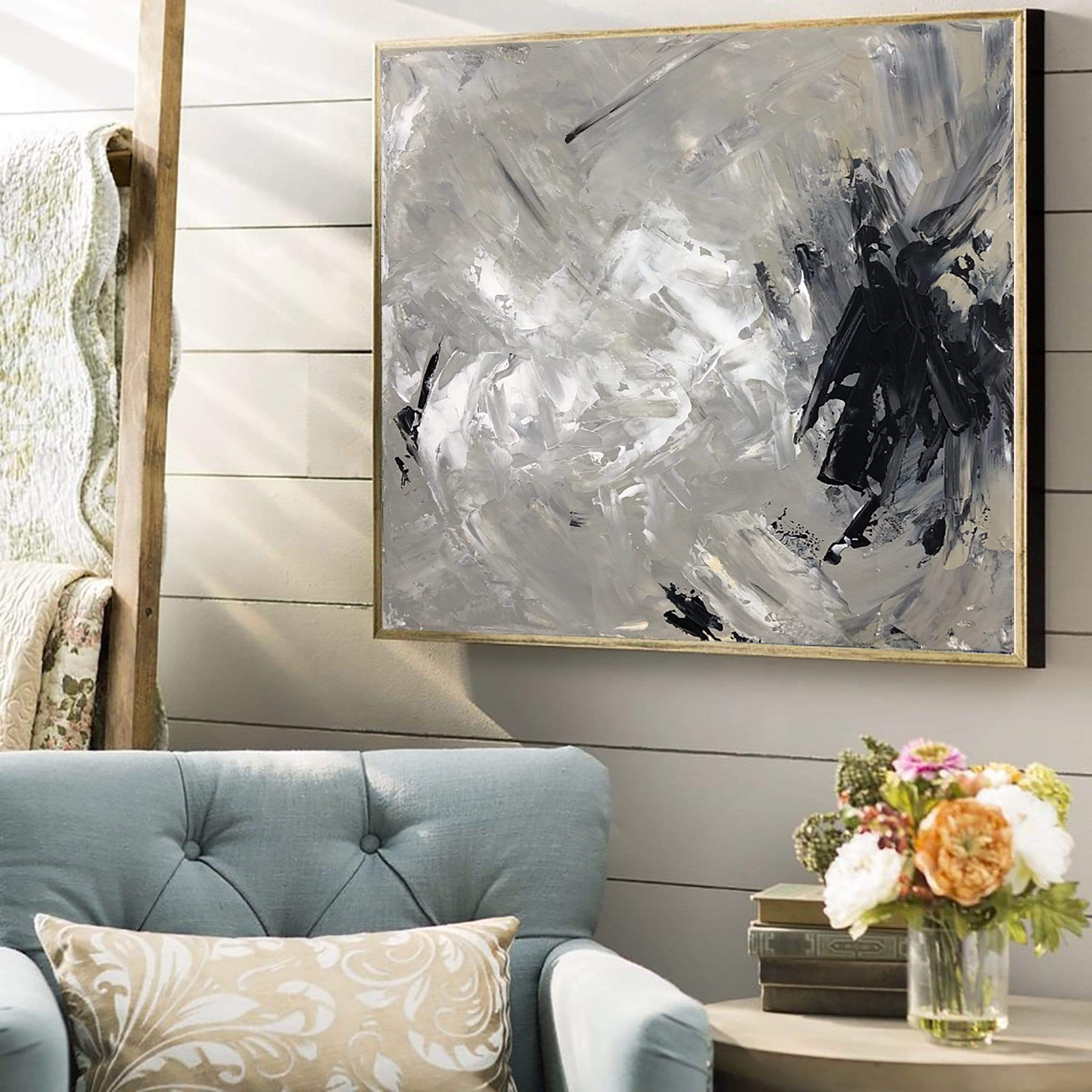 Abstrakte graue Malerei auf Leinwand Expressionistische Malerei Strukturierte Schwarz-Weiß-Wandmalerei Minimalistische Schwarze Flecken Malerei | BLOT - Trend Gallery Art | Original abstrakte Gemälde
