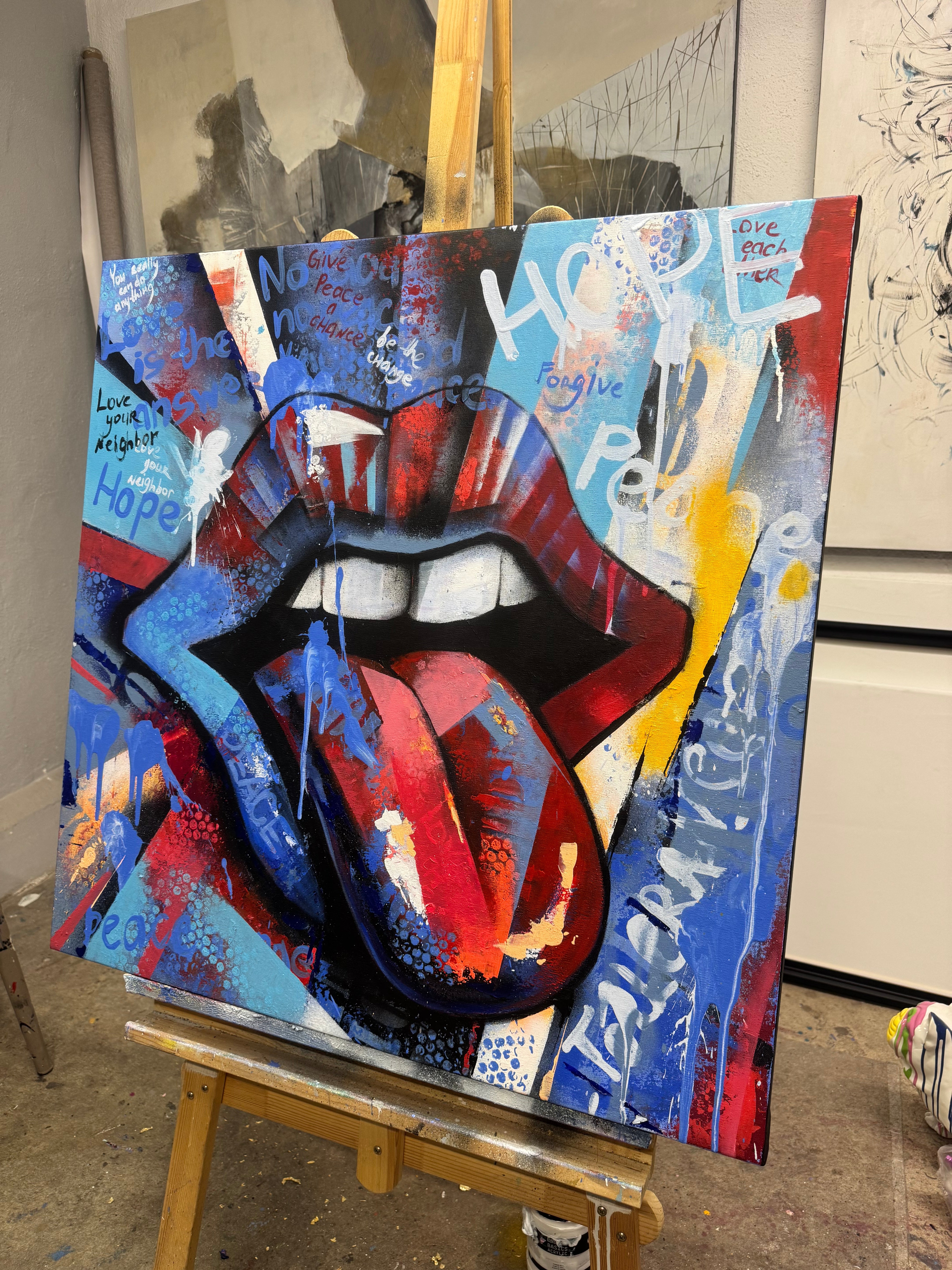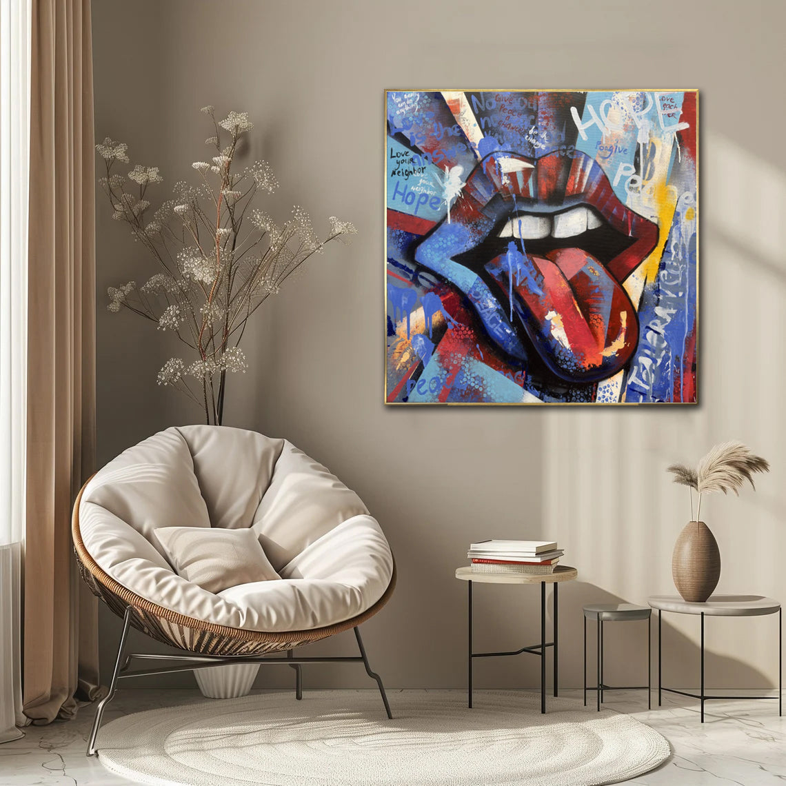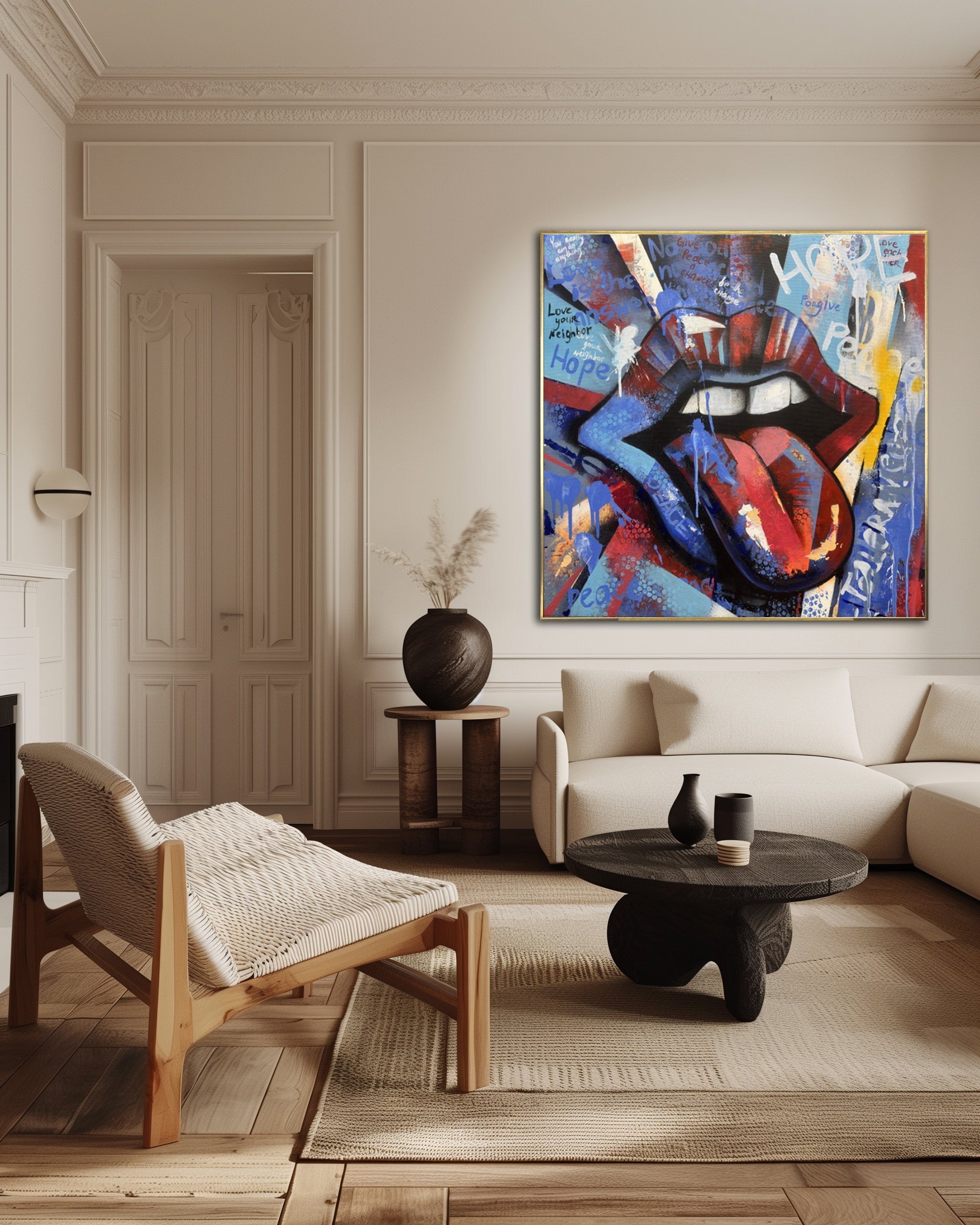 Ausdrucksstarkes großes Pop-Art-Lippen-Gemälde mit kräftigen Farben und energievollem Street-Style setzt ein starkes Statement in modernen Innenräumen. Verleihen Sie Ihrer Wand jetzt ein Upgrade!