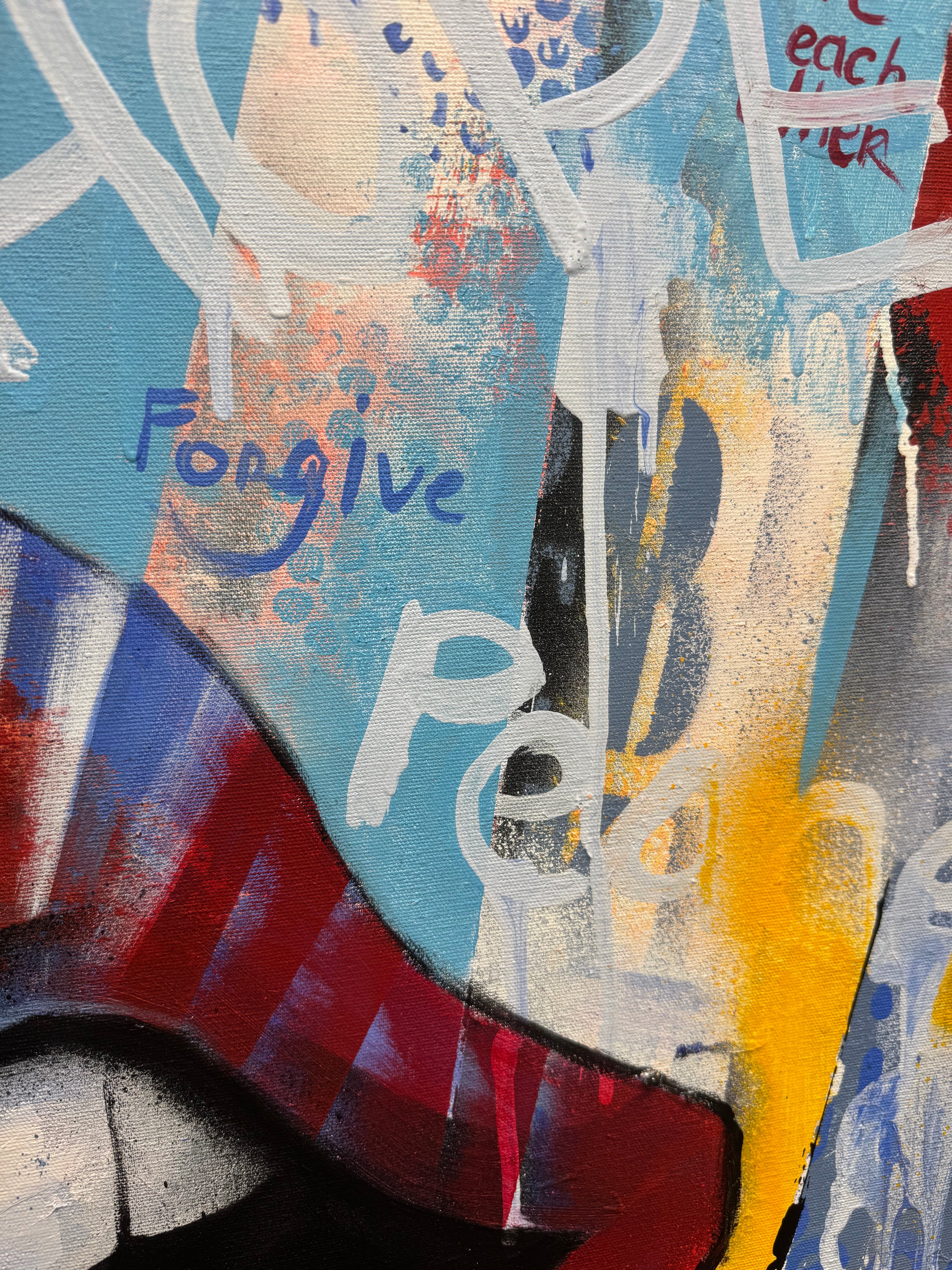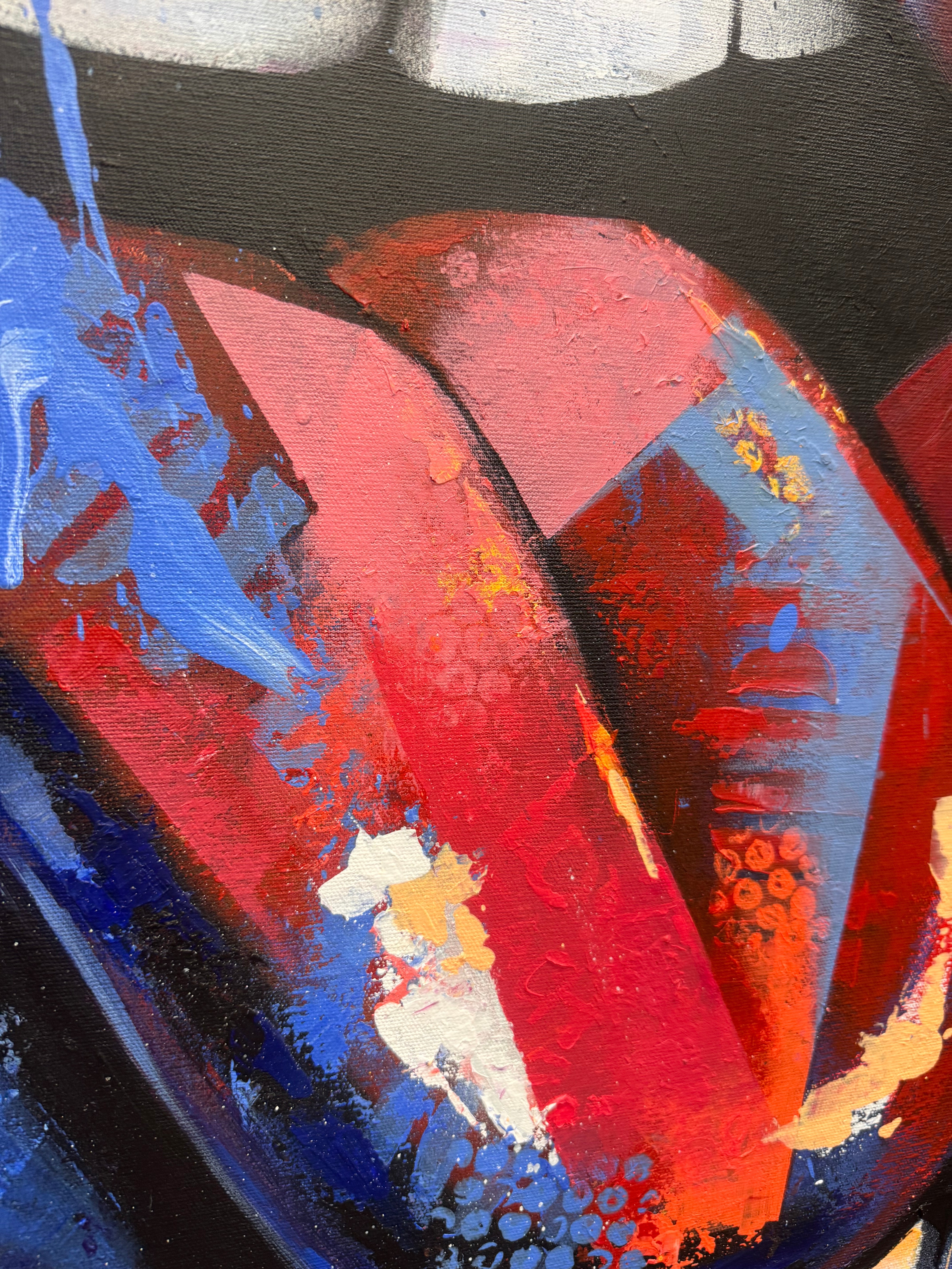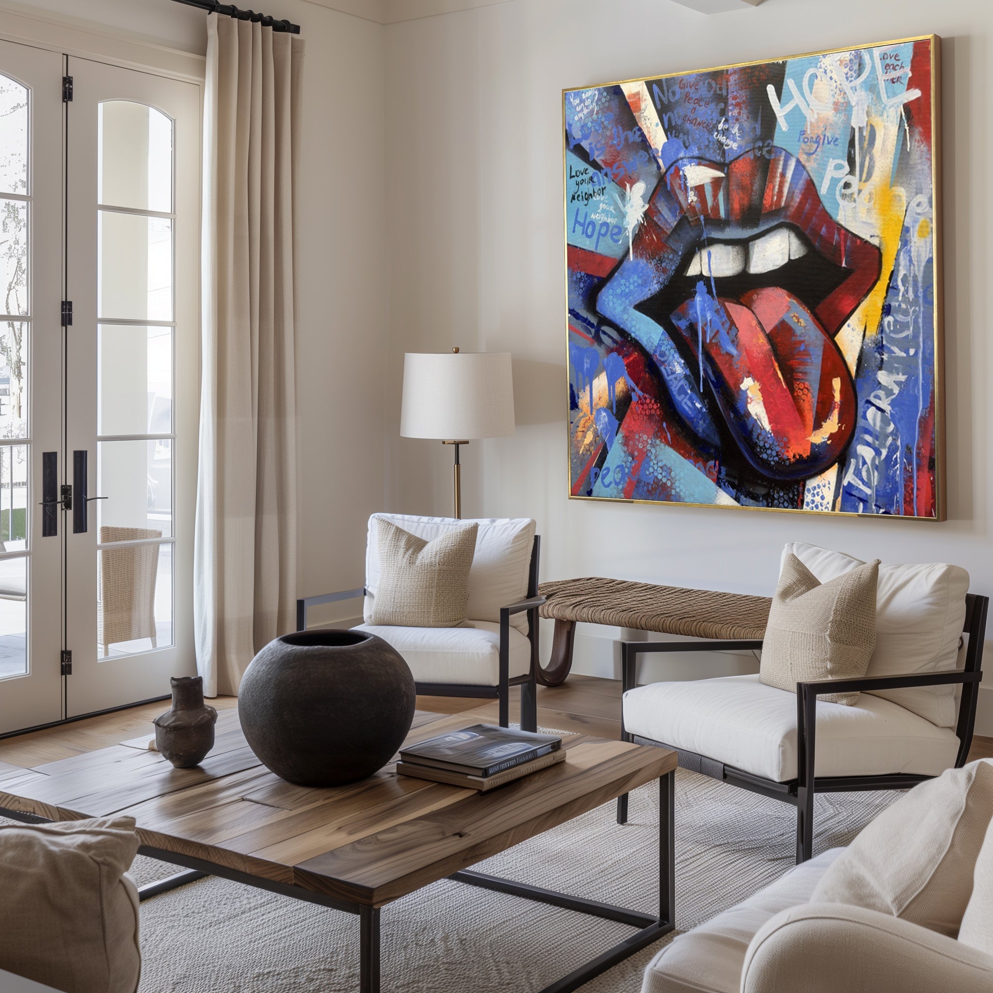 Ausdrucksstarkes großes Pop-Art-Lippen-Gemälde mit kräftigen Farben und energievollem Street-Style setzt ein starkes Statement in modernen Innenräumen. Verleihen Sie Ihrer Wand jetzt ein Upgrade!