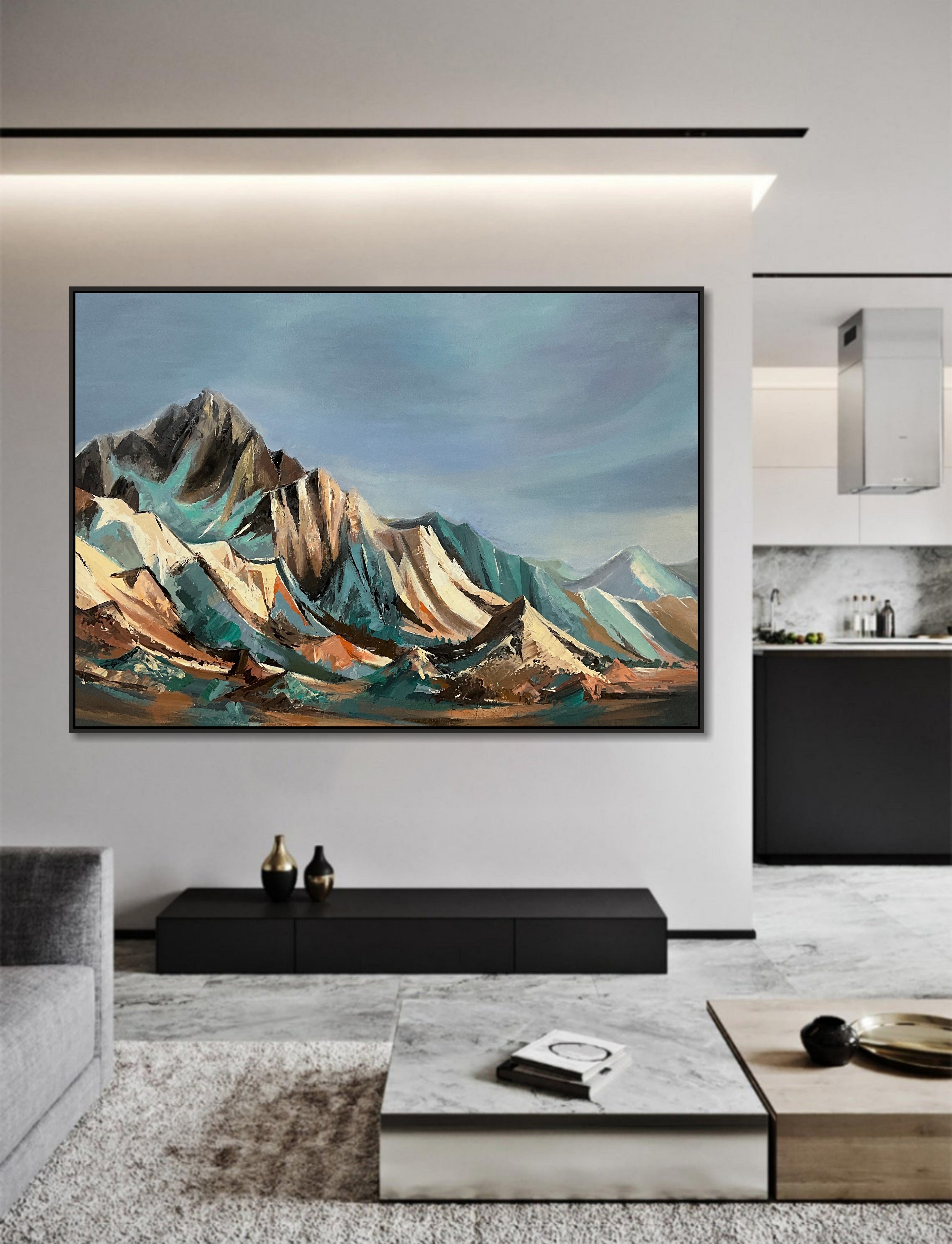 „MOUNTAINS PEAK“ ist eine faszinierende große abstrakte Landschaft, die majestätische Berge in lebendigen Farbtönen darstellt. Mit Öl auf Leinwand gefertigt, verkörpert es modernen Realismus mit einer einzigartigen Note. Das Zusammenspiel von Farben und Texturen schafft eine faszinierende Aussicht und lädt den Betrachter ein, in die Schönheit der Natur einzutauchen. Dieses originelle handgefertigte Kunstwerk ist eine auffällige Ergänzung für jedes Zuhause und ruft ein Gefühl von Ehrfurcht und Ruhe hervor.