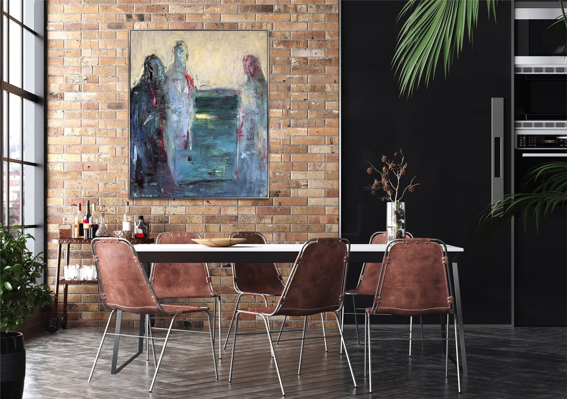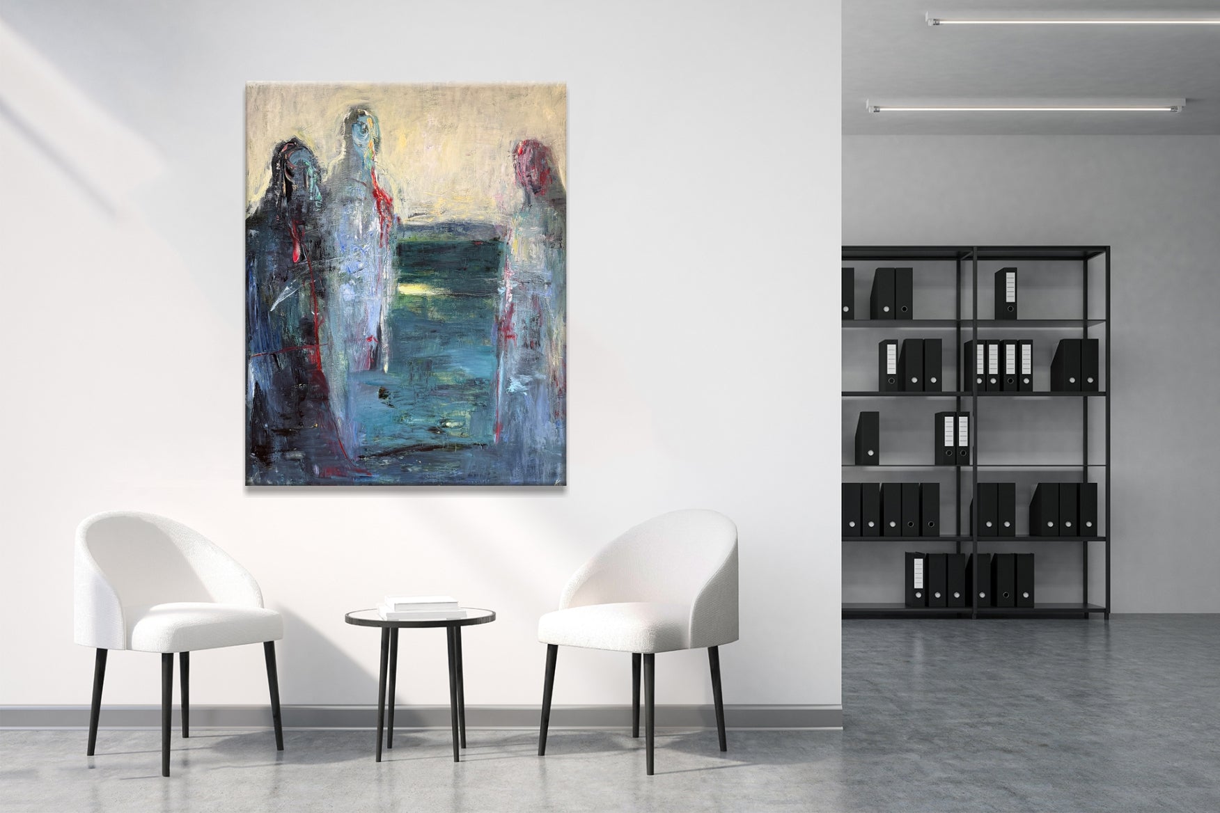 Dieses fesselnde abstrakte expressionistische Gemälde, "Ethereal Reflections", zeigt menschenähnliche Figuren in einer rätselhaften, stimmungsvollen Landschaft. Die Verwendung von dunklen Tönen wie Blau, Schwarz und Rot in Kombination mit strukturierten Mischtechniken schafft ein Gefühl von Tiefe und Emotion. Dieses moderne Gemälde, das sich mit menschlichen Emotionen und mystischer Präsenz auseinandersetzt, eignet sich perfekt, um jeder Galeriewand einen Hauch von zeitgenössischer Raffinesse zu verleihen. Ideal für Kunstliebhaber, die einzigartige, zum Nachdenken anregende Werke suchen.
