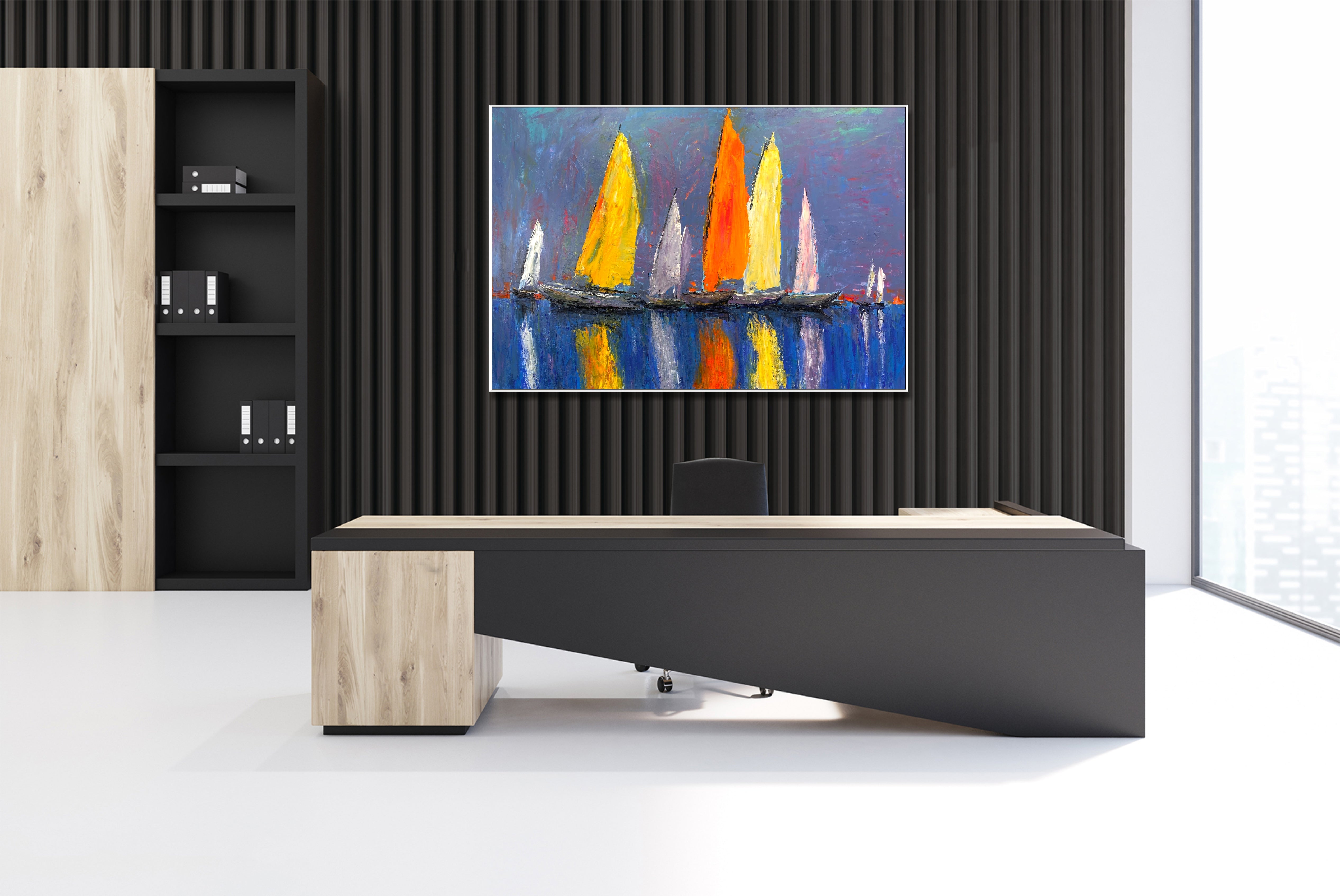 Dieses lebendige, abstrakte Segelboot-Gemälde fängt die Energie des Ozeans mit kräftigen Pinselstrichen und auffälligen Farben ein. Mit leuchtenden Farbtönen von Blau, Orange, Gelb und Weiß schaffen die Segelboote und ihre Reflexionen eine fesselnde Meereslandschaft, perfekt für moderne oder küsteninspirierte Innenräume. Ideal für Wohnzimmer, Büros oder jeden Raum, der einen Farbtupfer und nautischen Charme benötigt, bringt diese große Leinwand die Essenz des Meeres in Ihr Zuhause und setzt ein mutiges, zeitgemäßes Statement.