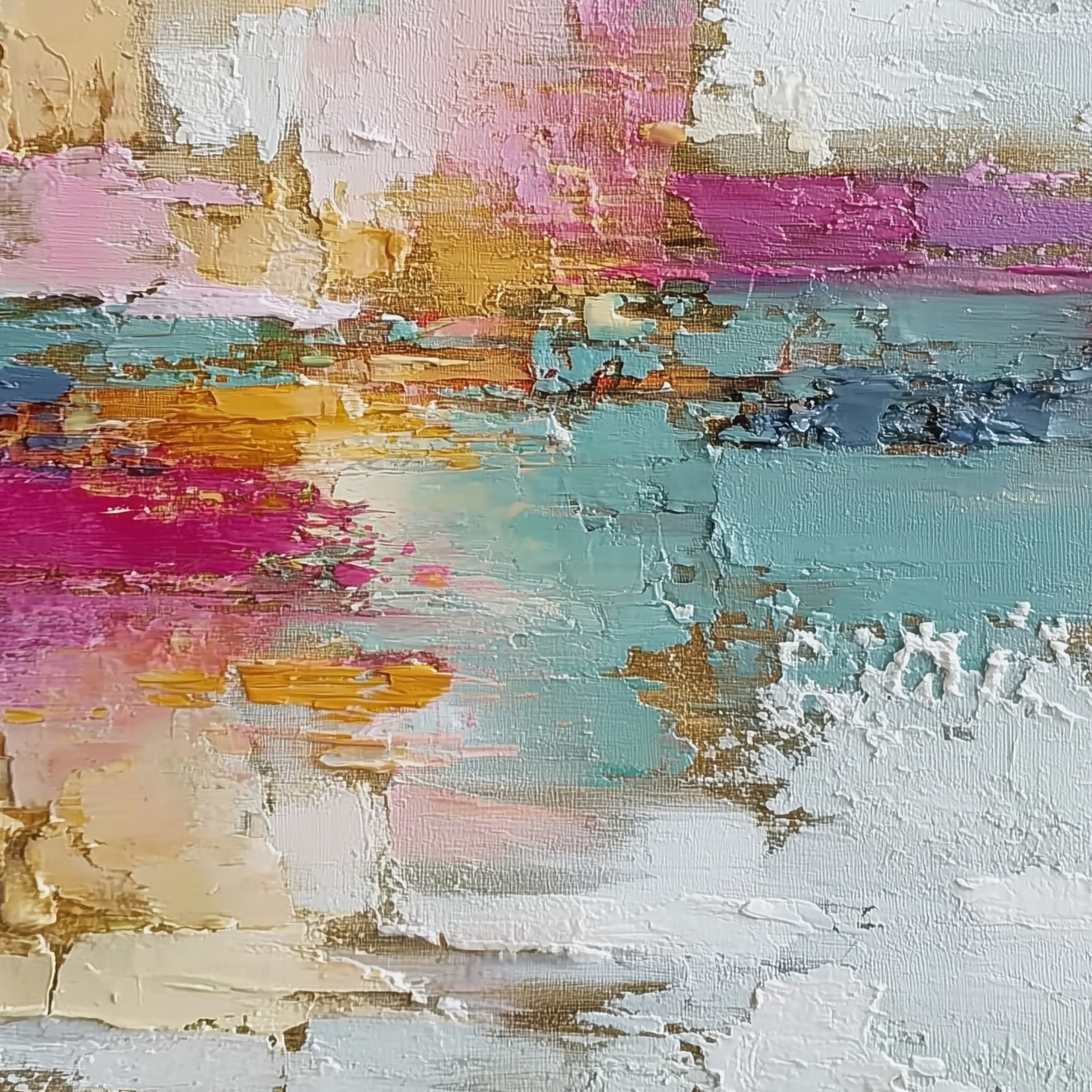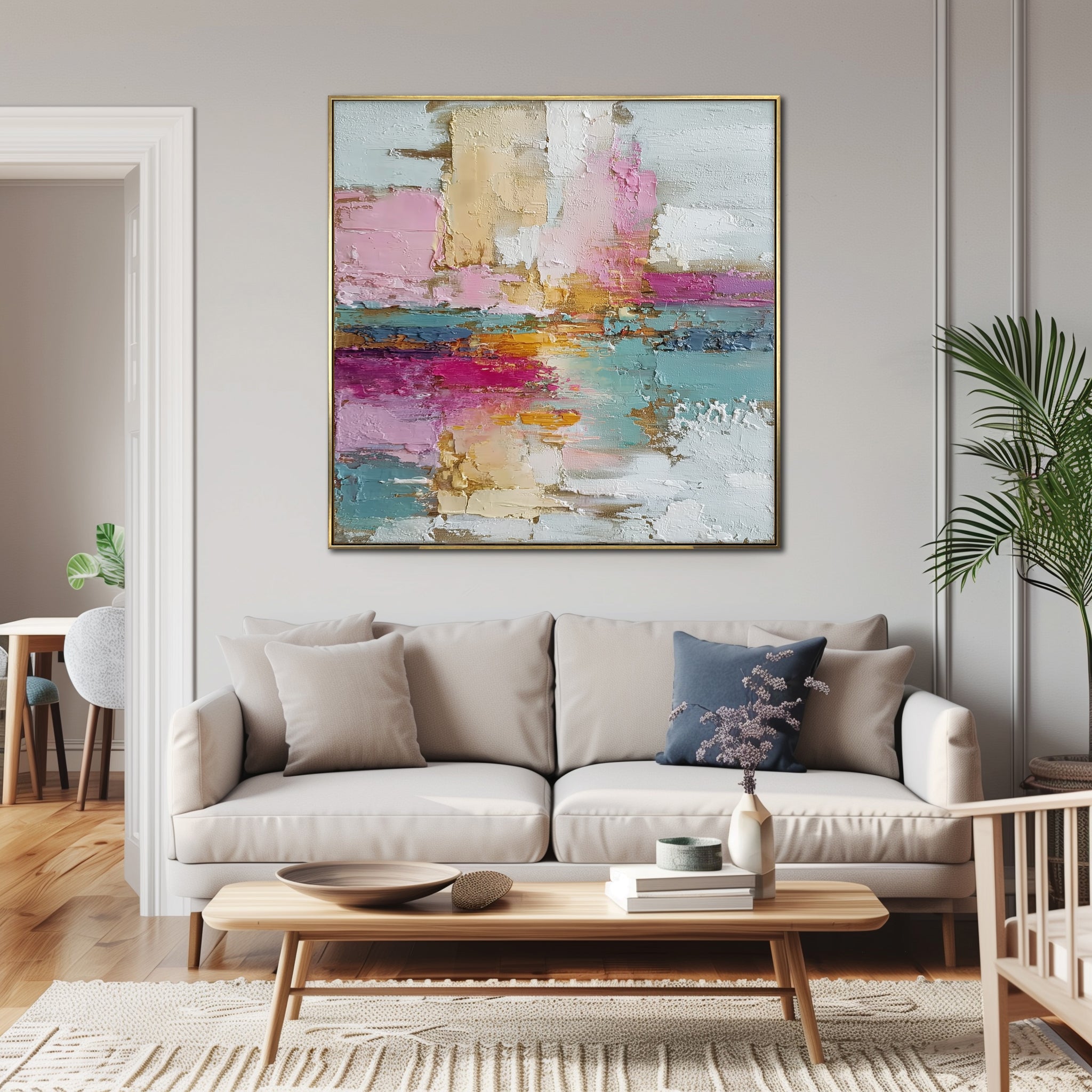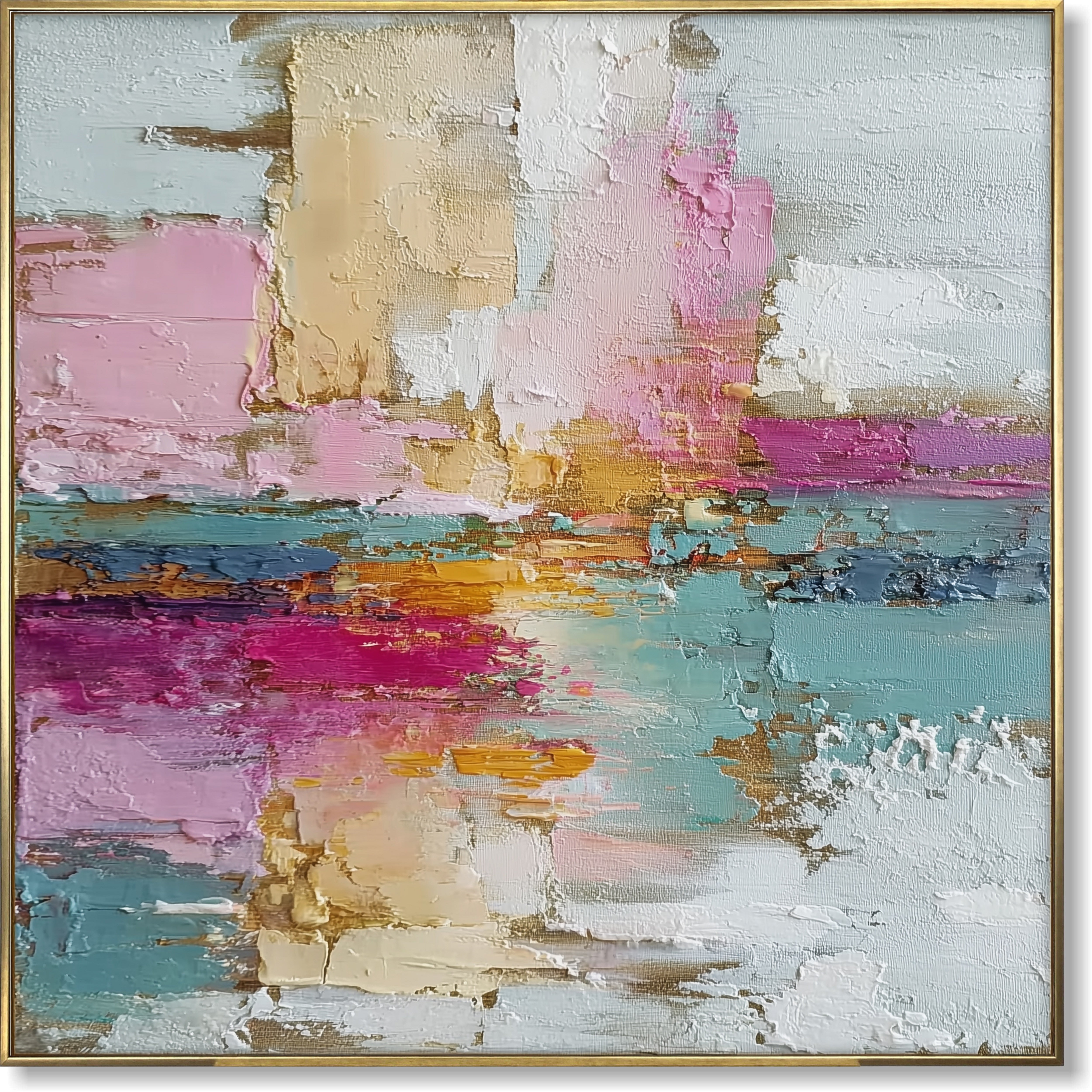 Verleihen Sie Ihrem Raum einen Hauch von Eleganz und moderner Kunstfertigkeit mit Eternal Sunrise, einem atemberaubenden abstrakten, strukturierten Leinwandgemälde. Mit einer harmonischen Mischung aus zartem Rosa, Rouge, Goldbeige, Türkisblau und leuchtendem Magenta fängt dieses Kunstwerk die Essenz verträumter Reflexionen und emotionaler Tiefe ein. Handgemalt mit reicher Textur und Spachtelstrichen erzeugt es ein Gefühl von Bewegung und Licht und ist damit ein perfektes Herzstück für moderne Wohnzimmer, Schlafzimmer oder Büros. Dieses moderne abstrakte Gemälde ist ideal für Kunstliebhaber, die eine einzigartige Wanddekoration suchen. Es verleiht jedem Raum Wärme, Eleganz und zeitlosen Charme.