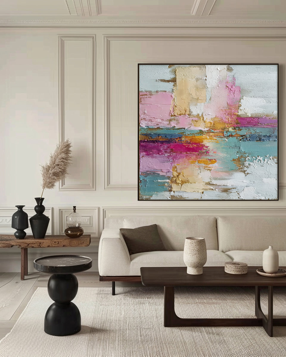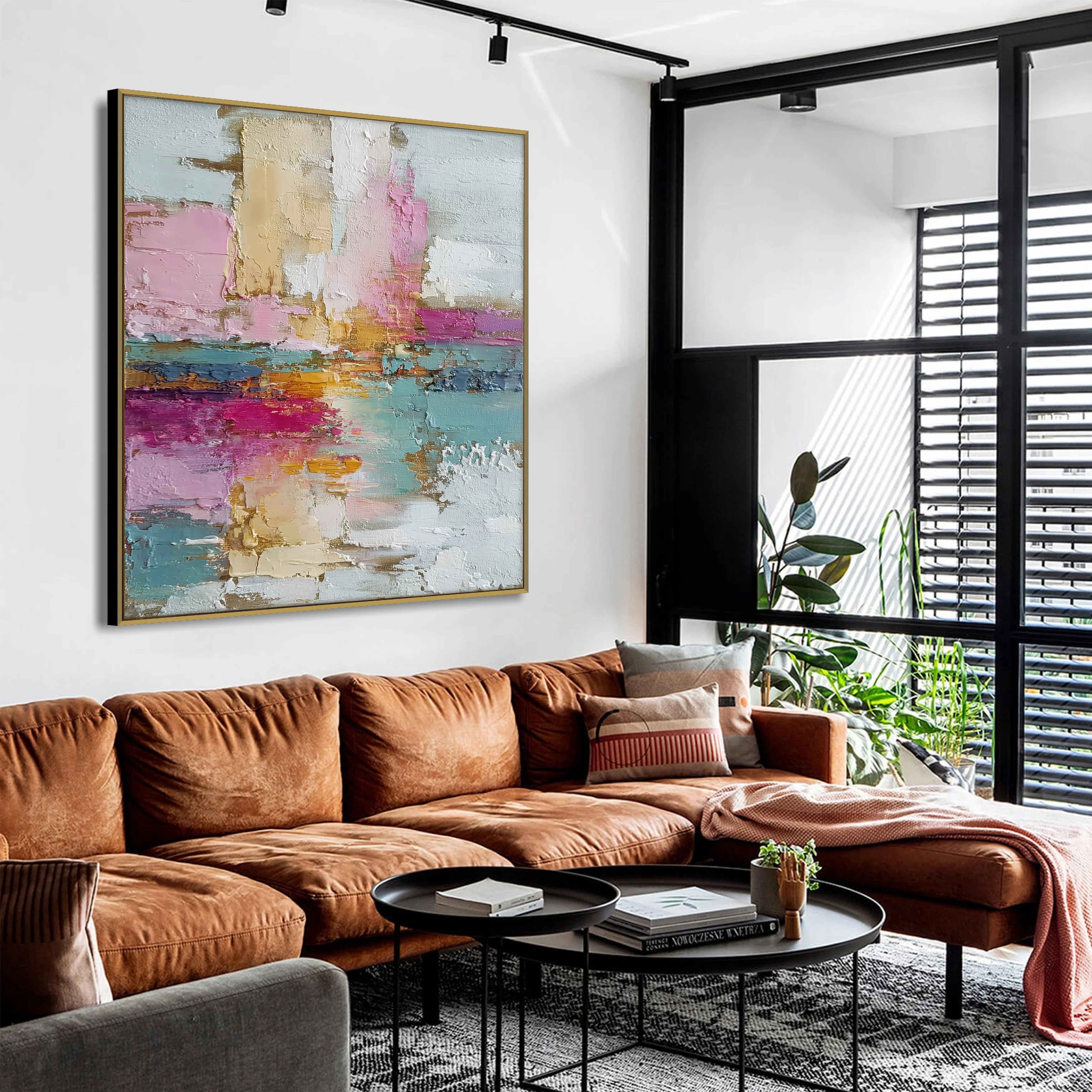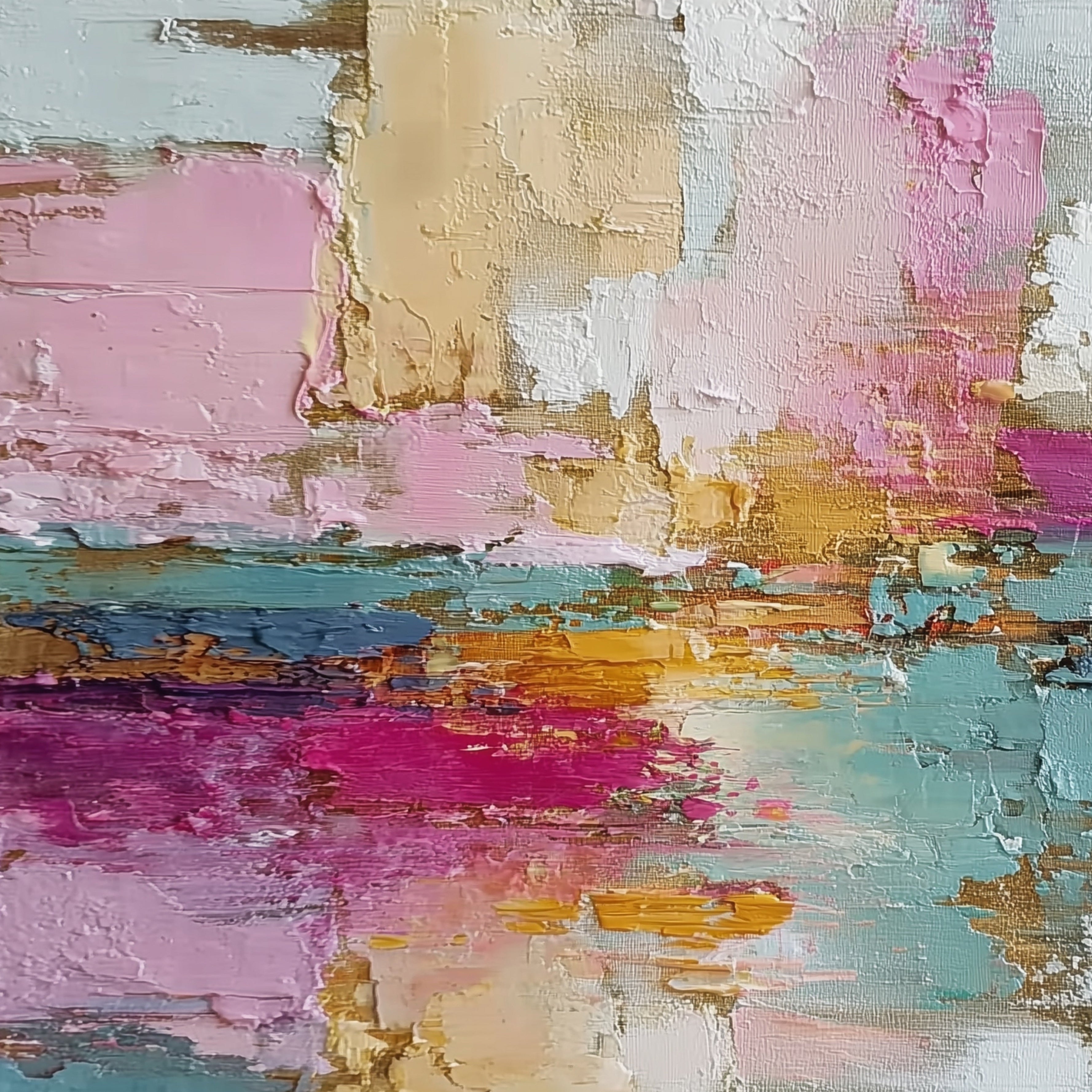 Verleihen Sie Ihrem Raum einen Hauch von Eleganz und moderner Kunstfertigkeit mit Eternal Sunrise, einem atemberaubenden abstrakten, strukturierten Leinwandgemälde. Mit einer harmonischen Mischung aus zartem Rosa, Rouge, Goldbeige, Türkisblau und leuchtendem Magenta fängt dieses Kunstwerk die Essenz verträumter Reflexionen und emotionaler Tiefe ein. Handgemalt mit reicher Textur und Spachtelstrichen erzeugt es ein Gefühl von Bewegung und Licht und ist damit ein perfektes Herzstück für moderne Wohnzimmer, Schlafzimmer oder Büros. Dieses moderne abstrakte Gemälde ist ideal für Kunstliebhaber, die eine einzigartige Wanddekoration suchen. Es verleiht jedem Raum Wärme, Eleganz und zeitlosen Charme.