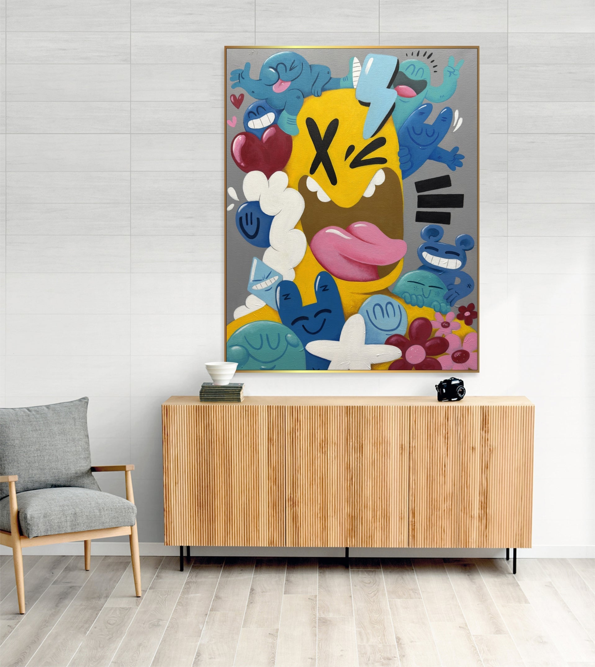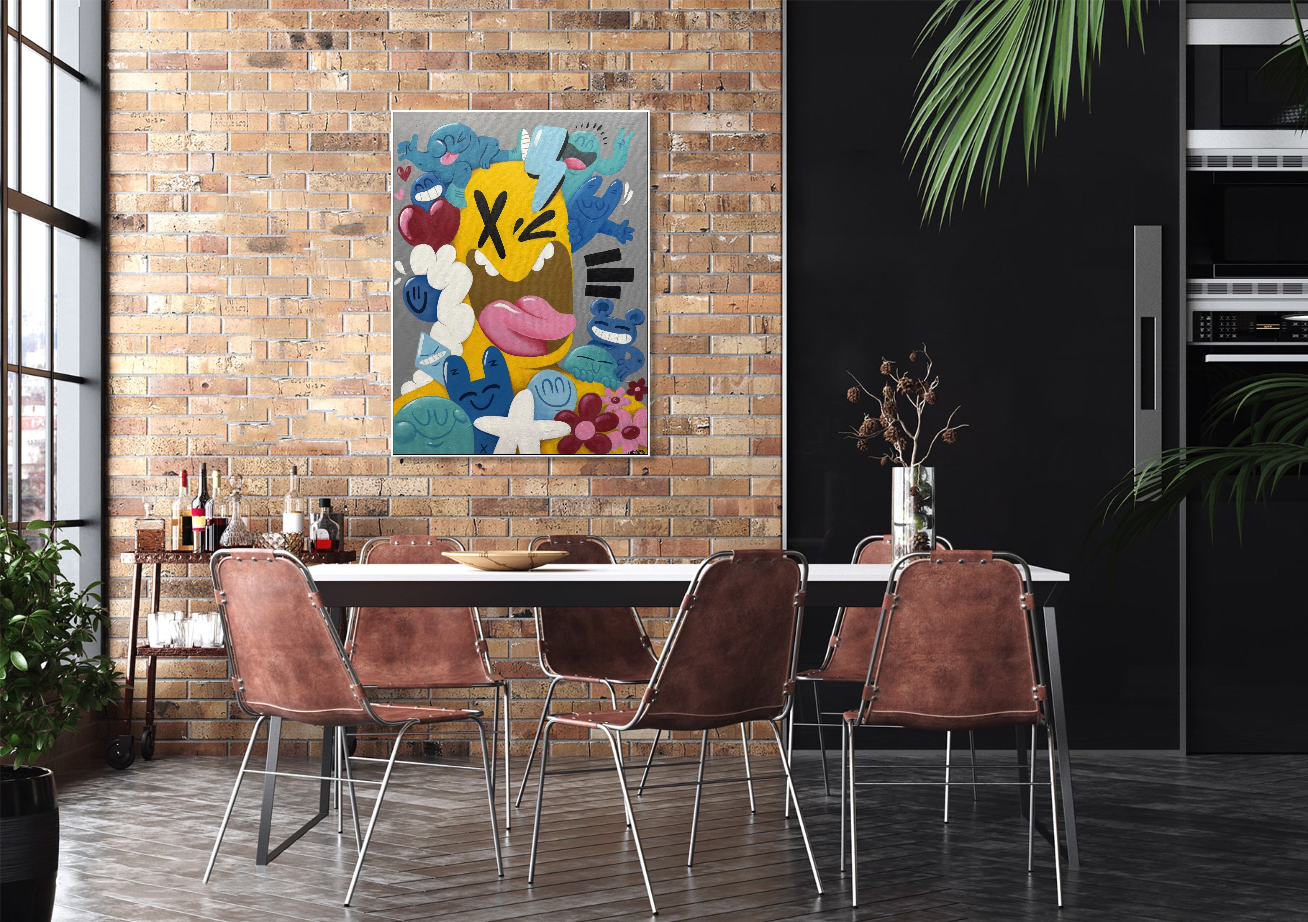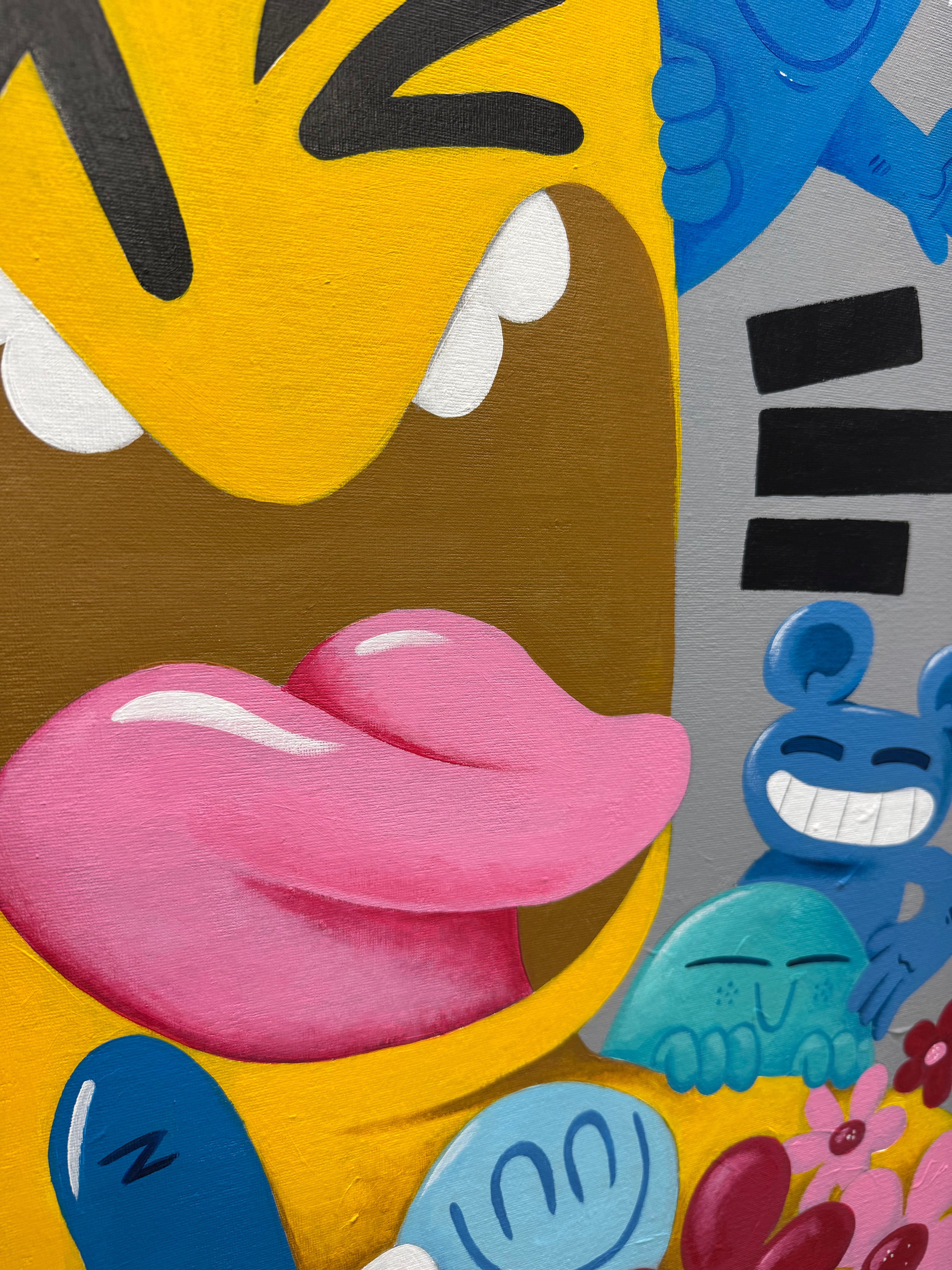Bringen Sie lebendige, urbane Energie in Ihre Räume mit diesem farbenfrohen Pop-Art-Leinwandbild. Inspiriert von Street Art und Graffiti-Kultur verbindet es markante Cartoon-Figuren mit verspielten abstrakten Elementen. Perfekt für moderne Wohnungen, Ateliers und Kreativräume: Dieses handgefertigte Werk verleiht jeder Wand eine flippige, moderne Note. Ideal für Kunstliebhaber, die ein einzigartiges Statement suchen: Die Mischung aus Farbe, Chaos und Charakter verleiht Innenräumen eine starke Persönlichkeit.