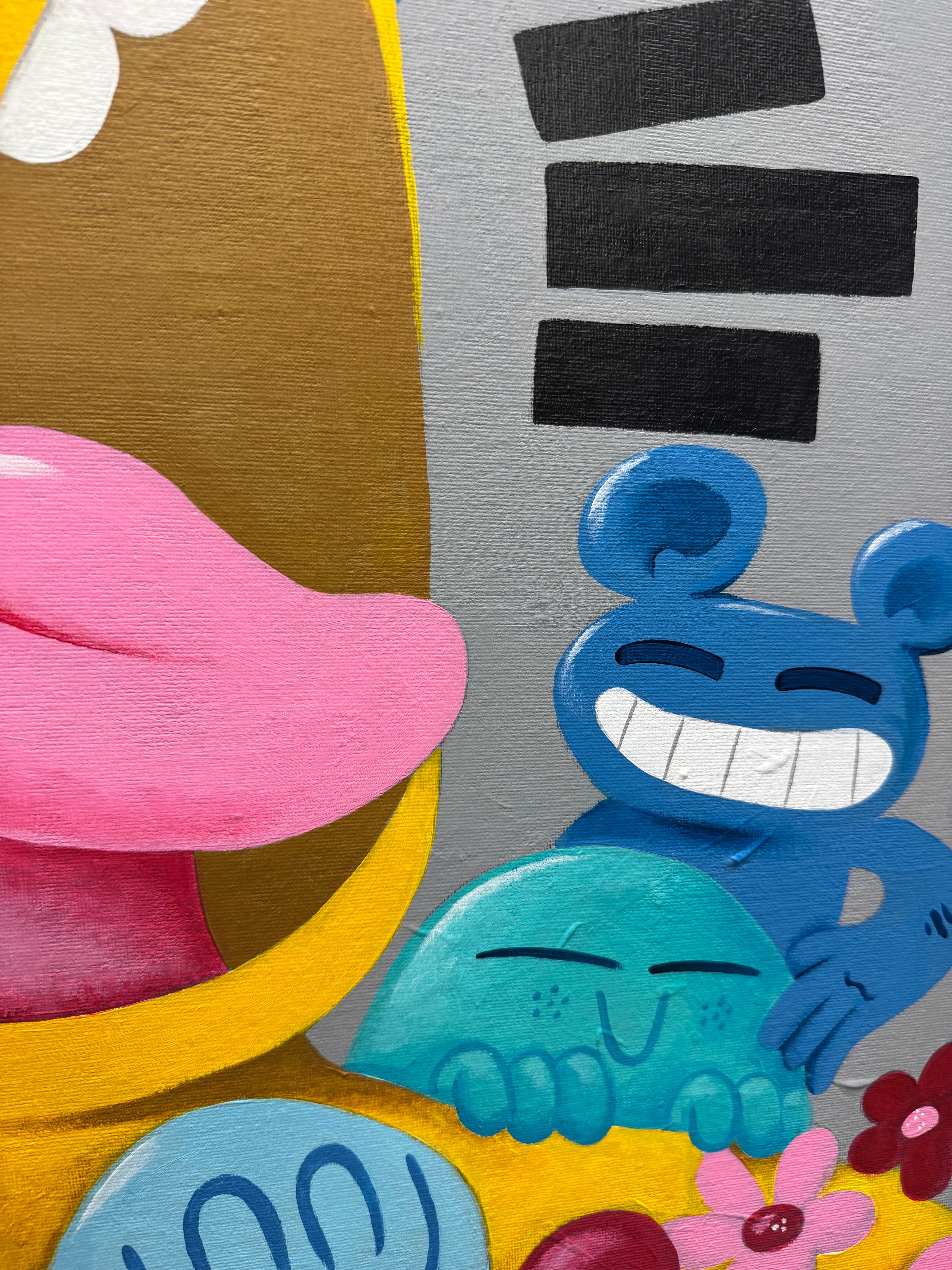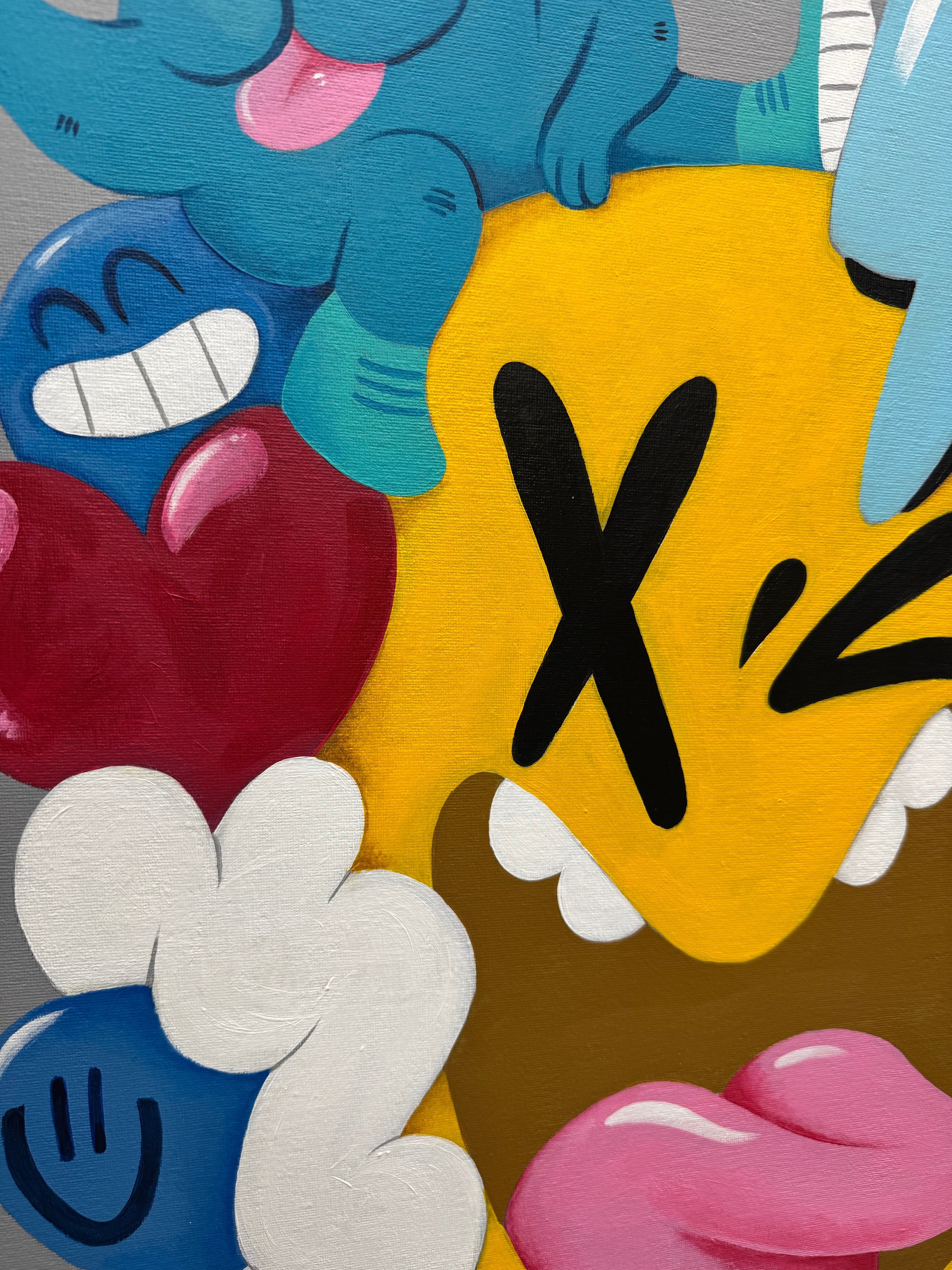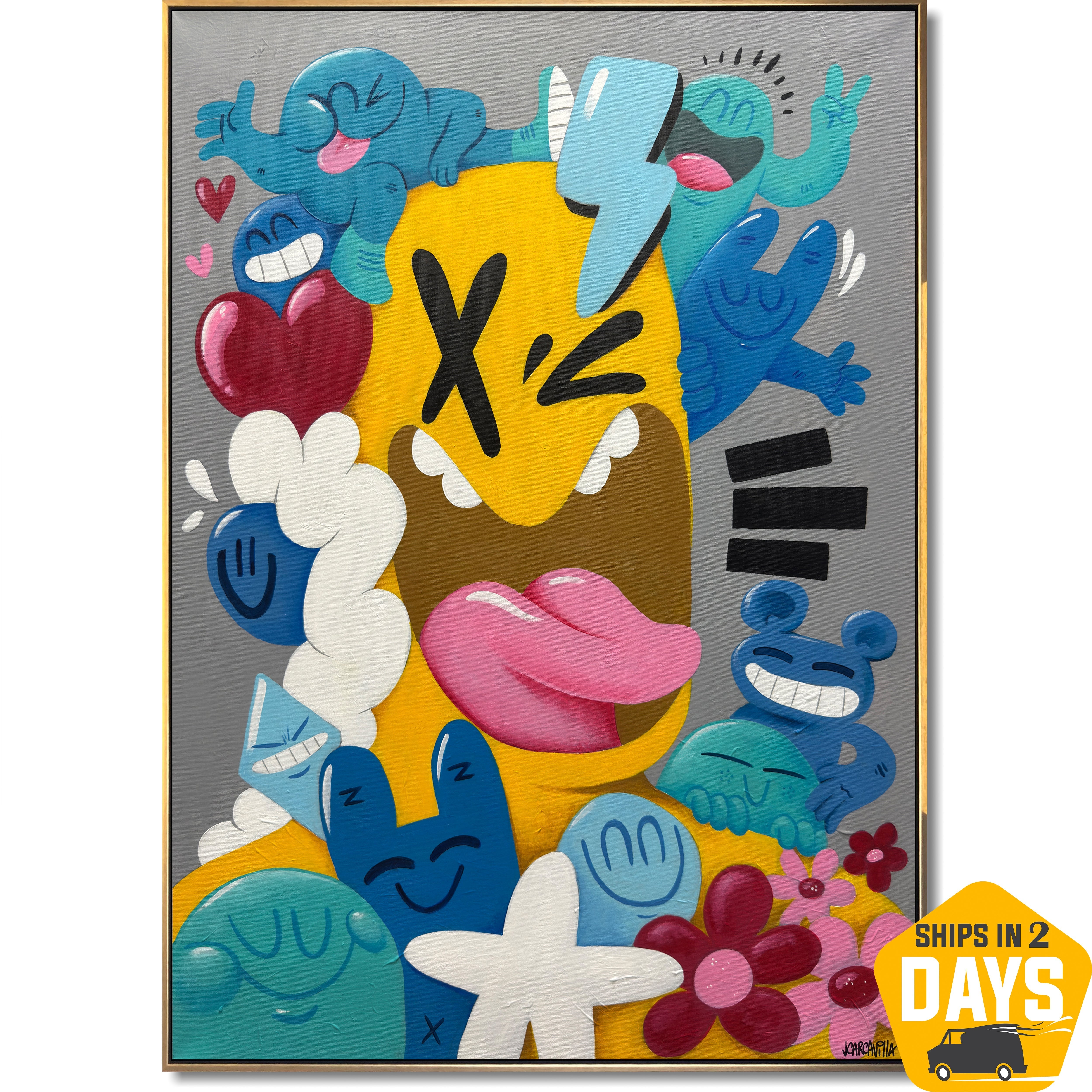 Bringen Sie lebendige, urbane Energie in Ihre Räume mit diesem farbenfrohen Pop-Art-Leinwandbild. Inspiriert von Street Art und Graffiti-Kultur verbindet es markante Cartoon-Figuren mit verspielten abstrakten Elementen. Perfekt für moderne Wohnungen, Ateliers und Kreativräume: Dieses handgefertigte Werk verleiht jeder Wand eine flippige, moderne Note. Ideal für Kunstliebhaber, die ein einzigartiges Statement suchen: Die Mischung aus Farbe, Chaos und Charakter verleiht Innenräumen eine starke Persönlichkeit.