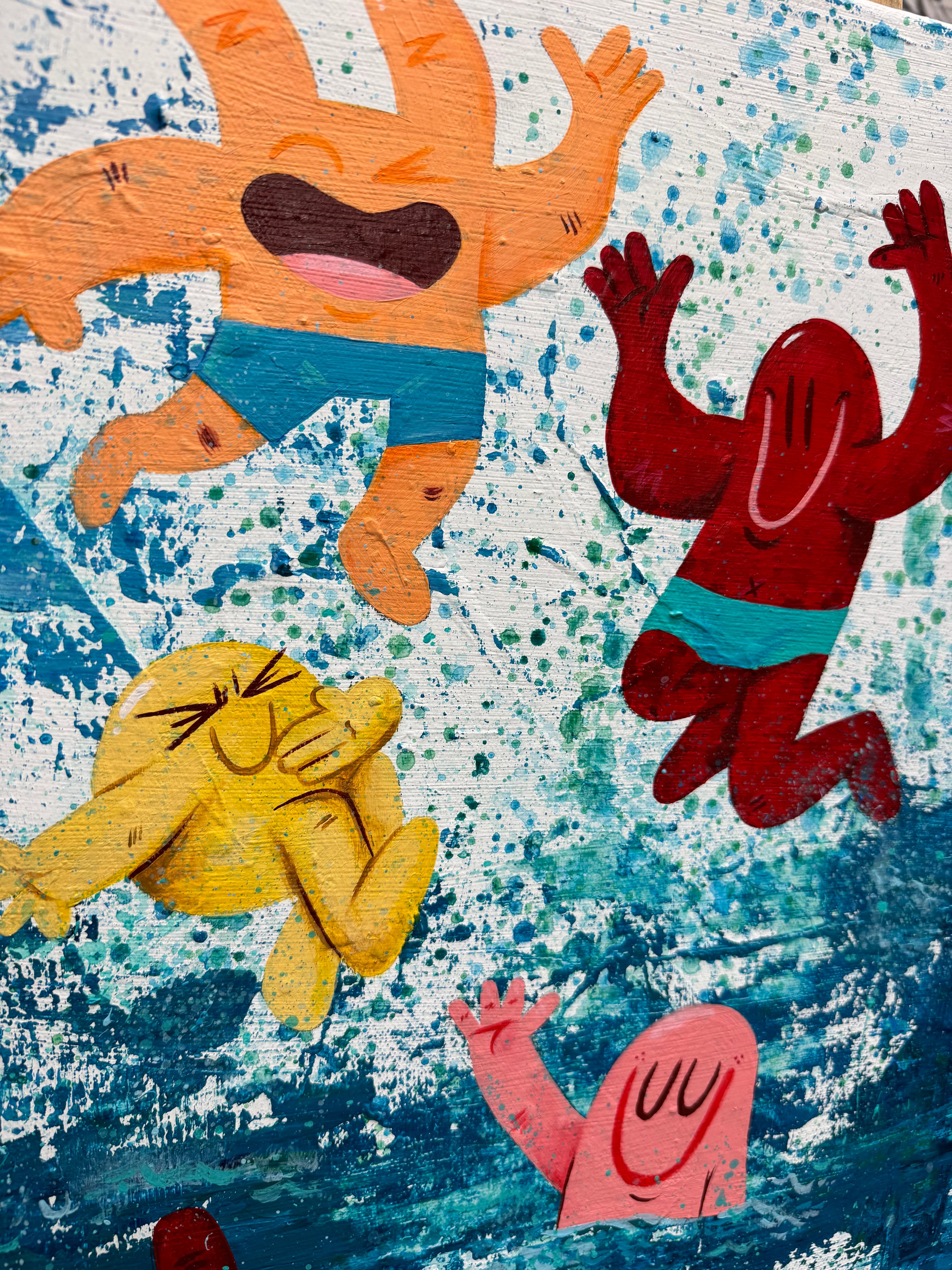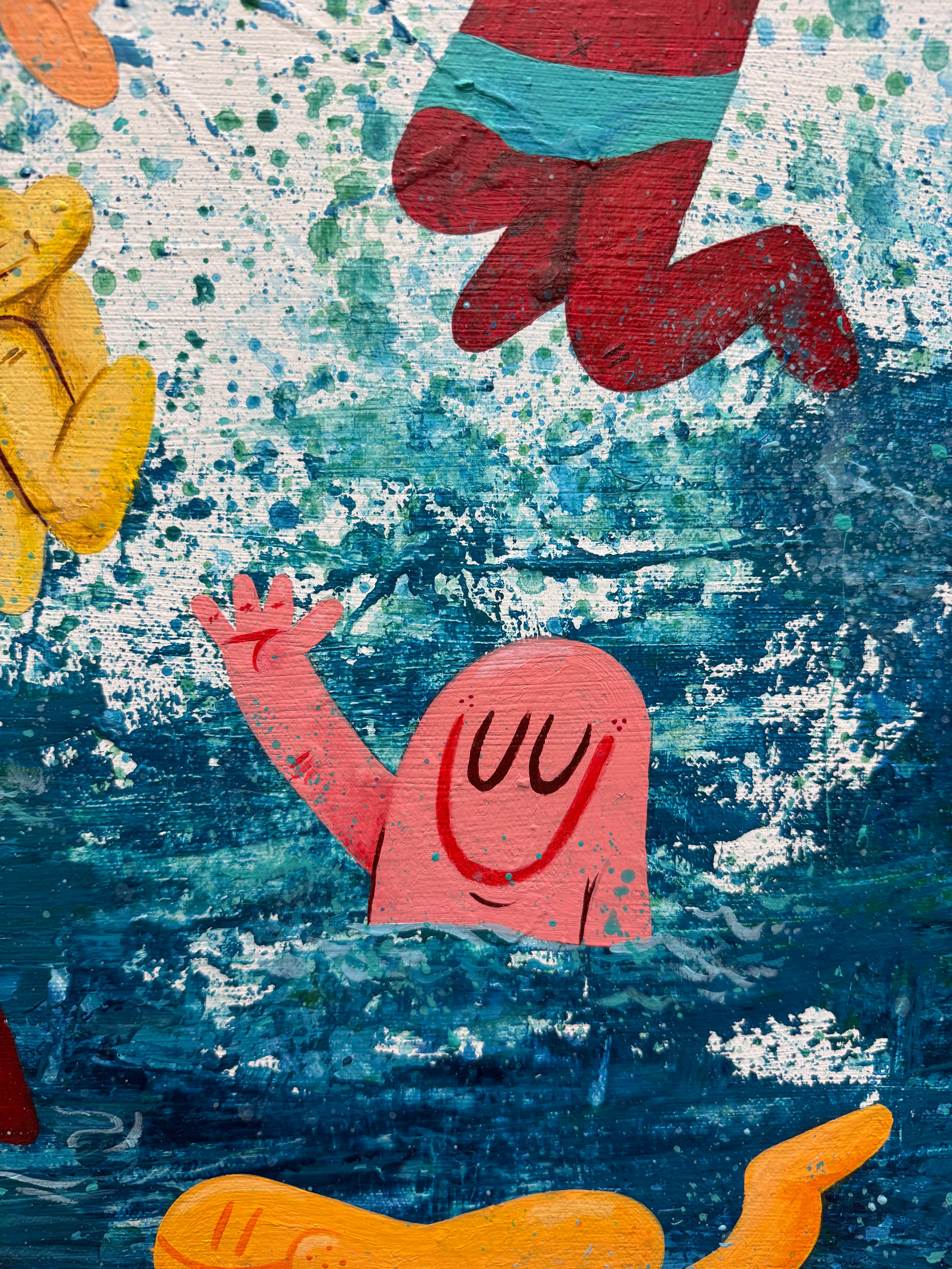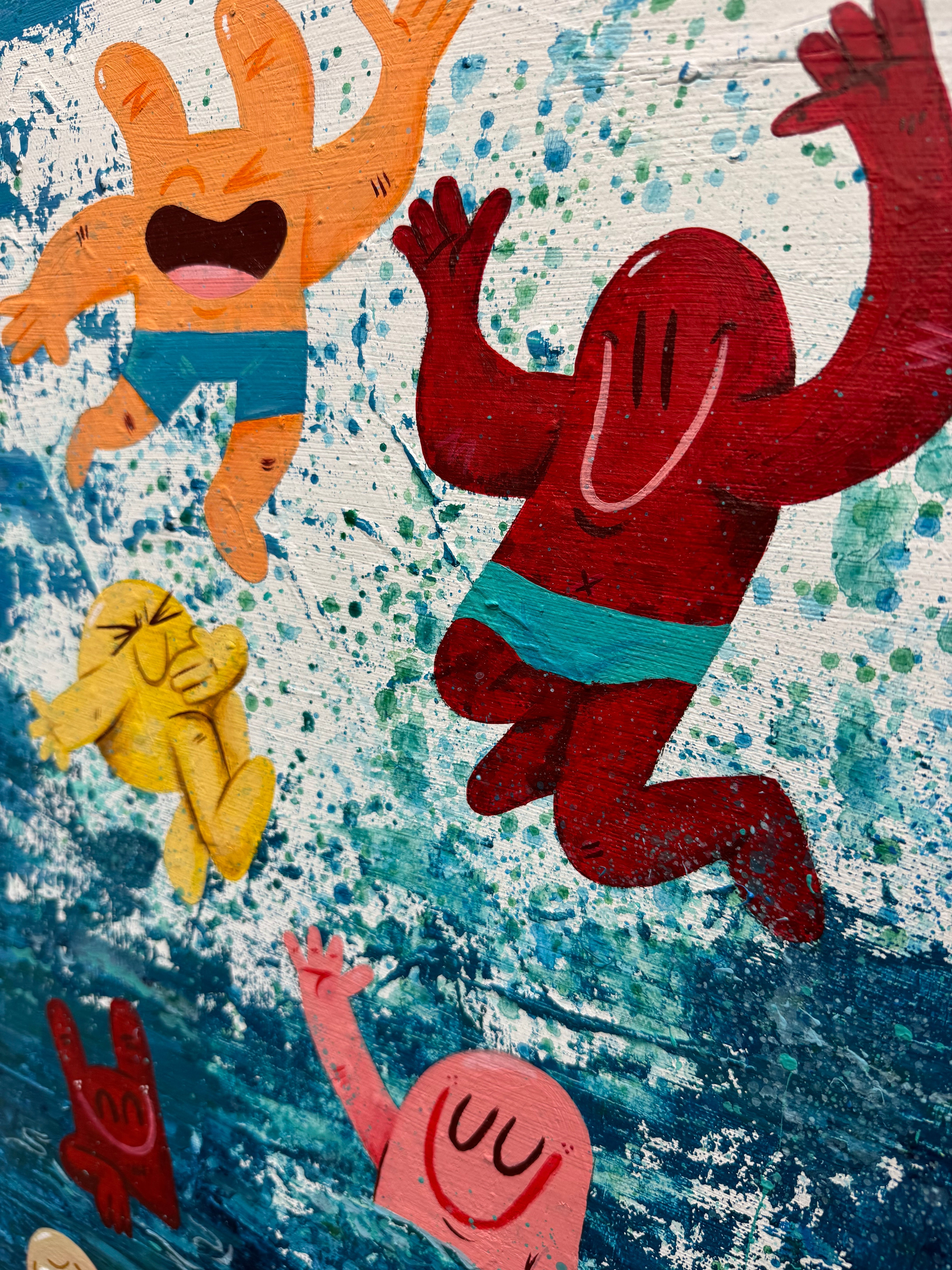 Bringen Sie Freude und Energie in Ihre Räume mit diesem lebendigen Pop-Art-Gemälde, das verspielte Cartoonfiguren zeigt, die in ein tiefblaues Meer eintauchen. Mit kräftigen Farben, dynamischen Texturen und einem lebendigen Bewegungsgefühl eignet es sich perfekt für moderne Interieurs, Kinderzimmer oder Sammler, die skurrile zeitgenössische Kunst lieben. Handgemalt mit professionellen Materialien verleiht dieses einzigartige Kunstwerk jeder Wand Spaß, Freude und Persönlichkeit.