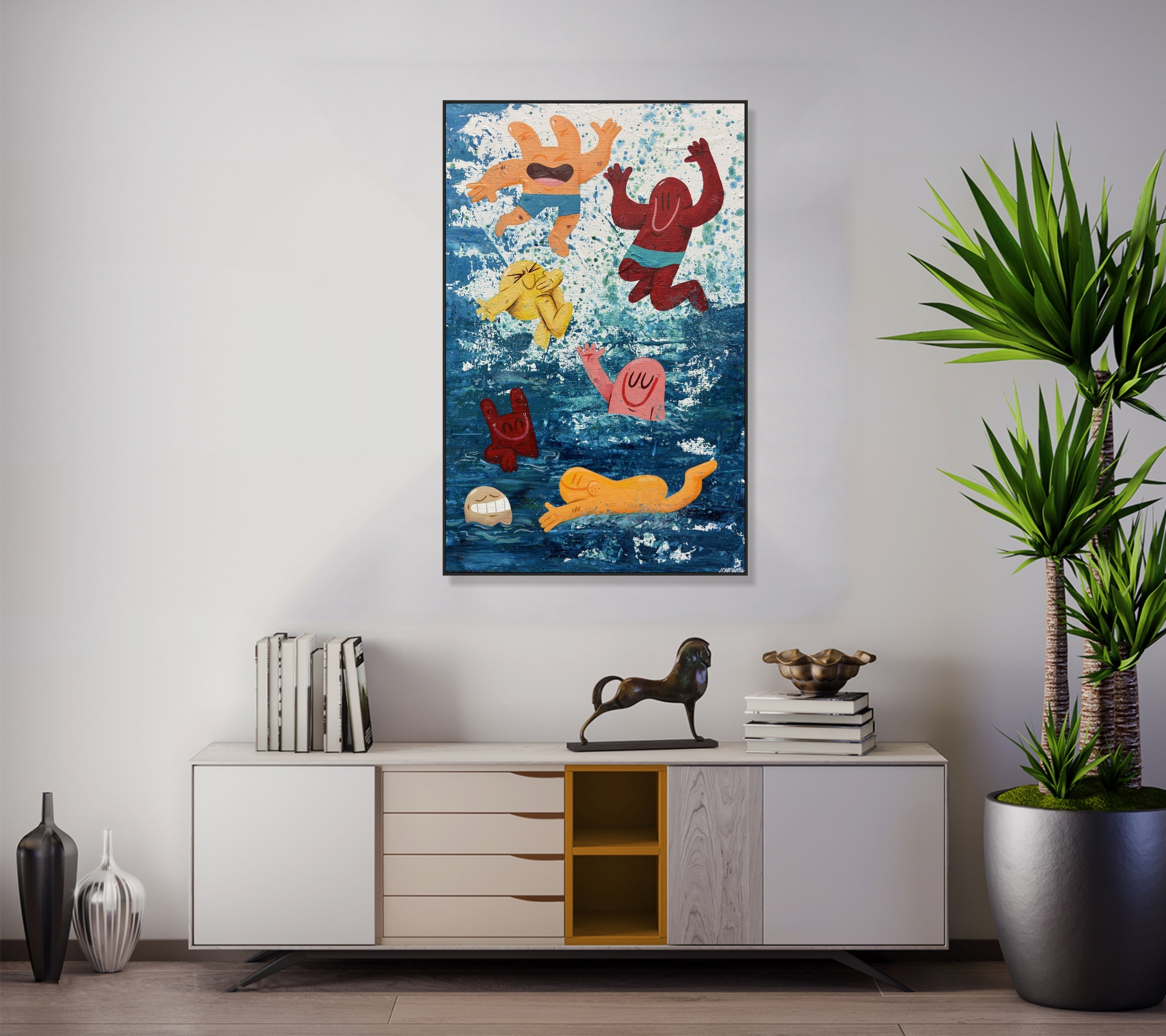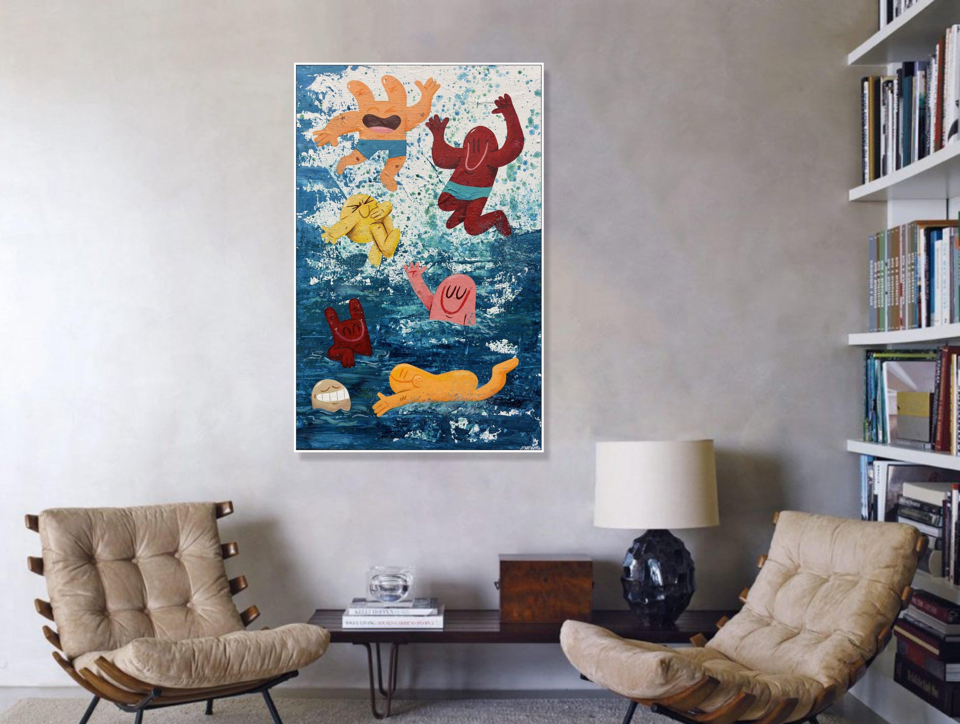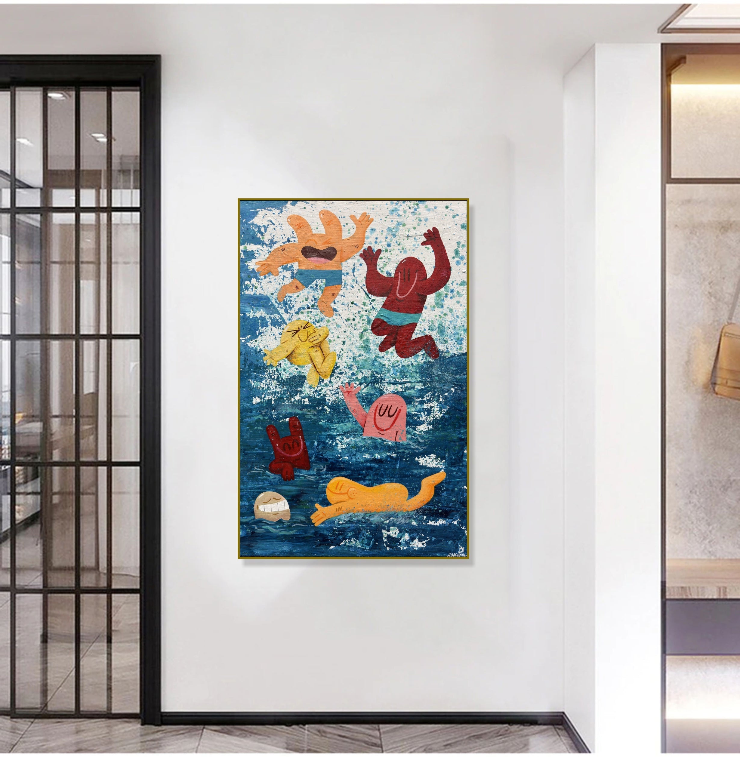 Bringen Sie Freude und Energie in Ihre Räume mit diesem lebendigen Pop-Art-Gemälde, das verspielte Cartoonfiguren zeigt, die in ein tiefblaues Meer eintauchen. Mit kräftigen Farben, dynamischen Texturen und einem lebendigen Bewegungsgefühl eignet es sich perfekt für moderne Interieurs, Kinderzimmer oder Sammler, die skurrile zeitgenössische Kunst lieben. Handgemalt mit professionellen Materialien verleiht dieses einzigartige Kunstwerk jeder Wand Spaß, Freude und Persönlichkeit.