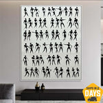 In diesem fesselnden Gemälde bevölkert eine Vielzahl kleiner, abstrakter schwarzer menschlicher Figuren eine makellose weiße Leinwand. Vor dem reinen Hintergrund heben sich die Figuren kühn ab und bilden eine visuell beeindruckende und dynamische Komposition. Durch die sorgfältige Anordnung dieser winzigen Formen erweckt der Künstler den Eindruck einer lebendigen Gemeinde, die einen eleganten Tanz vollführt.