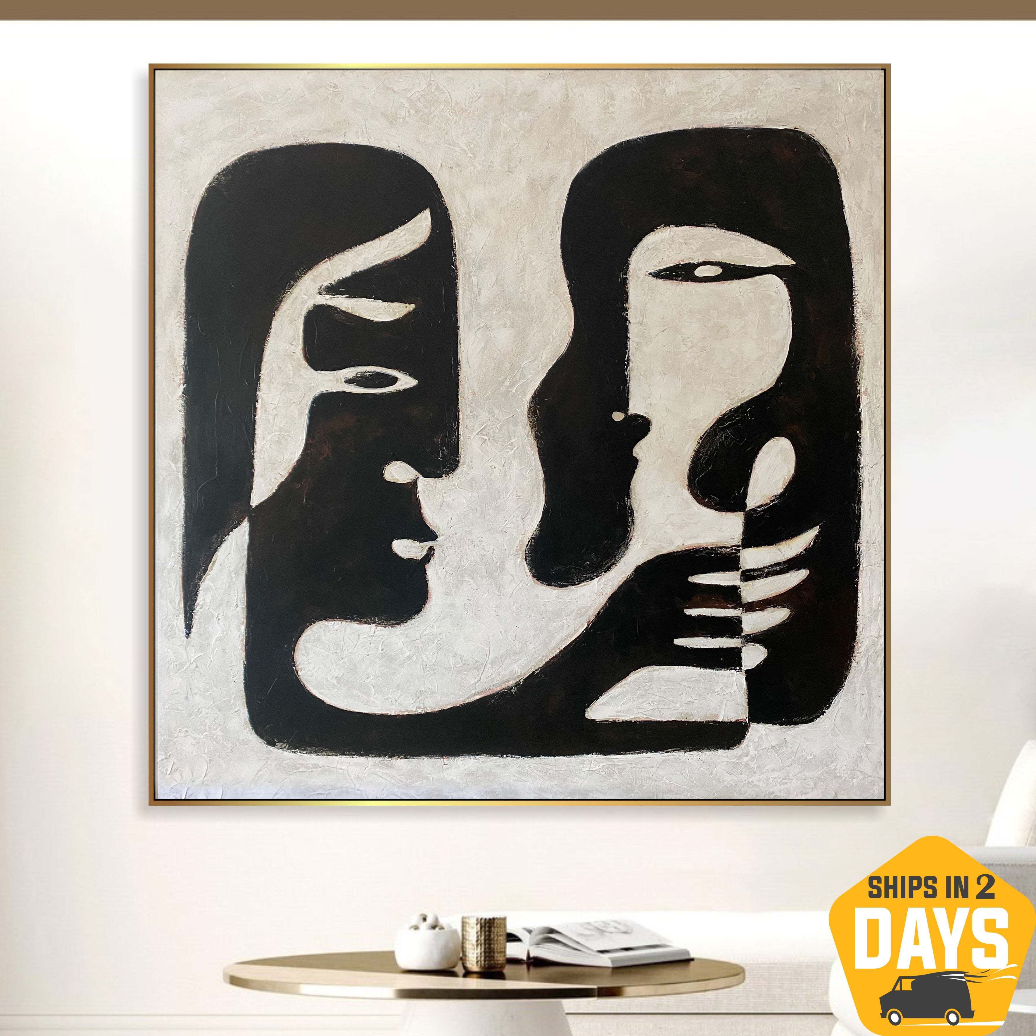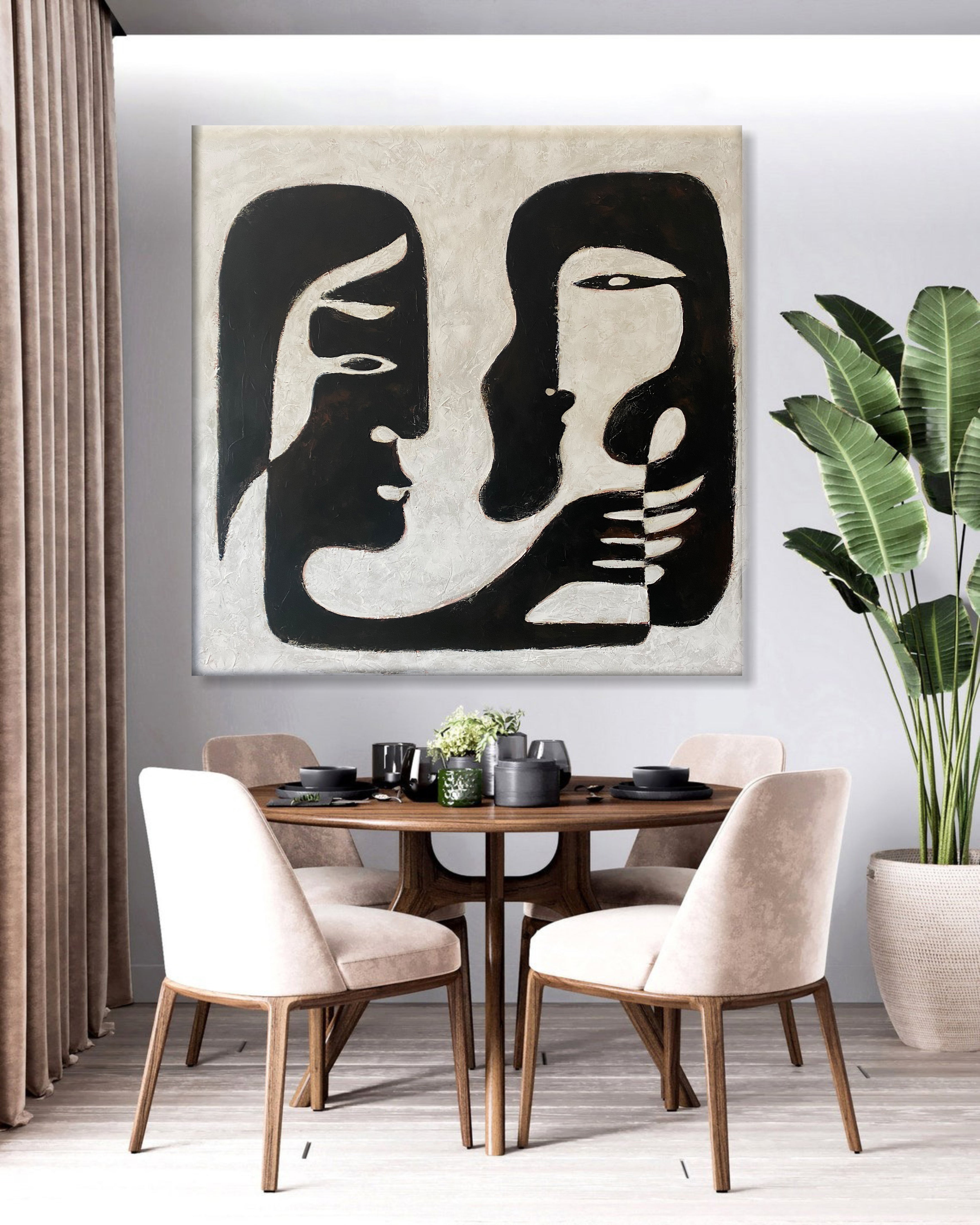 "Whispered Silhouettes" stands out with its striking abstract design, featuring face profiles in a stark black and white palette. Embracing minimalism, this modern art piece captures the essence of simplicity and human connection. Ideal for the contemporary home, it invites contemplation and adds a touch of sophistication to any living space. Its monochromatic theme offers versatile decor options, perfect for the discerning art collector.
