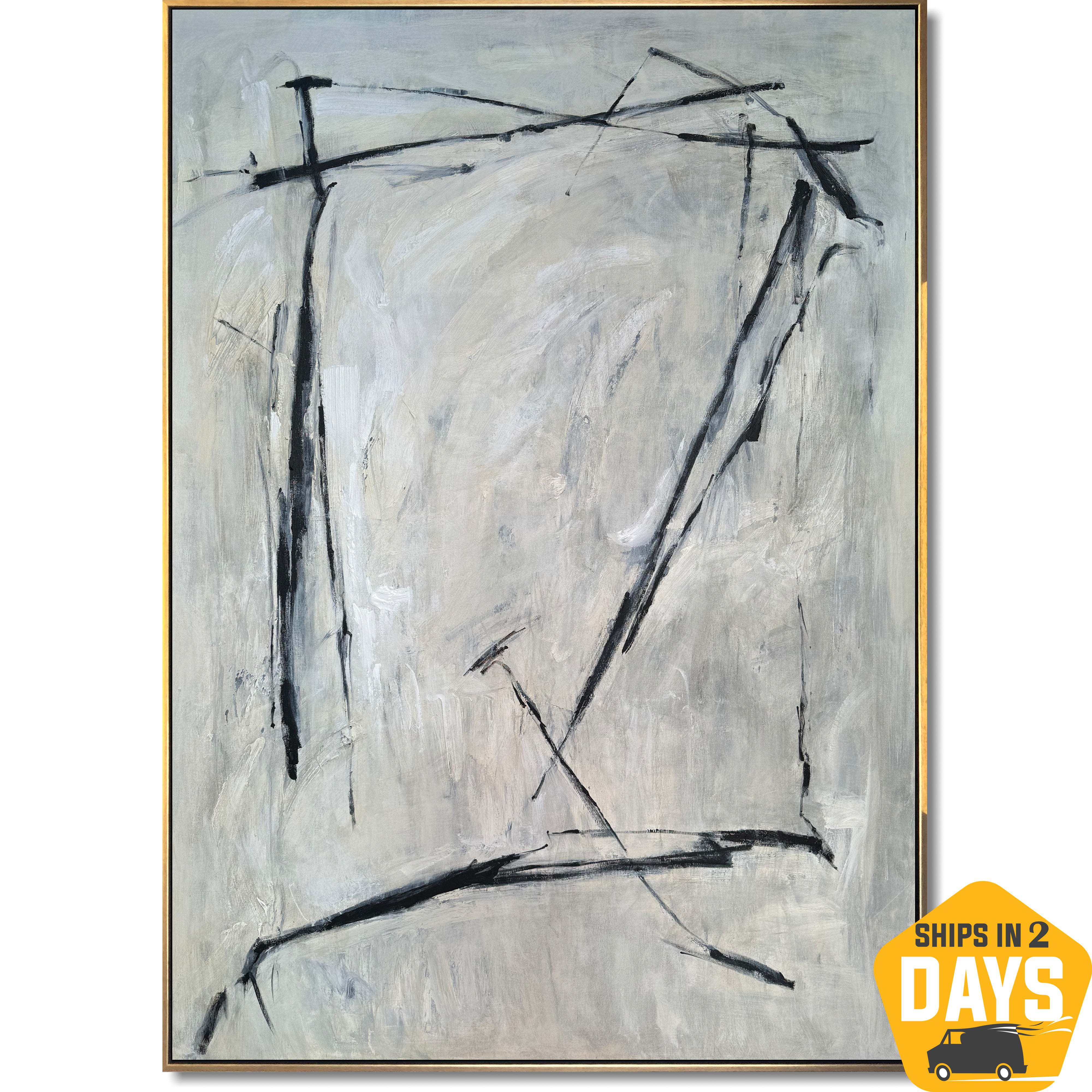 Bringen Sie mit diesem großen abstrakten Gemälde einen Hauch von moderner Eleganz in Ihren Raum. Mit seinen minimalistischen geometrischen Linien und der raffinierten monochromen Farbpalette aus Schwarz, Weiß und Grau eignet sich dieses Werk perfekt für zeitgenössische Innenräume. Seine industrielle Ästhetik und subtile Eleganz machen es zu einer vielseitigen Ergänzung für jeden Raum, die sich nahtlos in die moderne Einrichtung einfügt. Ideal für alle, die ihr Zuhause oder Büro mit einem einzigartigen Kunstwerk aufwerten wollen, das Stil und Raffinesse ausstrahlt.