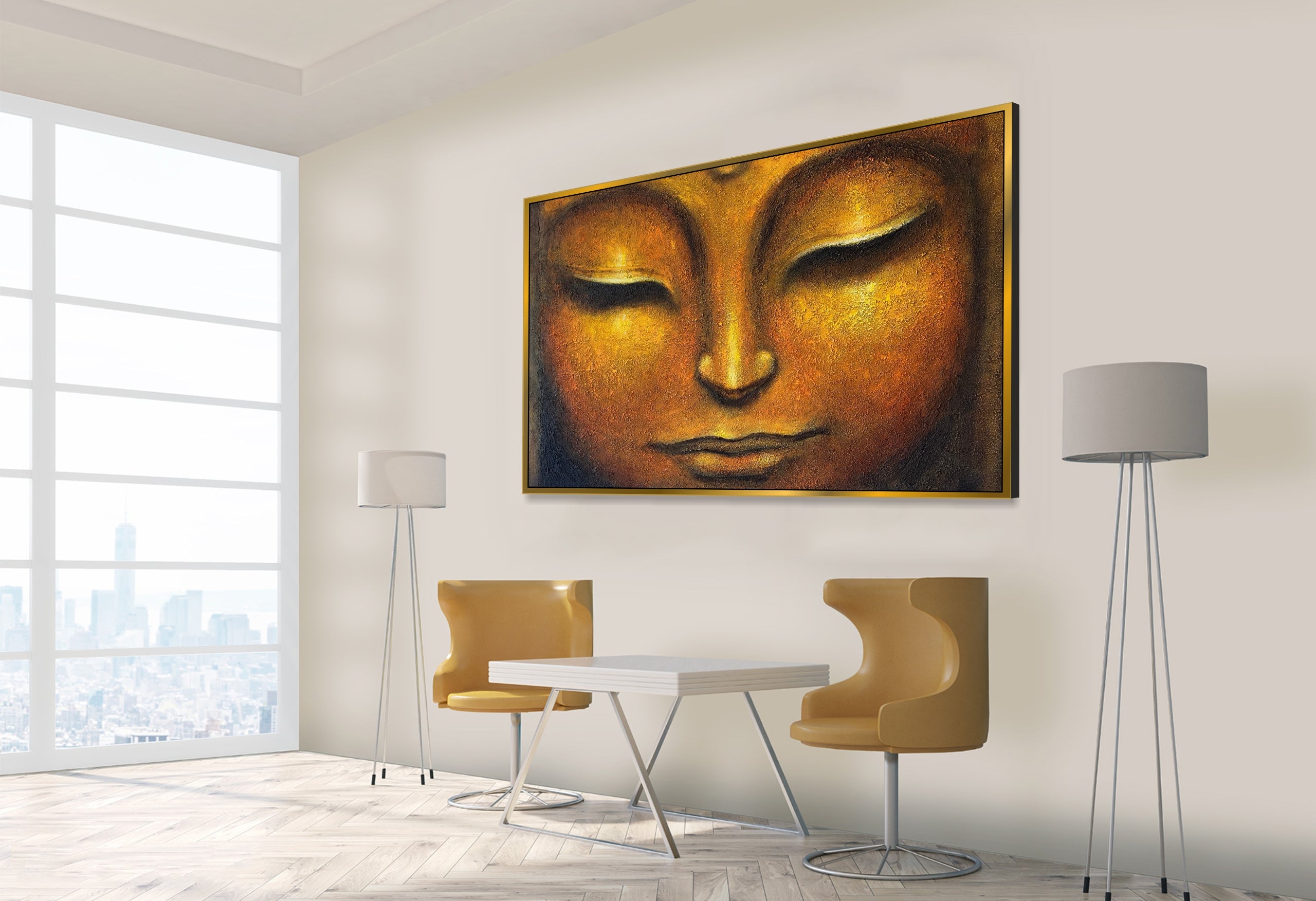 Dieses atemberaubende goldene Buddha-Gemälde fängt die Essenz des inneren Friedens und der Ruhe ein. Mit seinem heiteren Ausdruck und den warmen Bernsteintönen ist dieses strukturierte Kunstwerk perfekt, um eine beruhigende Atmosphäre in Ihrem Zuhause oder Büro zu schaffen. Die satten Goldtöne und die filigranen Details vermitteln ein Gefühl von Heiligkeit und Achtsamkeit und machen es zu einem idealen Mittelpunkt für jeden Raum, der der Meditation, der Spiritualität oder einfach der Entspannung gewidmet ist. Erhöhen Sie Ihre Einrichtung mit diesem schönen Stück Zen-inspirierter Kunst.