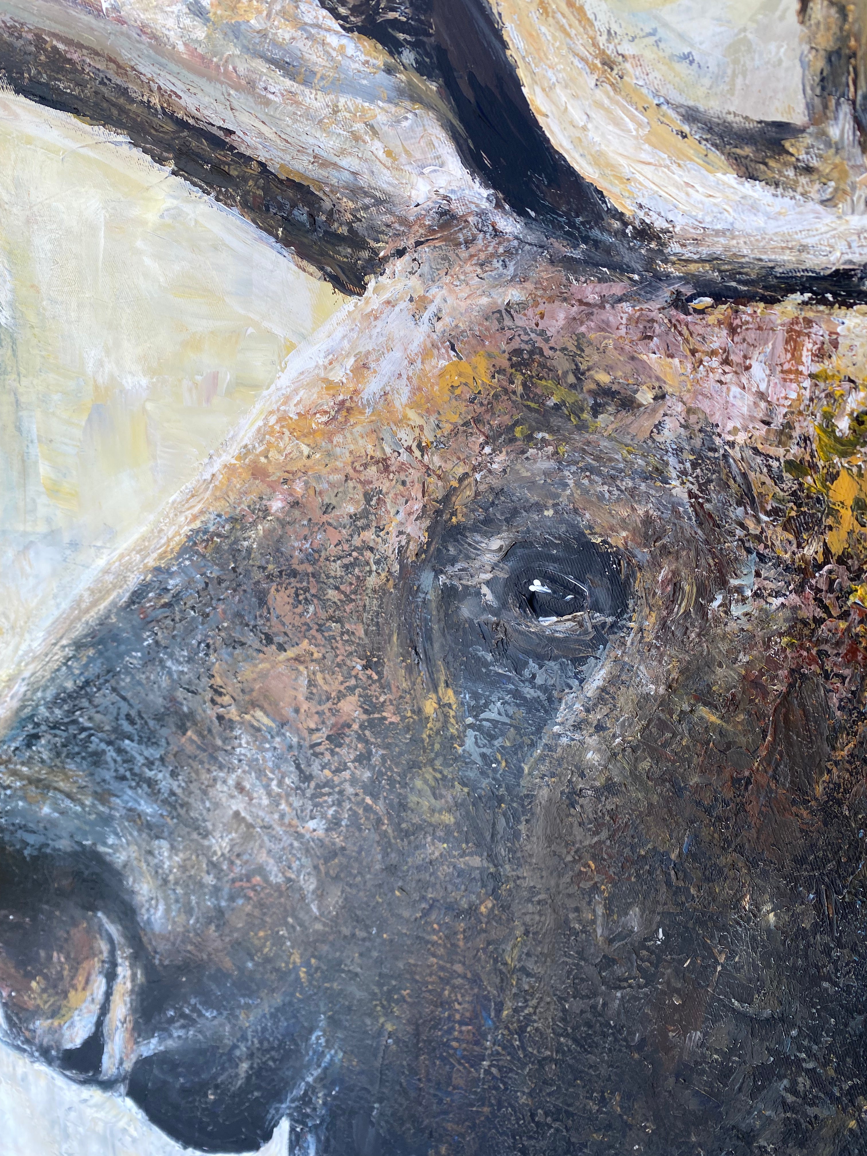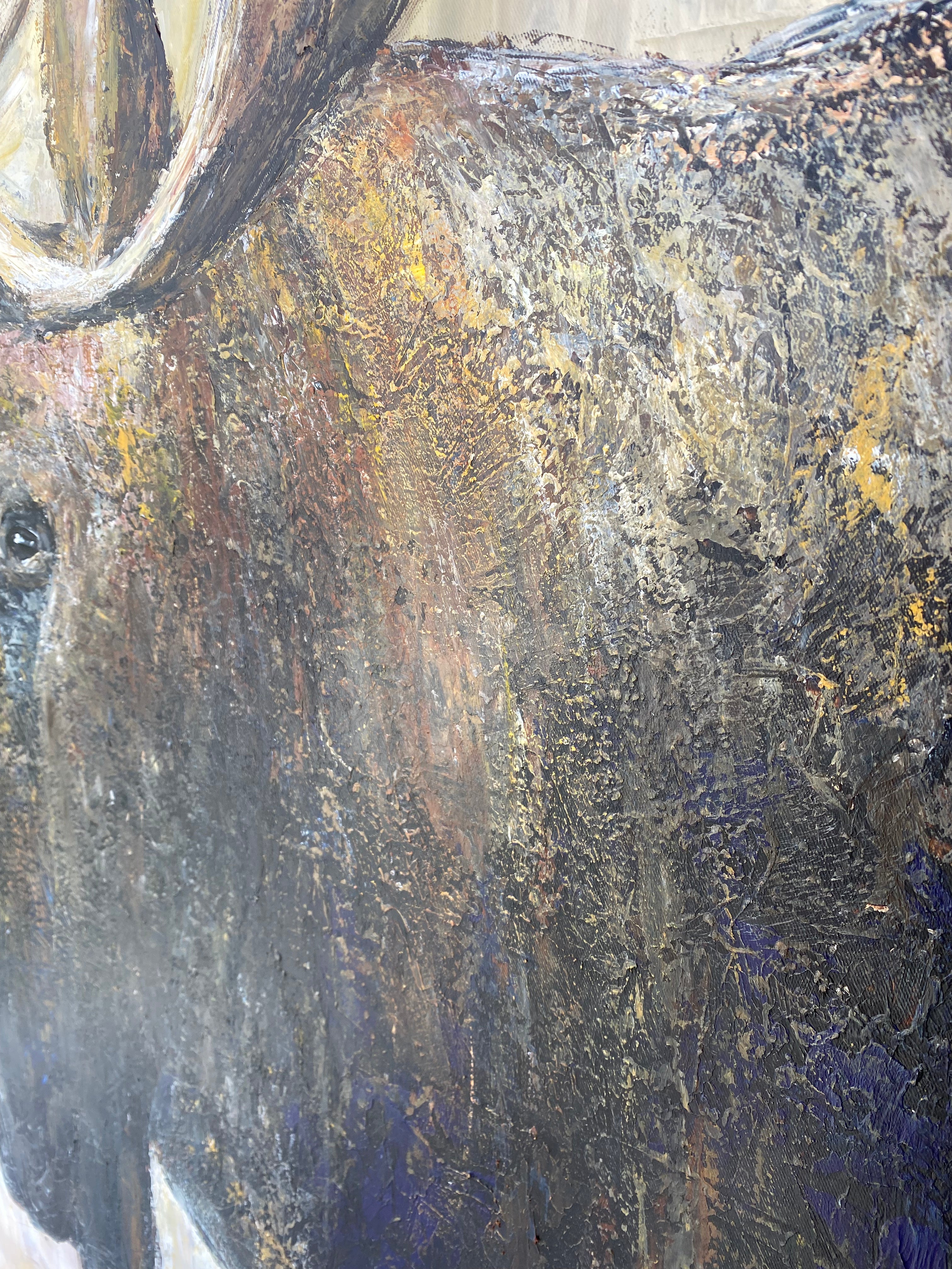Fangen Sie die majestätische Schönheit der Natur mit diesem atemberaubenden Elchgemälde ein, das einen reich strukturierten Hintergrund in erdigen, neutralen Tönen aufweist. Dieses handgemalte Kunstwerk aus der Tierwelt bringt rustikale Eleganz in jedes Haus, jede Hütte oder jedes Interieur im Lodge-Stil. Die tiefen Blau-, Braun- und Grautöne schaffen eine raffinierte und beruhigende Atmosphäre und machen es zu einem perfekten Statement für ein modernes rustikales Wohnzimmer, ein Büro oder einen von der Natur inspirierten Raum. Werten Sie Ihre Einrichtung mit dieser kraftvollen und doch ruhigen Darstellung der Wildnis auf.