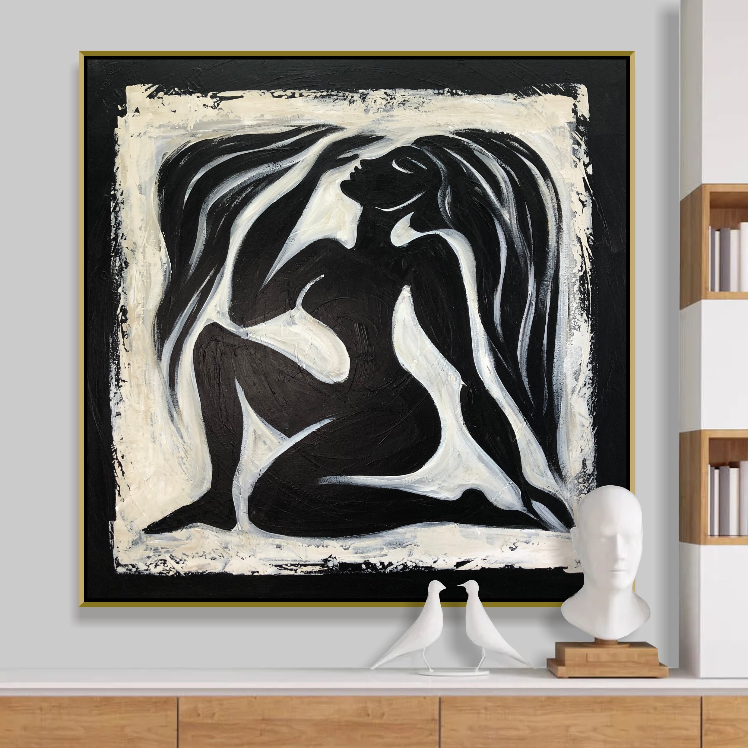 Verleihen Sie Ihren Räumen einen Hauch von Eleganz und Modernität mit diesem auffälligen abstrakten Gemälde, das eine weibliche Silhouette in monochromem Schwarz und Weiß zeigt. Das minimalistische Design und der zeitgenössische Stil machen es zu einer perfekten Ergänzung für jede Einrichtung, egal ob es sich um ein Wohnzimmer, ein Büro oder eine Galeriewand handelt. Die anmutigen Linien und abstrakten Muster bilden einen fesselnden Blickpunkt, der Schönheit und Raffinesse verkörpert. Peppen Sie Ihr Zuhause mit diesem einzigartigen Stück moderner Kunst auf.