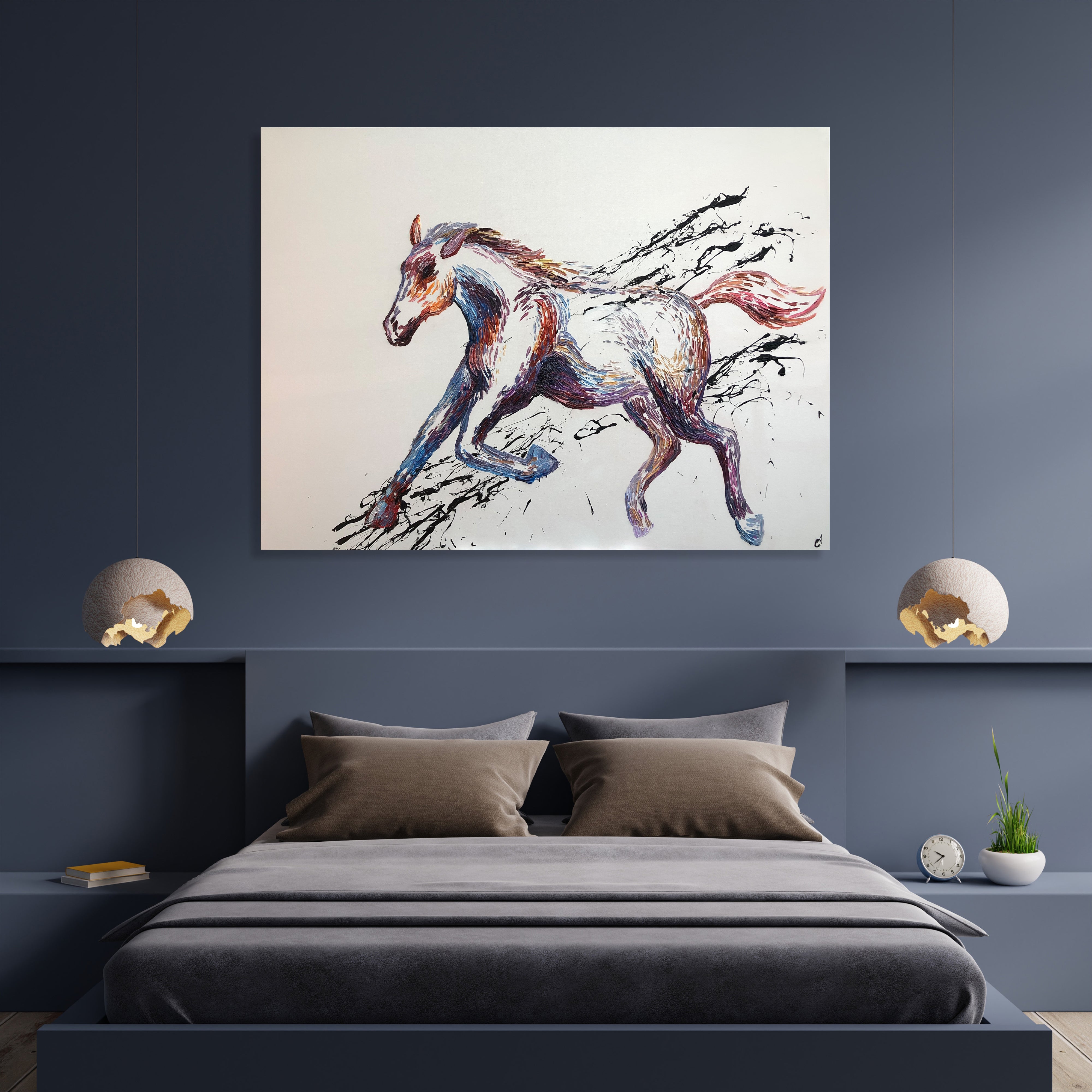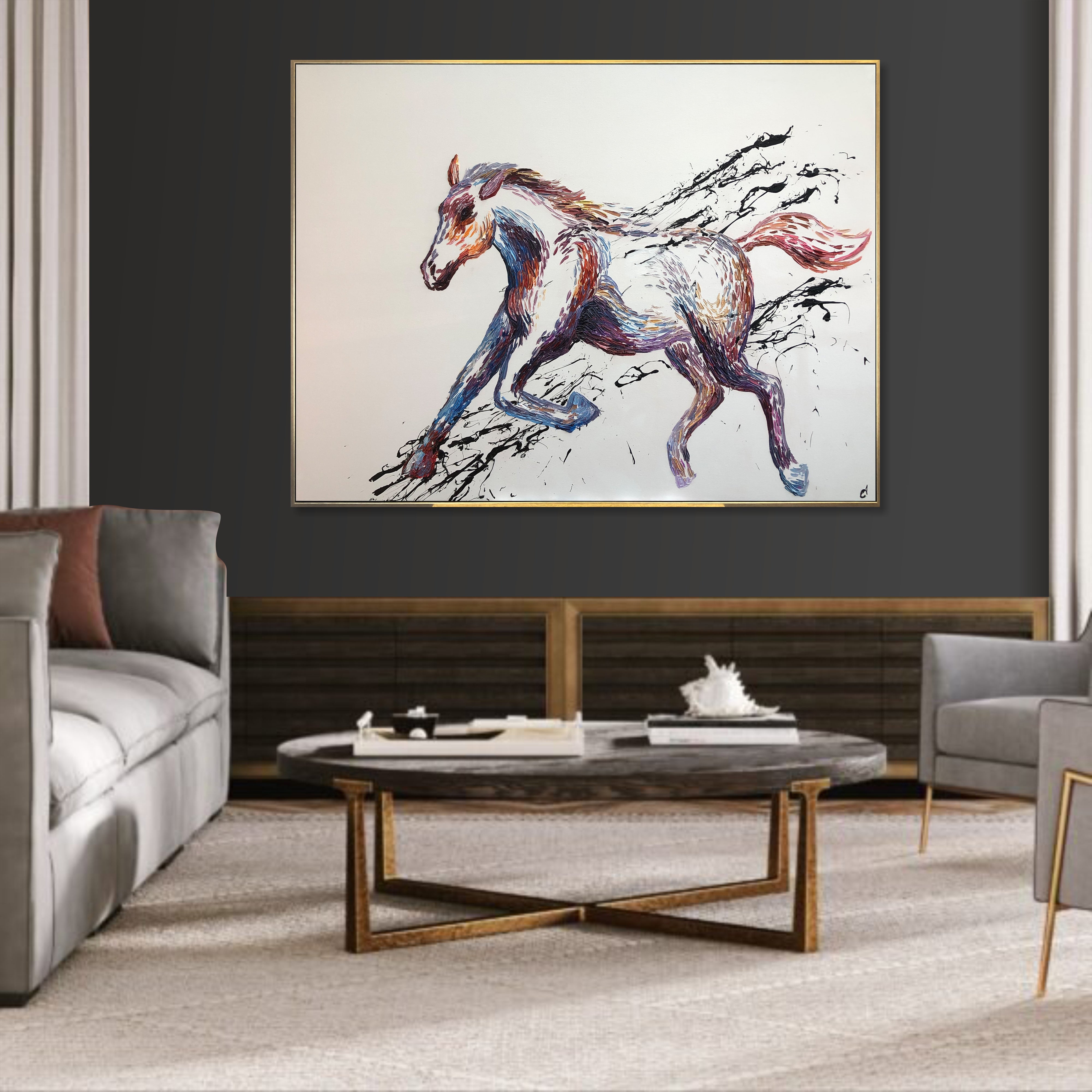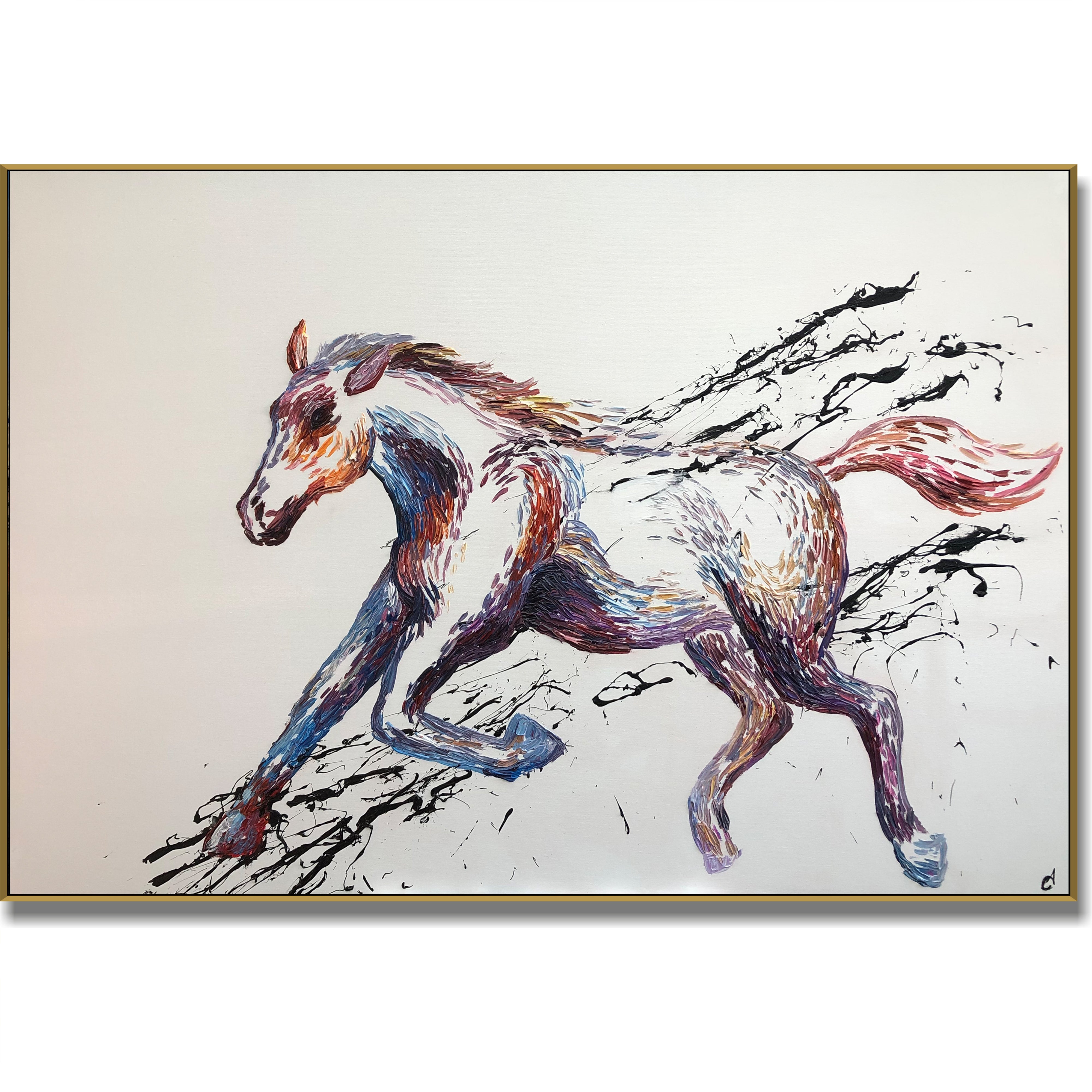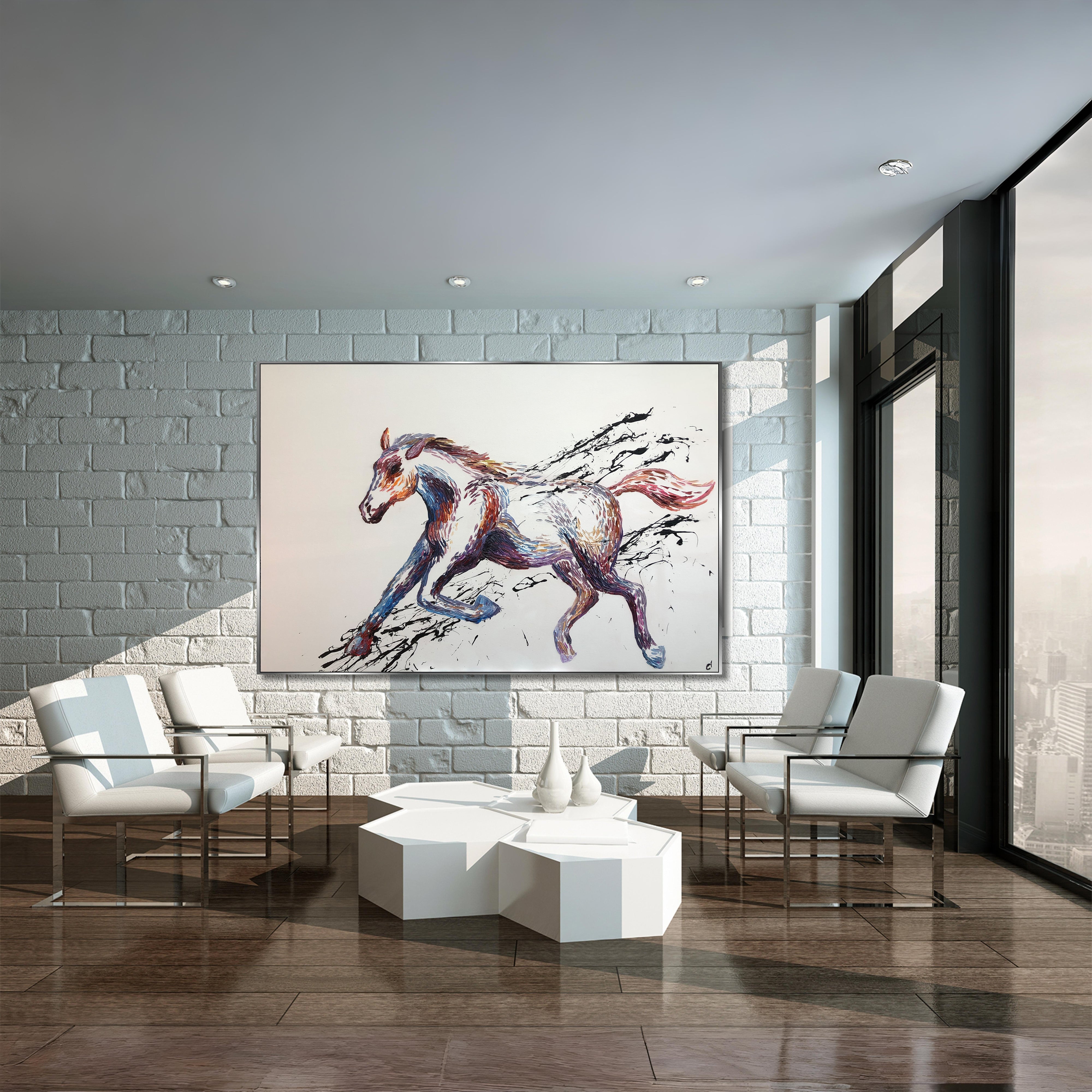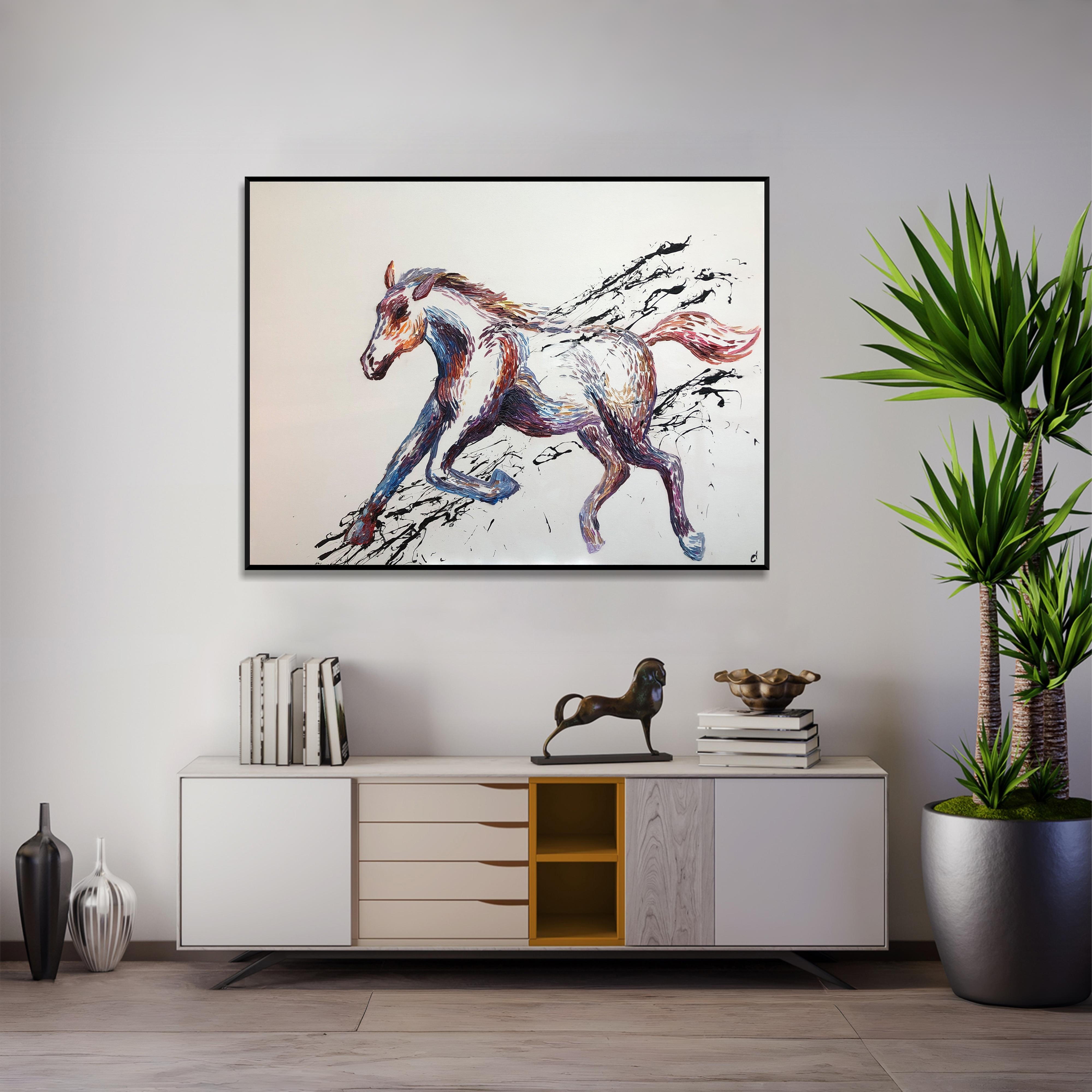Diese Pferde gehören einer sehr seltenen Rasse an, die für ihre reinweiße Fellfarbe bekannt ist. Der Künstler, der dieses Impasto-Gemälde schuf, wählte das Camarillo-Pferd aufgrund seines eleganten Körperbaus und der Schönheit seiner natürlichen, reinen Farbe, die es ihm ermöglichte, die Schatten des Tieres in allen Farben des Regenbogens darzustellen. Ausdrucksstarke Bewegungen und Anmut machen die Pferdemalerei zu einem der beliebtesten Motive für Künstler.