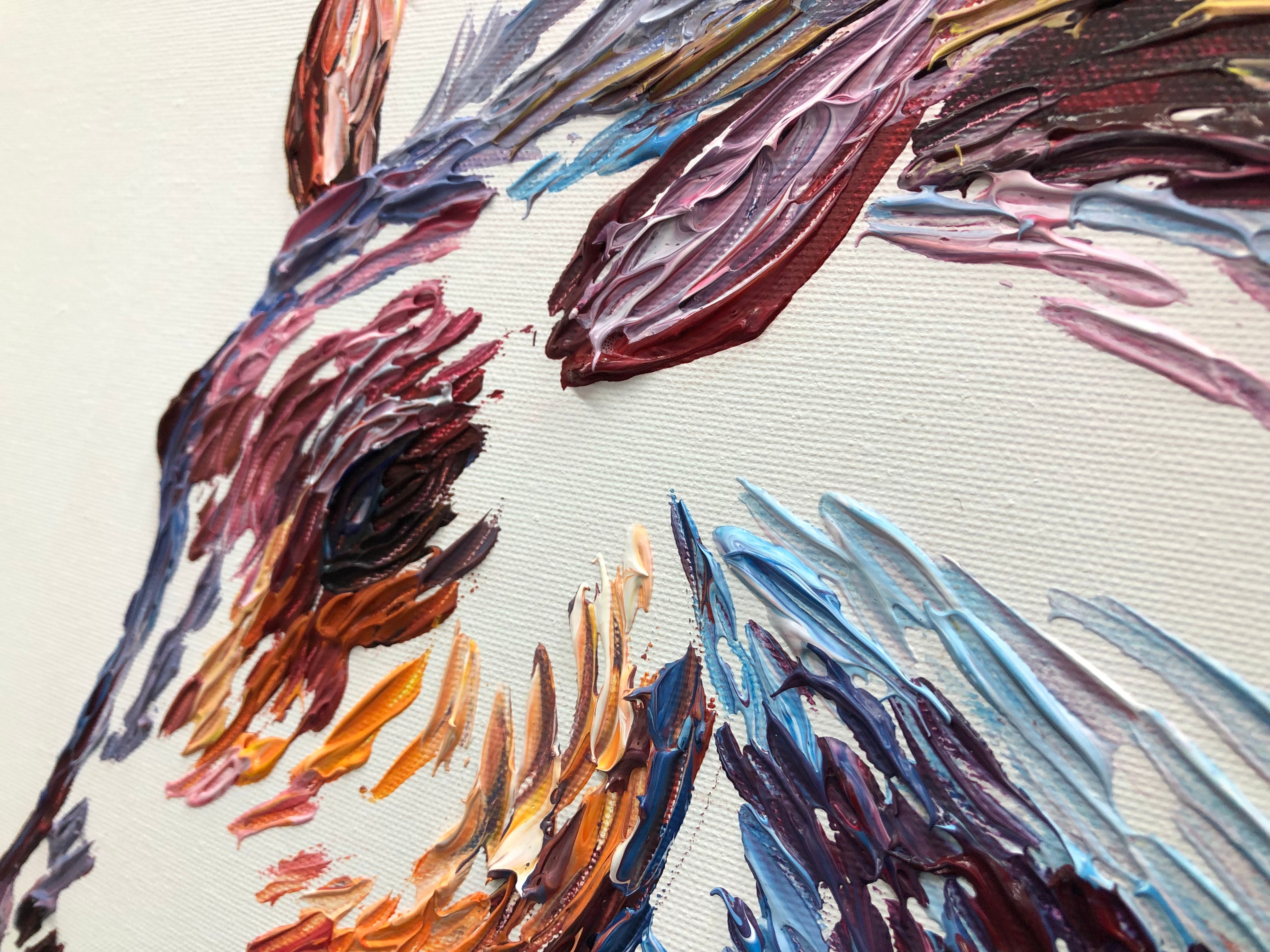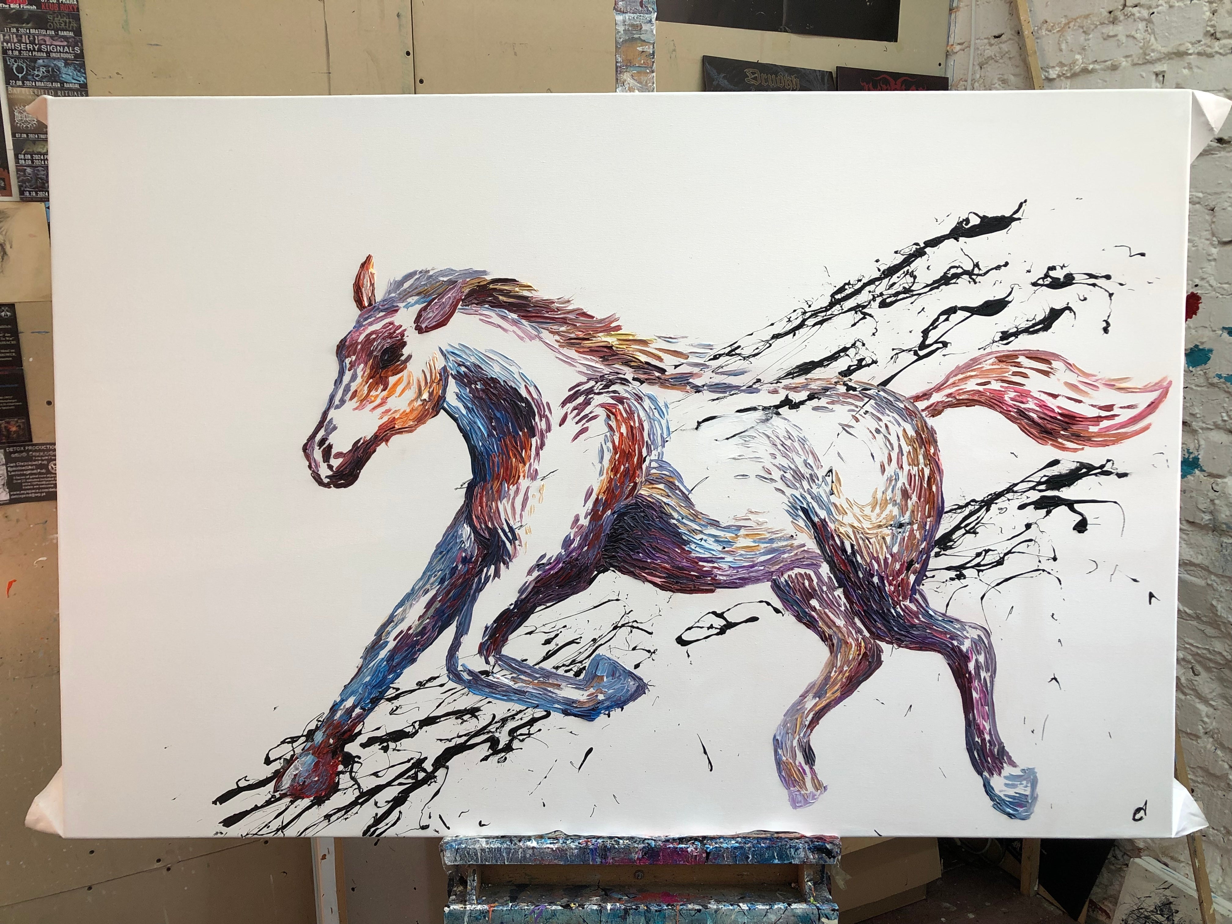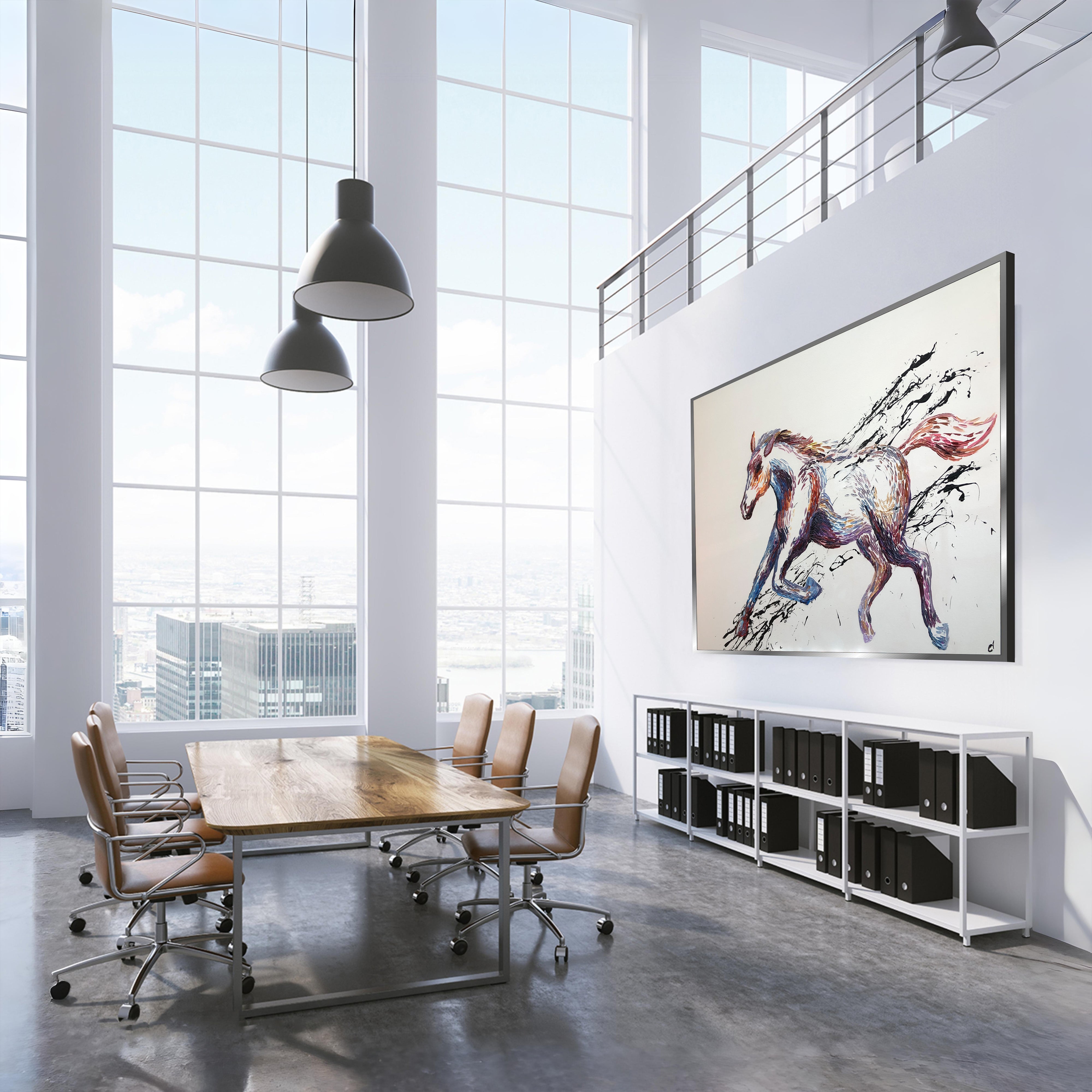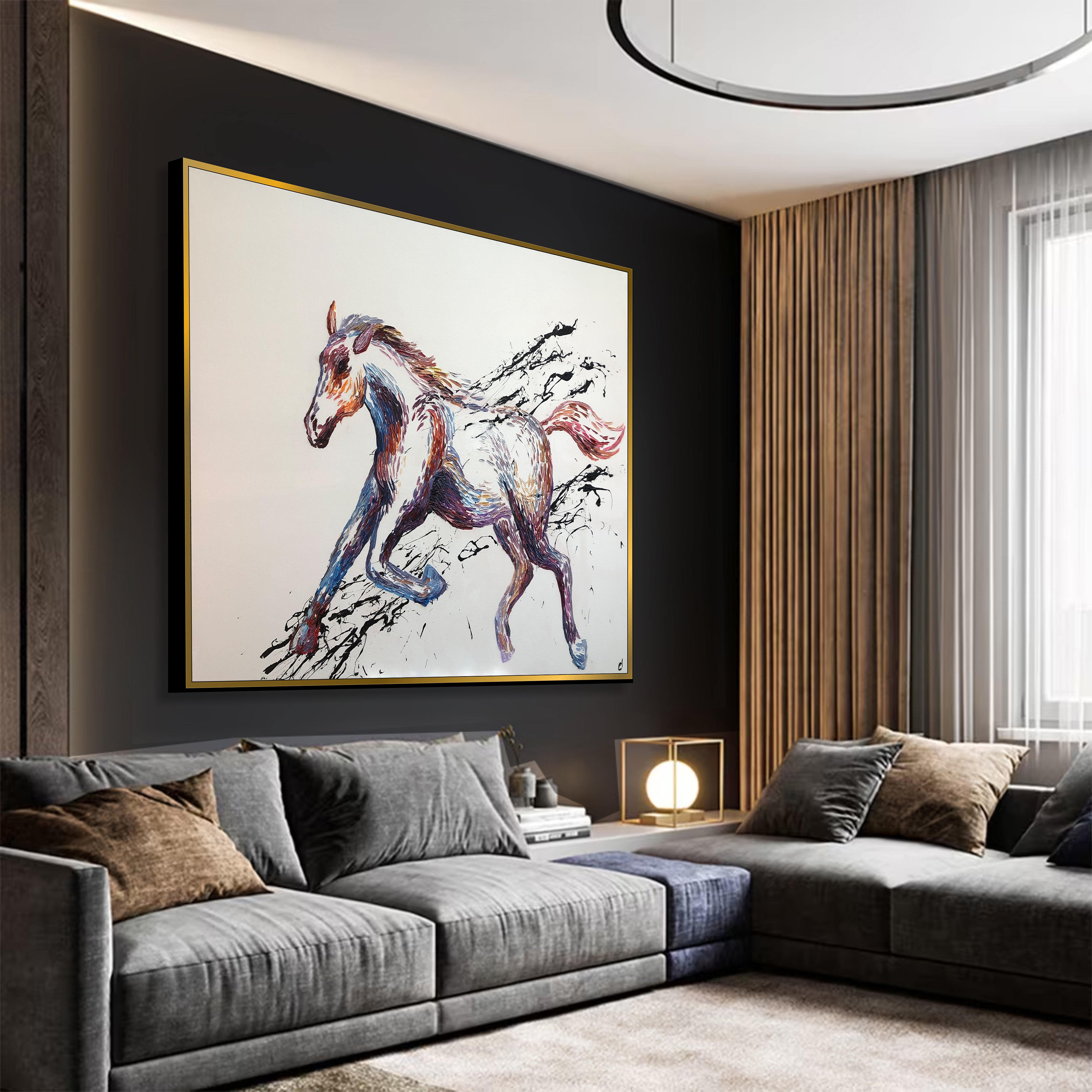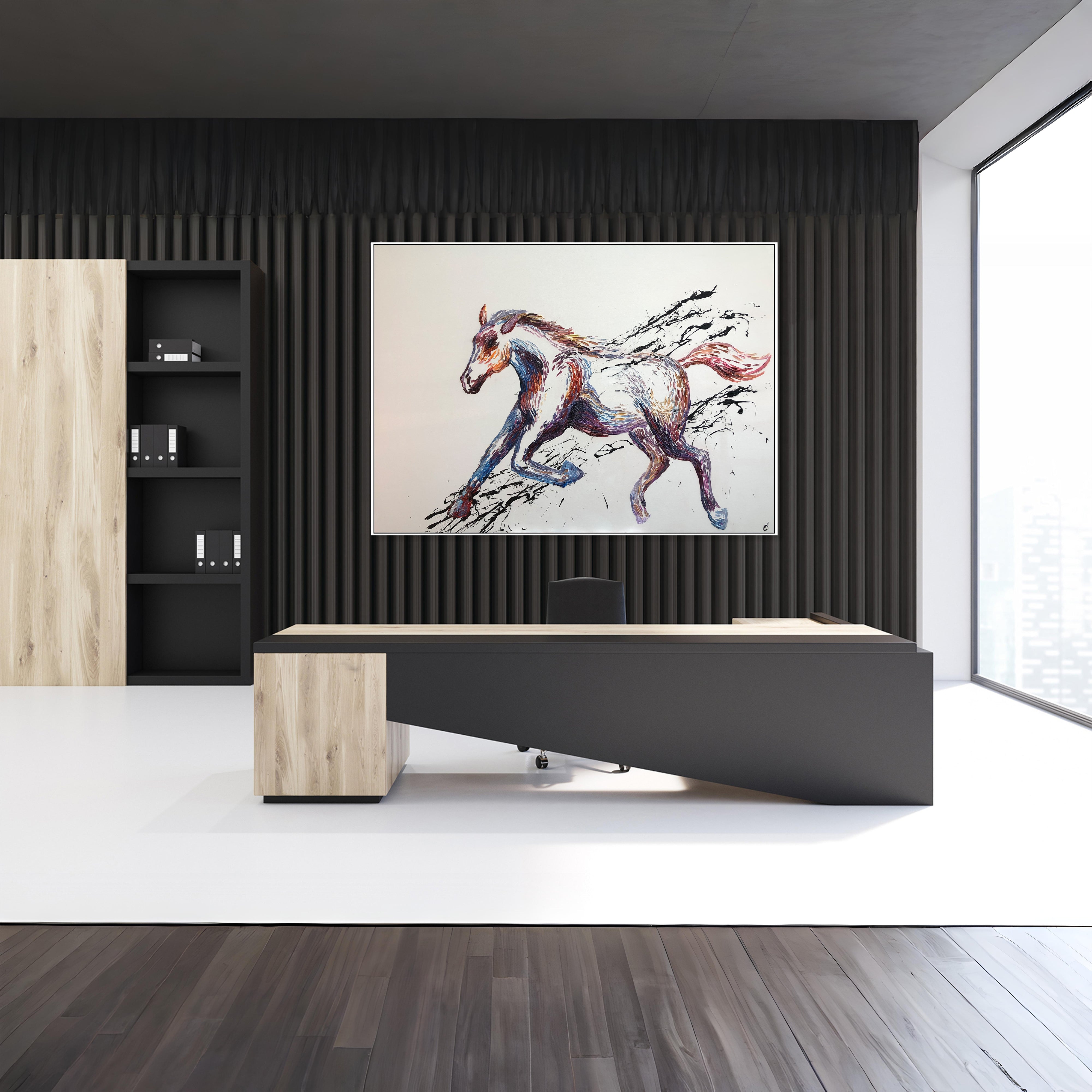 Diese Pferde gehören einer sehr seltenen Rasse an, die für ihre reinweiße Fellfarbe bekannt ist. Der Künstler, der dieses Impasto-Gemälde schuf, wählte das Camarillo-Pferd aufgrund seines eleganten Körperbaus und der Schönheit seiner natürlichen, reinen Farbe, die es ihm ermöglichte, die Schatten des Tieres in allen Farben des Regenbogens darzustellen. Ausdrucksstarke Bewegungen und Anmut machen die Pferdemalerei zu einem der beliebtesten Motive für Künstler.
