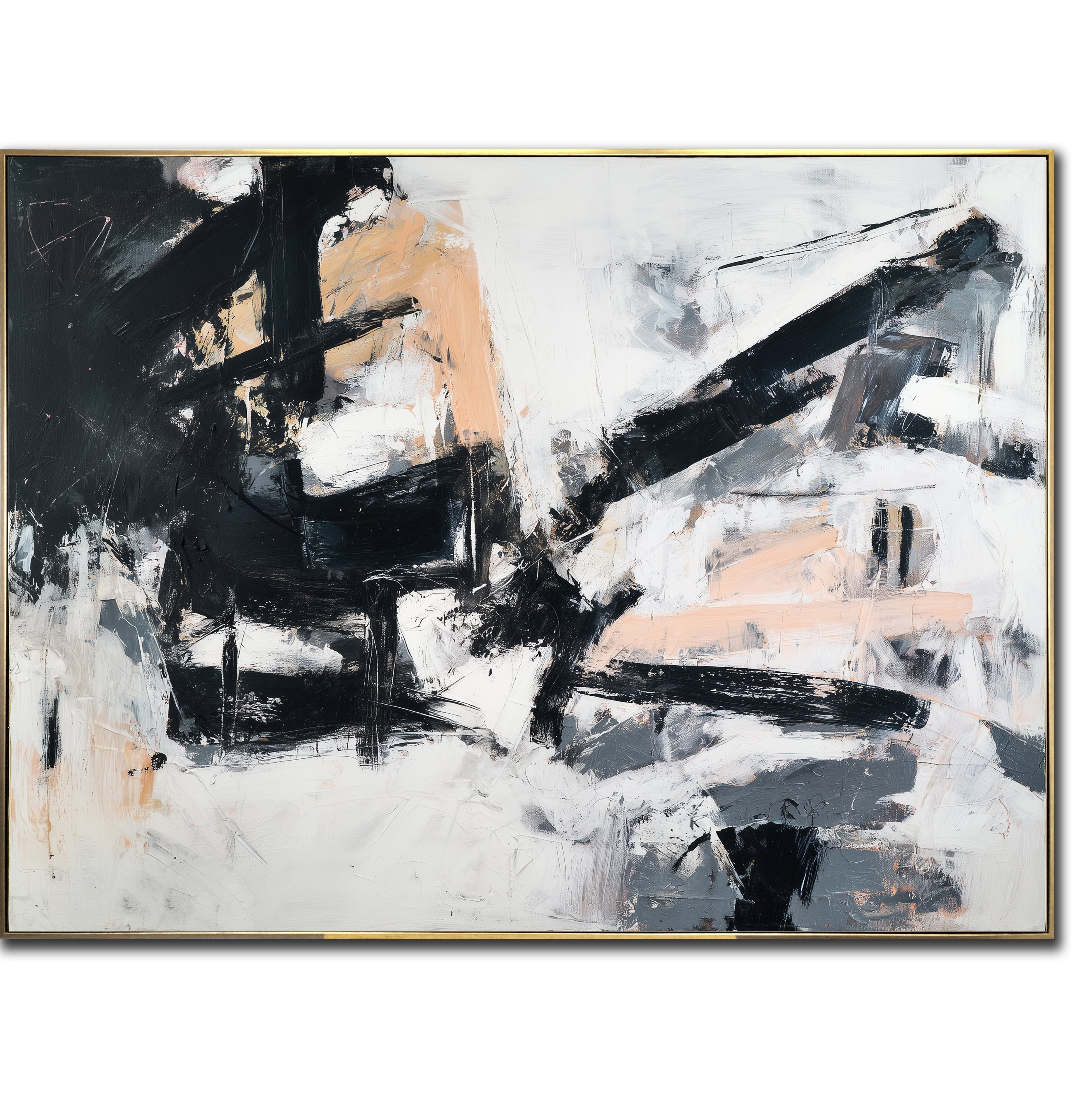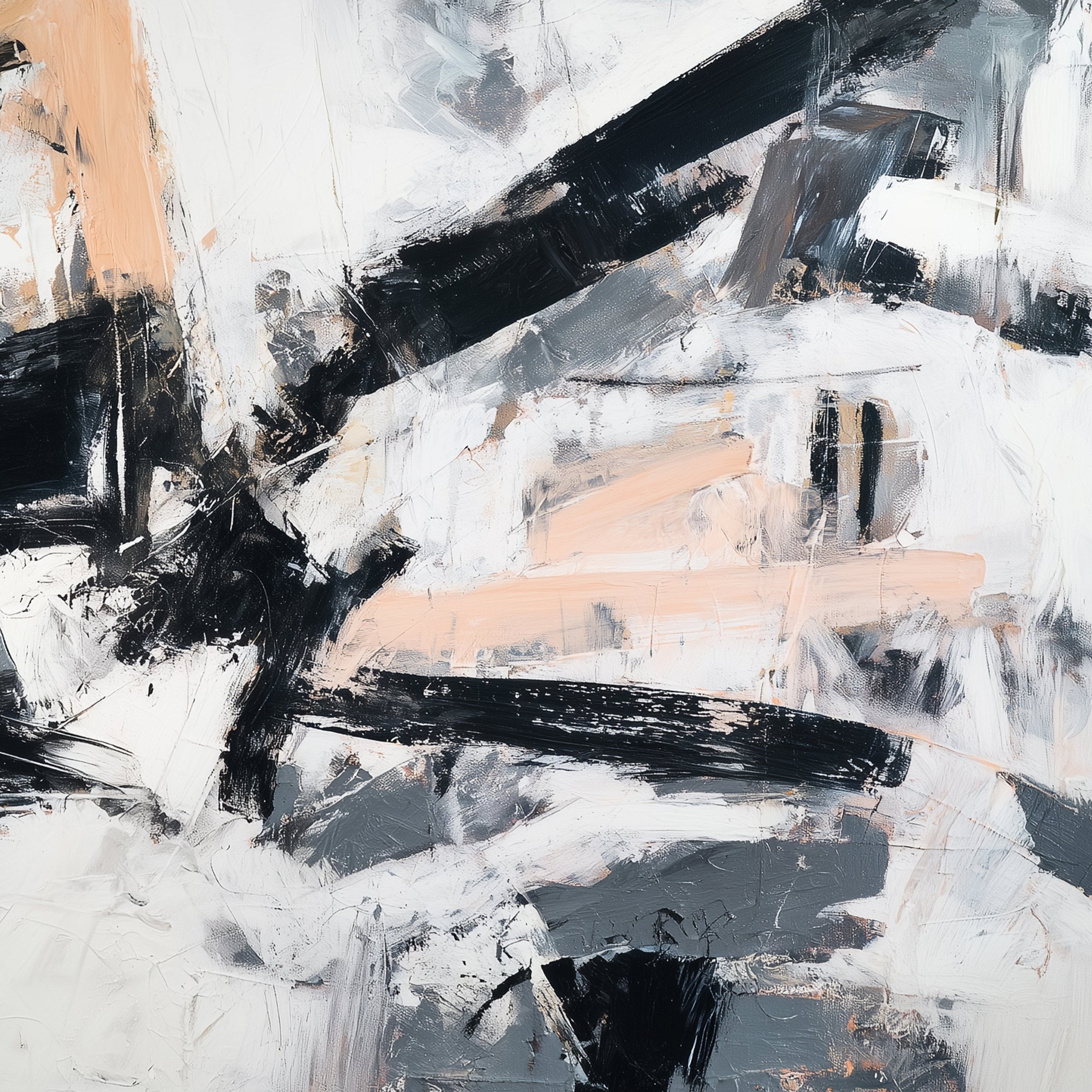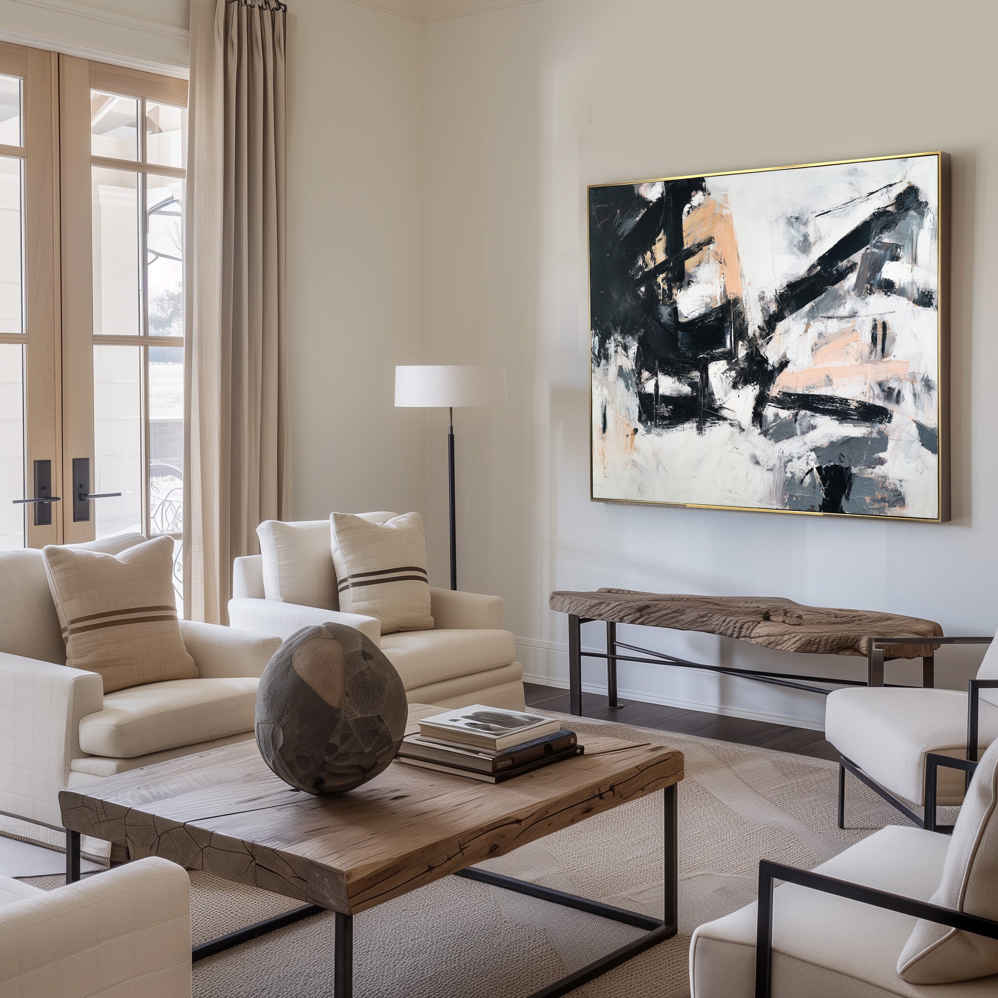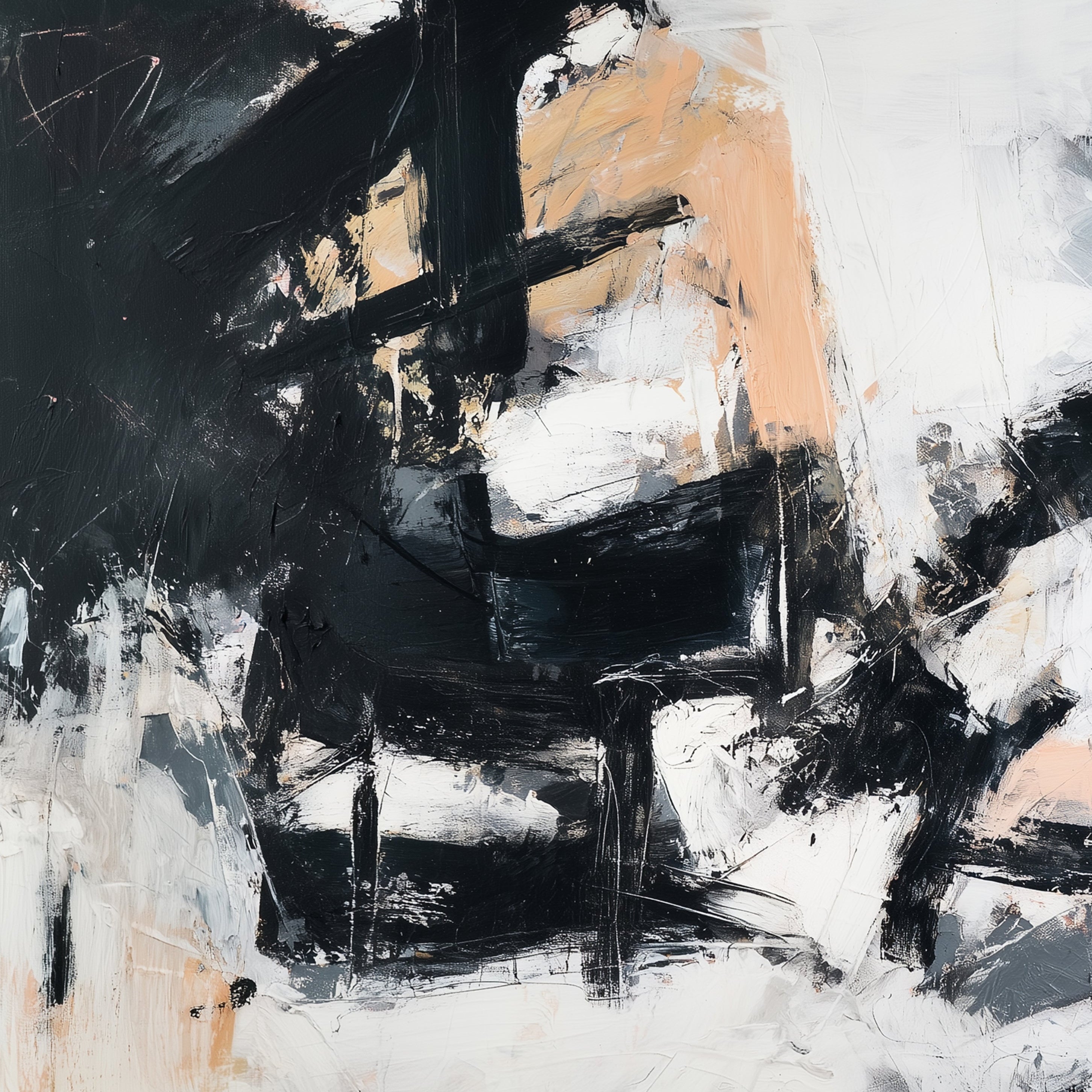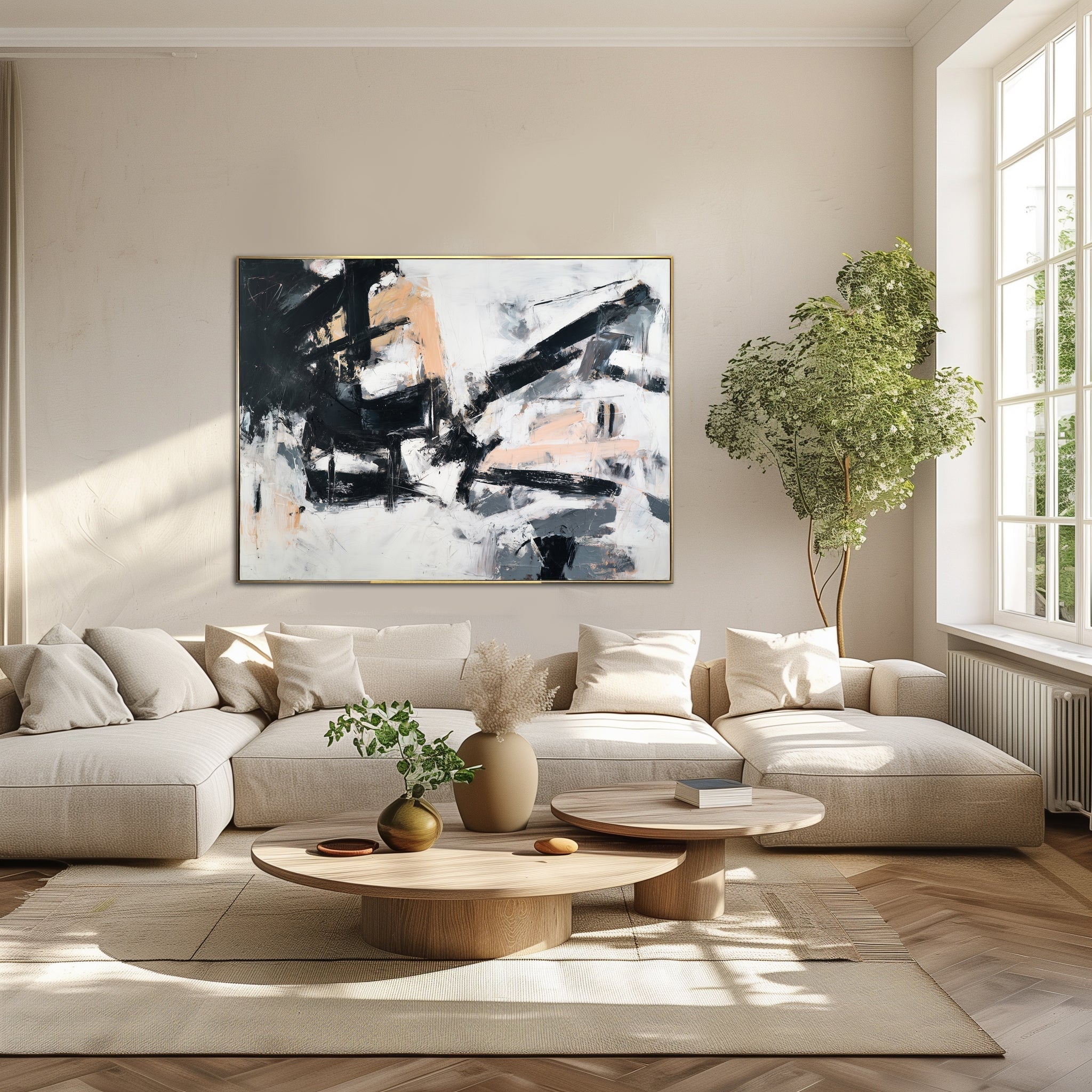 „Echoes in Motion“ ist ein ausdrucksstarkes abstrakt-expressionistisches Werk mit dynamischen schwarzen Strichen über sanften Pfirsich-, Weiß- und Grautönen. Seine strukturierte Bewegung verleiht modernen Interieurs Ausgewogenheit und Energie, während die neutrale Farbpalette vielseitige Gestaltungsmöglichkeiten in Wohnzimmern, Büros oder Fluren ermöglicht. Dieses minimalistische Leinwandbild verleiht jeder Wand Eleganz und einen modernen Touch und ist ein perfektes Statement für zukunftsweisende Räume.