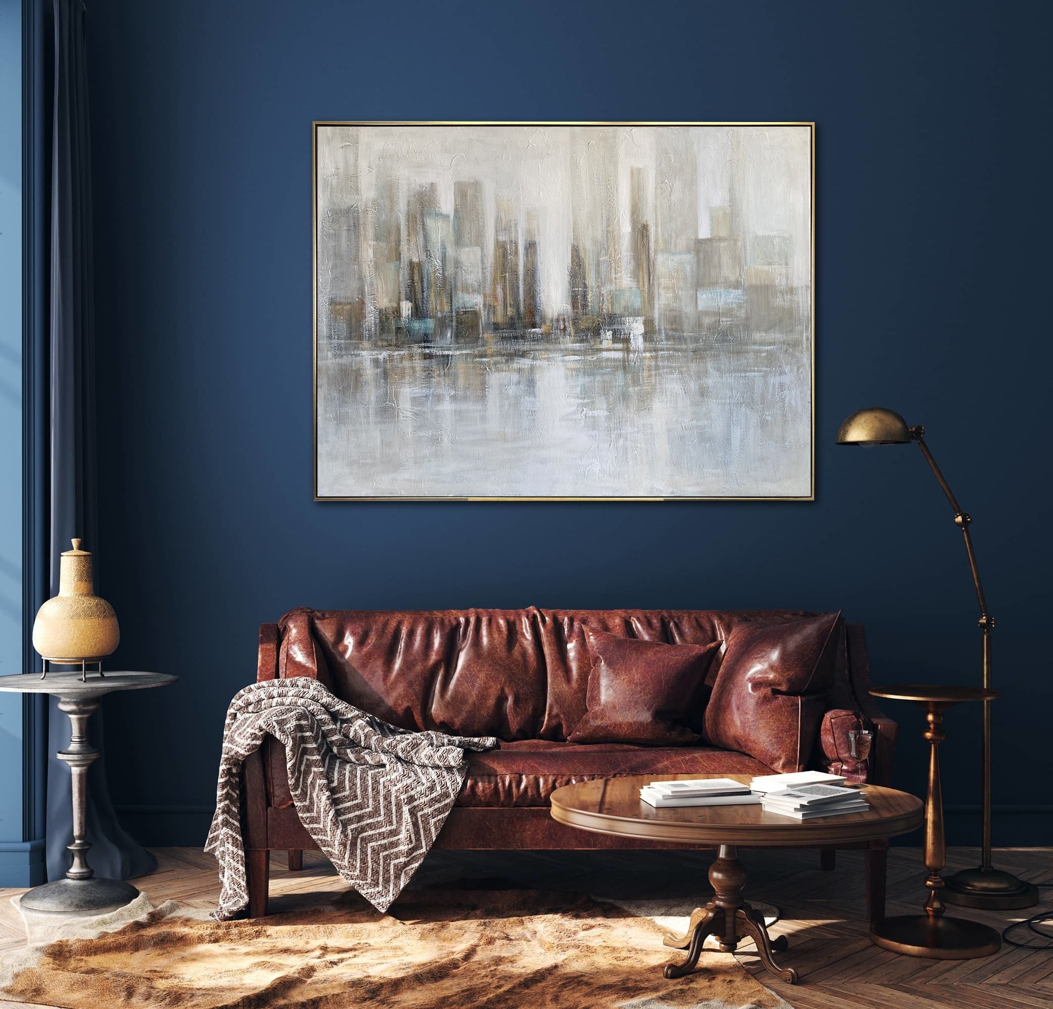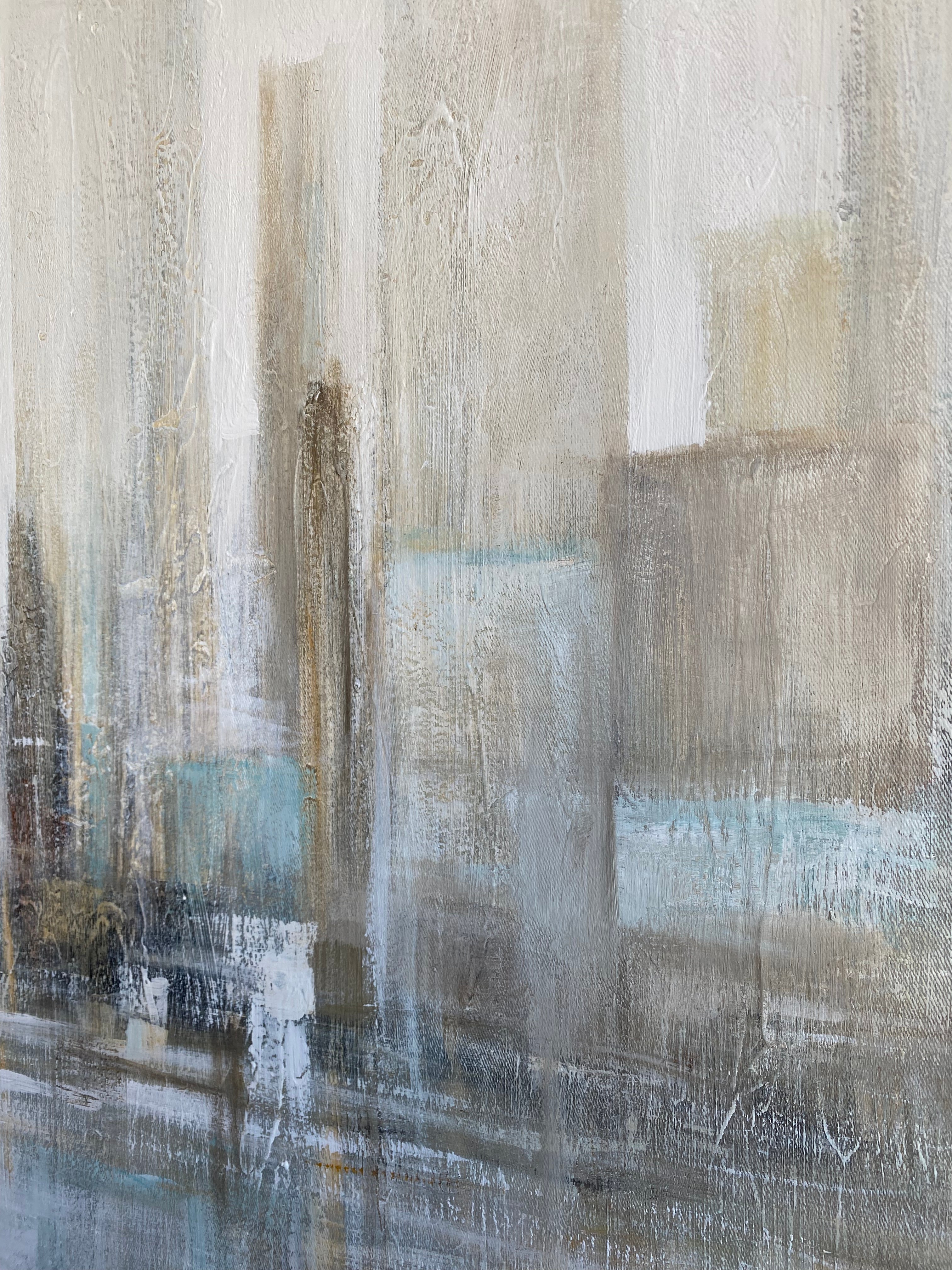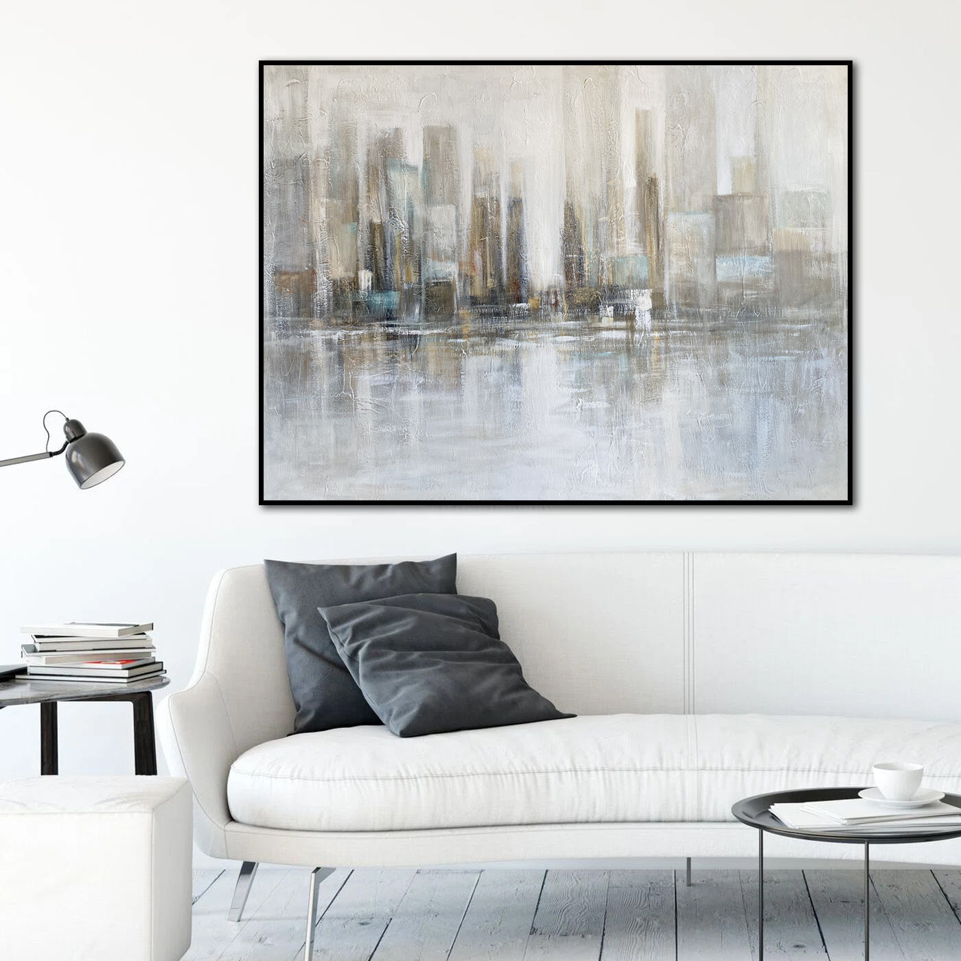Ruhig, modern und raffiniert – diese strukturierte abstrakte Stadtlandschaft fängt eine neblige Skyline ein, die sich im Wasser spiegelt. Schichten aus sanftem Grau, Taupe und Elfenbein mit einem Hauch von Stahlblau und warmem Gold schaffen eine ruhige, neutrale Farbpalette, die zu Wohnzimmern, Schlafzimmern und Büros passt. Handgemalt auf Leinwand mit dezentem Impasto für Tiefe. Wählen Sie eine individuelle Größe und einen optionalen Schattenfugenrahmen. Fertig zum Aufhängen, wenn gespannt oder gerollt geliefert. Farbanpassungen möglich – bringen Sie luftige, urbane Eleganz an Ihre Wand.