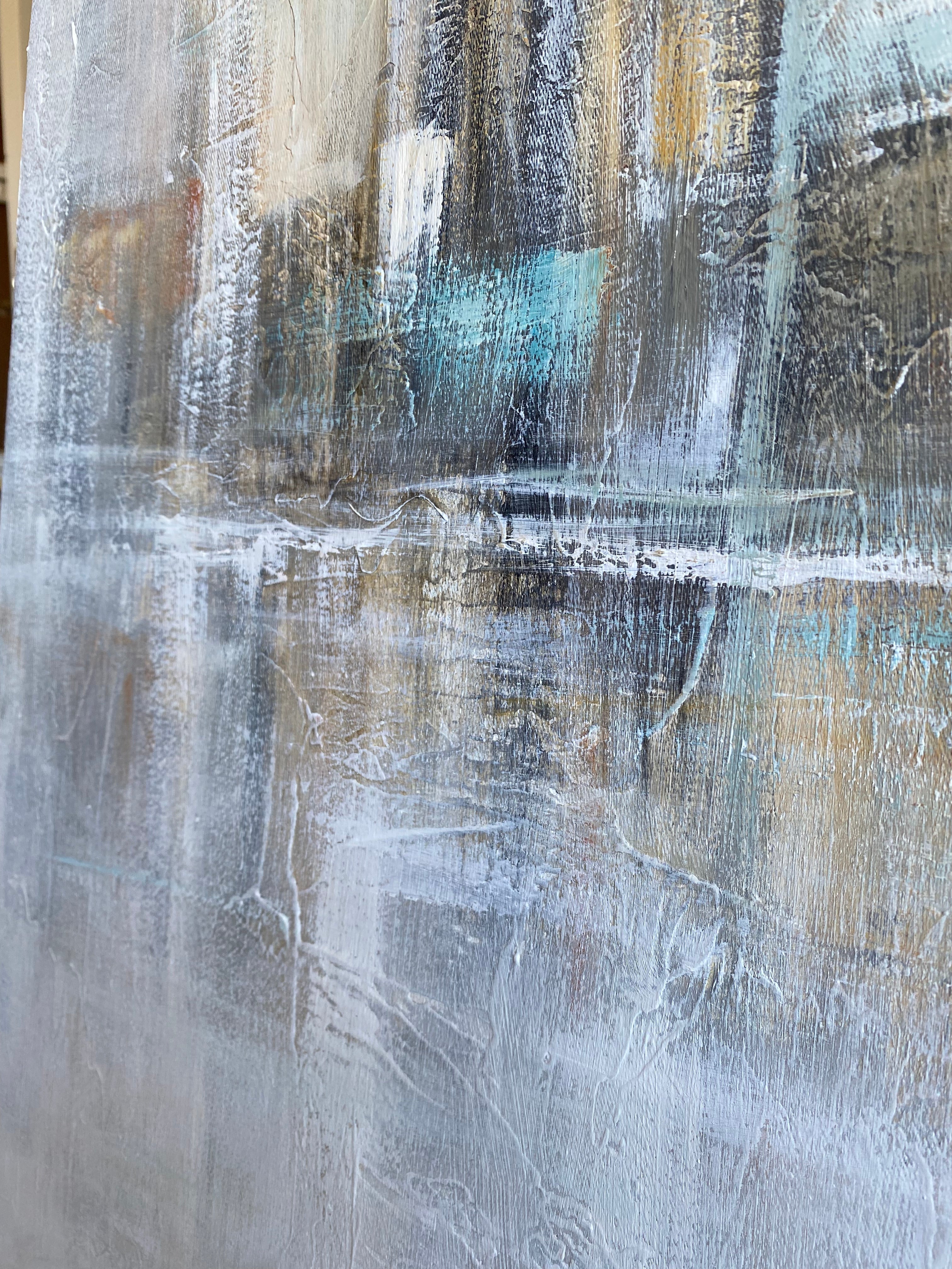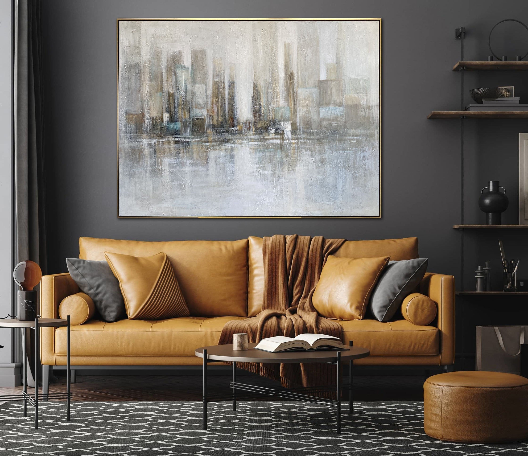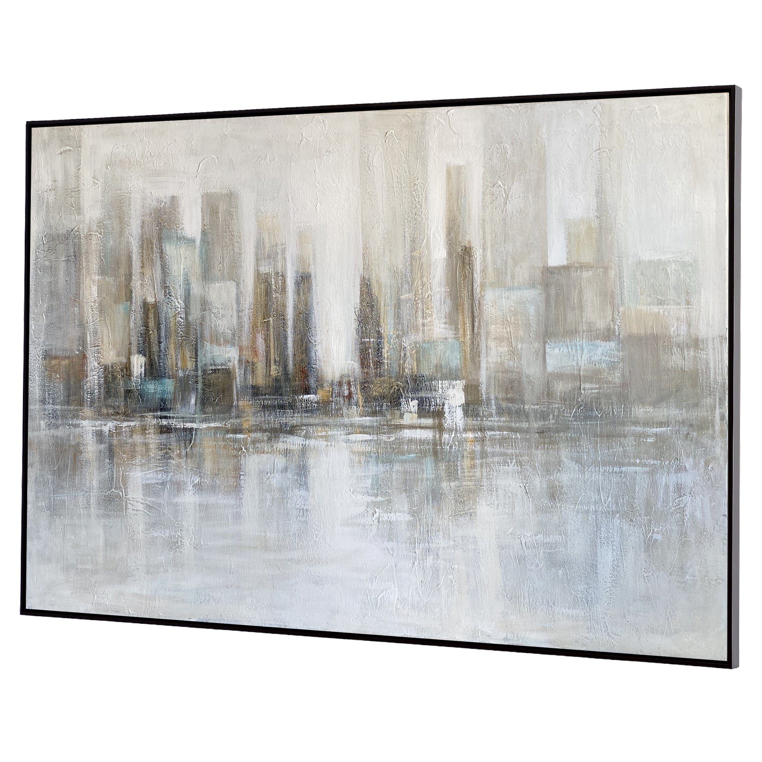 Ruhig, modern und raffiniert – diese strukturierte abstrakte Stadtlandschaft fängt eine neblige Skyline ein, die sich im Wasser spiegelt. Schichten aus sanftem Grau, Taupe und Elfenbein mit einem Hauch von Stahlblau und warmem Gold schaffen eine ruhige, neutrale Farbpalette, die zu Wohnzimmern, Schlafzimmern und Büros passt. Handgemalt auf Leinwand mit dezentem Impasto für Tiefe. Wählen Sie eine individuelle Größe und einen optionalen Schattenfugenrahmen. Fertig zum Aufhängen, wenn gespannt oder gerollt geliefert. Farbanpassungen möglich – bringen Sie luftige, urbane Eleganz an Ihre Wand.