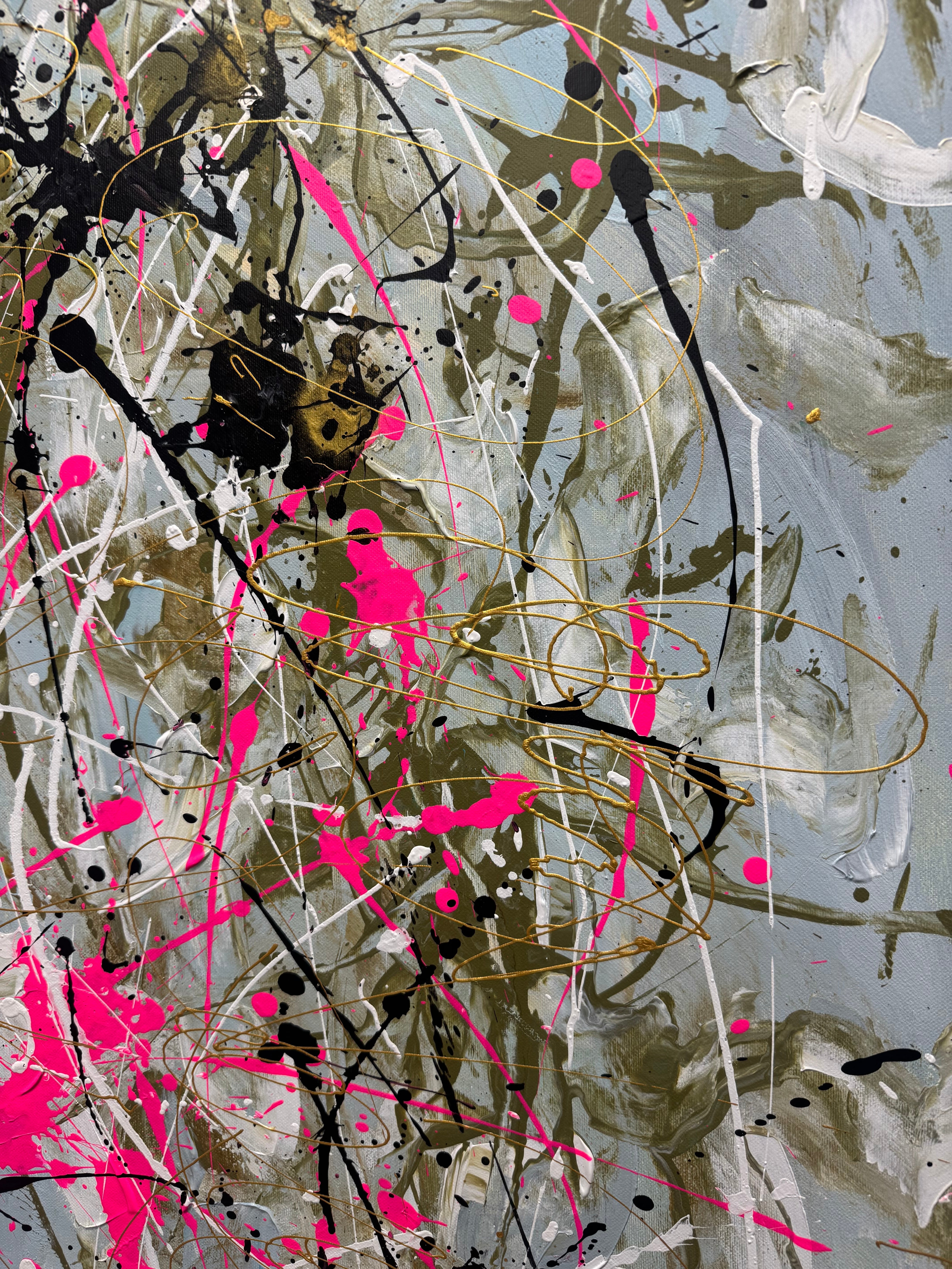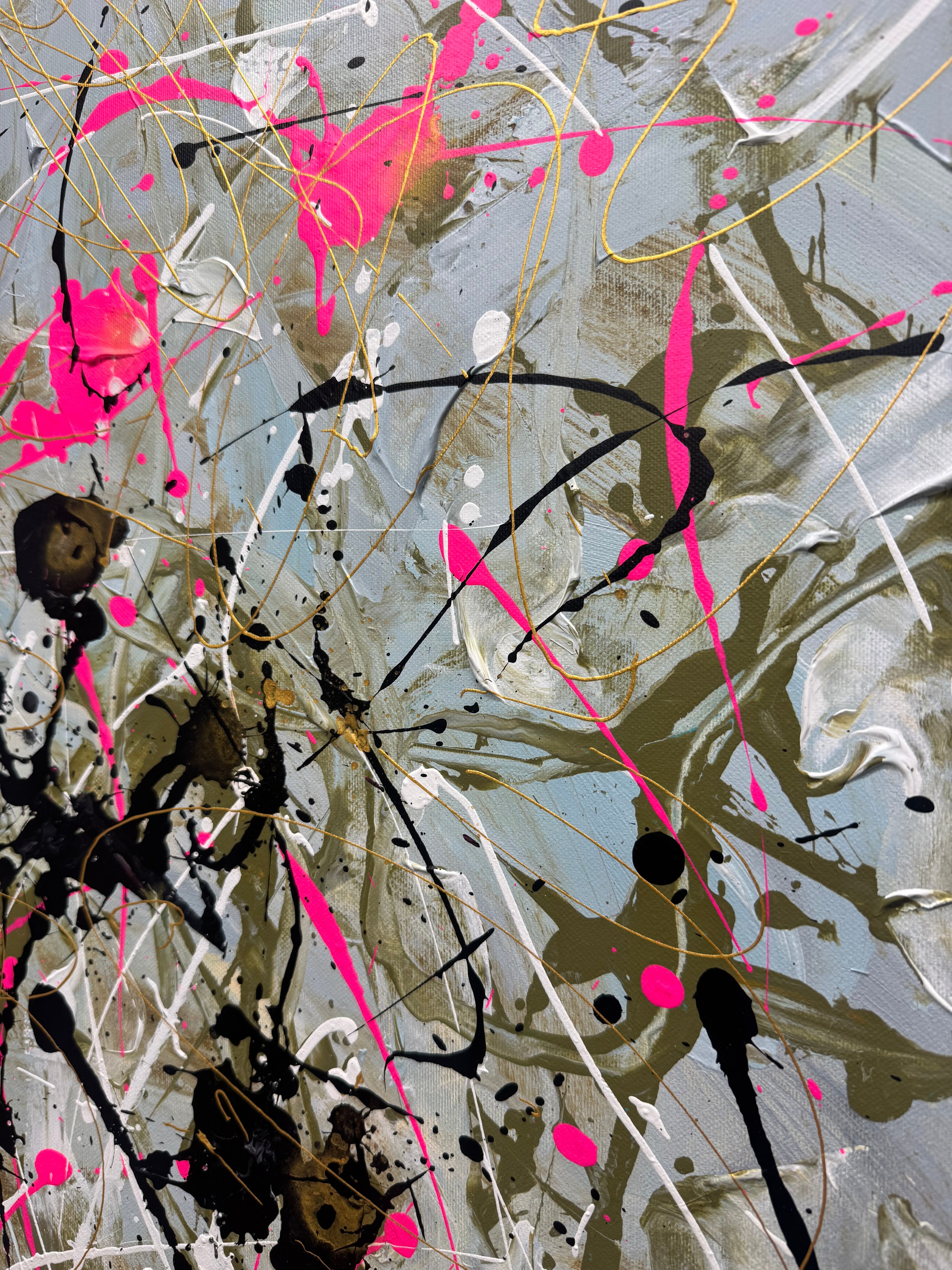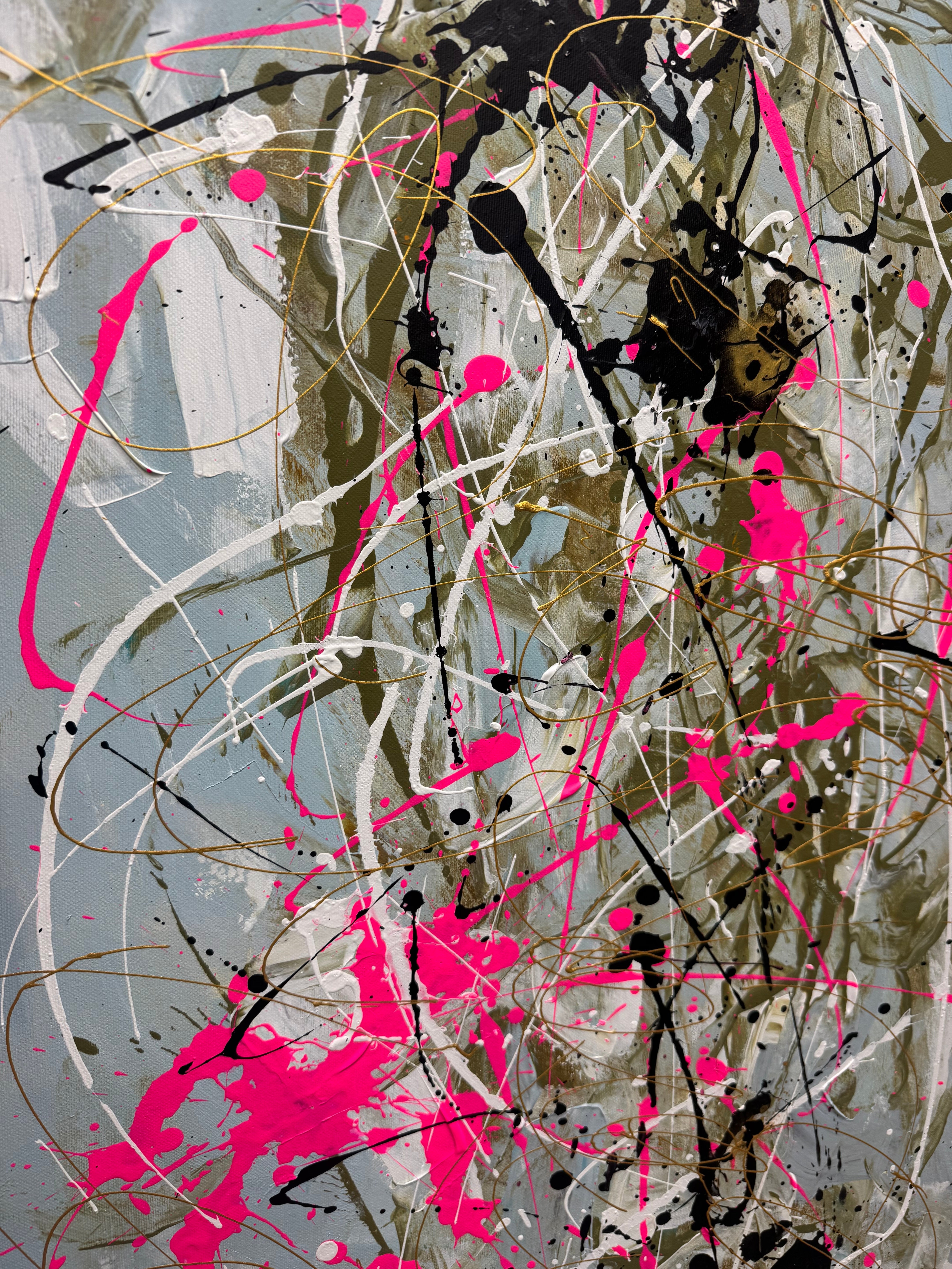 Verleihen Sie Ihrem Raum Bewegung und Farbe. Diese vertikale Leinwand mit Tropfen- und Spritzeffekten kombiniert warmes Grau und Weiß mit olivgrünen Strichen, schwarzen Spritzern und leuchtenden Fuchsia-Tupfern, untermalt von eleganten Goldlinien. Handbemalt mit reicher Textur für die Energie im Pollock-Stil ist es ein markanter Blickfang für Wohnzimmer, Büros oder Lofts. Erhältlich in Sondergrößen mit optionalem Schattenfugenrahmen. Fertig zum Aufhängen, wenn gespannt oder gerollt geliefert. Farbanpassungen sind willkommen – machen Sie dieses Statement-Stück zu Ihrem ganz persönlichen Unikat.