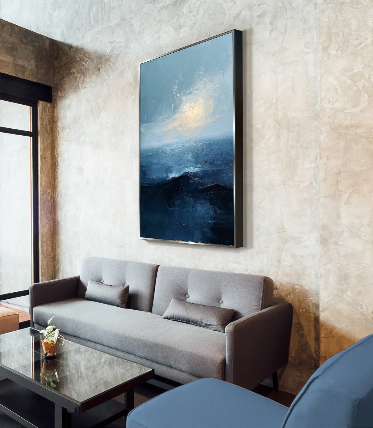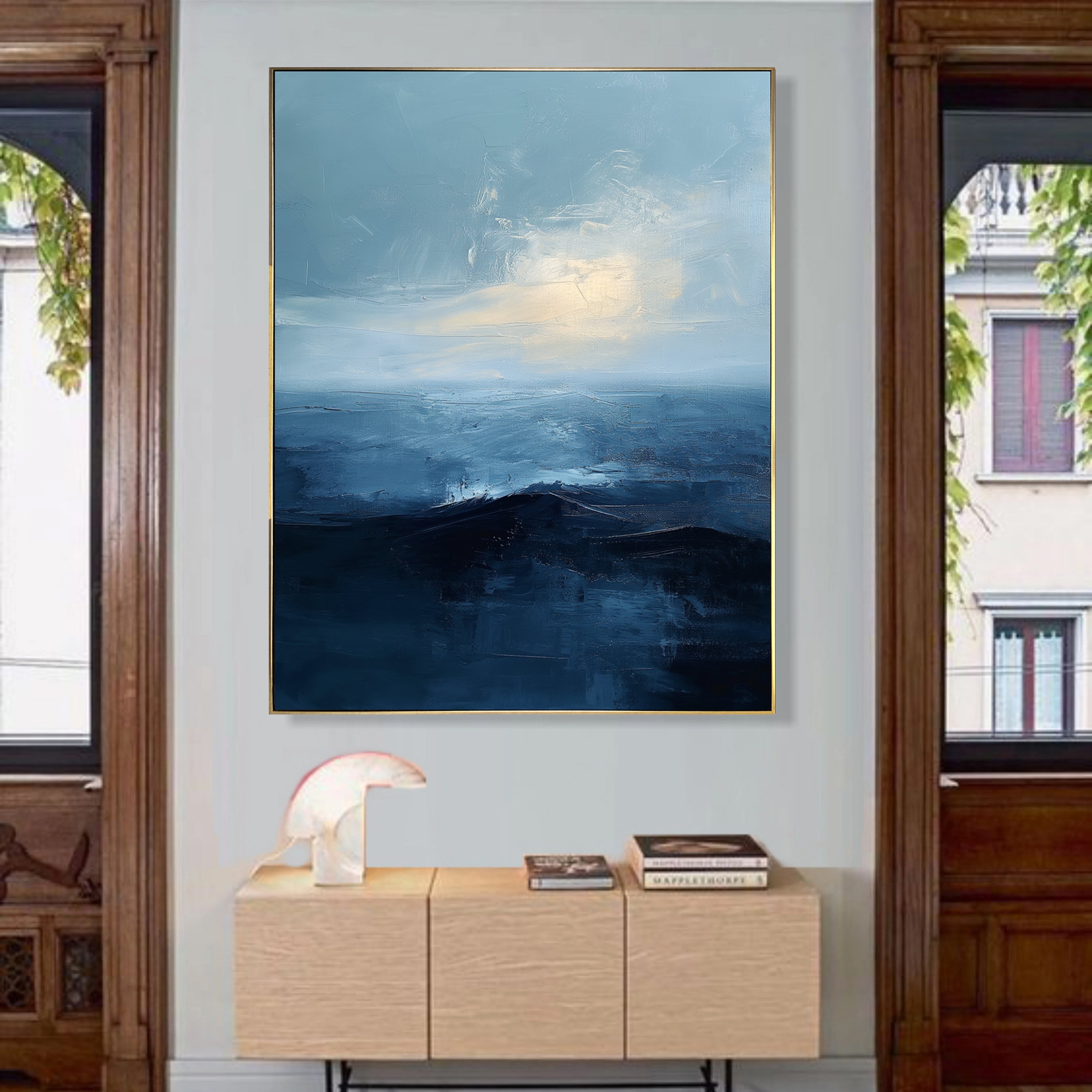 Dieses minimalistische, blaue Meeresgemälde fängt einen ruhigen Ozean unter sanftem, aufsteigendem Licht ein. Mit sattem Marineblau und cremigen Highlights ist es ein modernes Statement für küstennahe, ruhige oder neutrale Innenräume. Die abstrakte Textur strahlt Ruhe aus und verleiht Tiefe und Emotion. Ideal für Schlafzimmer, Wohnzimmer oder Büroräume – dieses Kunstwerk bringt friedliche Energie und Eleganz an Ihre Wand.