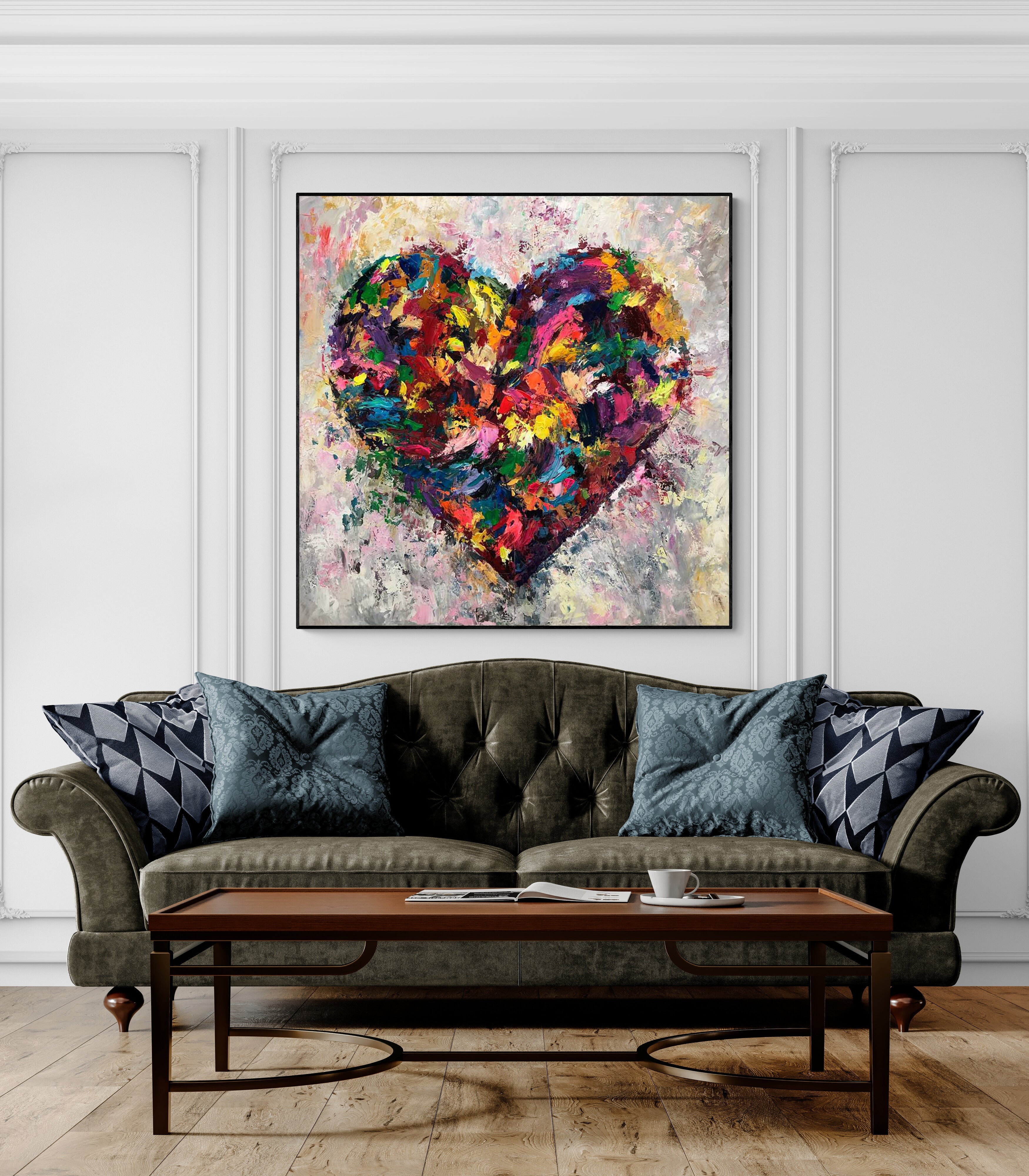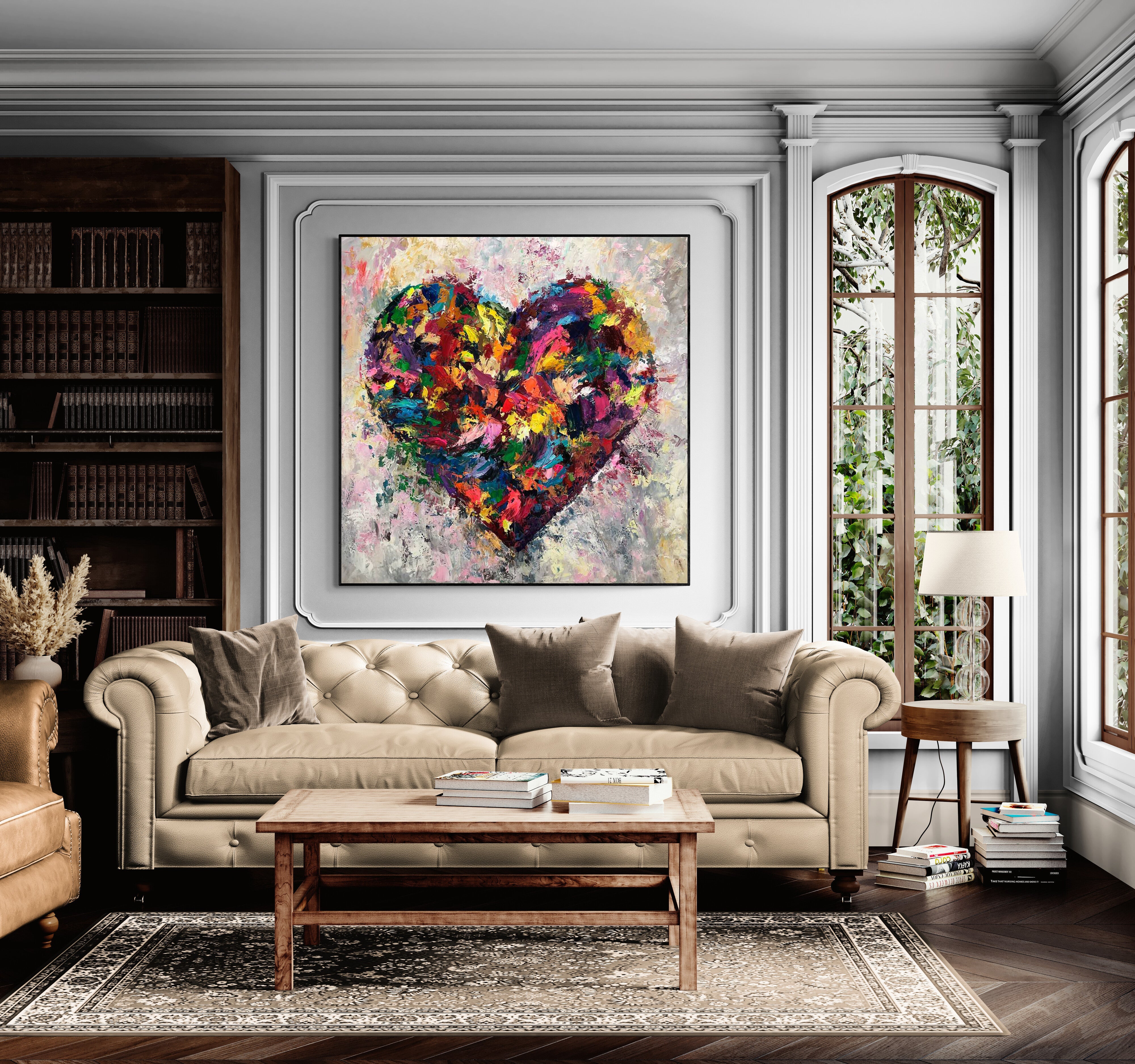 „LOVE EXPRESSION“ sprüht vor lebendigen Farben und emotionaler Ausdruckskraft. Dieses handgemalte abstrakte Herz bringt Freude, Leidenschaft und Dynamik in jeden Raum. Satte Schichten aus Rosa, Blau, Gelb und Rot verschmelzen zu einer lebendigen Komposition, die Wärme und Verbundenheit ausstrahlt. Ein perfektes Geschenk für Paare oder ein ausdrucksstarkes Herzstück für romantische, moderne Interieurs.