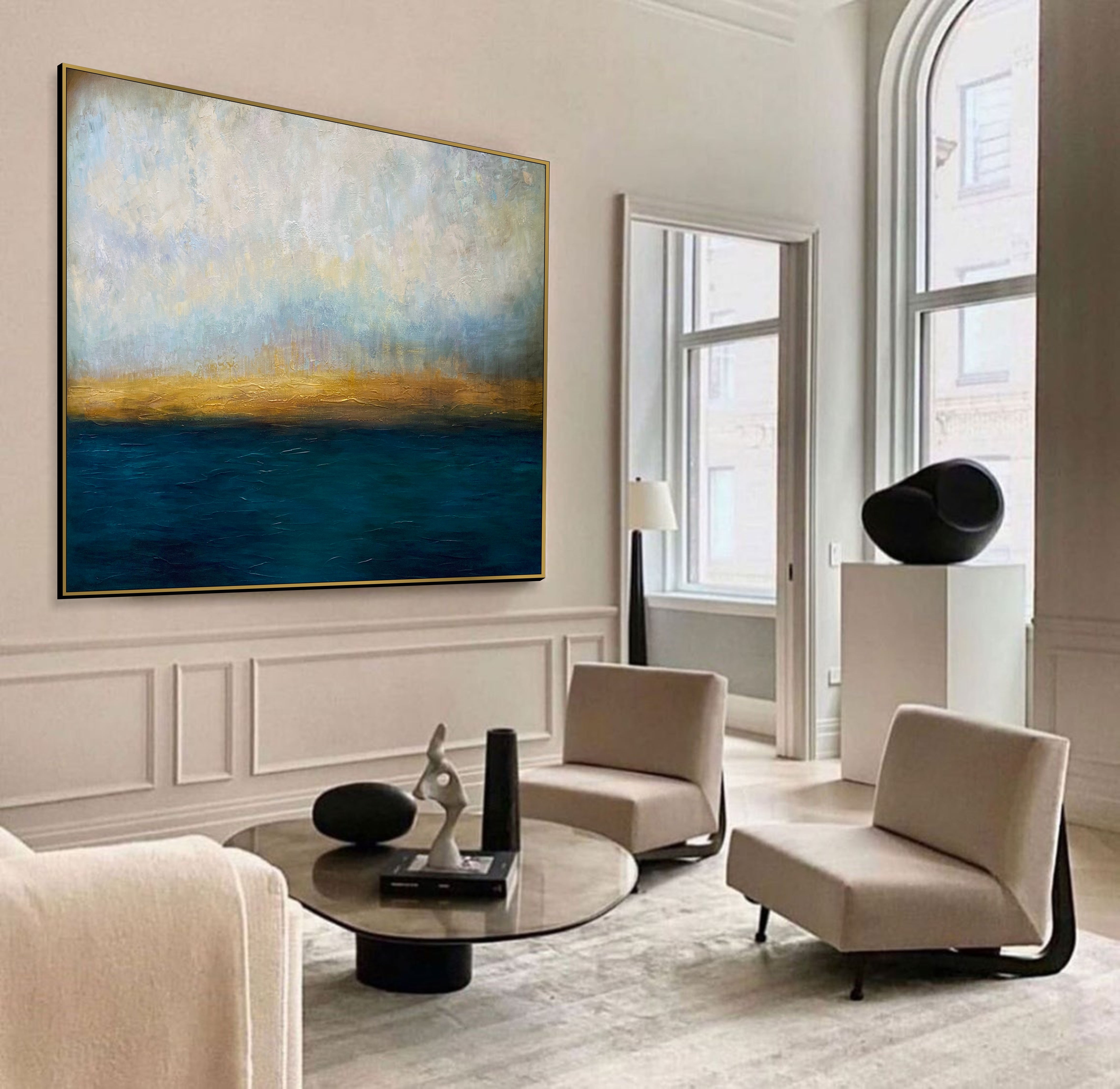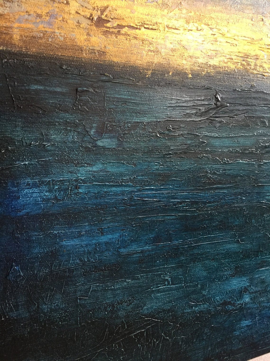 Dieses Meeresgemälde wurde vom Sonnenuntergang über dem Meereshorizont inspiriert. Stellen Sie sich vor, die letzten Sonnenstrahlen spiegeln sich in den Meereswellen und erhellen den Himmel, die dunklen Schatten beginnen in den Wellen zu erscheinen und die ganze Natur wird tief in den Schlaf eintauchen. Aber das Licht kommt immer nach der Dunkelheit, und dieser natürliche Kreislauf erzählt uns von all den guten Dingen, die wieder passieren werden, auch wenn wir uns jetzt nicht sehr gut fühlen. Der Künstler stellte den Ozean in den Farben Tiefblau, Marineblau und Grün dar und kombinierte sie mit einer hellen Farbe des Himmels und der Bernsteinfarbe der untergehenden Sonne. Diese originelle abstrakte Kunst wäre eine erstaunliche Ergänzung für Ihren Raum.