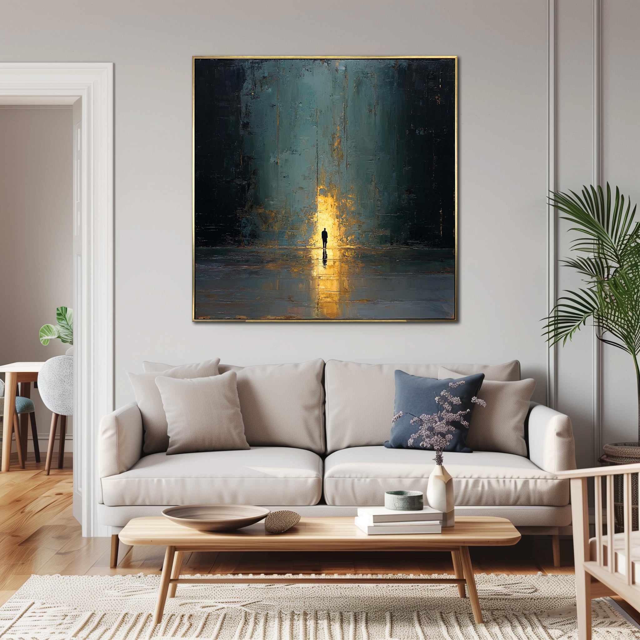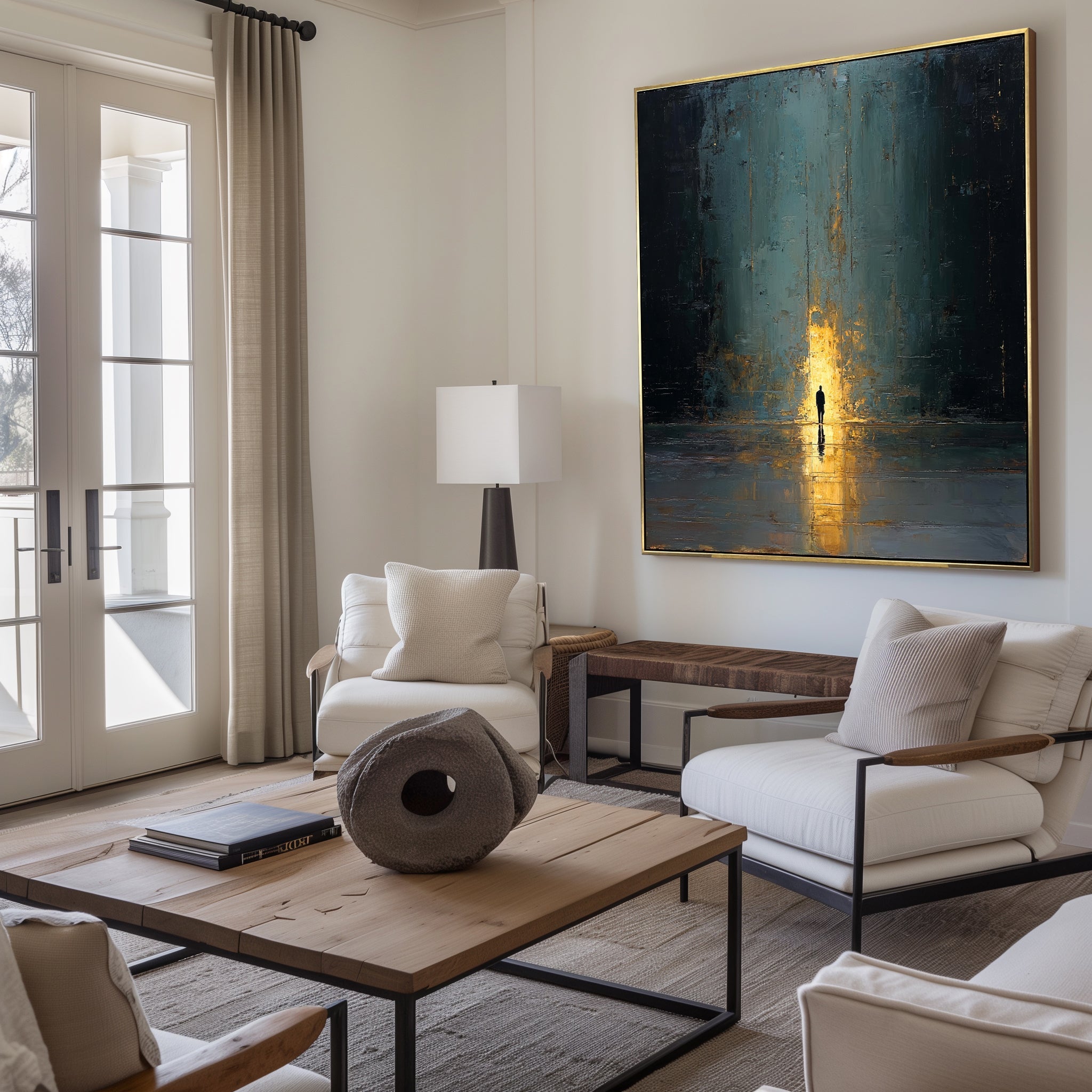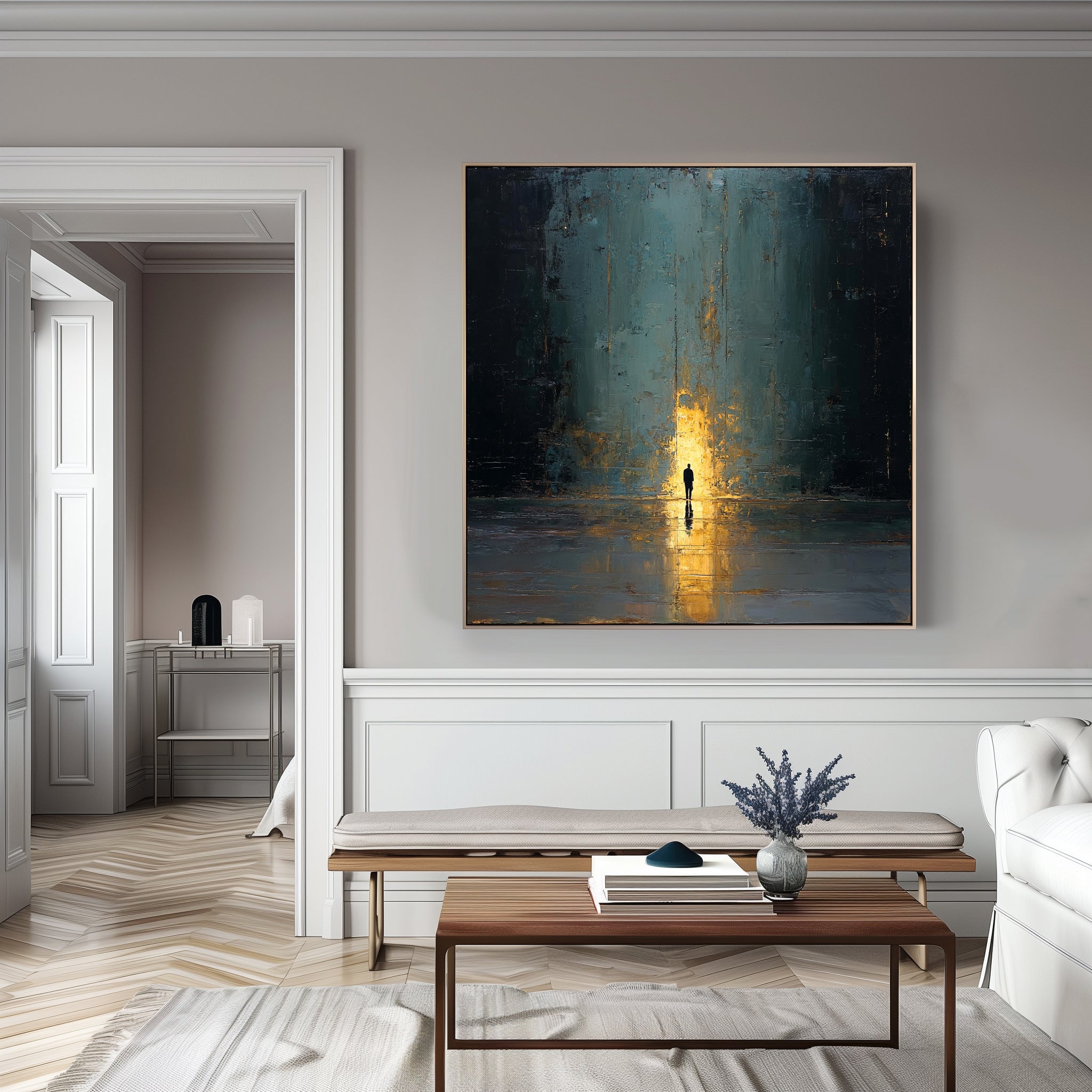 Tauchen Sie ein in eine Welt voller Tiefe und Bedeutung mit „The Passage“, einem atemberaubenden minimalistischen Ölgemälde. Eine einsame Gestalt blickt in eine goldene Mitte einer hoch aufragenden smaragdgrünen Wand – ein Symbol für Hoffnung, Geheimnis und Transzendenz. Reichhaltige Texturen und tiefe Farben verleihen modernen Räumen dramatische Eleganz. Dieses kontemplative Kunstwerk eignet sich ideal für Büros, Schlafzimmer oder Eingangsbereiche, um Emotionen zu wecken und zum Nachdenken anzuregen. Ein markantes, symbolträchtiges Herzstück für kuratierte Innenräume.