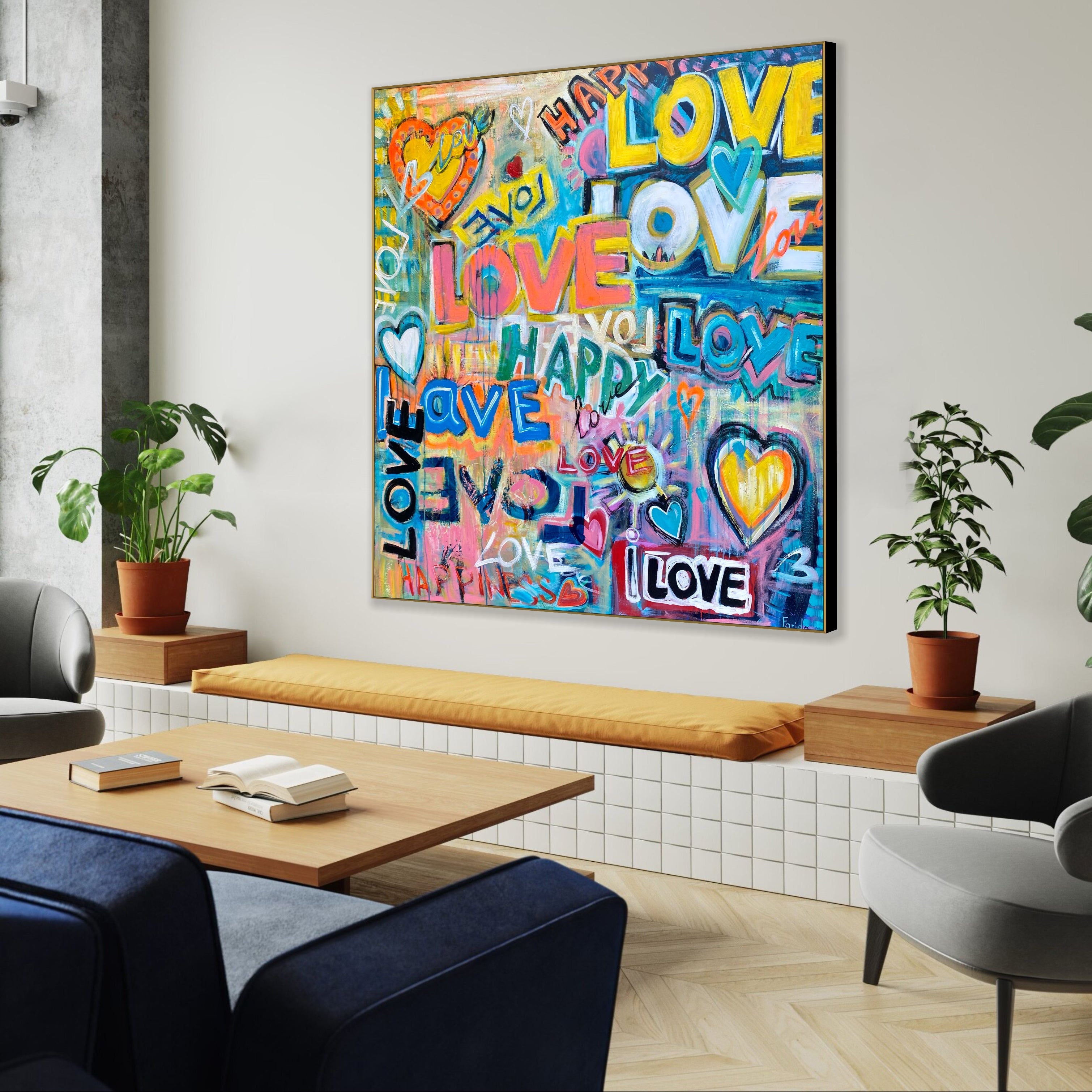 Dieses farbenfrohe und energiegeladene Pop-Art-Gemälde bringt einen Ausbruch von Liebe, Freude und Positivität in Ihren Raum. Mit seiner lebendigen Typografie im Graffiti-Stil und den verspielten Schriftzügen „LOVE“ und „HAPPY“ sowie Herzsymbolen fängt dieses moderne Kunstwerk die Essenz der urbanen Straßenkunst ein. Die kräftigen Farben und die dynamische Komposition machen es zu einem perfekten Statement für alle, die ihr Zuhause mit positiven Vibes füllen wollen. Dieses Kunstwerk ist ideal für Wohnzimmer oder kreative Räume und verbreitet Glück und Wärme.