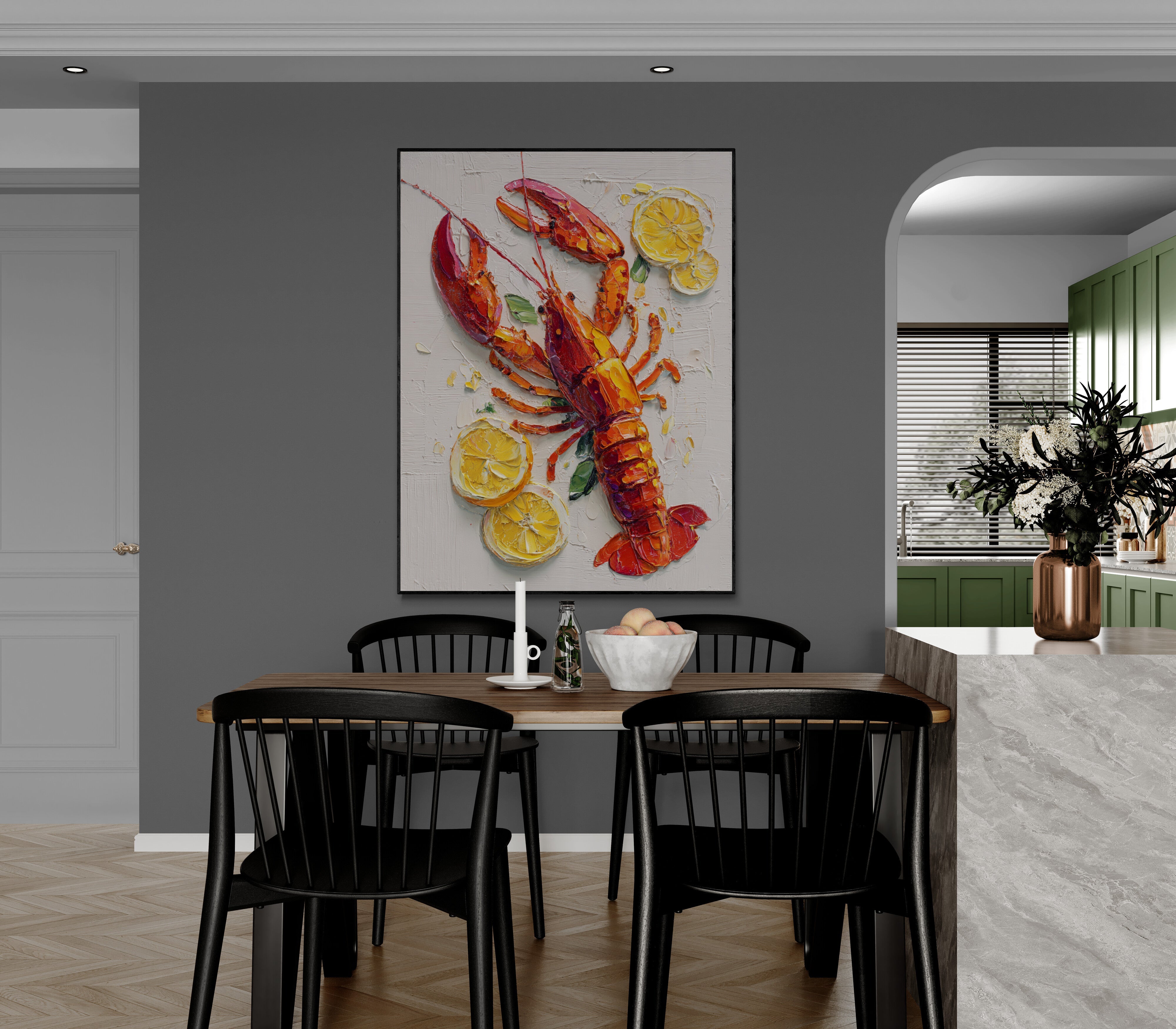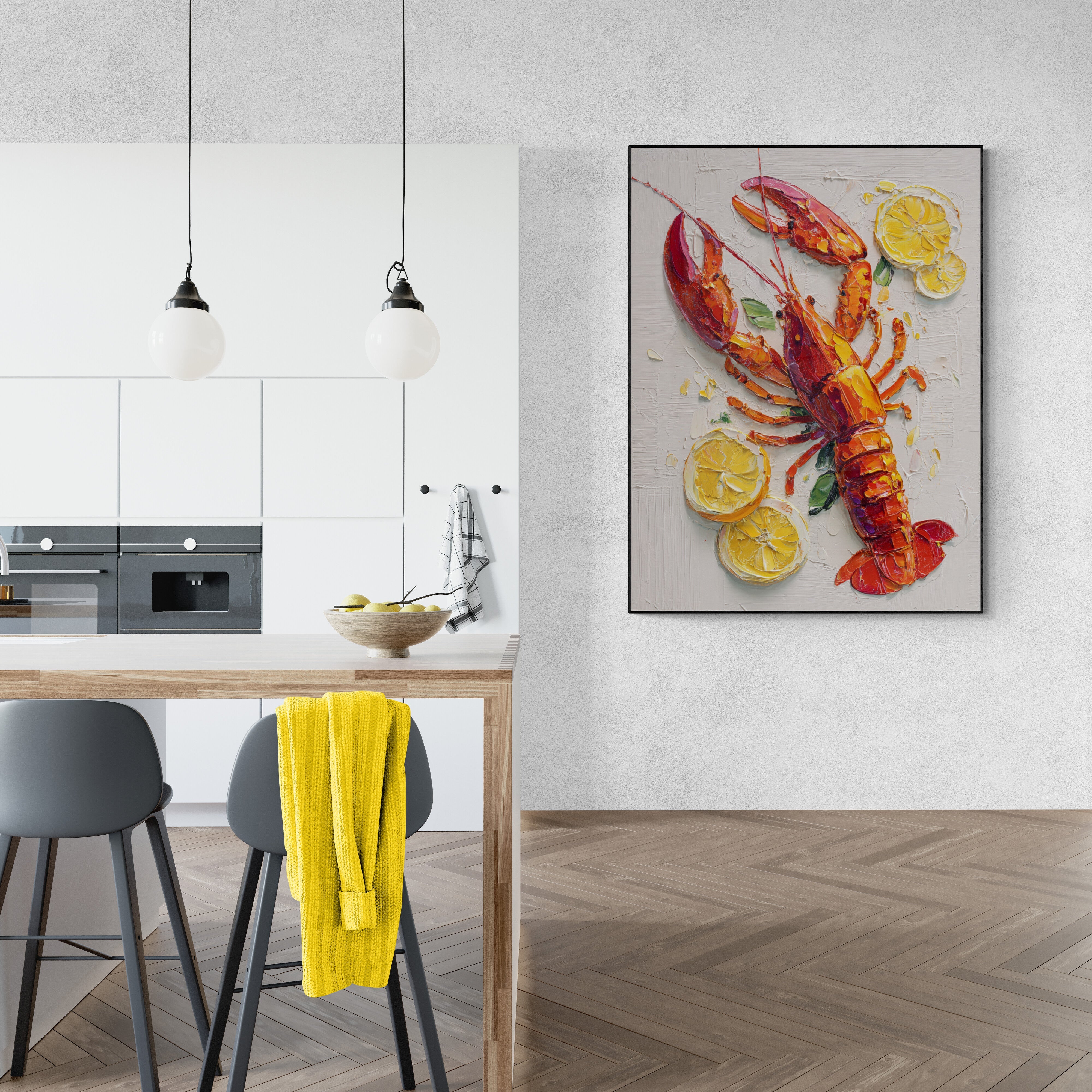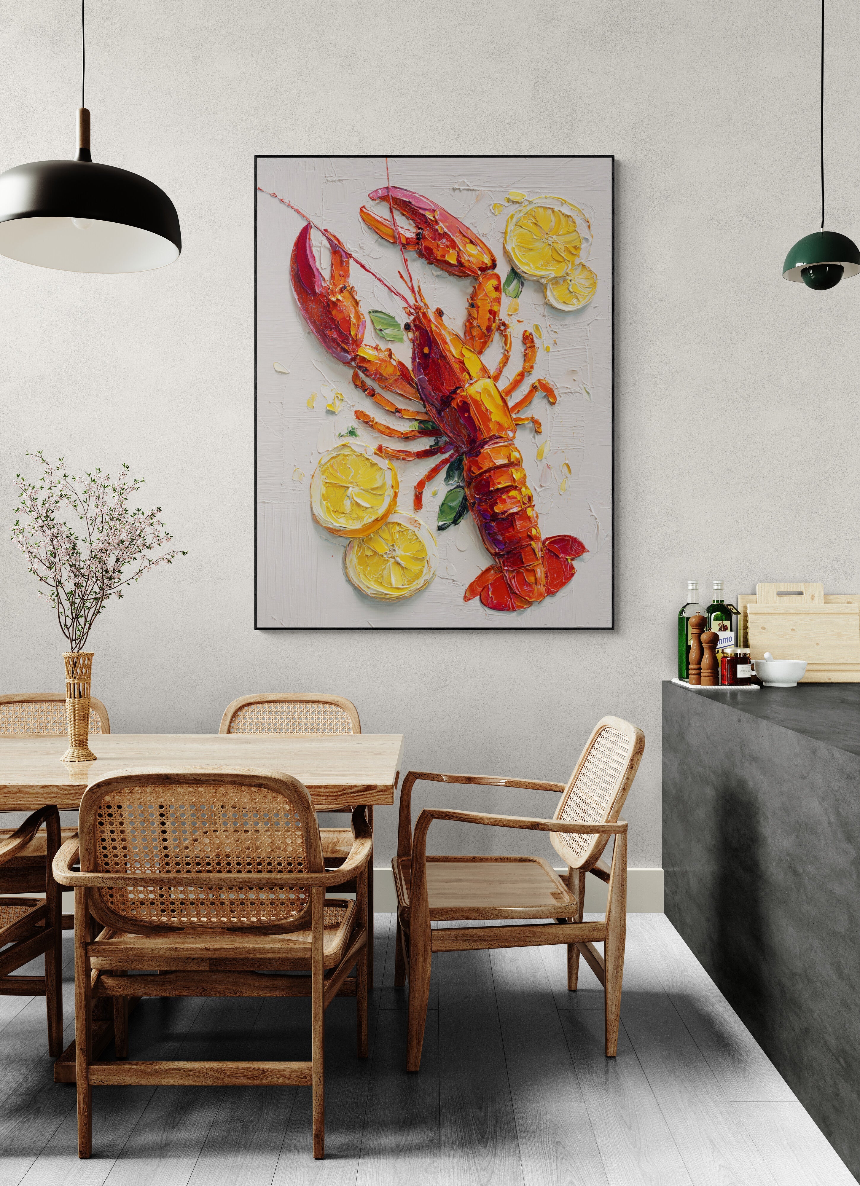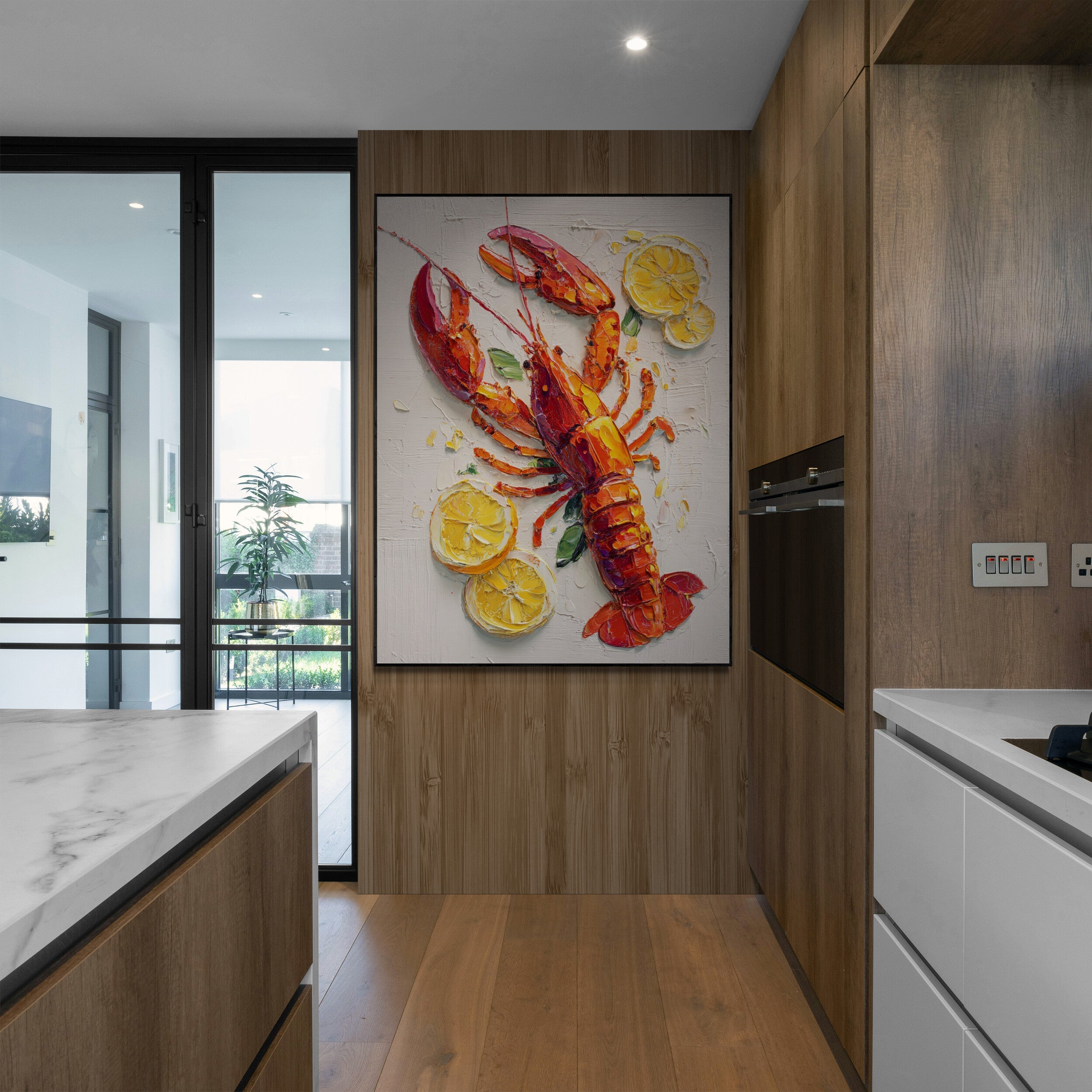 Verleihen Sie Ihrer Küche, Ihrem Café oder Restaurant mit diesem farbenfrohen Wandbild mit Hummer und Krabben einen Hauch von Küstenflair. Dank kräftiger Farben und strukturierter Details ist dieses großformatige Gemälde ein atemberaubender Blickfang für jedes Interieur im maritimen Stil. Es ist perfekt für Feinschmecker und Liebhaber nautischer Dekoration und passt hervorragend zu Bootshäusern, Cafés und anderen Räumen mit Küstenflair. Verschönern Sie Ihre Wände mit einzigartigen, farbenfrohen Kunstwerken für Küche und Restaurant, die zum Gespräch anregen und Ihrem Zuhause oder Geschäft Charakter verleihen.