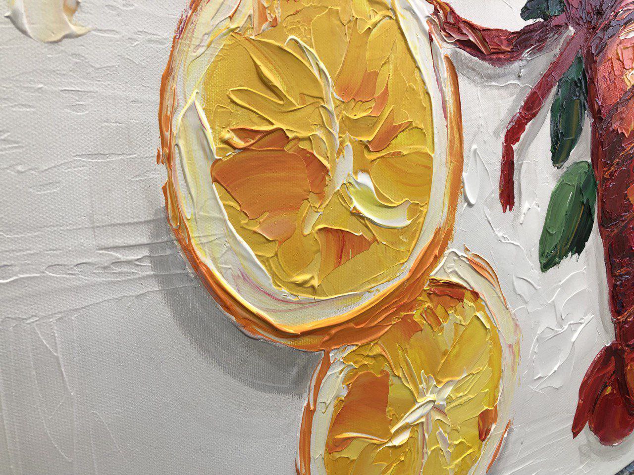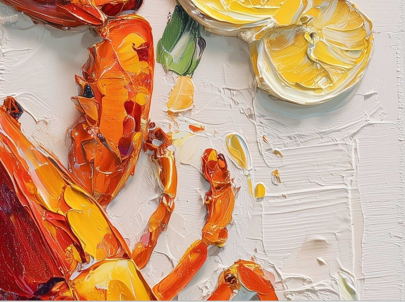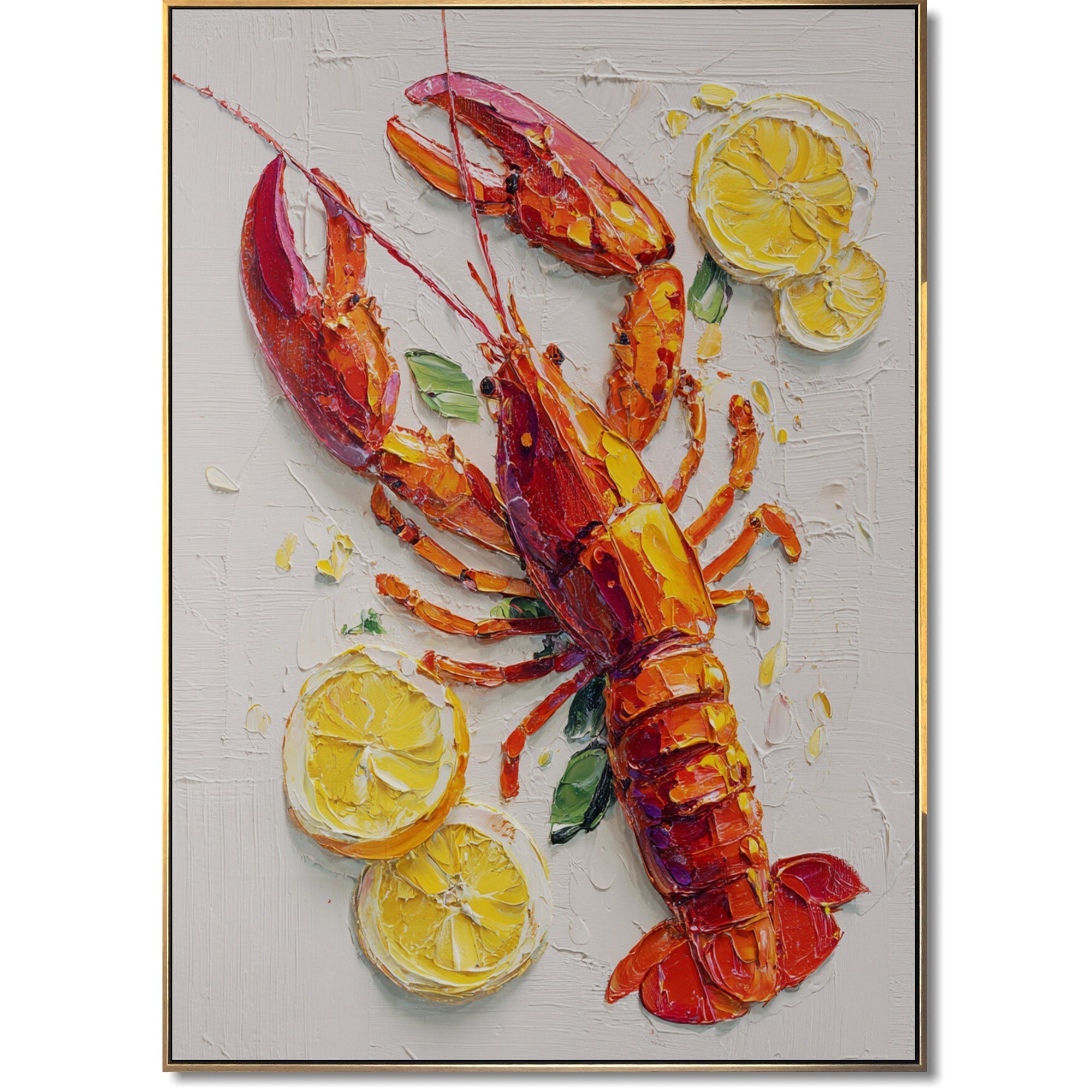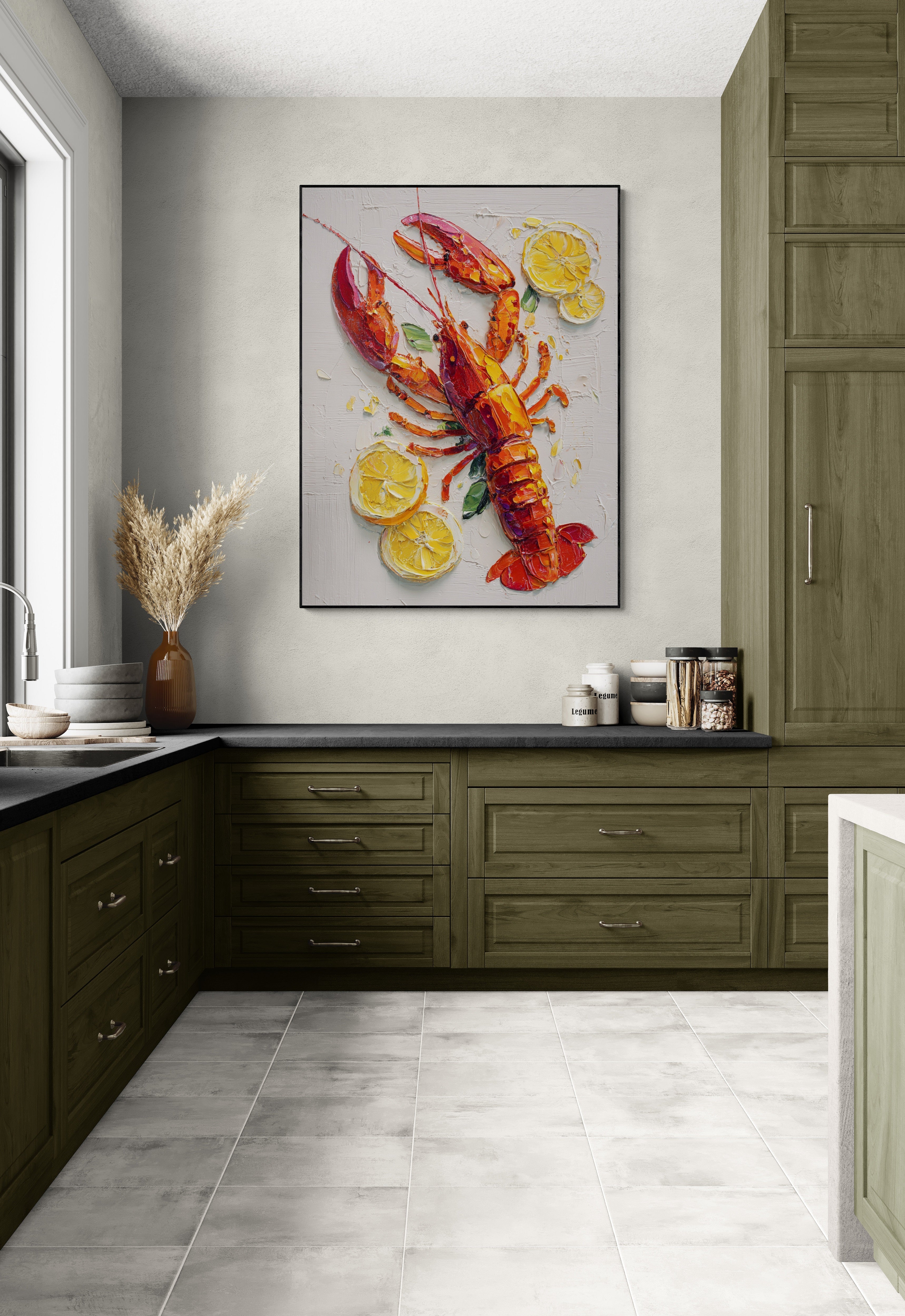 Verleihen Sie Ihrer Küche, Ihrem Café oder Restaurant mit diesem farbenfrohen Wandbild mit Hummer und Krabben einen Hauch von Küstenflair. Dank kräftiger Farben und strukturierter Details ist dieses großformatige Gemälde ein atemberaubender Blickfang für jedes Interieur im maritimen Stil. Es ist perfekt für Feinschmecker und Liebhaber nautischer Dekoration und passt hervorragend zu Bootshäusern, Cafés und anderen Räumen mit Küstenflair. Verschönern Sie Ihre Wände mit einzigartigen, farbenfrohen Kunstwerken für Küche und Restaurant, die zum Gespräch anregen und Ihrem Zuhause oder Geschäft Charakter verleihen.