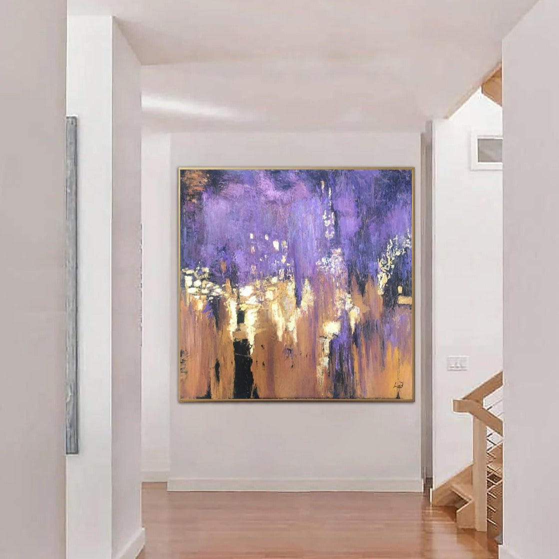 Dieses lebendige Gemälde zeigt ein dramatisches Zusammenspiel von violetten, goldenen und weißen Farbtönen und schafft so eine abstrakte Stadtlandschaft bei Nacht. Der Künstler verwendet dicke, strukturierte Pinselstriche, um die Reflexionen der Stadtlichter auf nassen Oberflächen einzufangen und so ein Gefühl von Tiefe und Bewegung zu erzeugen. Die kontrastierenden Farben und die dynamische Komposition rufen eine lebendige und geschäftige urbane Atmosphäre voller Energie und Geheimnis hervor.
