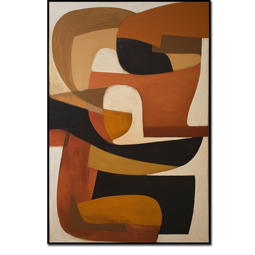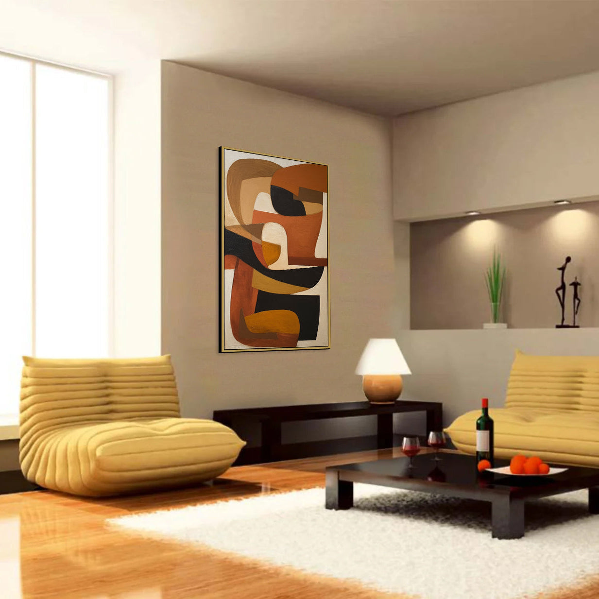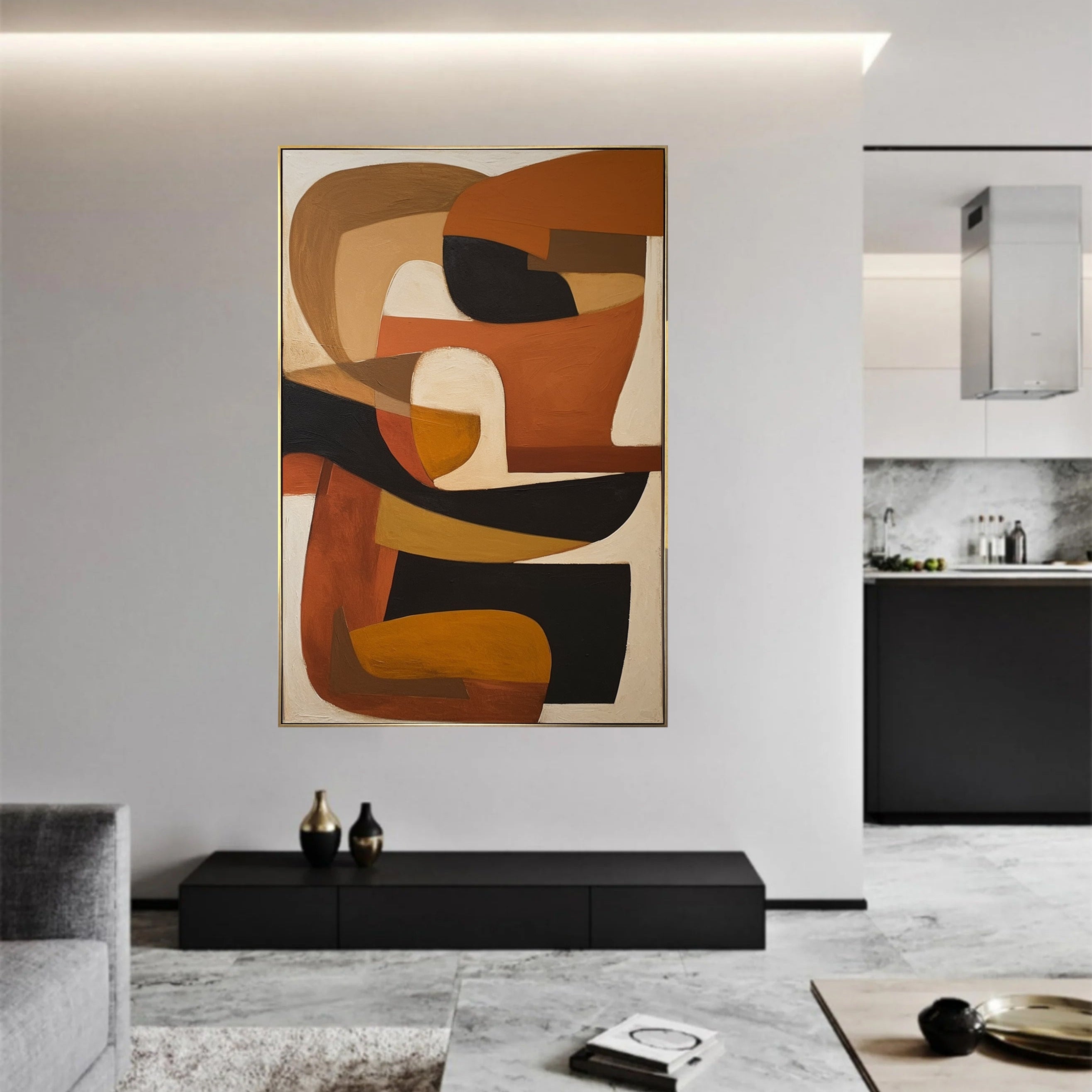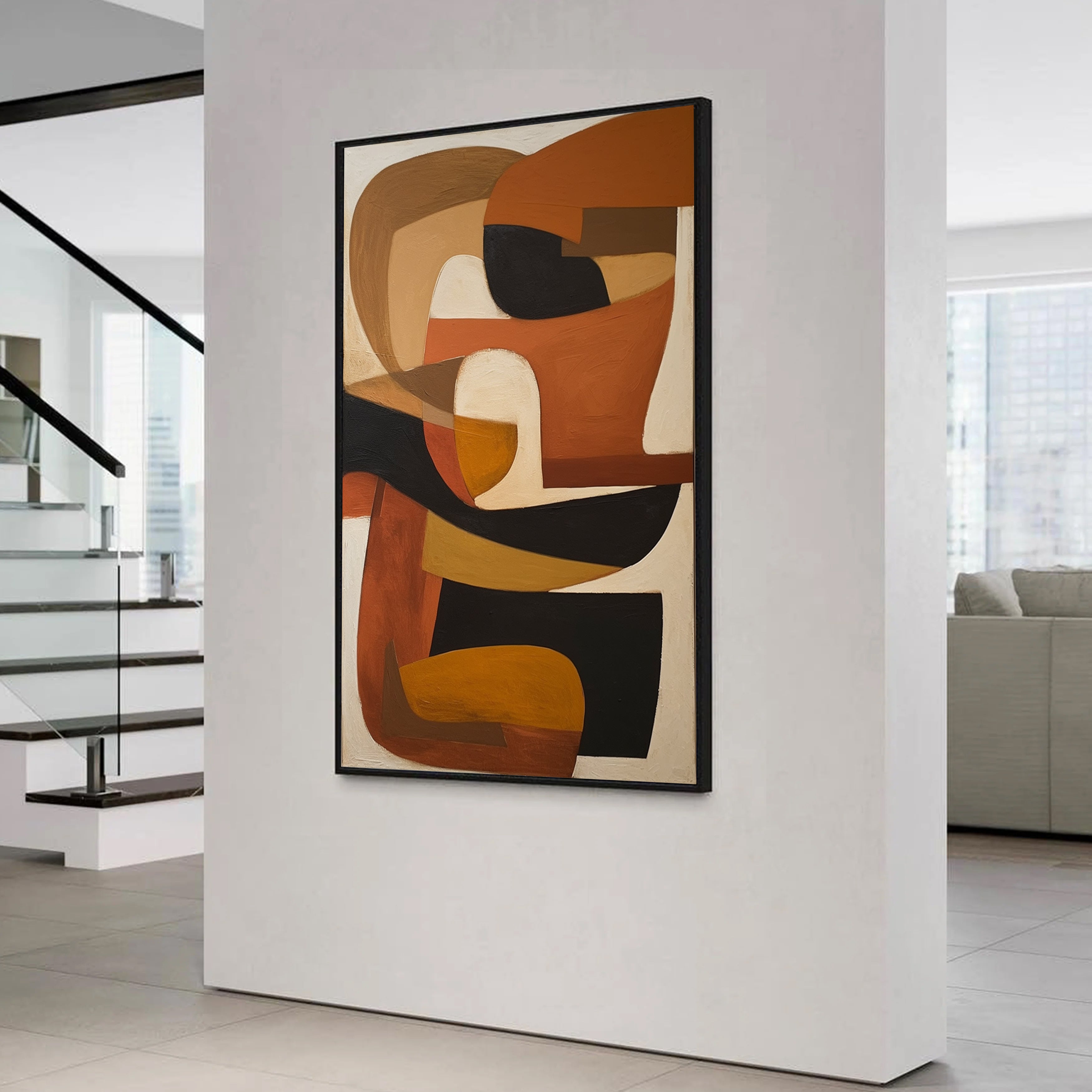 Verschönern Sie Ihren Raum mit „Terracotta Geometry“, einem ausdrucksstarken abstrakten Gemälde in sattem Terrakotta, Senfgelb, Beige und Schwarz. Inspiriert vom modernen Design der Mitte des Jahrhunderts und organischen Formen verbindet dieses Kunstwerk Erdtöne mit geometrischem Fluss und schafft so eine warme, geerdete Atmosphäre. Perfekt für neutrale Interieurs, Boho-Wohnzimmer oder moderne Büros, verleiht es jeder Wand Struktur, Bewegung und zeitlose Eleganz. Handgemalt für authentische Tiefe und Charakter.