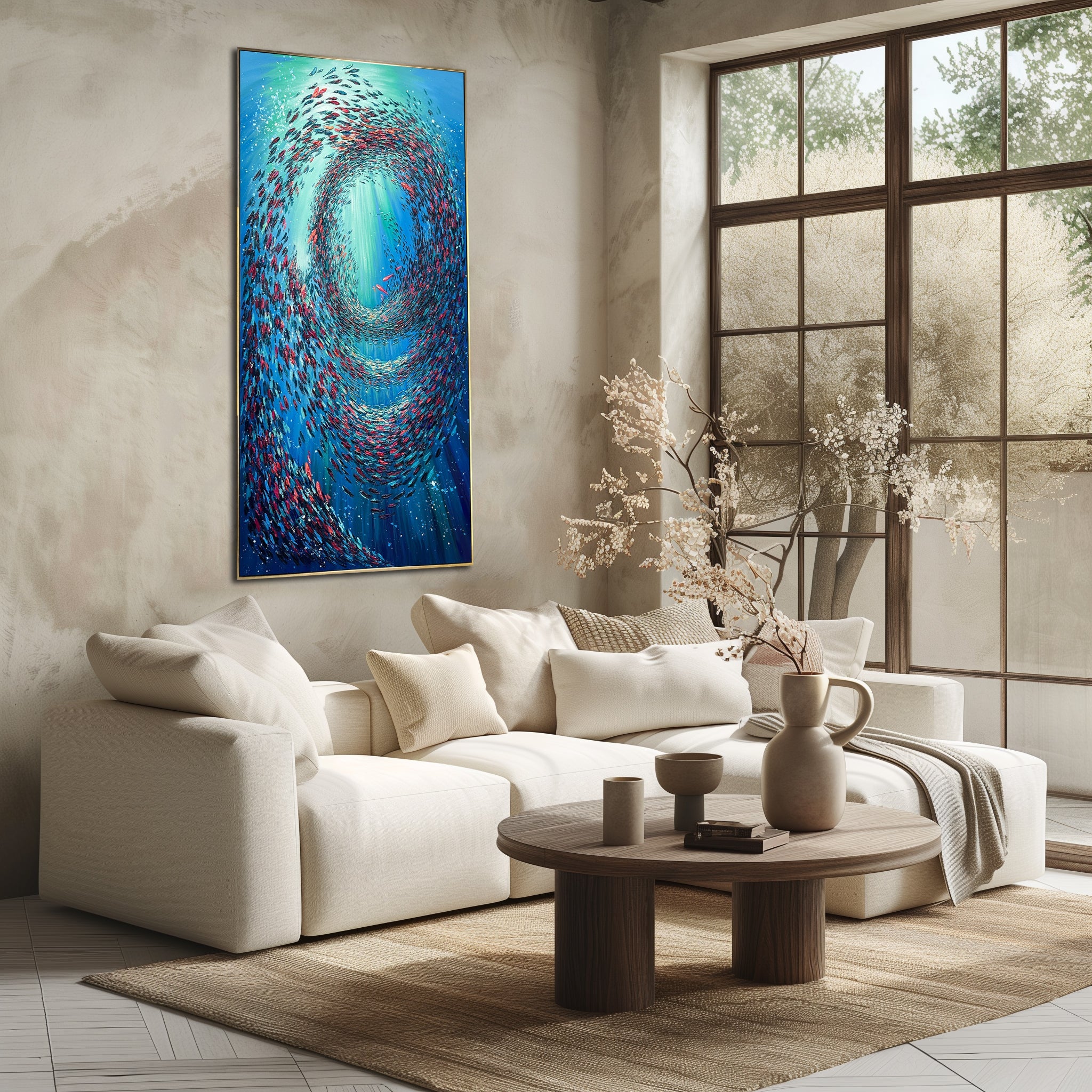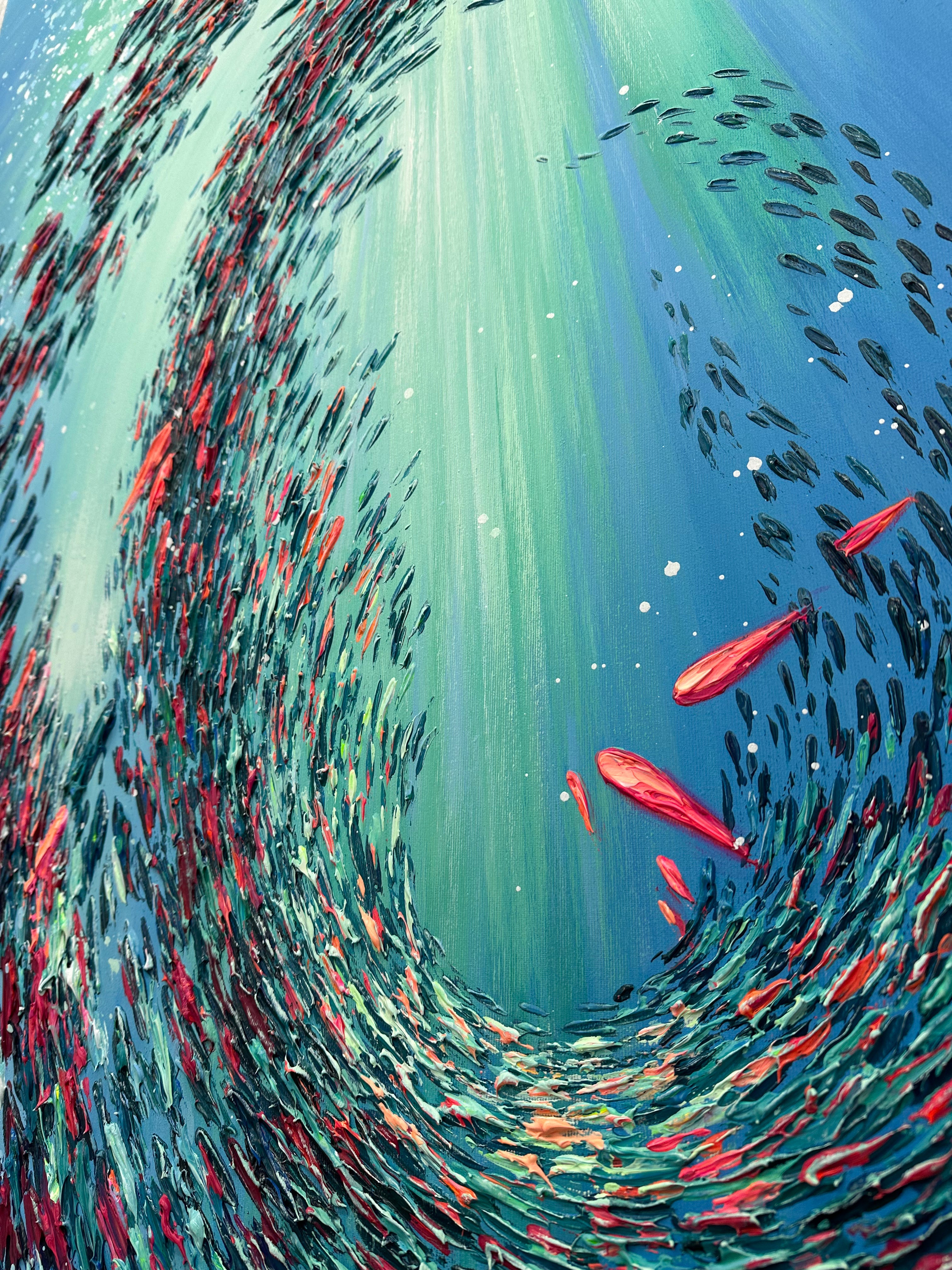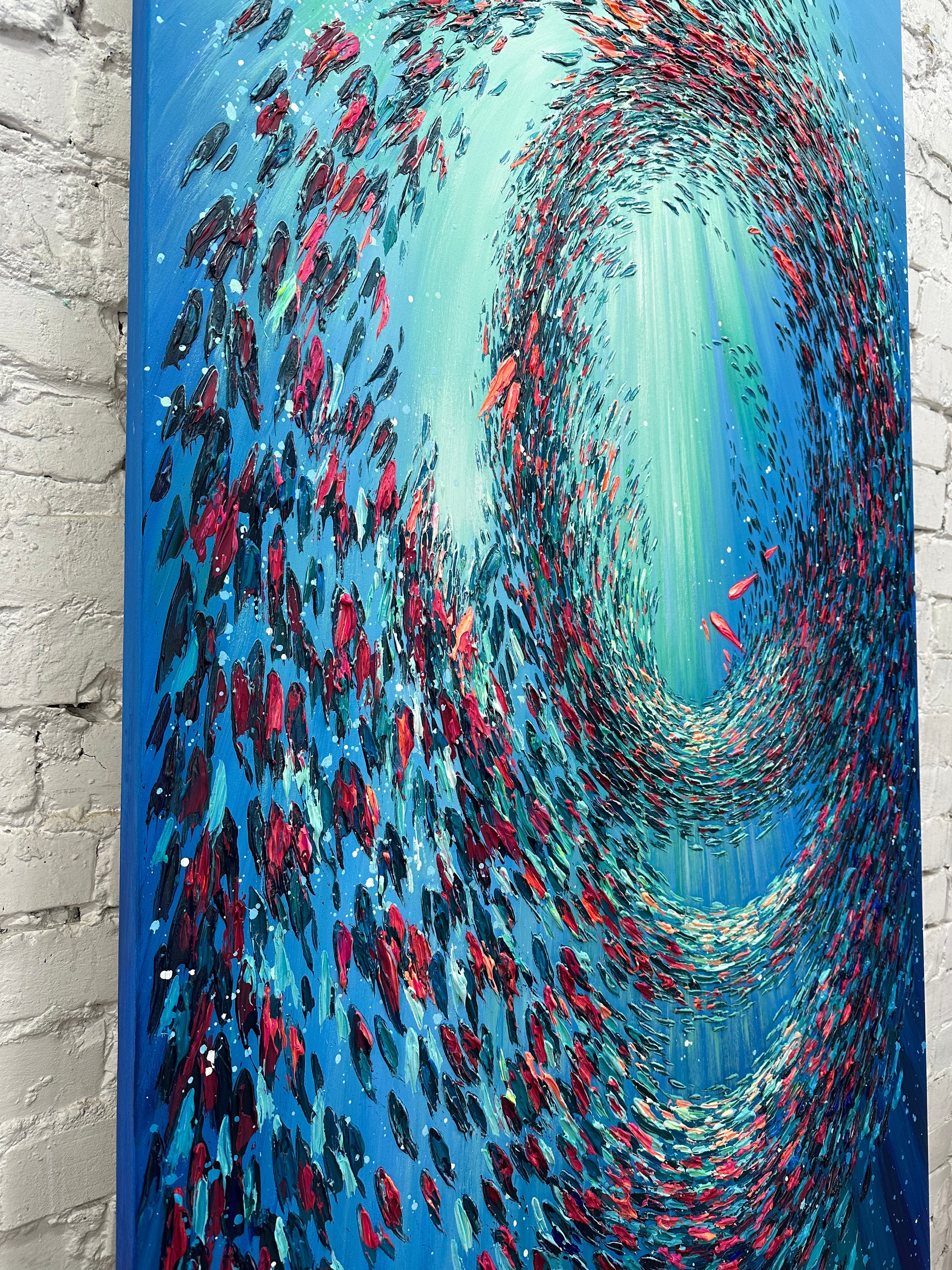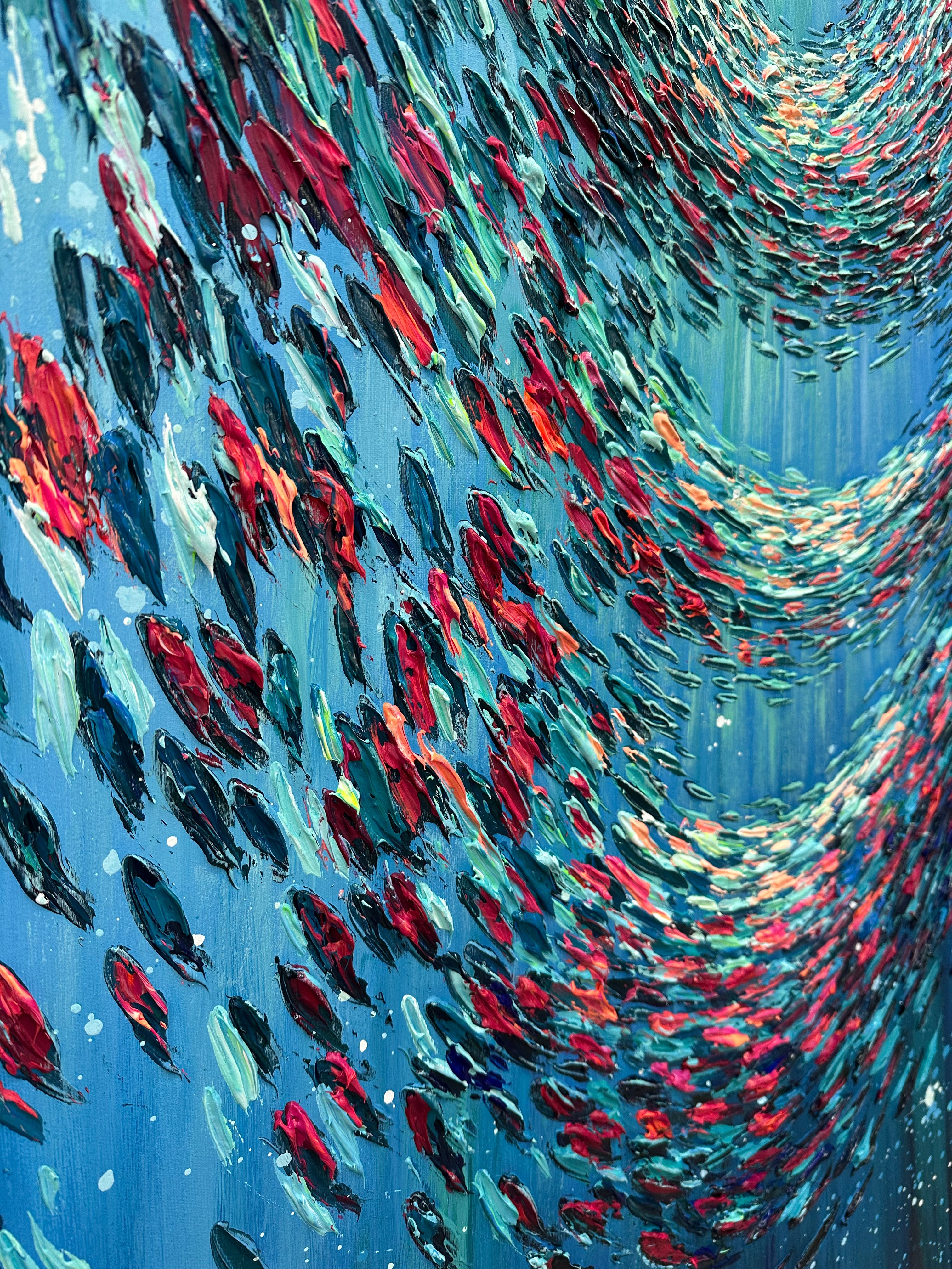 Dynamisches Unterwassergemälde mit wirbelnden Fischen in tiefen Blautönen. Ein modernes Kunstwerk, das Bewegung und Ruhe ausstrahlt. Jetzt bestellen und Ihre Räume verschönern!