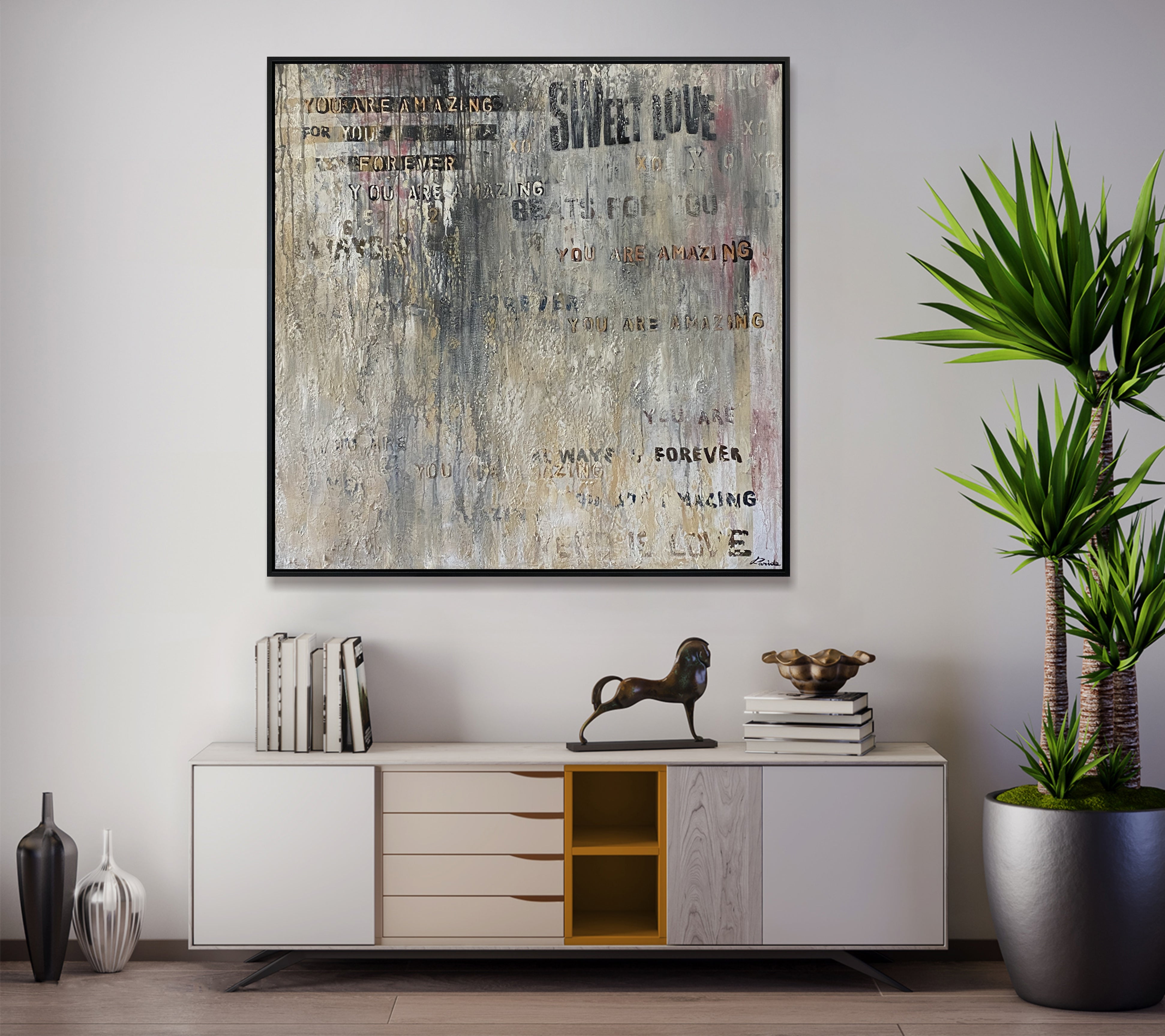 Dieses zeitgenössische Mixed-Media-Gemälde „You Are Amazing Forever“ kombiniert strukturierte Schichten mit aufmunternden Phrasen wie „Sweet Love“ und „You Are Amazing“. Die neutralen Beige-, Grau- und Erdtöne verschmelzen mühelos mit subtilen Rosatönen und schaffen ein minimalistisches und dennoch wirkungsvolles Kunstwerk. Dieses Kunstwerk ist perfekt, um jedem Wohnraum eine moderne und positive Note zu verleihen. Es erinnert uns an Liebe, Motivation und Selbstwertschätzung und ist somit eine ideale Ergänzung für jeden Raum.