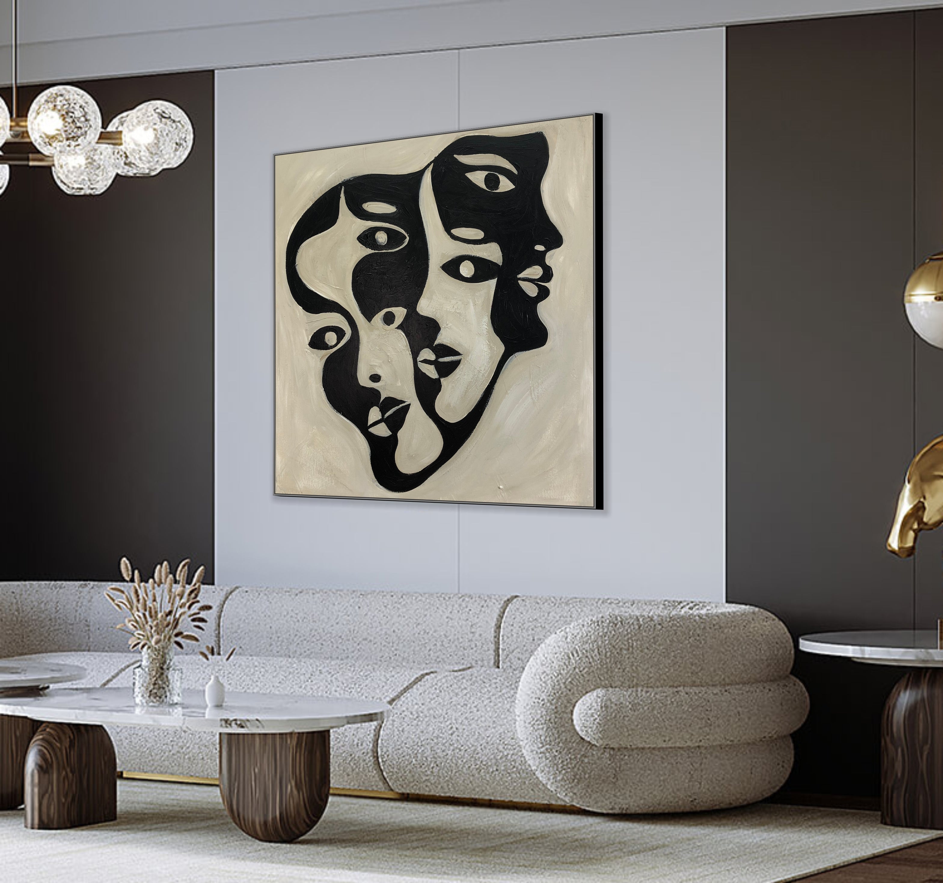 Entdecken Sie die faszinierende Welt von „Surreal Expressions“, einem abstrakten Schwarz-Weiß-Gemälde, das in das Reich menschlicher Emotionen und Dualität eintaucht. Dieses moderne Kunstwerk zeigt minimalistische und surreale Gesichter und fängt die Essenz des Expressionismus ein. Dieses Werk ist perfekt für Liebhaber zeitgenössischer und monochromer Kunst und verleiht jedem Raum einen Hauch von Faszination und Raffinesse. Umarmen Sie die Schönheit abstrakter Konzepte und surrealer Visionen mit diesem einzigartigen und stilvollen Kunstwerk.