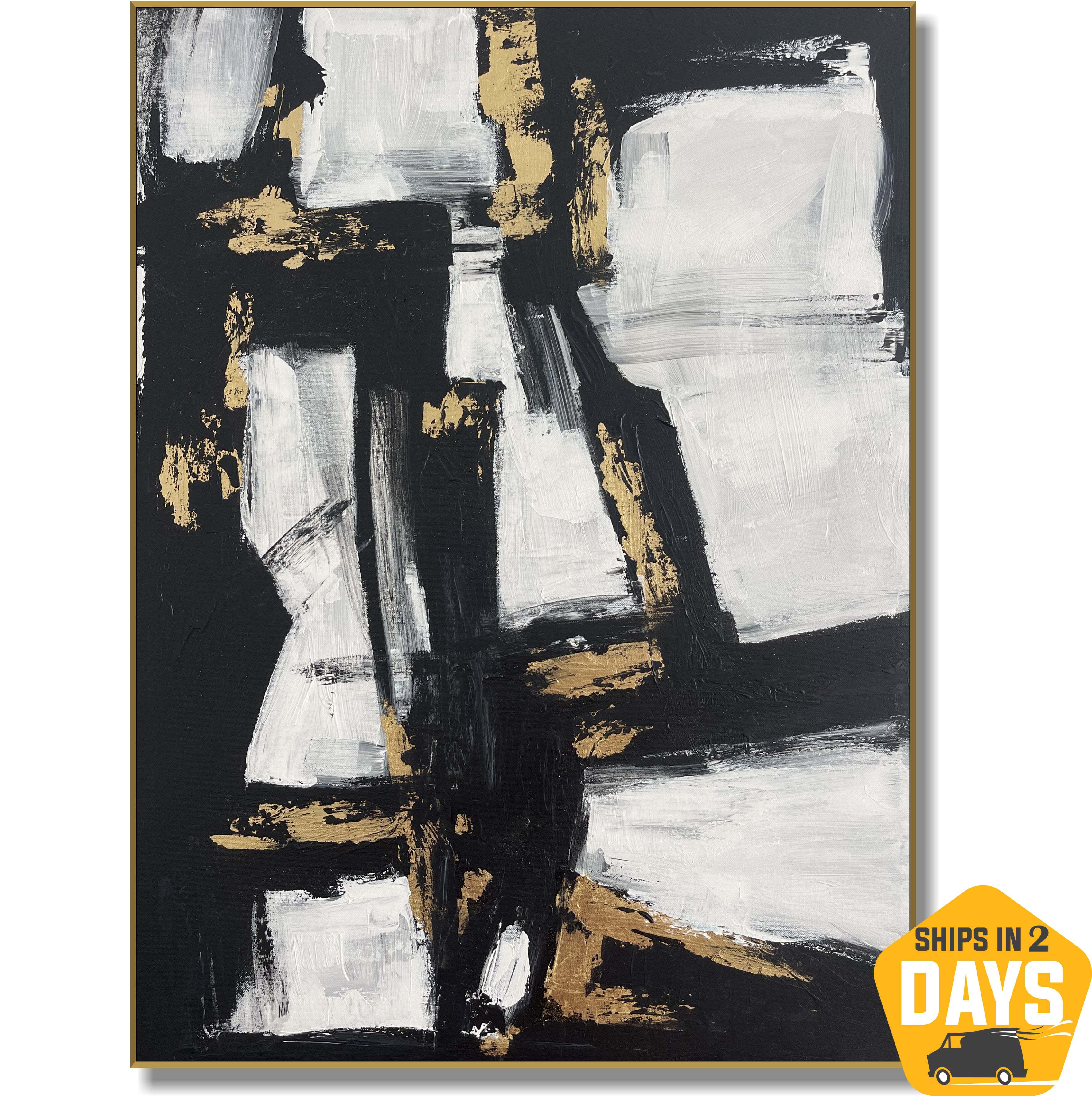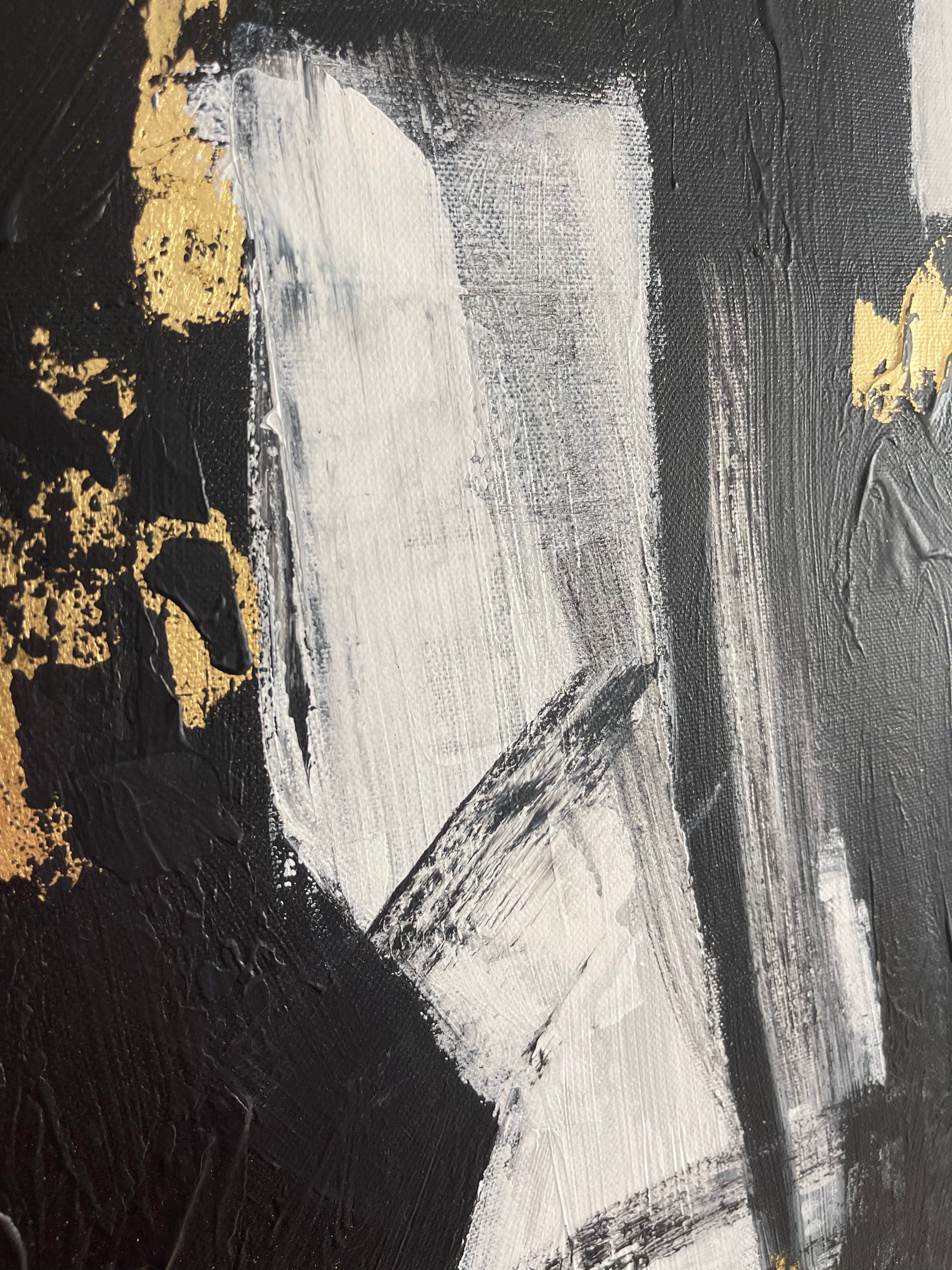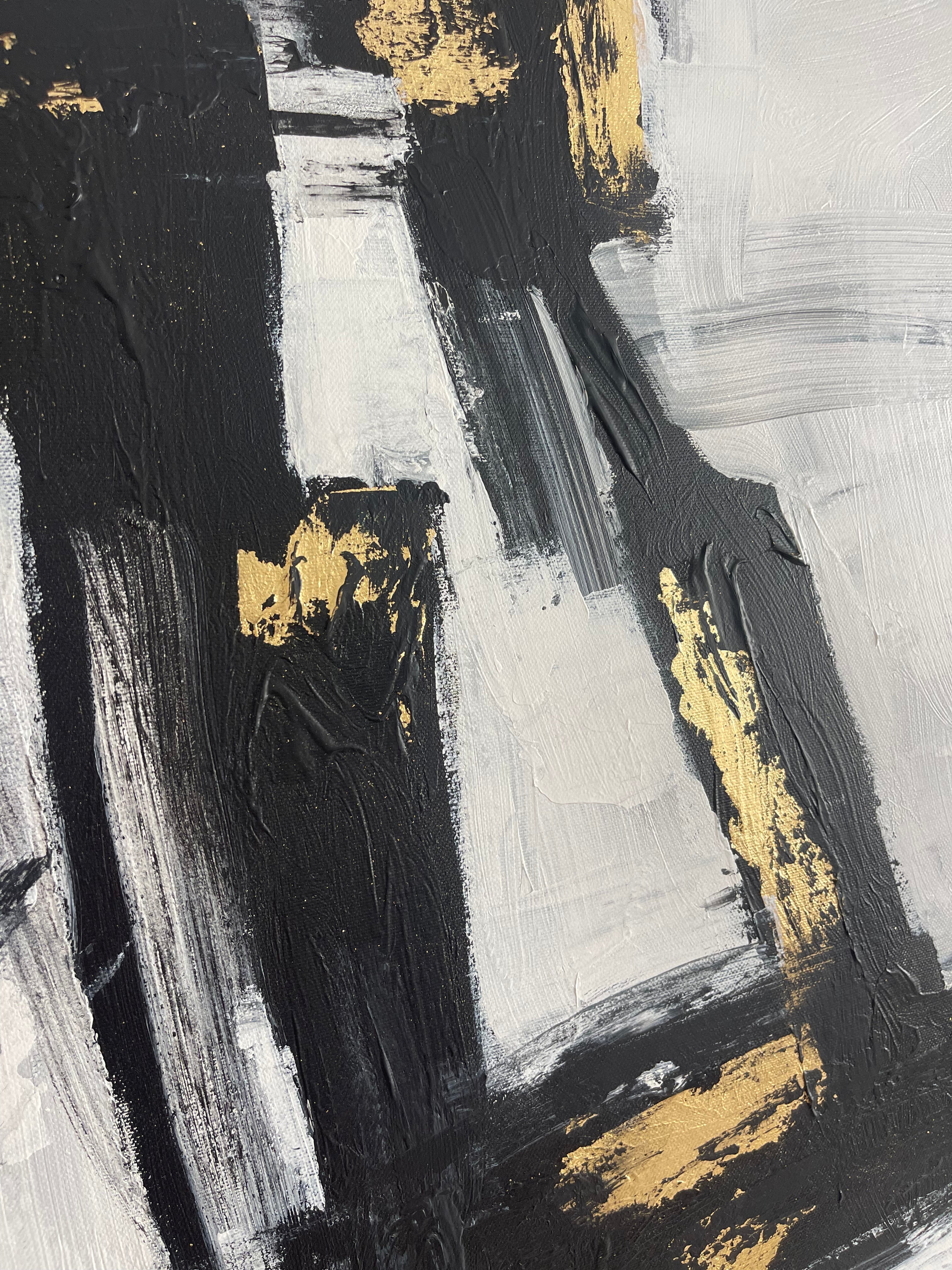 „Geometric Glow“ ist ein kühnes abstraktes Gemälde mit auffälligen geometrische Formen in Schwarz und Weiß mit luxuriösen goldenen Akzenten. Die strukturierten Pinselstriche erzeugen Tiefe und Bewegung und machen dieses Kunstwerk zu einem herausragenden Stück für moderne Innenräume. Dieses Kunstwerk ist ideal für Liebhaber zeitgenössischen Designs und Minimalismus und verleiht jedem Raum, sei es Wohnzimmer, Büro oder Galerie, ein Gefühl von Luxus und Raffinesse. Perfekt für alle, die ein kraftvolles und doch minimalistisches Statement-Stück suchen.