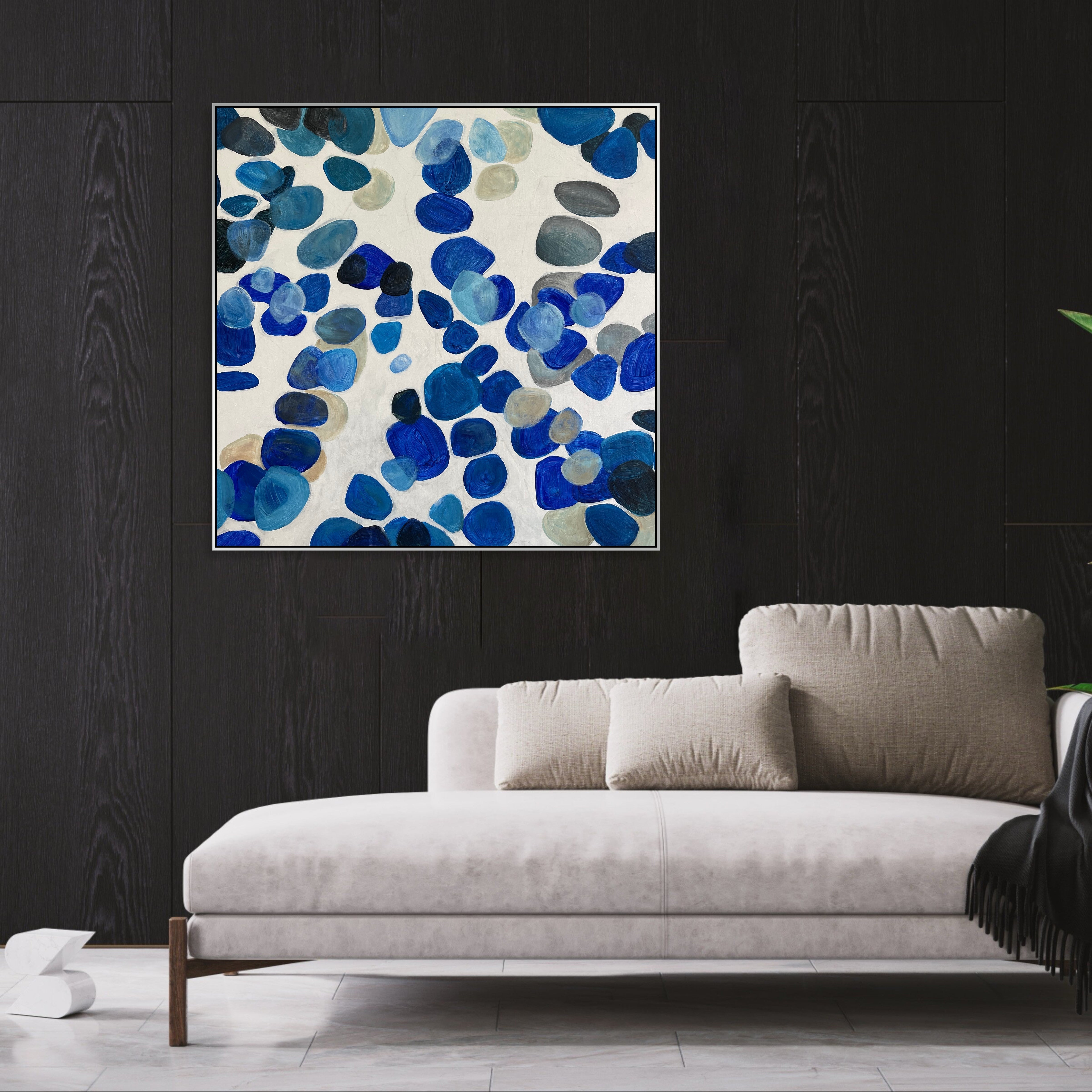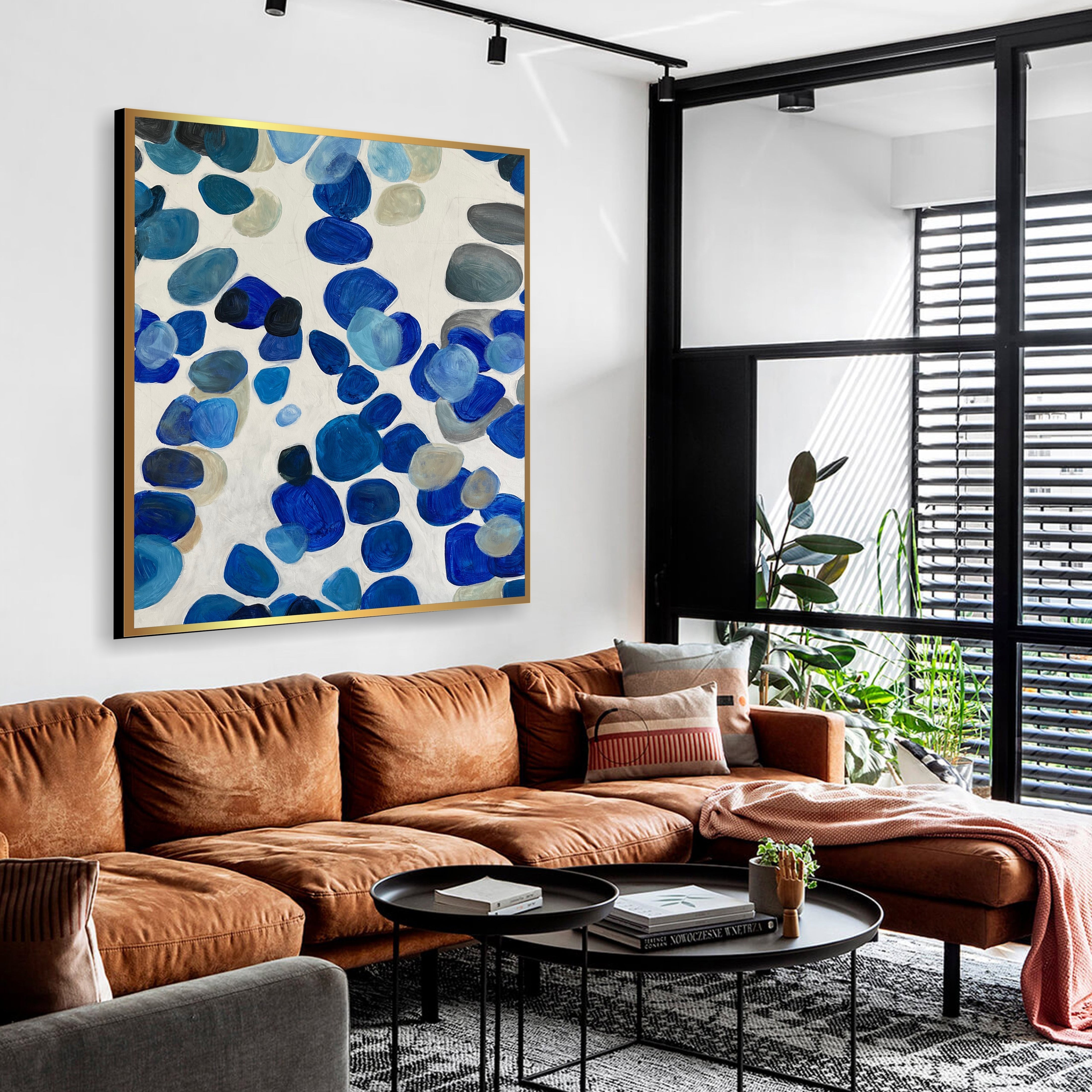 „BLUE STONES“ ist ein abstraktes Meisterwerk, das die Essenz der Ruhe einfängt. Eine Kaskade aus himmelblauen Steinen fällt wie sanfter Regen in ein Meer aus tiefem Blau und ruft eine ruhige und kontemplative Atmosphäre hervor. Dieses Kunstwerk lädt den Betrachter ein, in eine Welt der Ruhe und Selbstbeobachtung einzutauchen, in der das subtile Zusammenspiel von Schattierungen und Formen ein Gefühl zeitloser Gelassenheit und Staunen hervorruft.