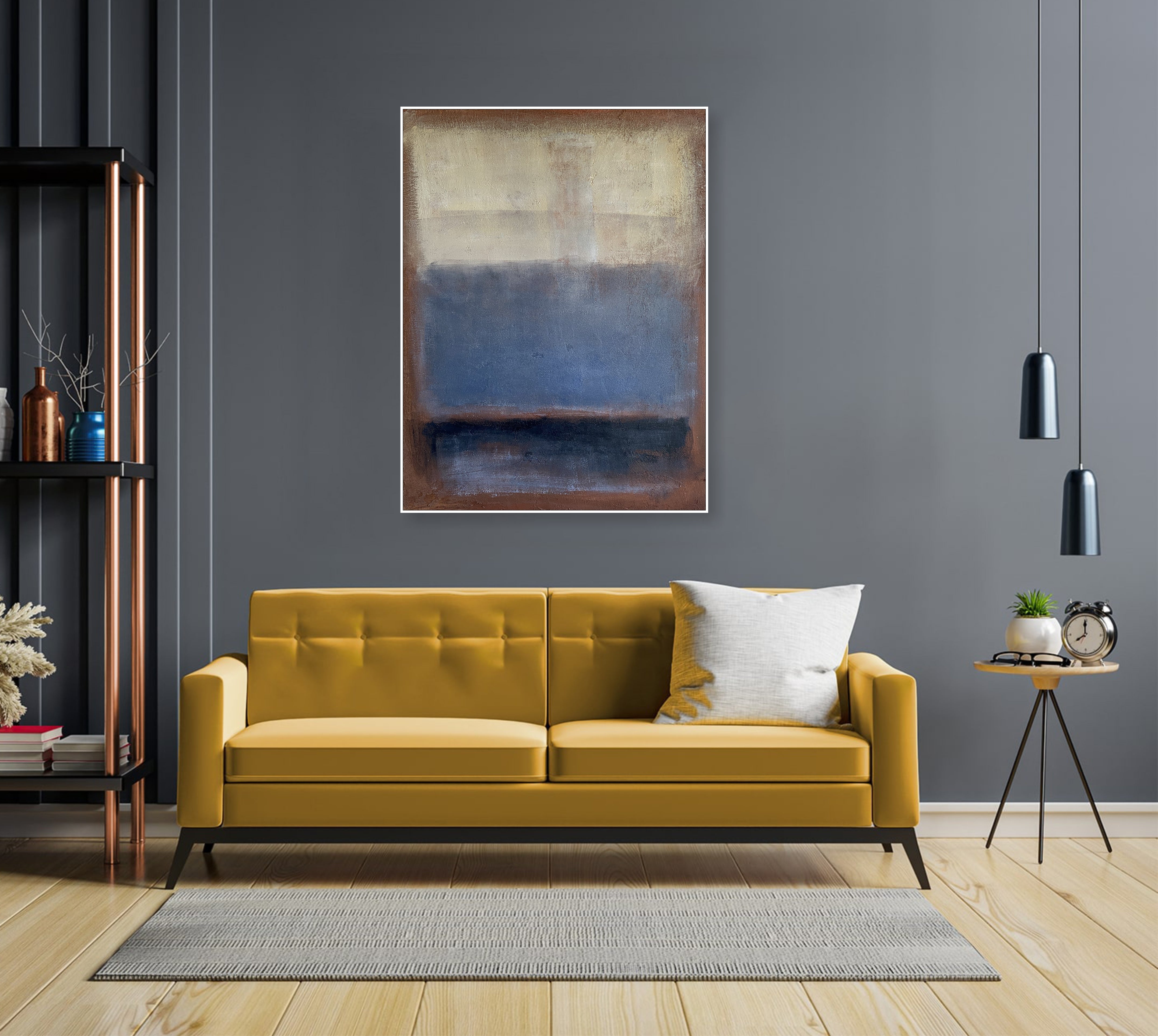 Bringen Sie Ruhe in Ihren Raum mit diesem abstrakten Landschaftsgemälde. Mit einer harmonischen Mischung aus Blau-, Braun- und Beigetönen weckt dieses minimalistische Kunstwerk die Ruhe der Natur. Die texturierte Leinwand und das subtile, vom Horizont inspirierte Design verleihen Tiefe und Raffinesse und machen es zu einem perfekten Mittelpunkt für moderne Innenräume. Ideal, um eine ruhige Atmosphäre in Wohnzimmern, Schlafzimmern oder Büros zu schaffen. Dieses vielseitige Stück ergänzt neutrale Einrichtungsstile und verleiht Ihrem Zuhause Wärme und Eleganz.